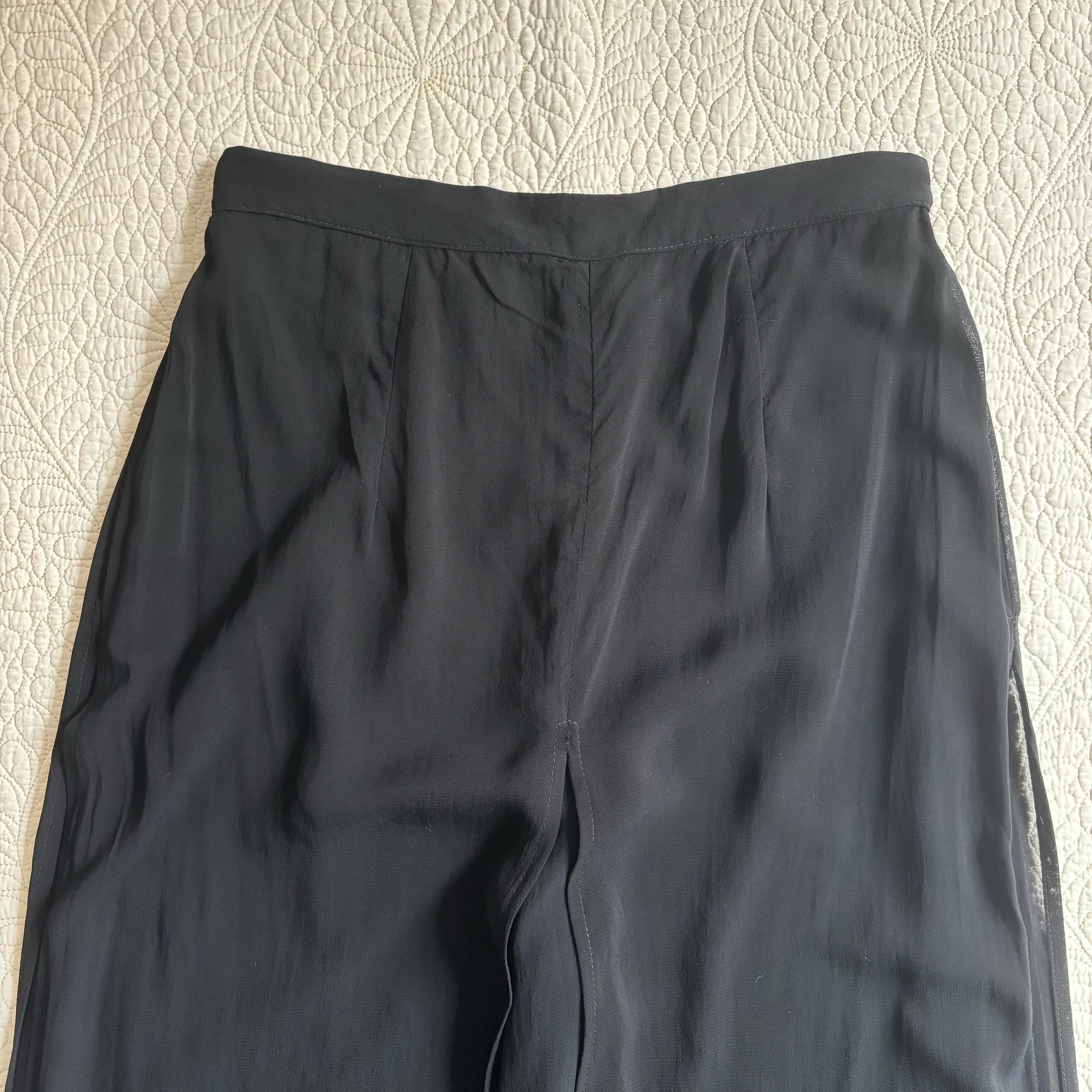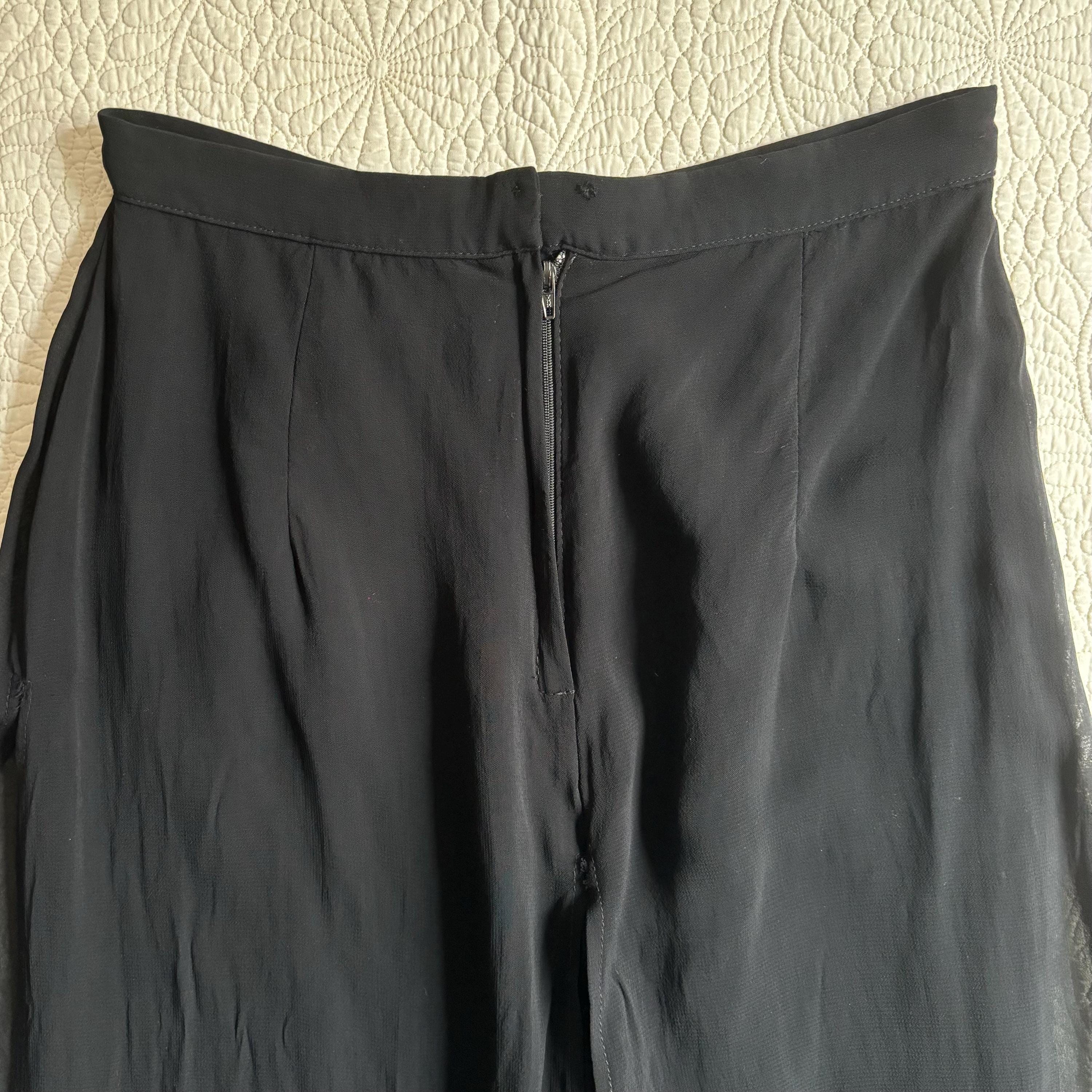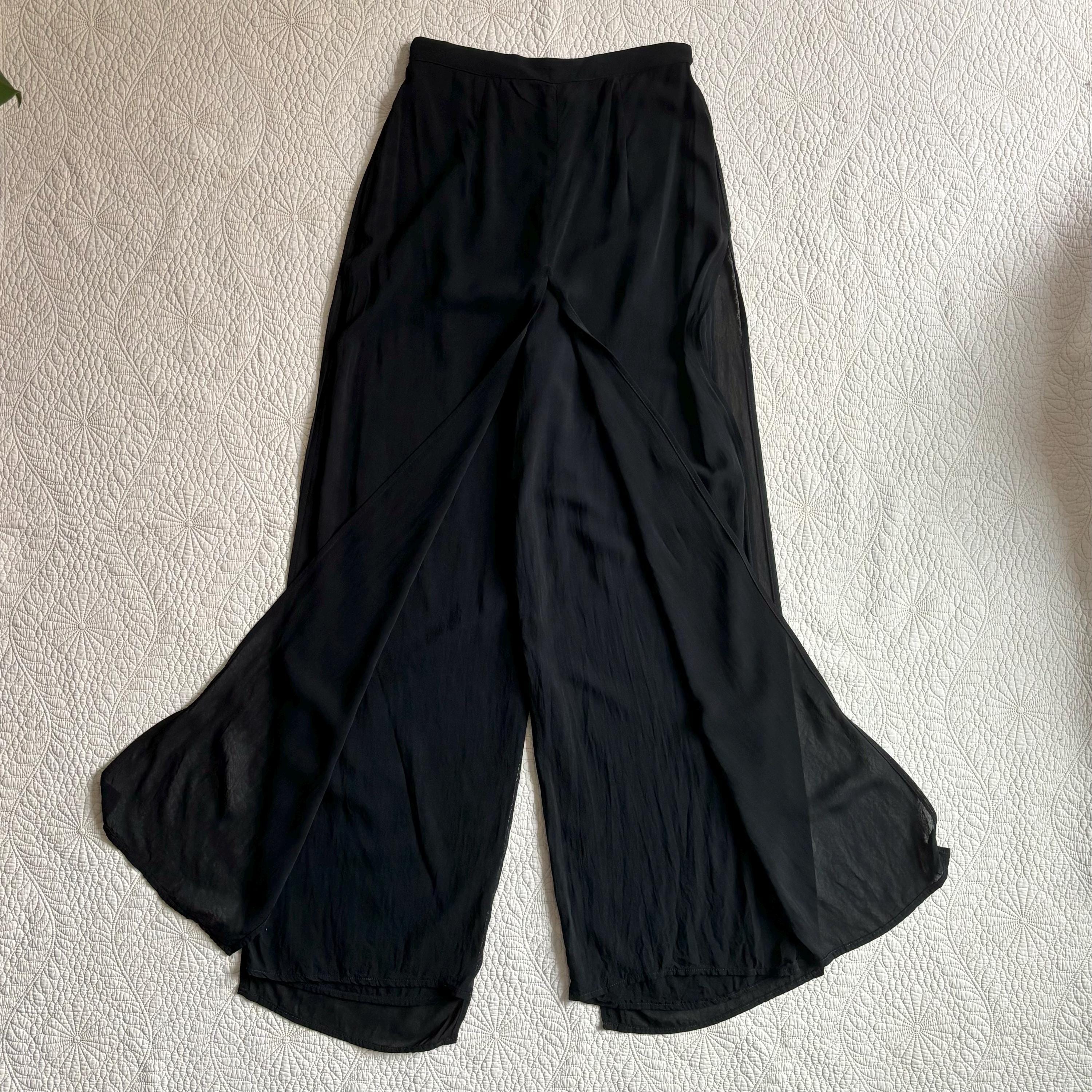 These vintage Caché pants have a high waist, with sheer gauzy legs, and even sheerer panels front and back. Closes at the waist with a zipper and hook & eye. Really stunning! Could make a perfect addition to your spooky season wardrobe. Tadashi Shoji continues to make a very similar style called the Seaton, if you want to search that up to get an idea of it on a person. It's a slightly different silhouette, but the idea is the same.100% rayon. Made in the USA. UK Size 8. Please see the measurements for best fit!