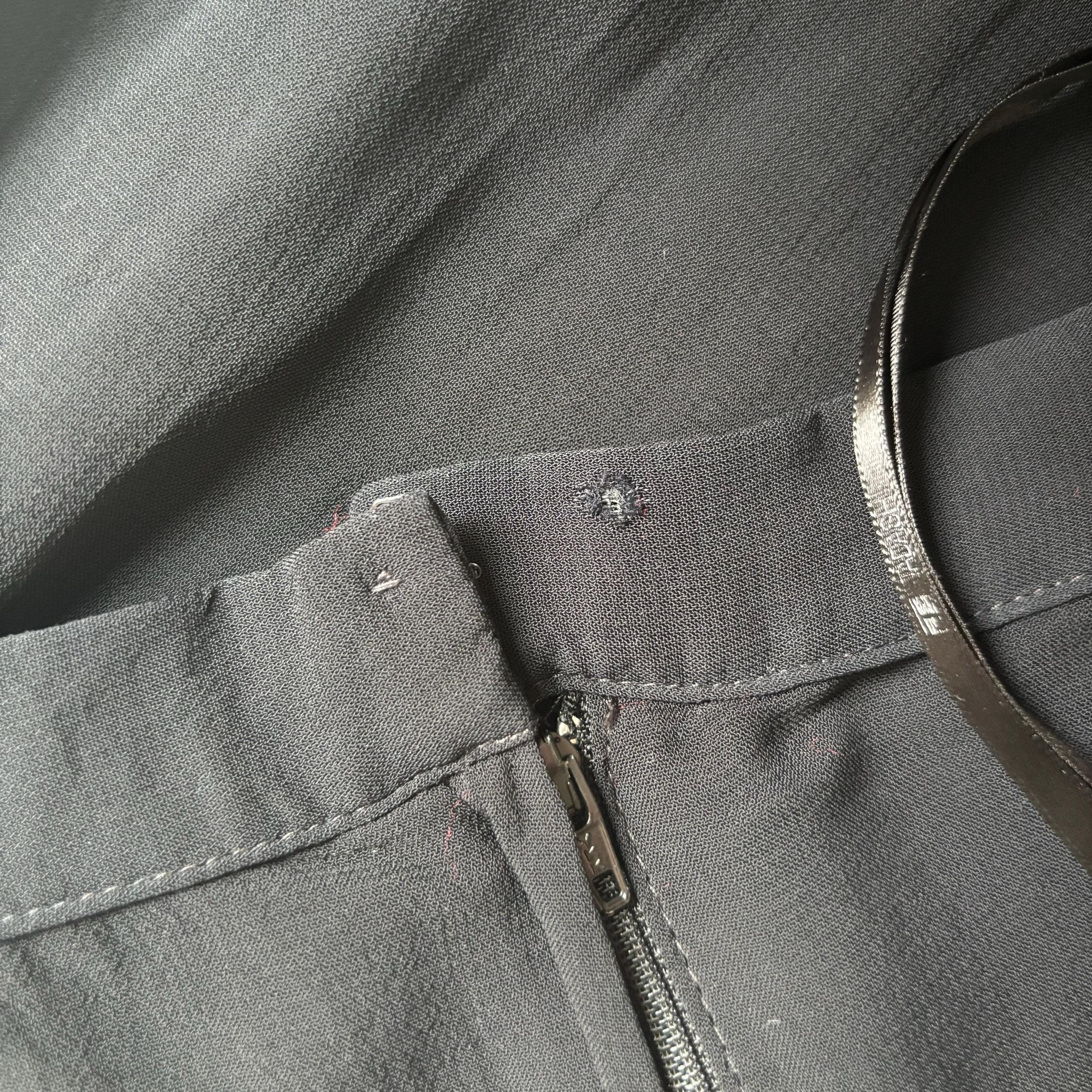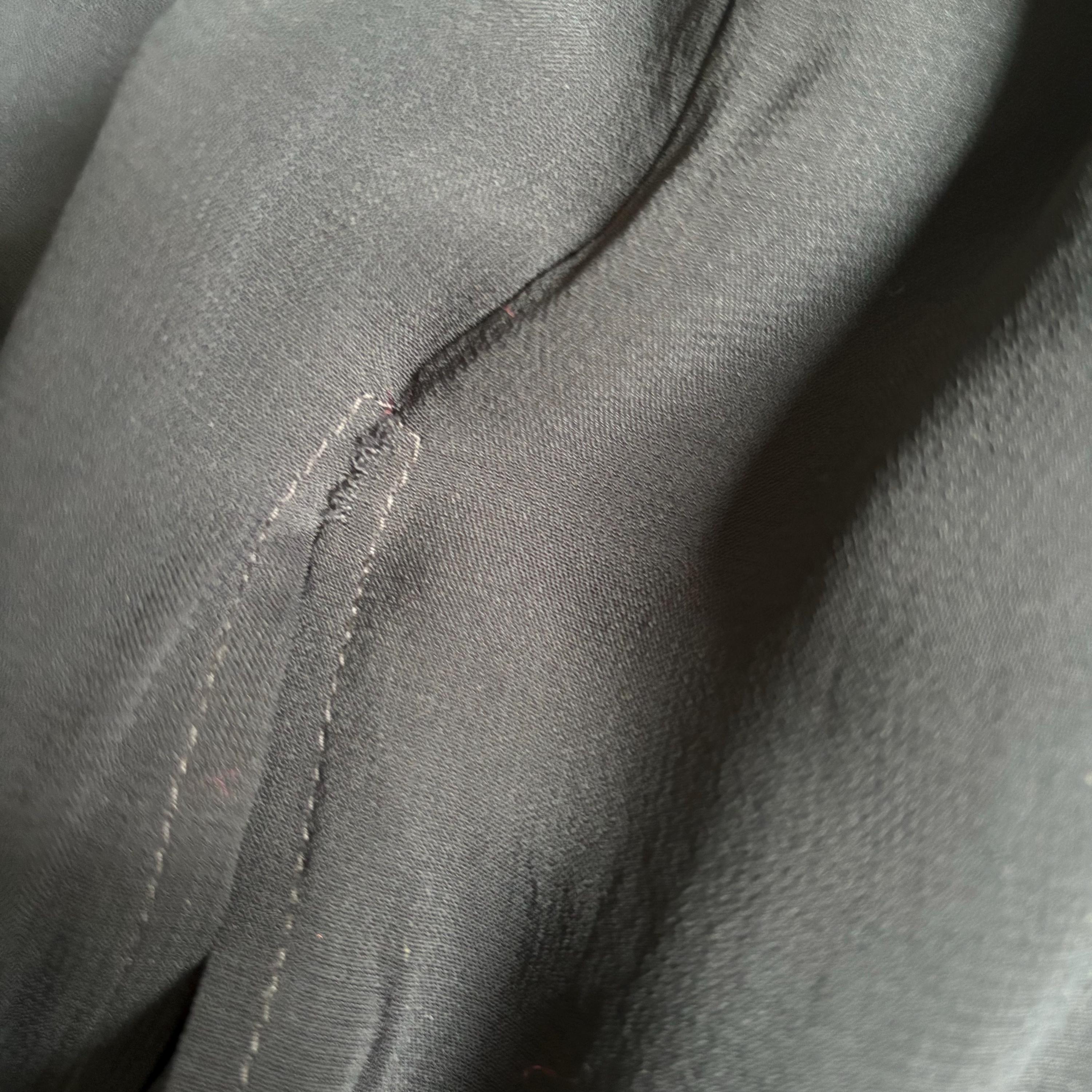 Vintage, good condition overall. The fabric is delicate, and is surprisingly free of damage! Where the outer panels join, some of the corner seams are a bit stressed. Someone must have moved the hook at some point, which has left a wee hole in the outer layer of the rear waistband. These are all very minor and do not detract from the pants when worn. Please see the photos for details.