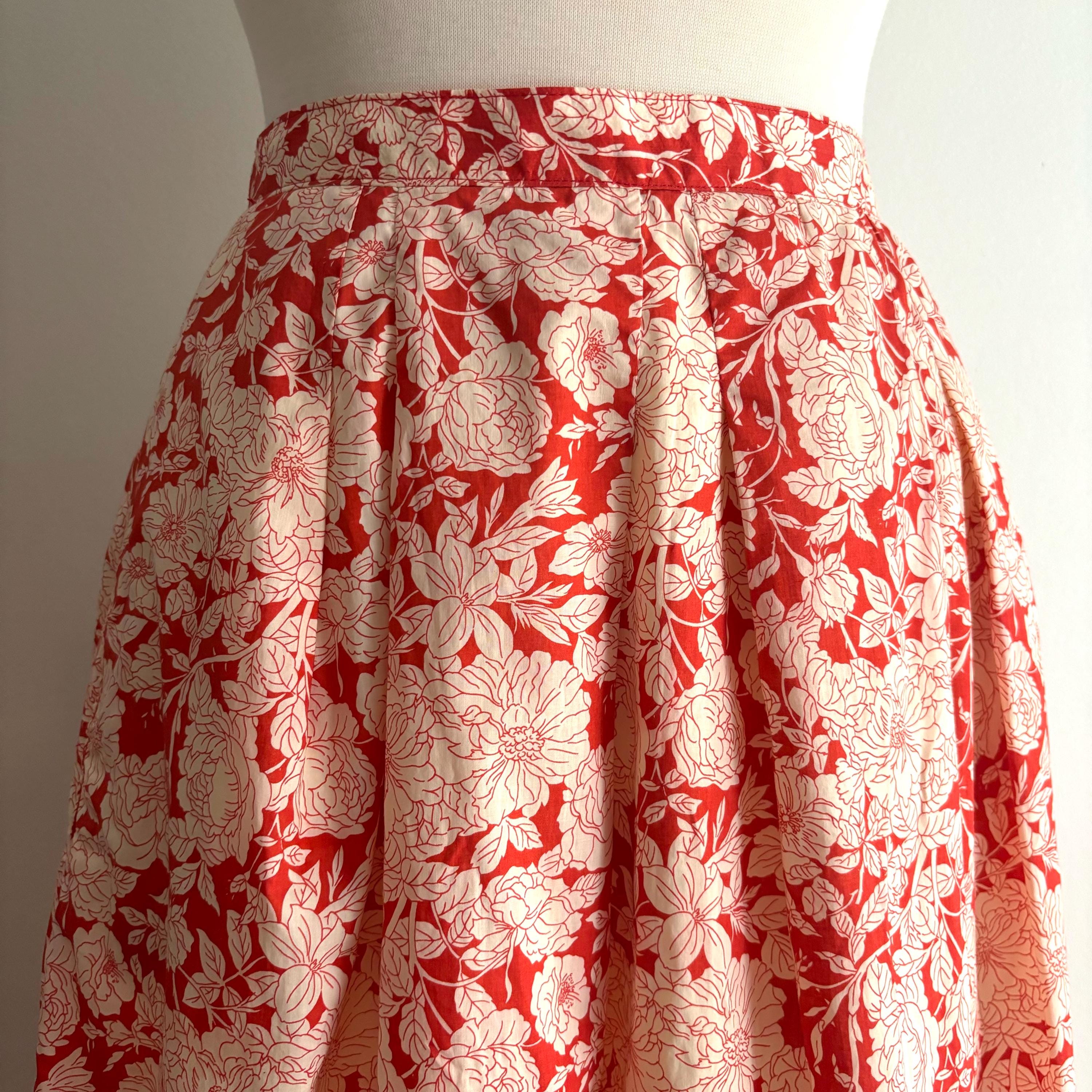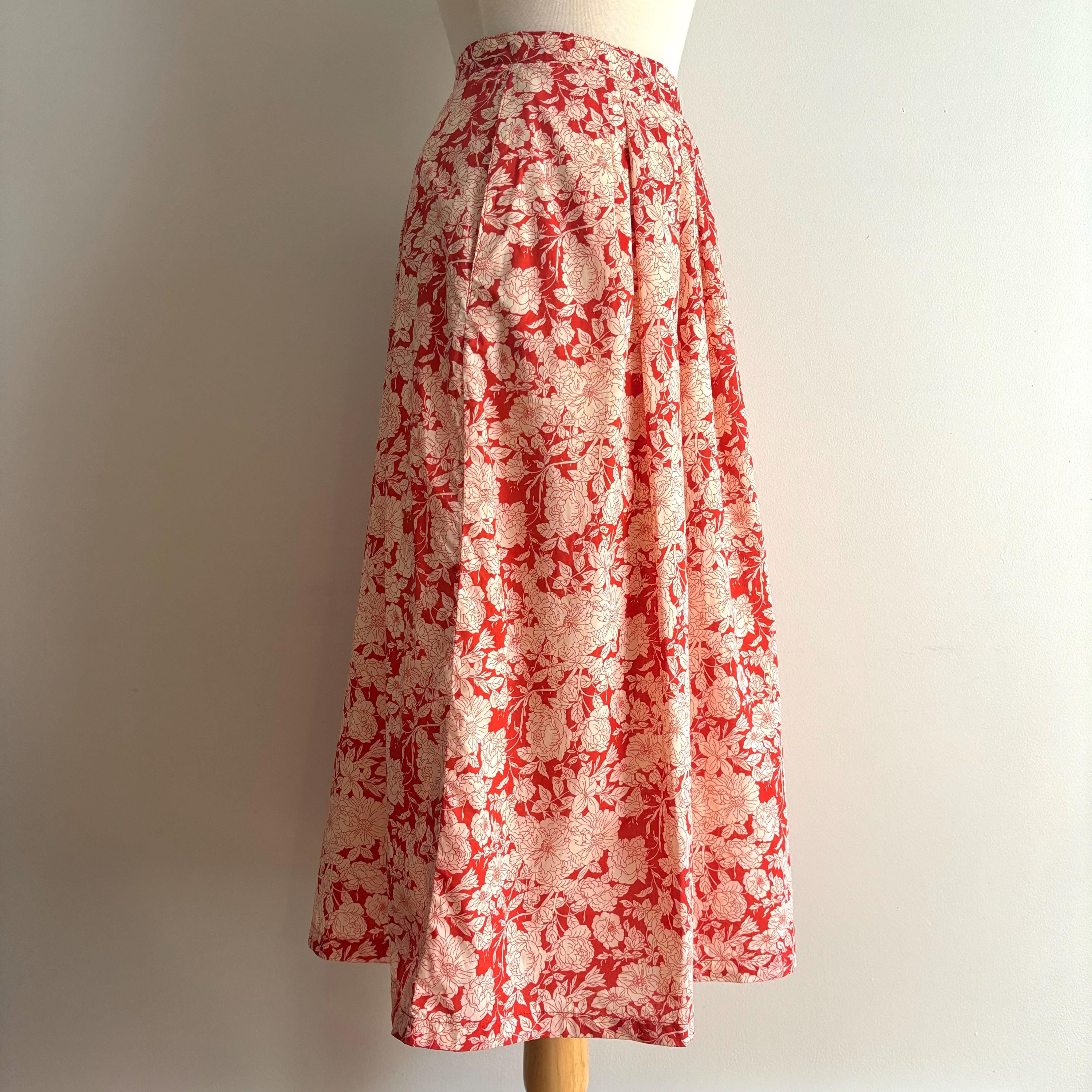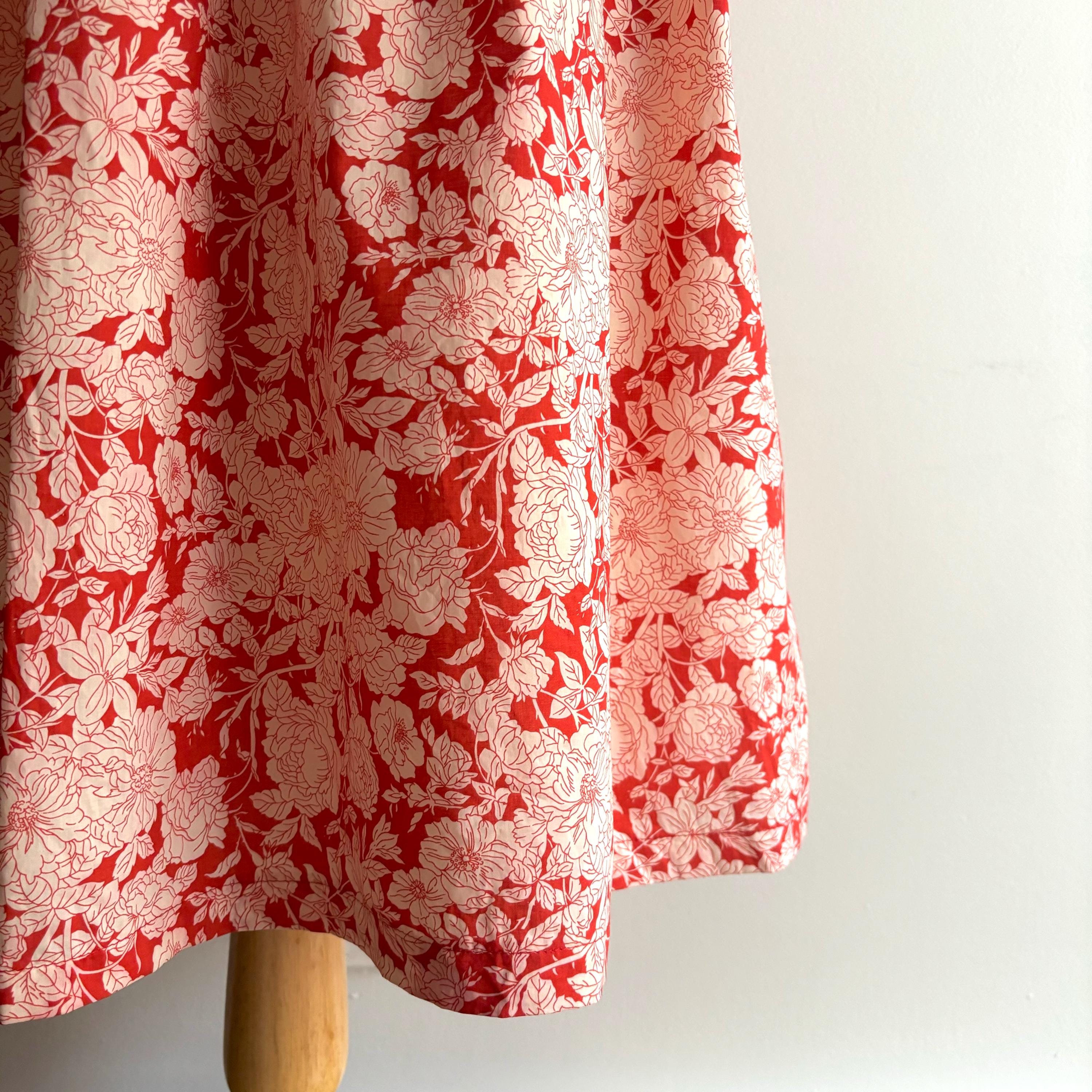 Gah, I love this skirt! The print is absolutely stunning. Tangles of white roses and thorny branches on a background of tomato red. The skirt is 100% cotton, and is fully lined with a polyester feel fabric that lends a little extra volume. The skirt closes at the waist with a side zip and hook & eye closure. It even has pockets! A rare find and a real treasure. Made in Ireland. Size 12, please see the measurements for best fit.