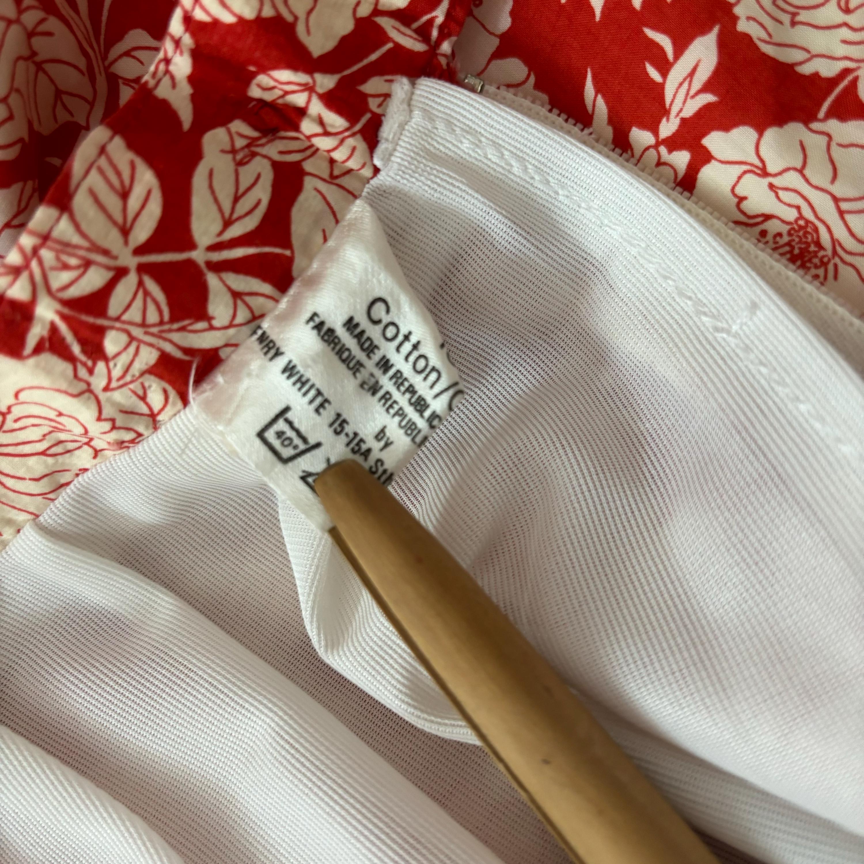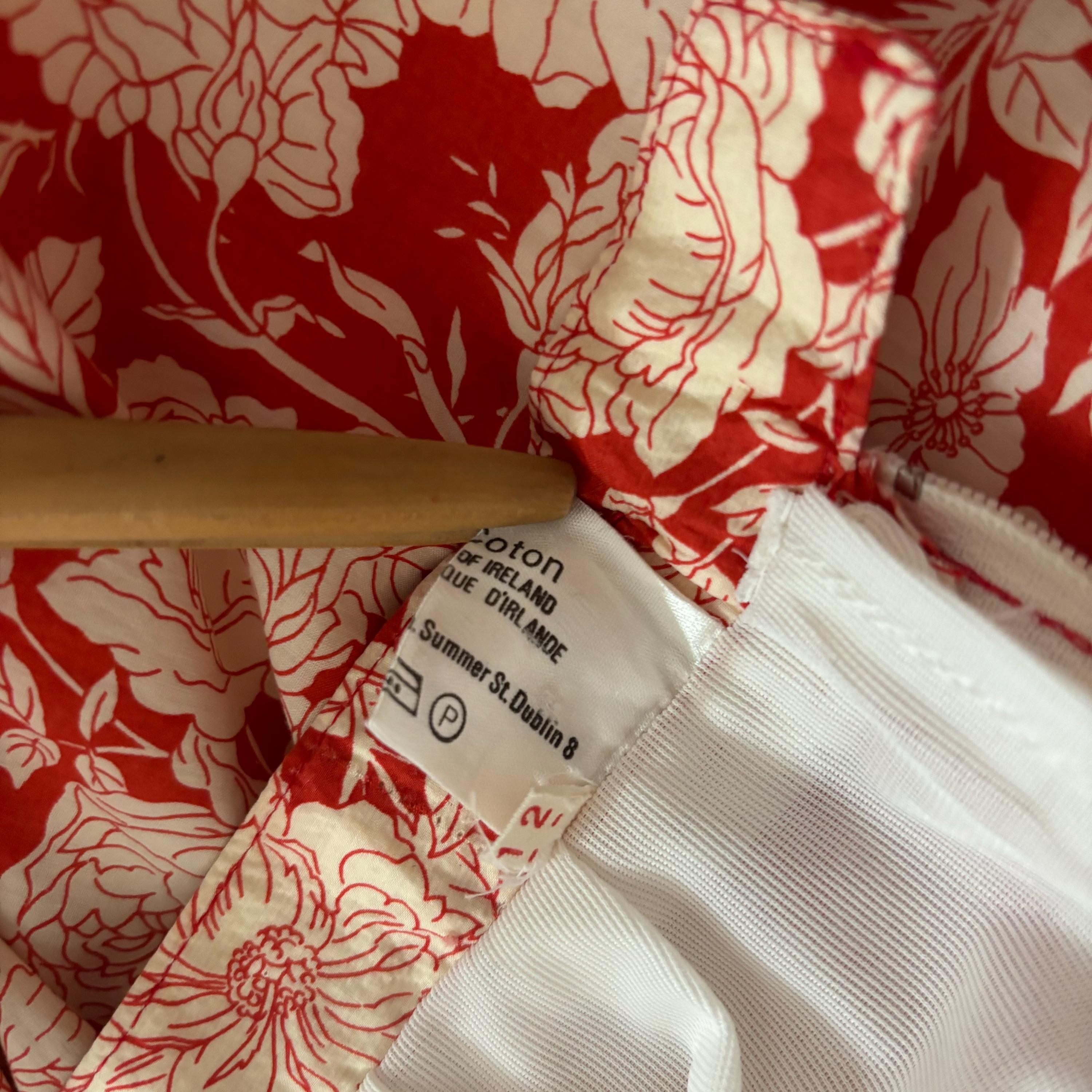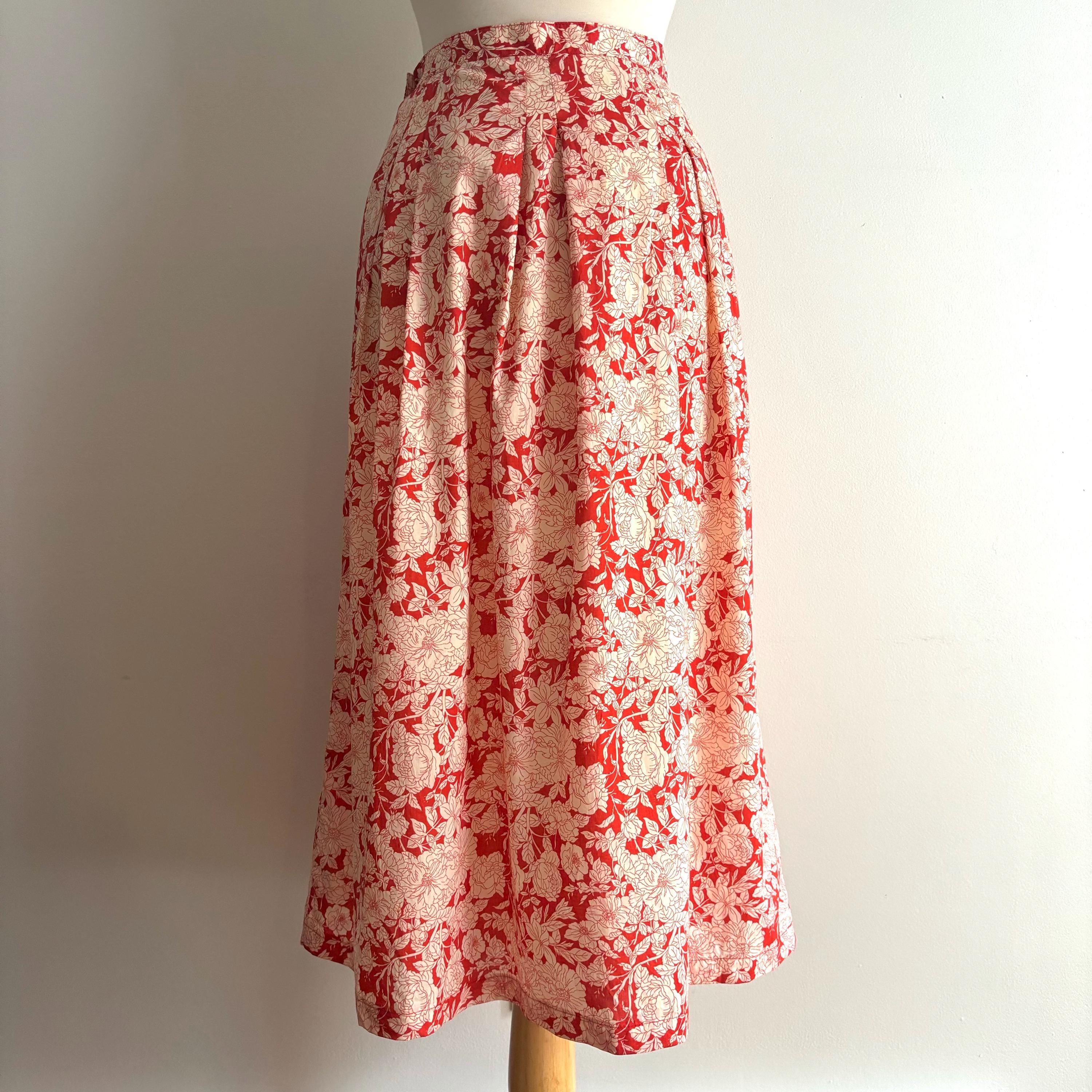 Gah, I love this skirt! The print is absolutely stunning. Tangles of white roses and thorny branches on a background of tomato red. The skirt is 100% cotton, and is fully lined with a polyester feel fabric that lends a little extra volume. The skirt closes at the waist with a side zip and hook & eye closure. It even has pockets! A rare find and a real treasure. Made in Ireland. Size 12, please see the measurements for best fit.