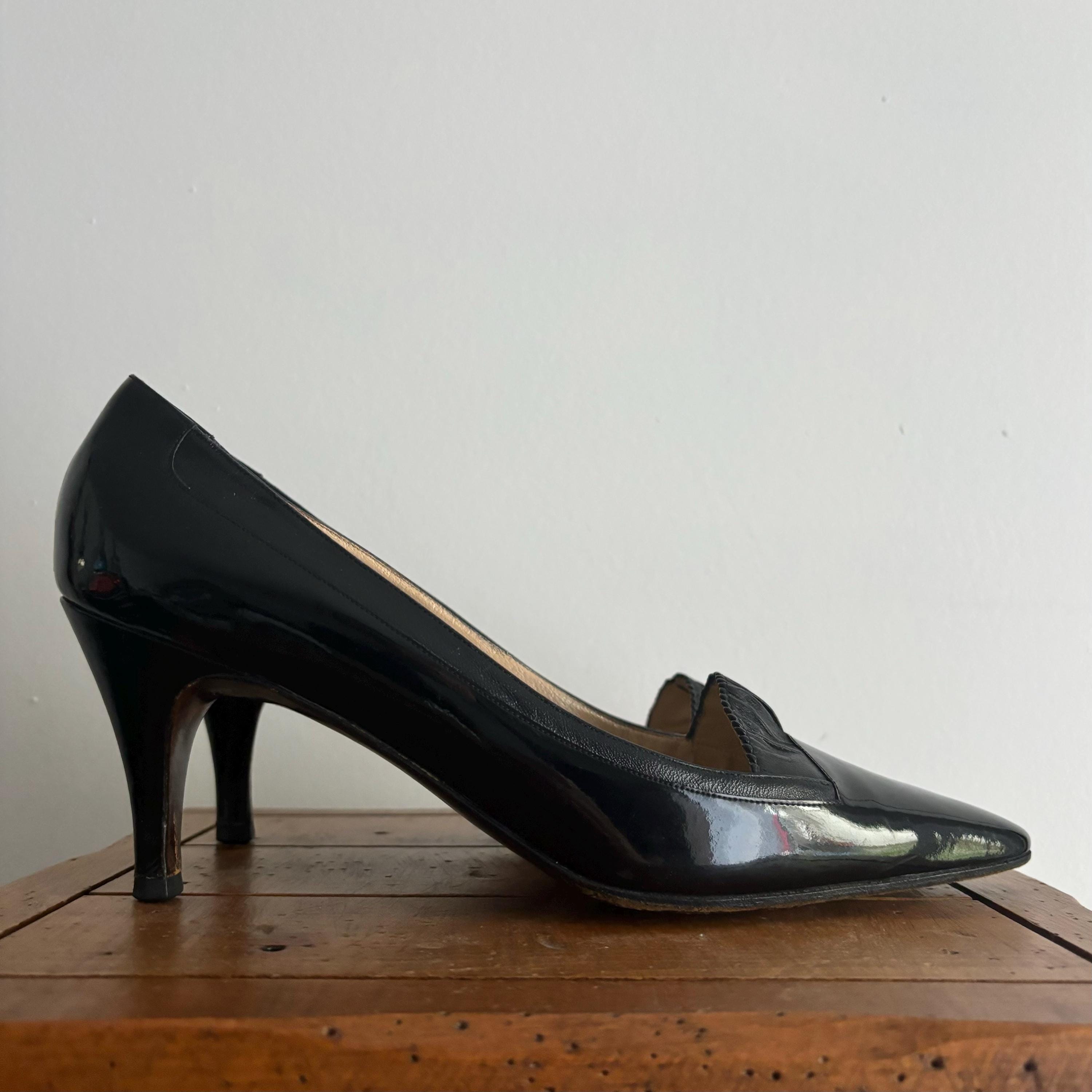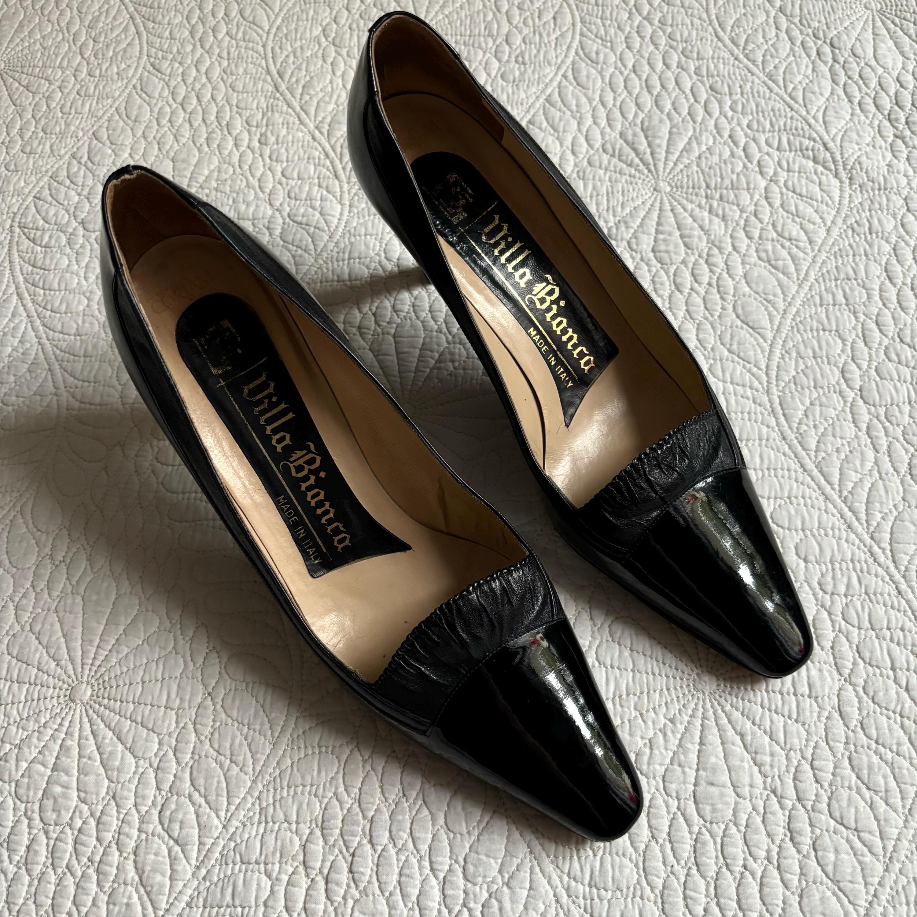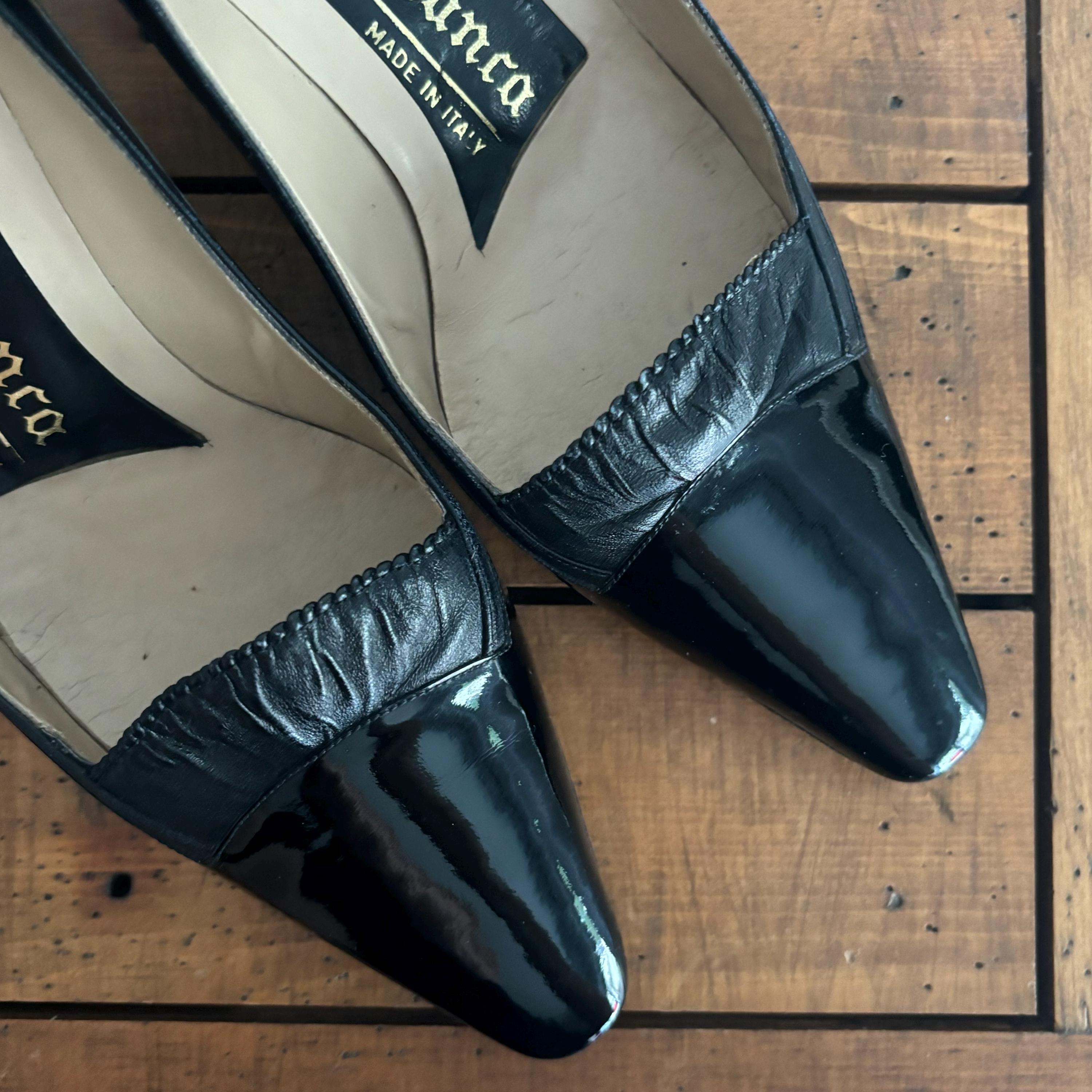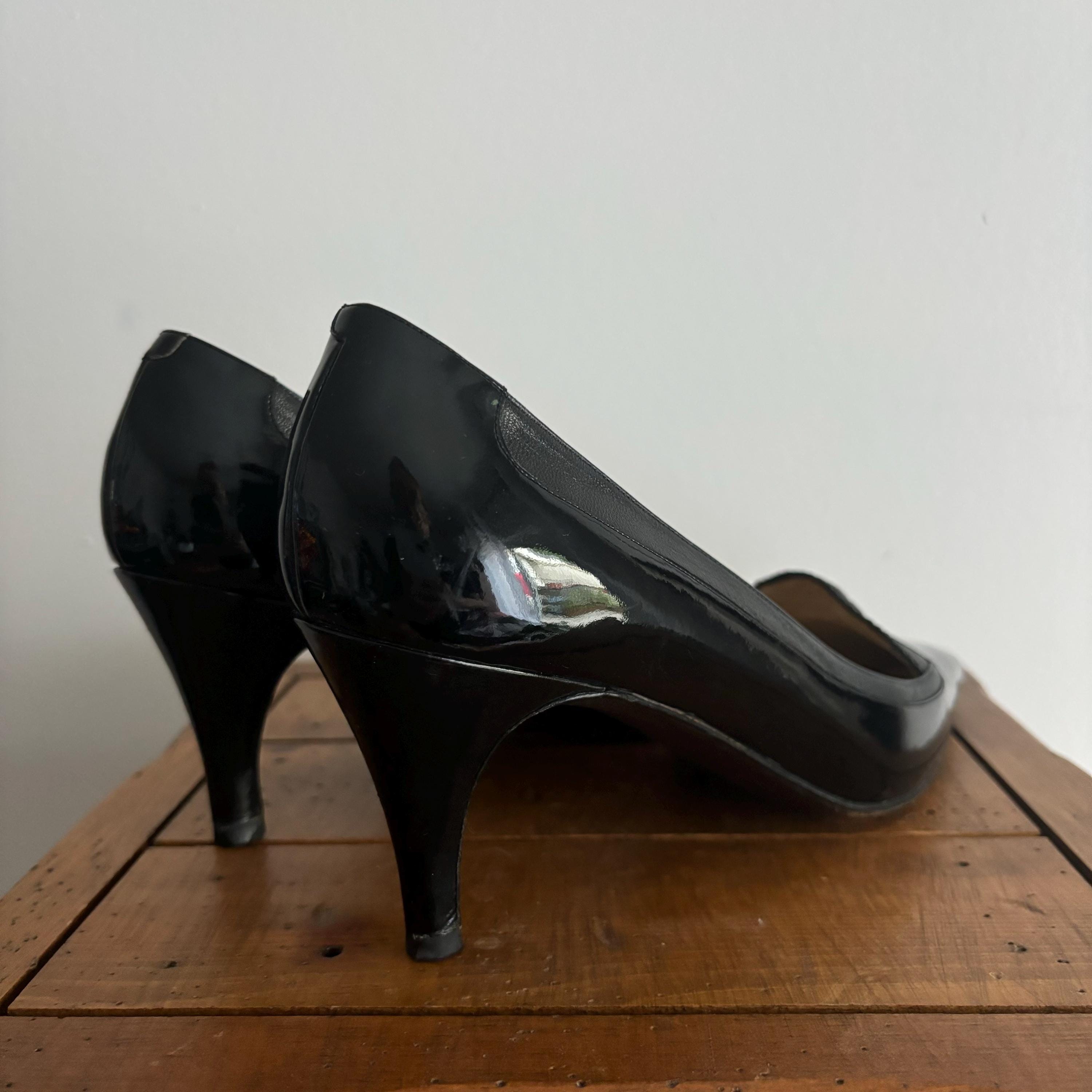 Absolutely stunning black patent pumps! Made of Corfam, a leather substitute known for its durability, breathability, and water-repelling powers. These shoes show very little wear and are just gorgeous. Shiny patent, with a leather-look trim at the sides and extra detail at the vamp. I love these because a good pair of black pumps are such a staple, but these have that something extra that makes you look twice! Made in Italy. Size 38.5.