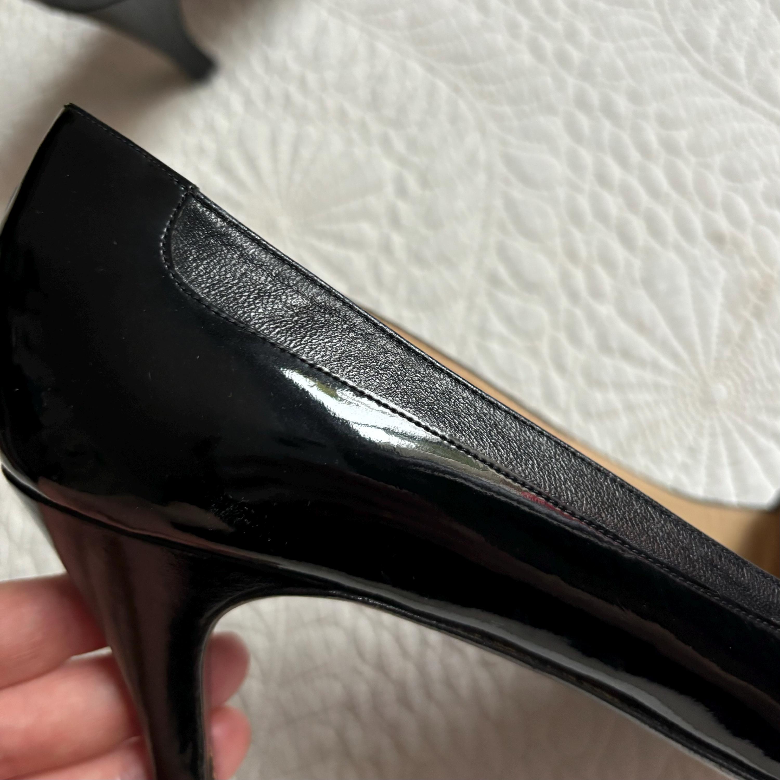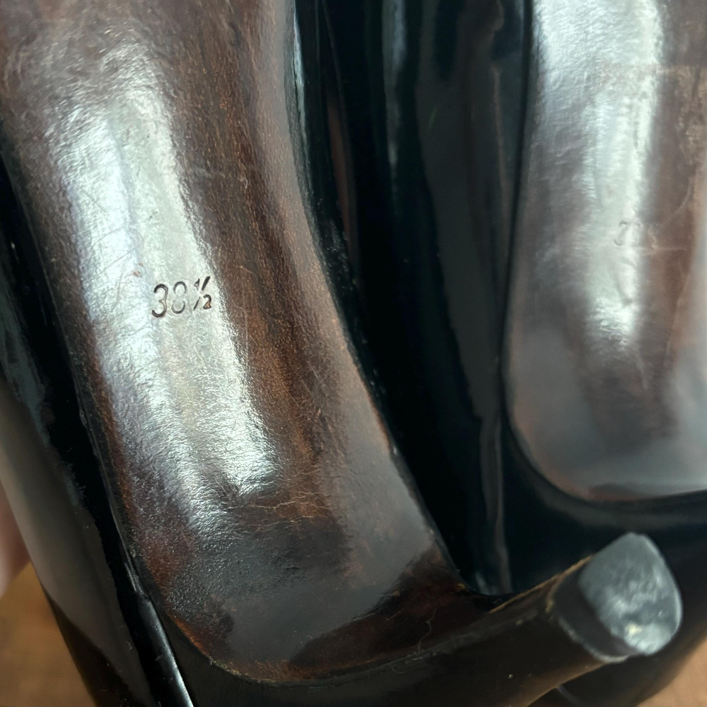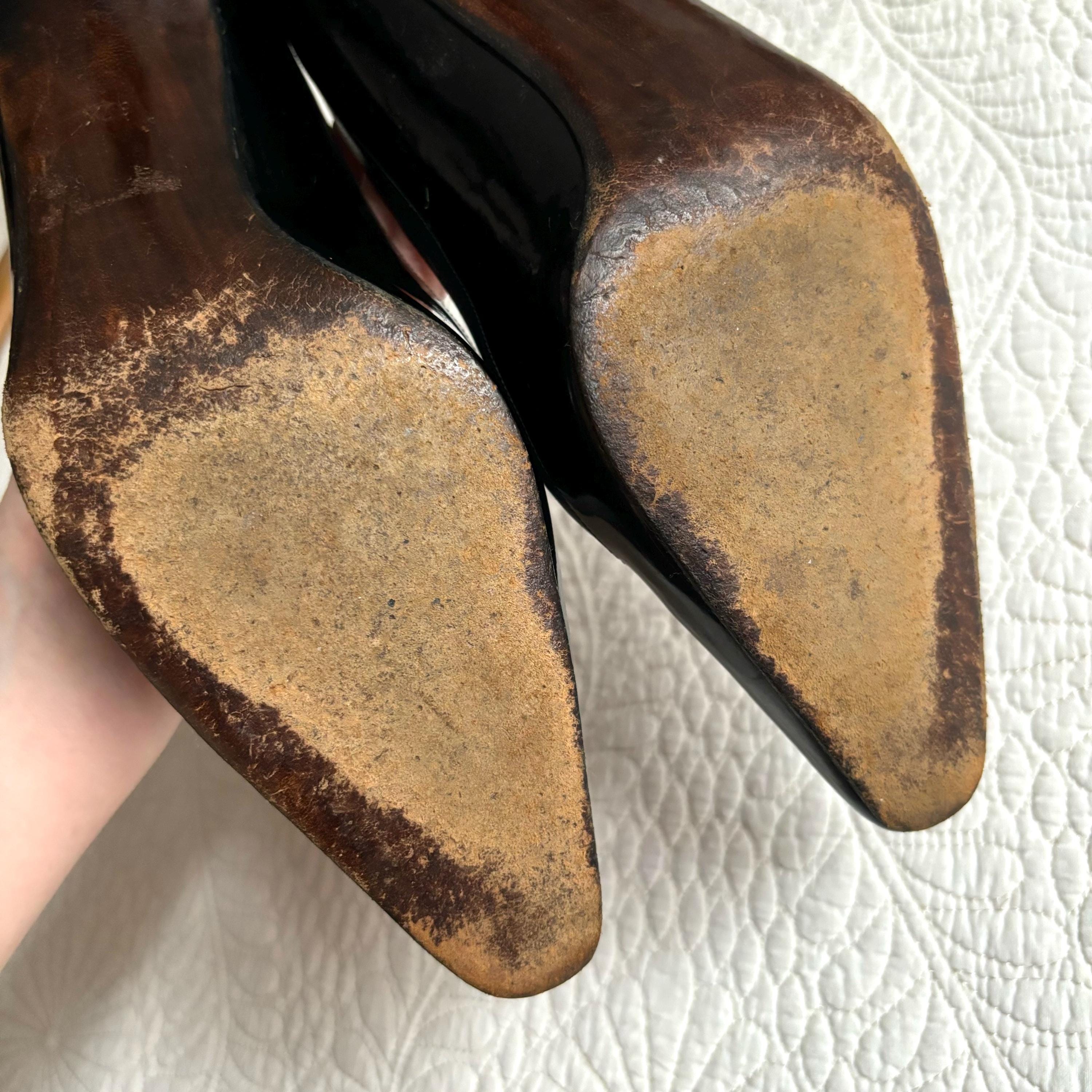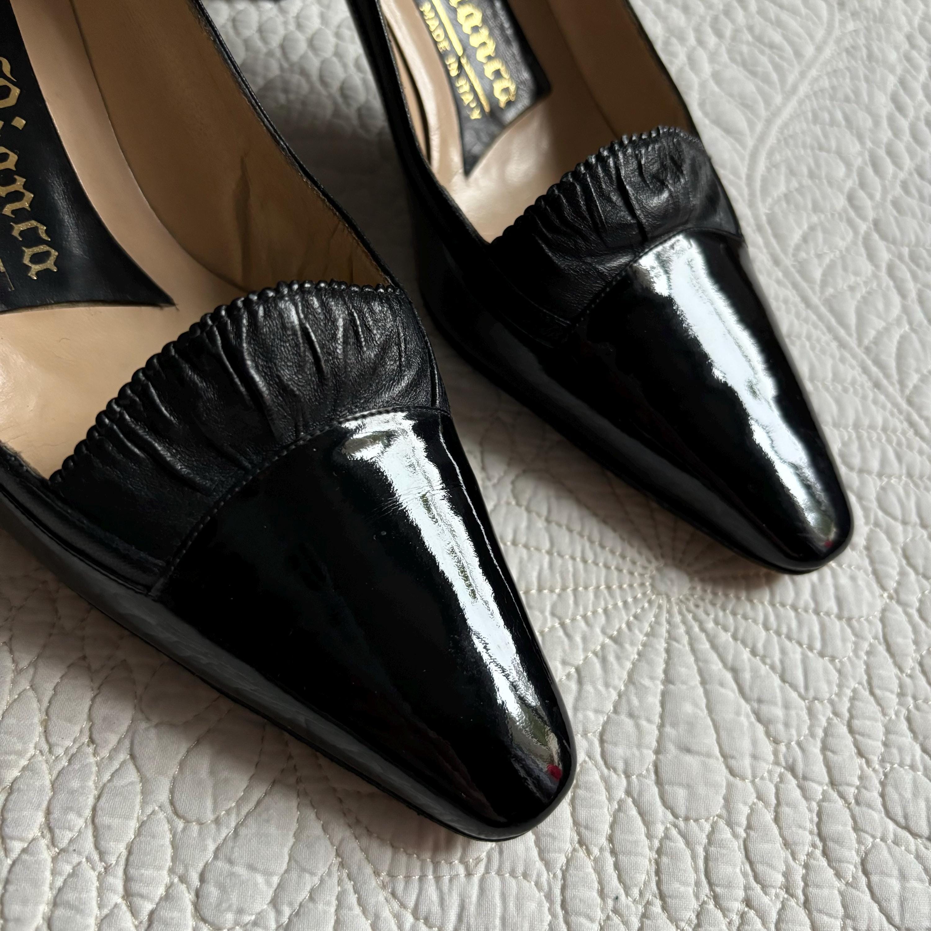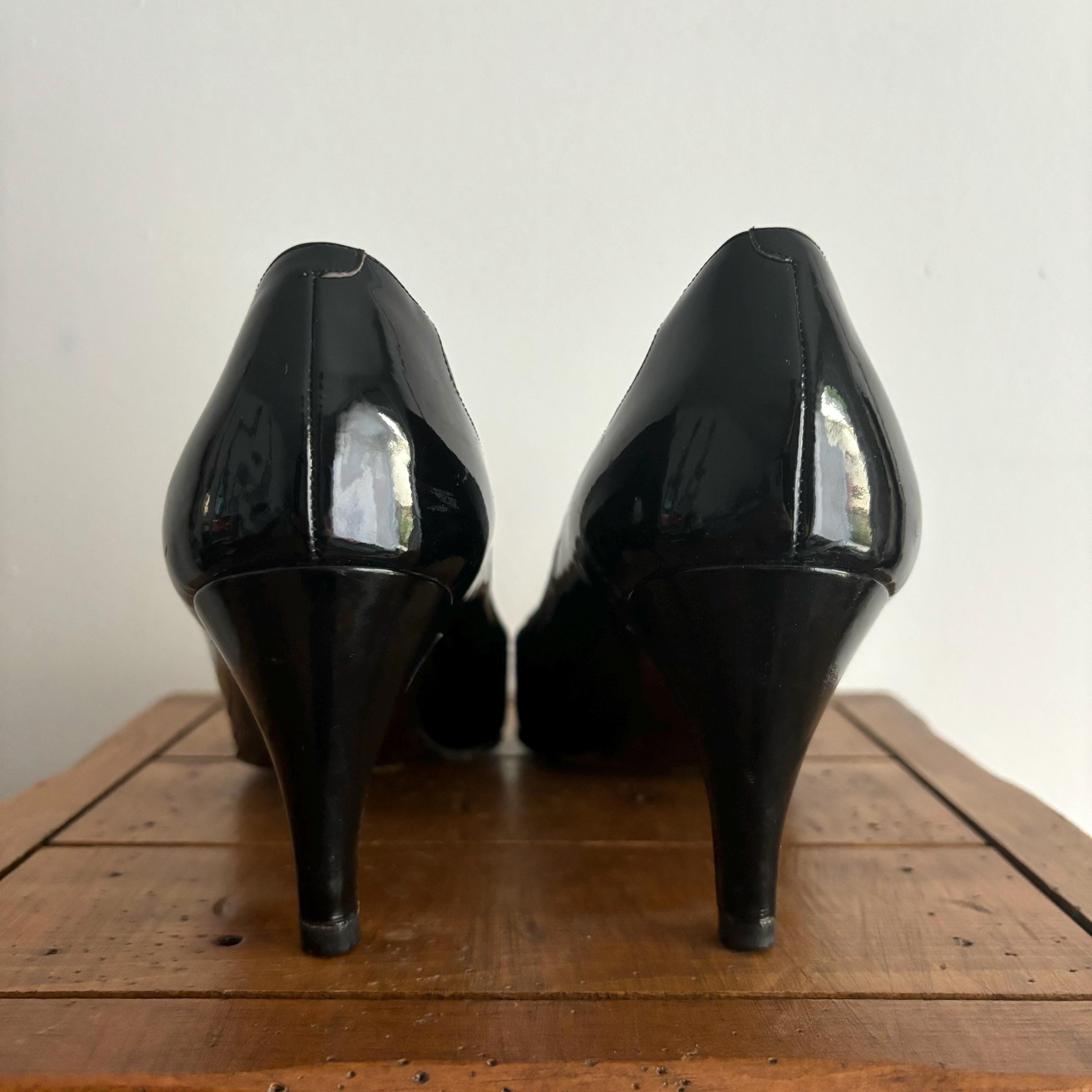 Absolutely stunning black patent pumps! Made of Corfam, a leather substitute known for its durability, breathability, and water-repelling powers. These shoes show very little wear and are just gorgeous. Shiny patent, with a leather-look trim at the sides and extra detail at the vamp. I love these because a good pair of black pumps are such a staple, but these have that something extra that makes you look twice! Made in Italy. Size 38.5.