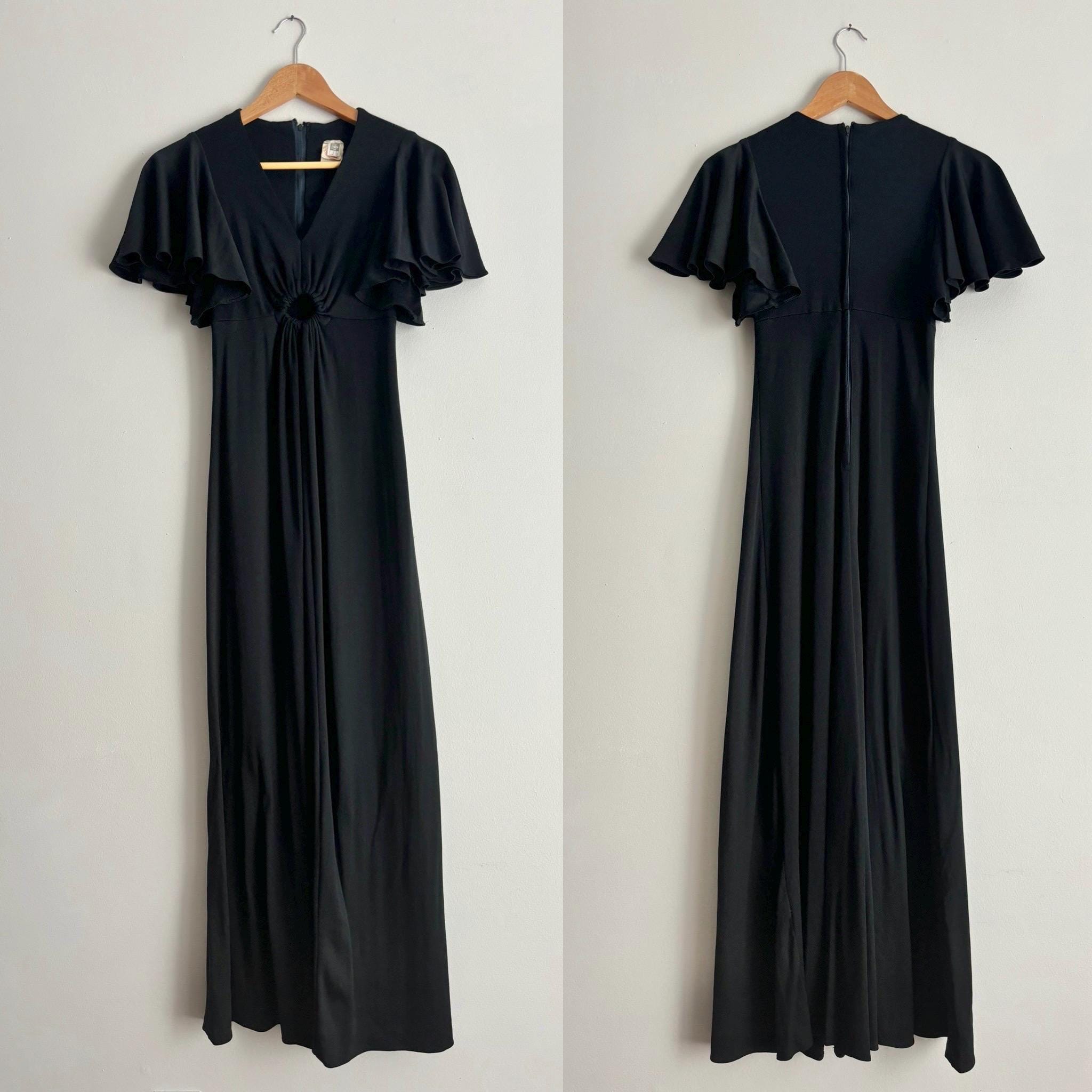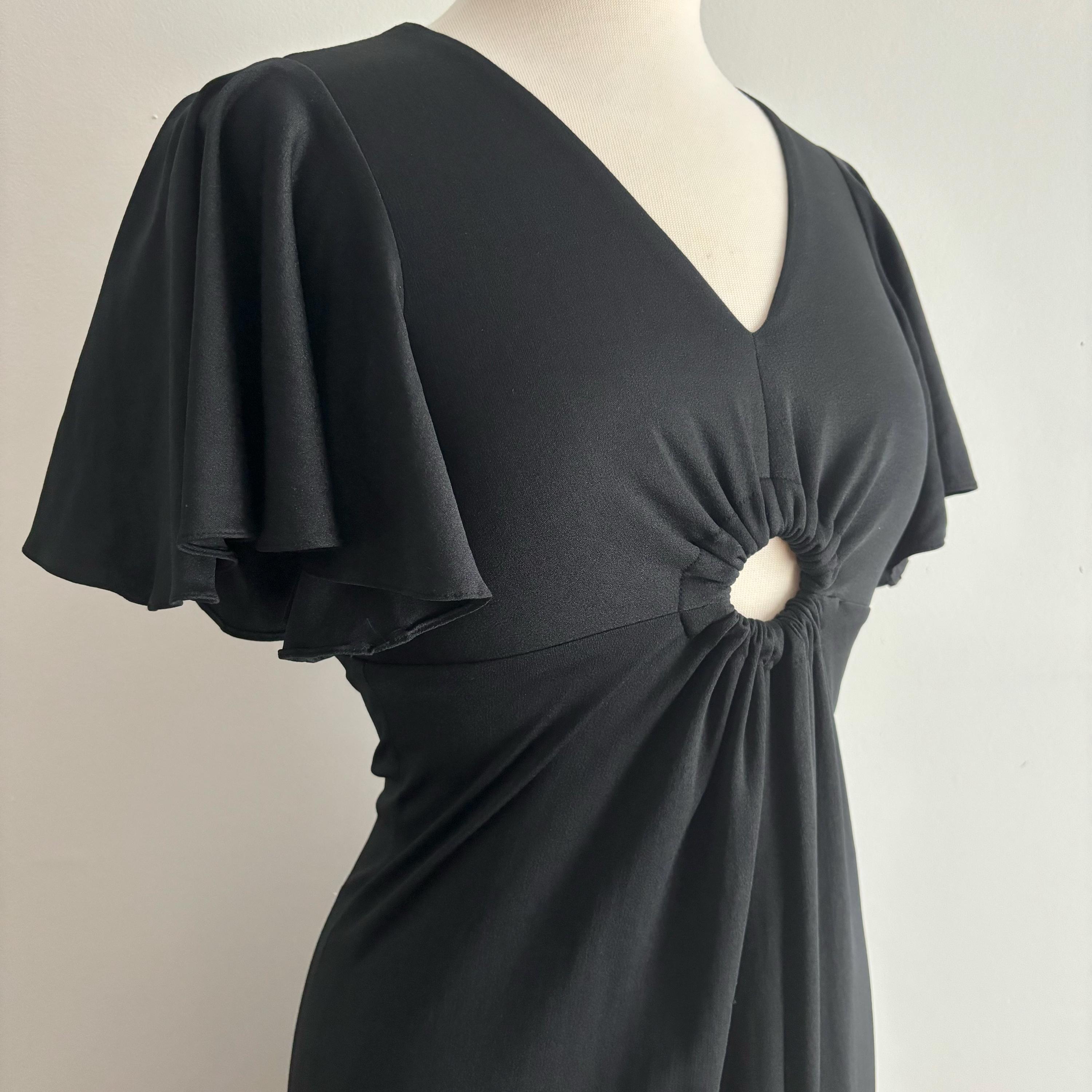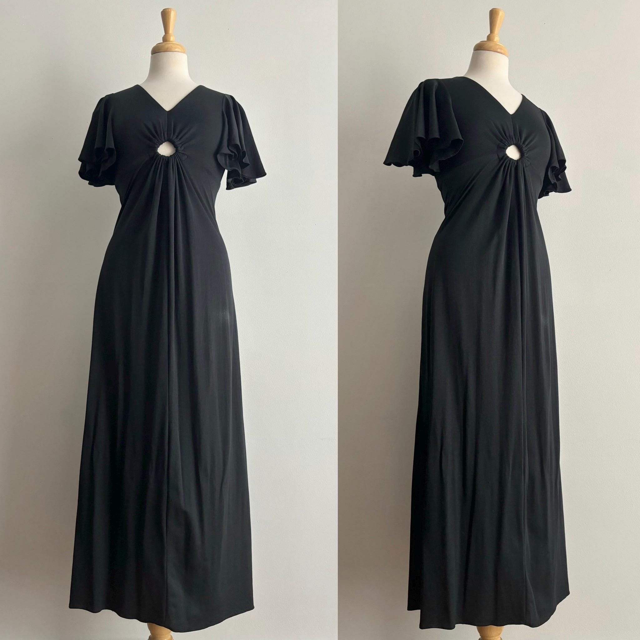 An incredible 70s dress, with so many good details. This dress has the loveliest flutter sleeves, v-neck with an empire waist, and a nice round keyhole. The skirt falls from the high waist to the ankles. Made in London, England. 100% polyamide. Size 38, but please see the measurements for best fit. It was a bit tight for my dress form, so I didn't zip it up at the back. The zipper does work, not to worry!