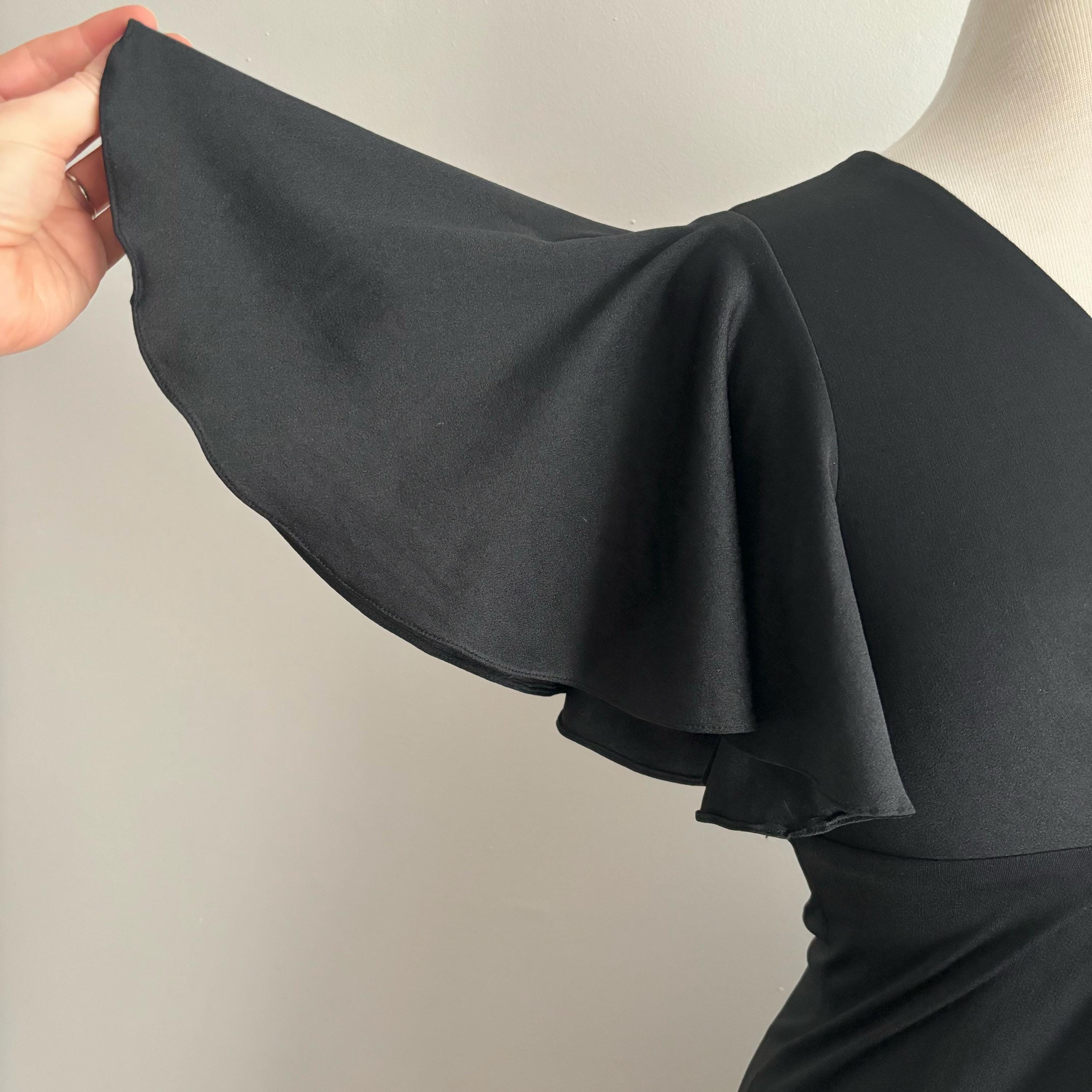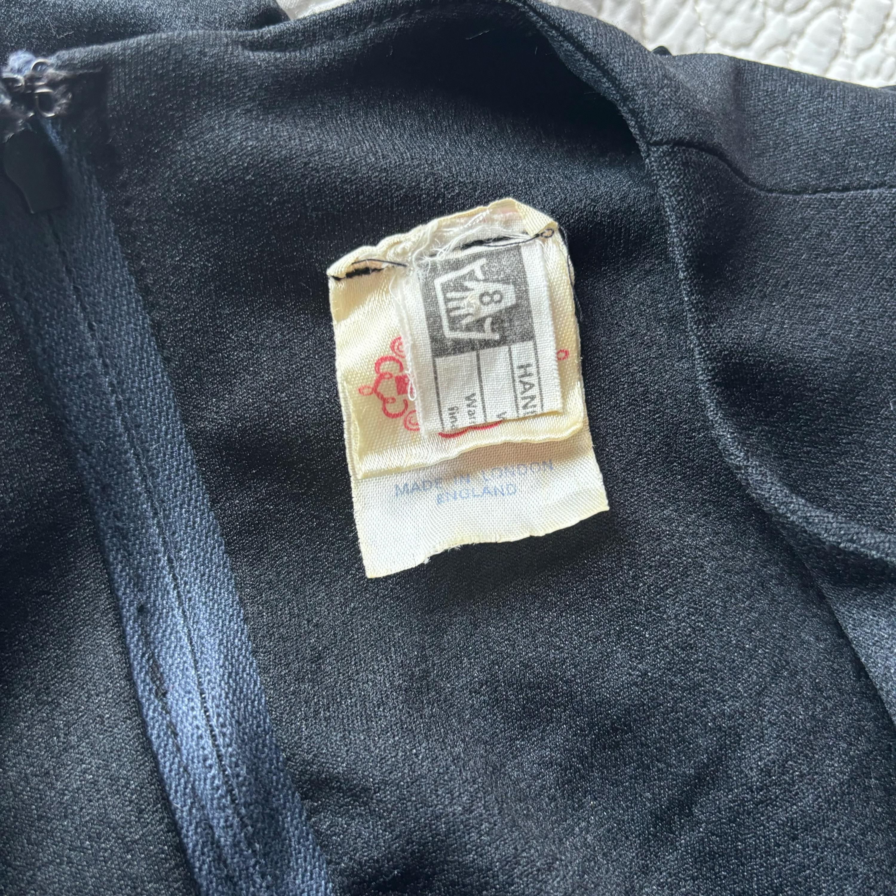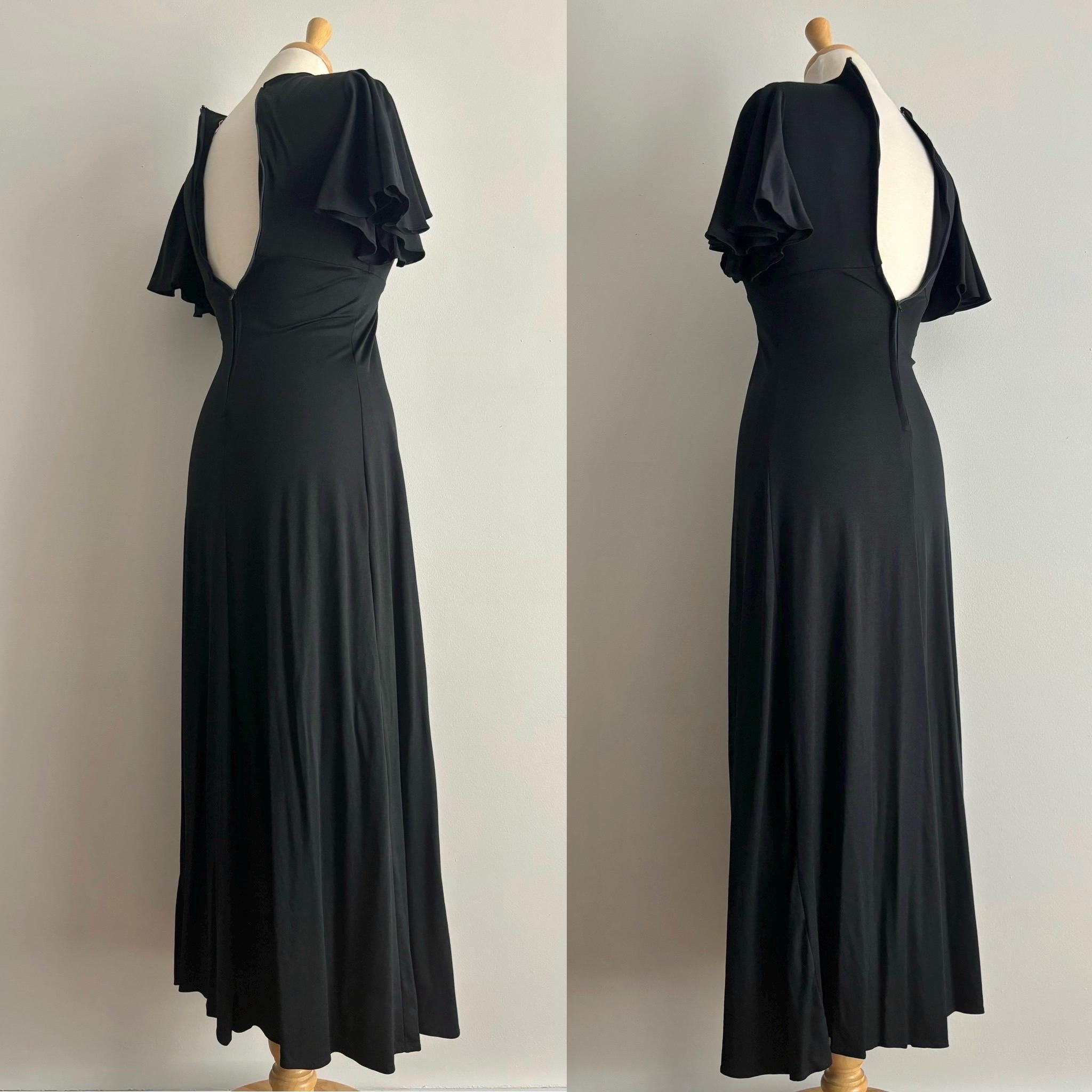 An incredible 70s dress, with so many good details. This dress has the loveliest flutter sleeves, v-neck with an empire waist, and a nice round keyhole. The skirt falls from the high waist to the ankles. Made in London, England. 100% polyamide. Size 38, but please see the measurements for best fit. It was a bit tight for my dress form, so I didn't zip it up at the back. The zipper does work, not to worry!