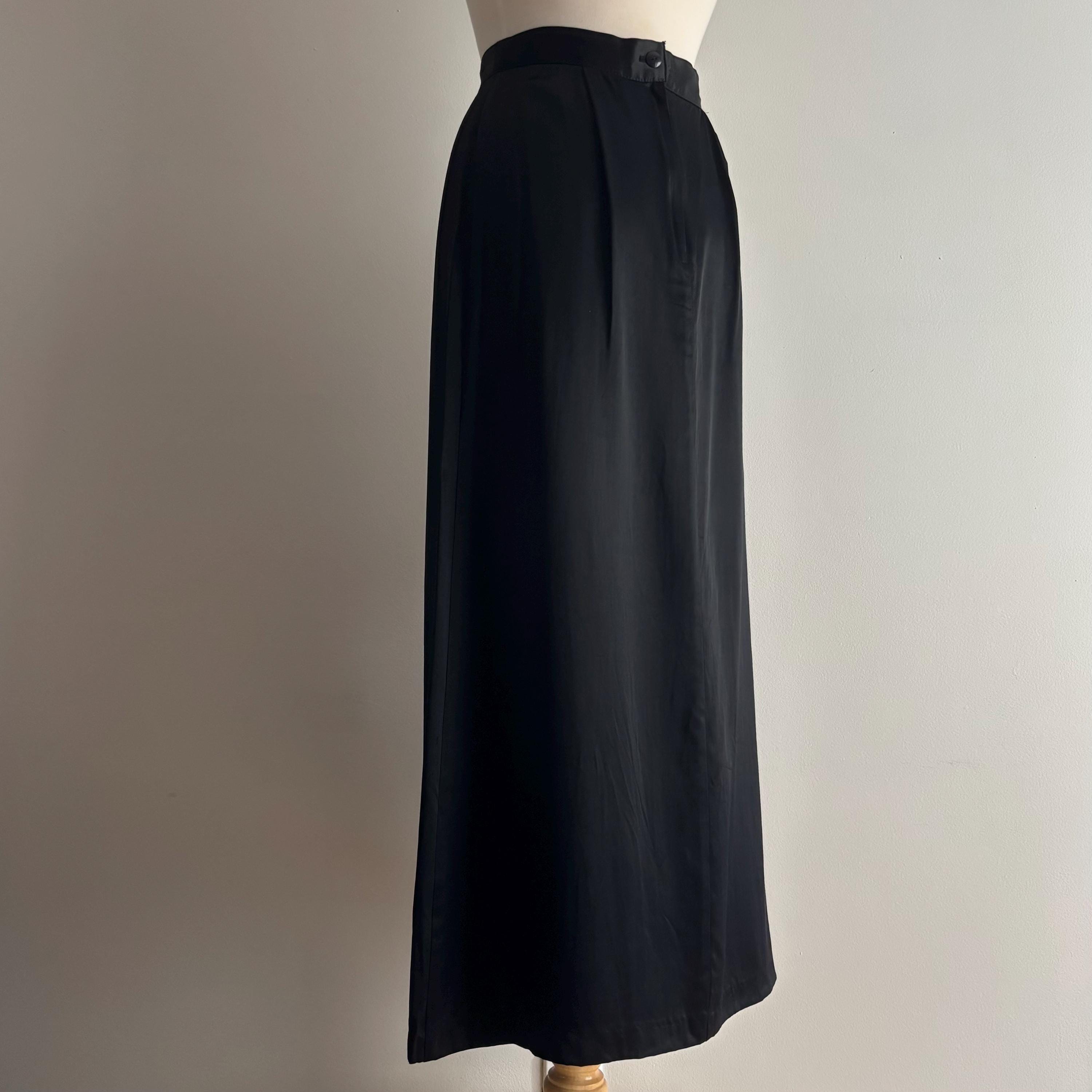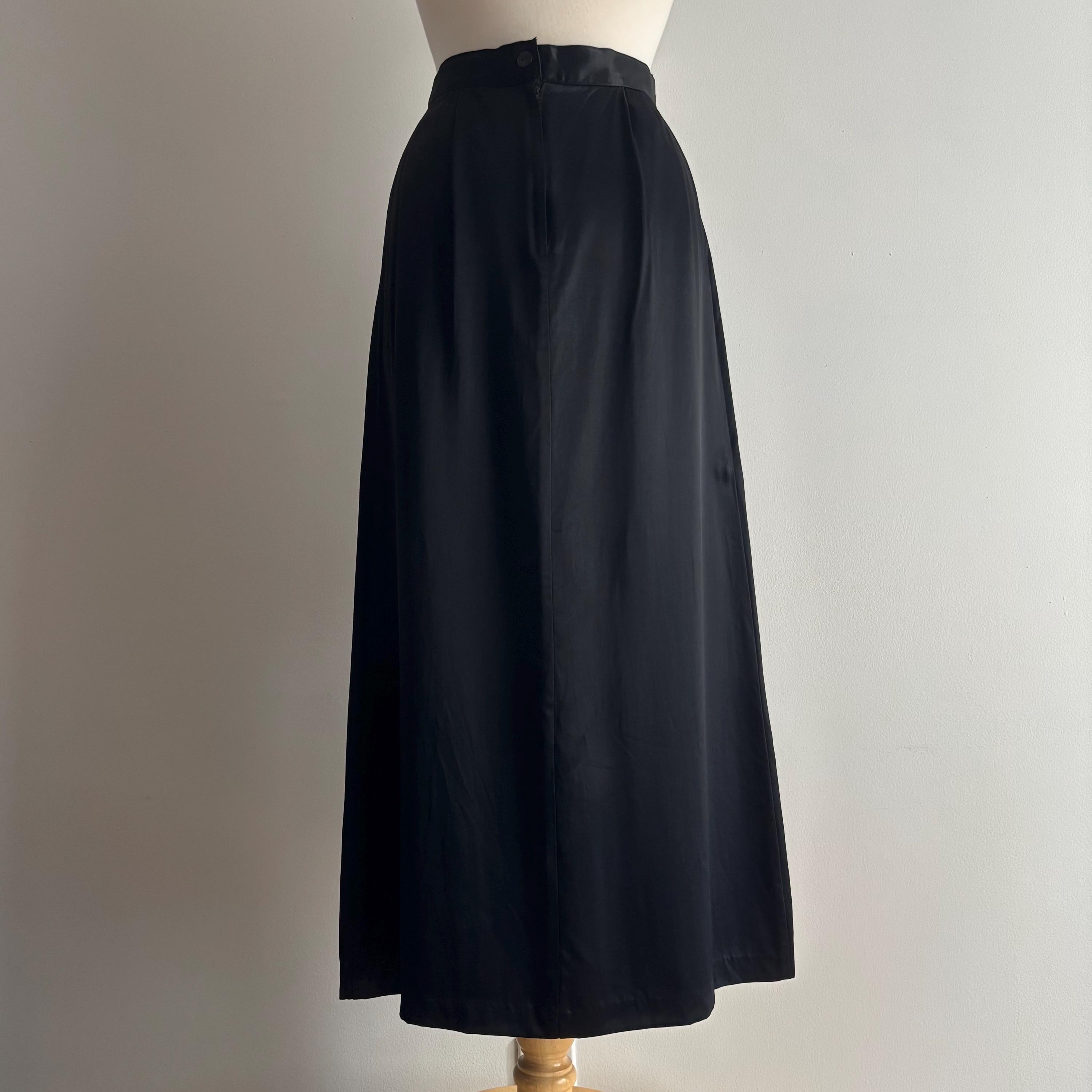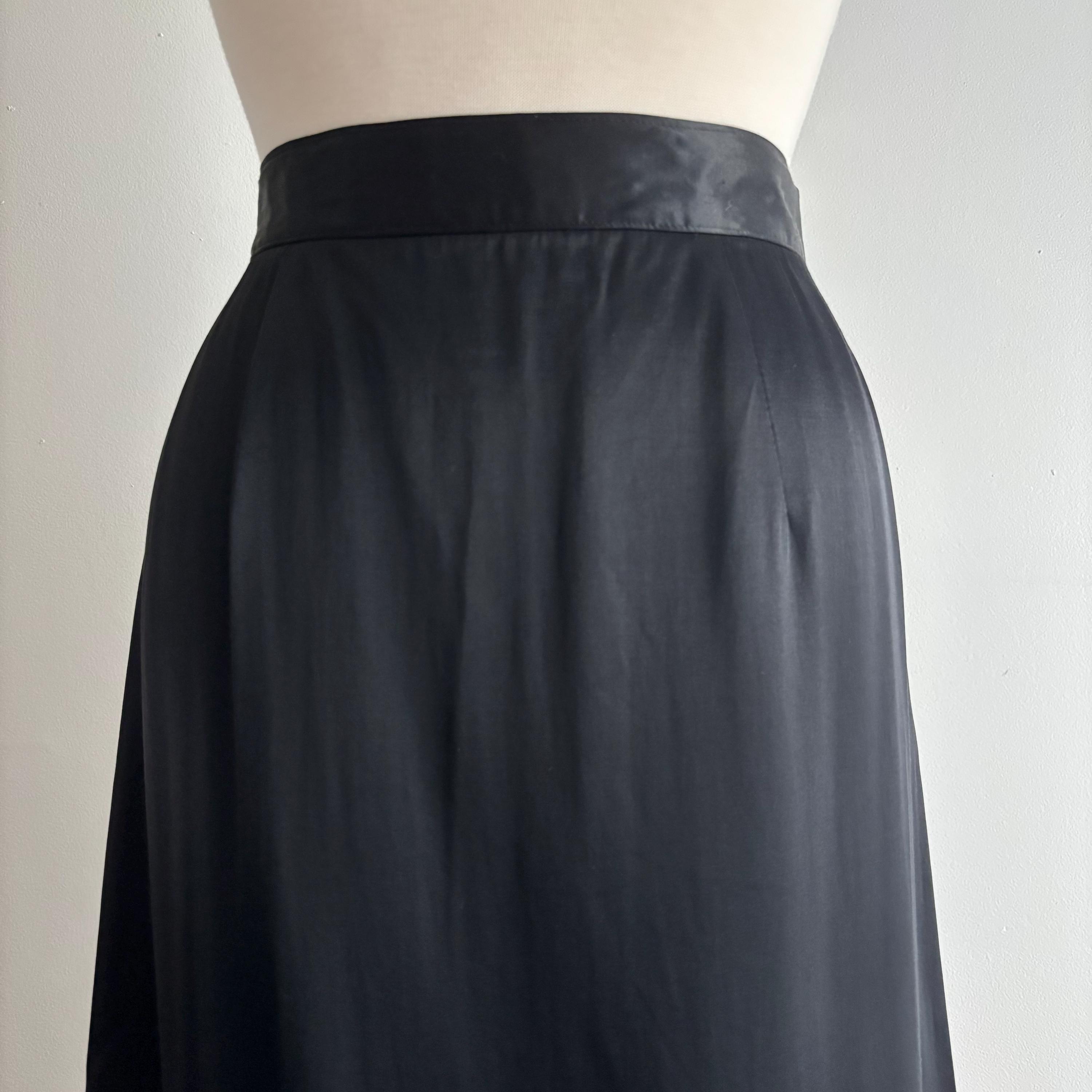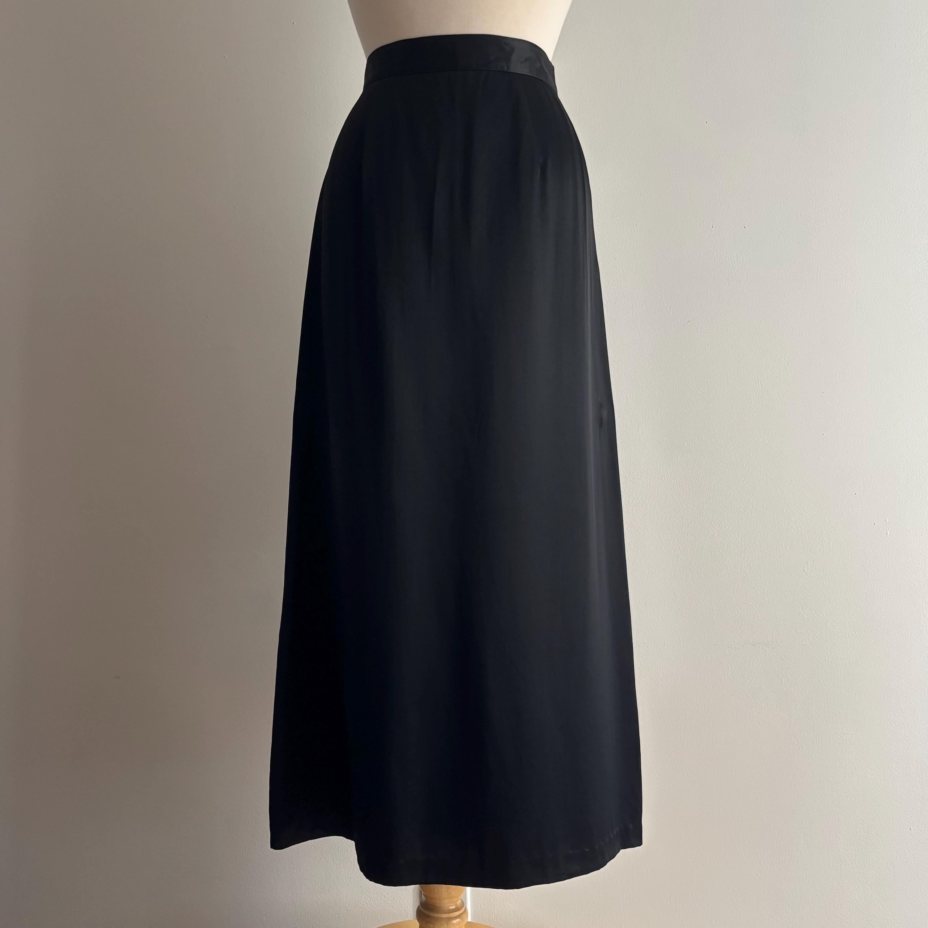 A stunning vintage black satin maxi skirt! Not just for special occasions, this skirt looks amazing with a soft sweater and sneakers or pointy flats. The skirt has darts at the waist, with a zipper and button to close at the back. There is a slight a-line which make it a lot easier to walk in, as it has no kick pleat. 54% rayon, 46% acetate. Made in Canada. Please see the measurements for best fit.