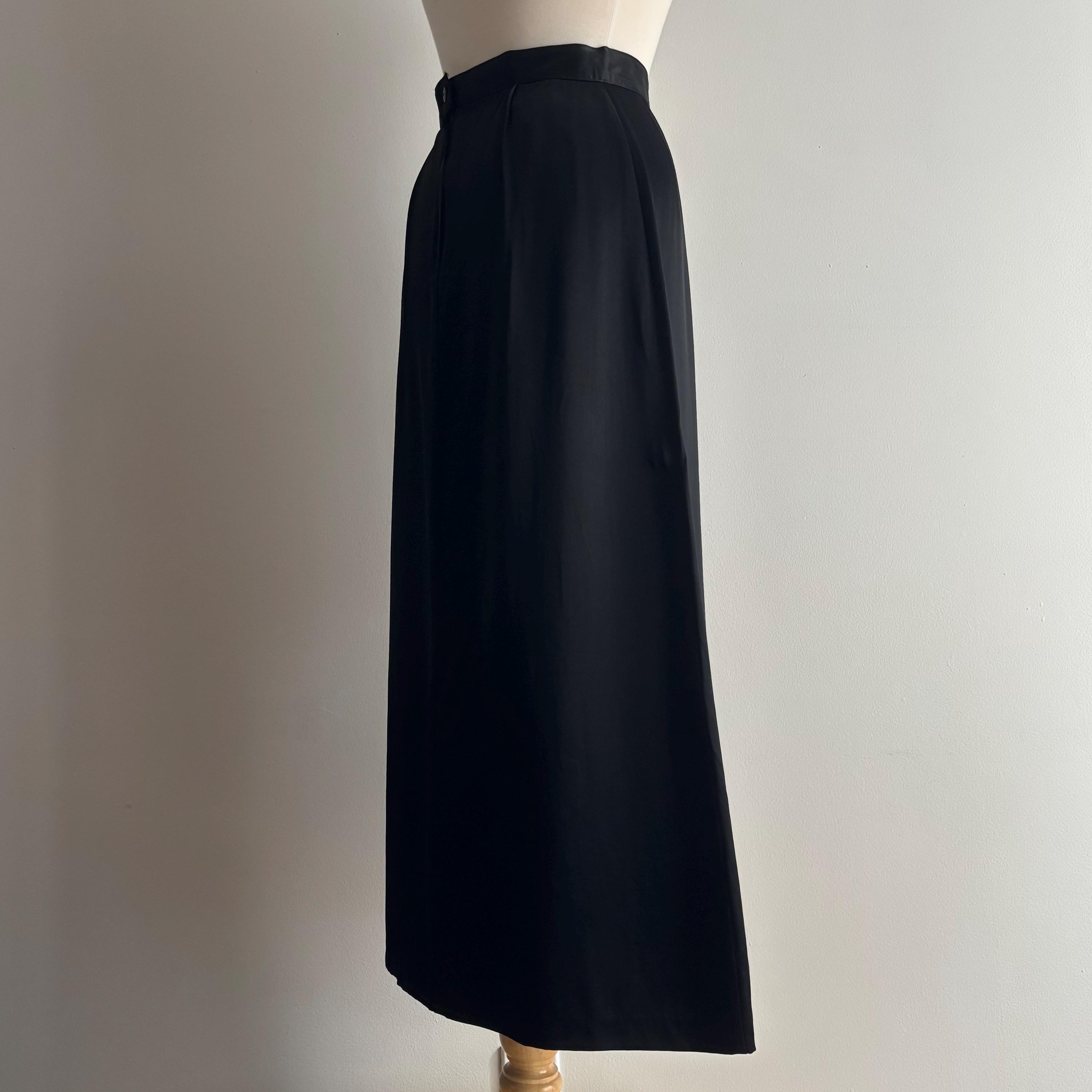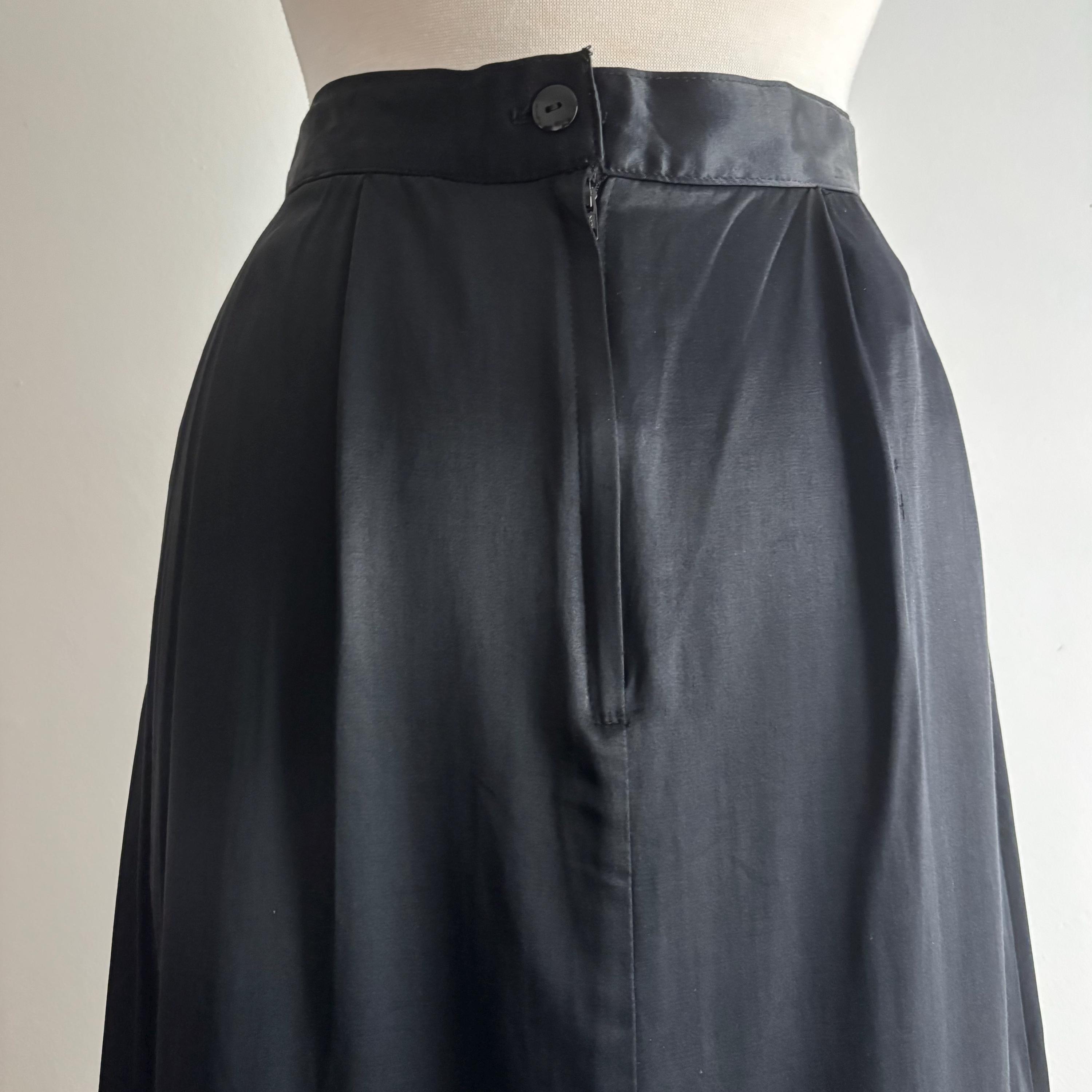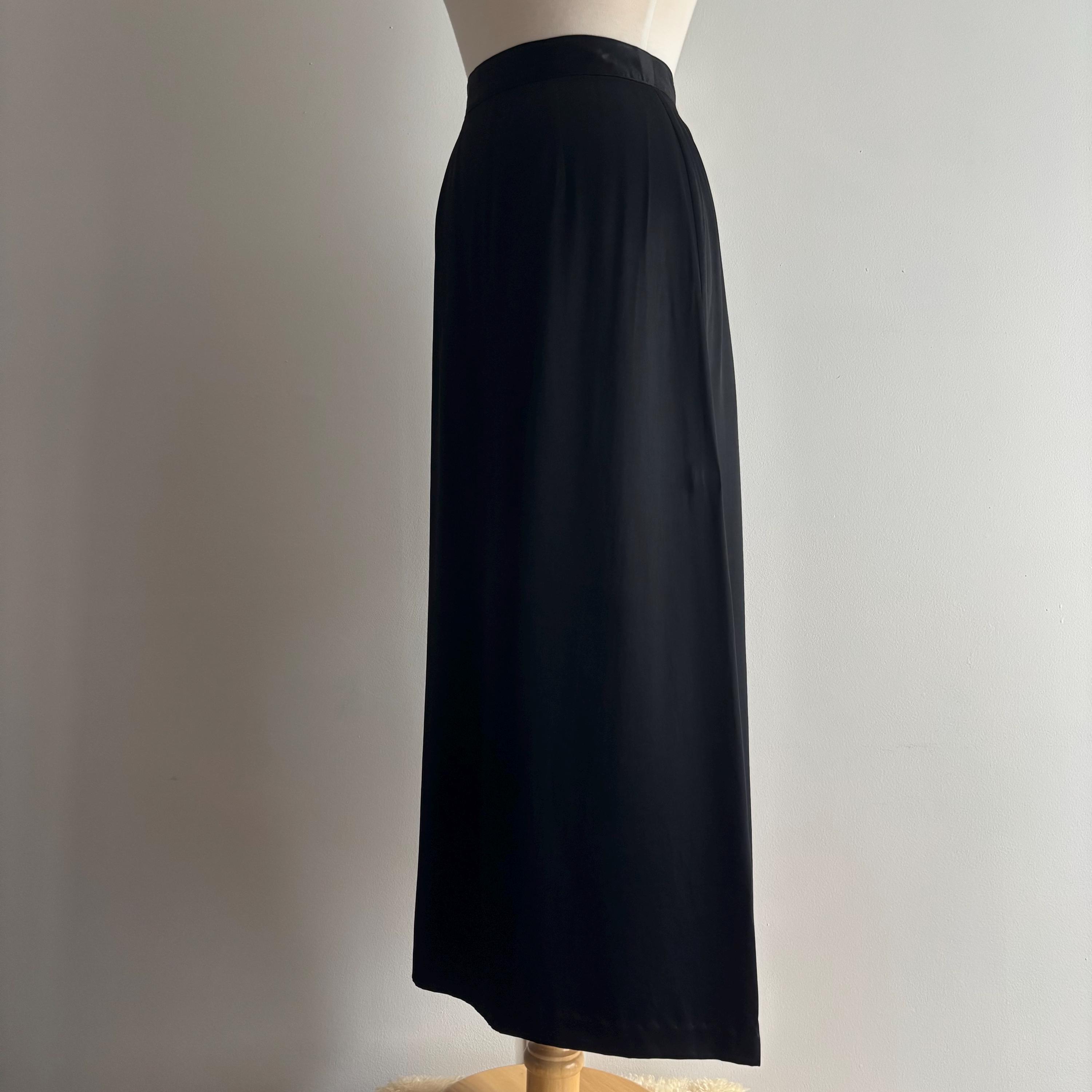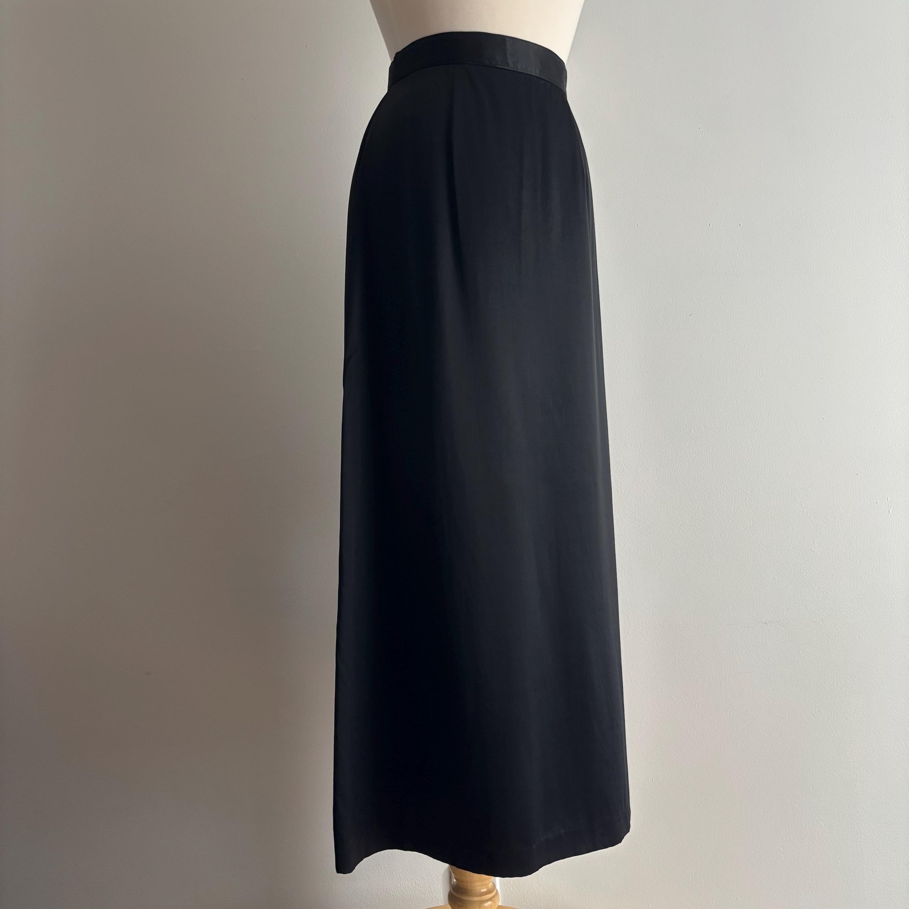 A stunning vintage black satin maxi skirt! Not just for special occasions, this skirt looks amazing with a soft sweater and sneakers or pointy flats. The skirt has darts at the waist, with a zipper and button to close at the back. There is a slight a-line which make it a lot easier to walk in, as it has no kick pleat. 54% rayon, 46% acetate. Made in Canada. Please see the measurements for best fit.
