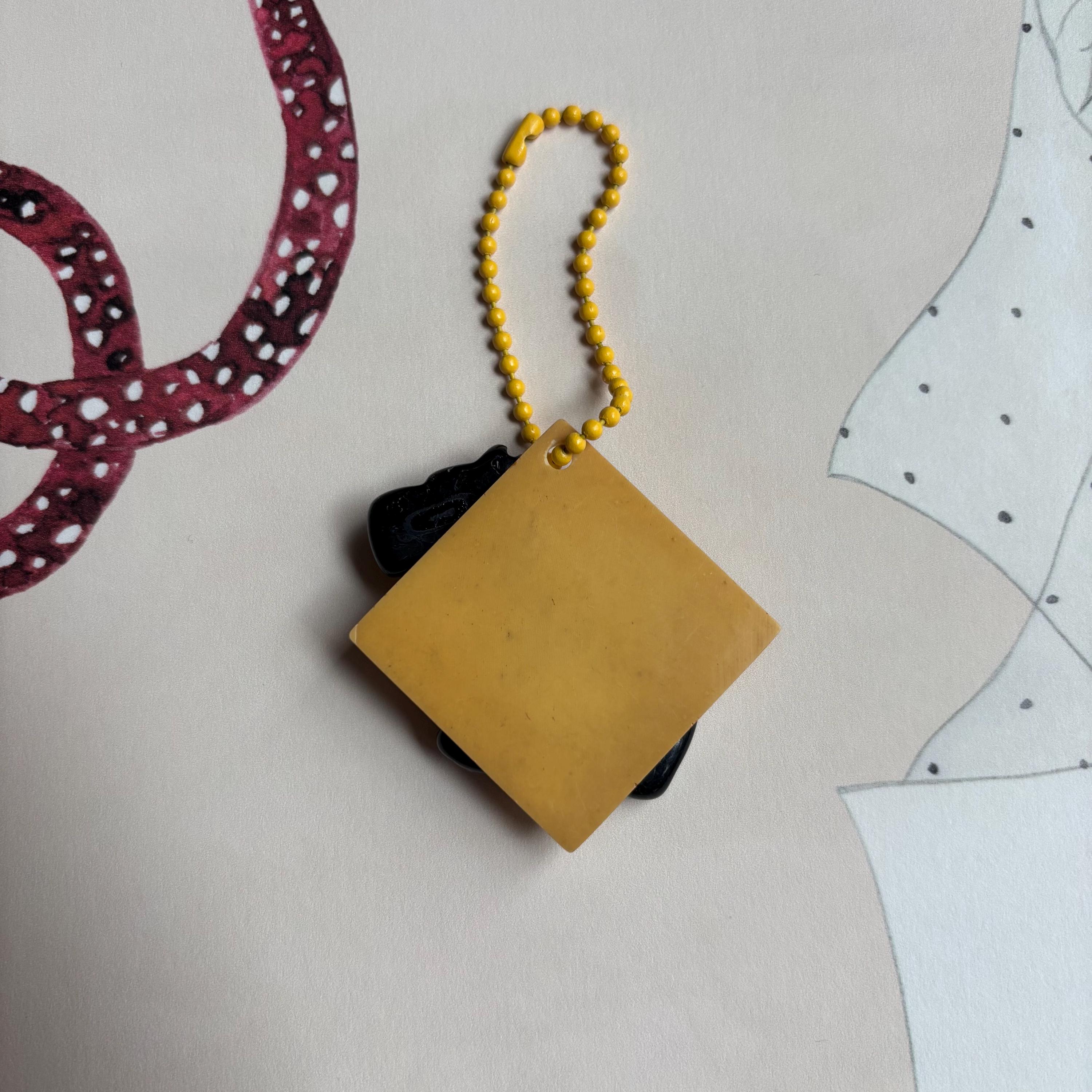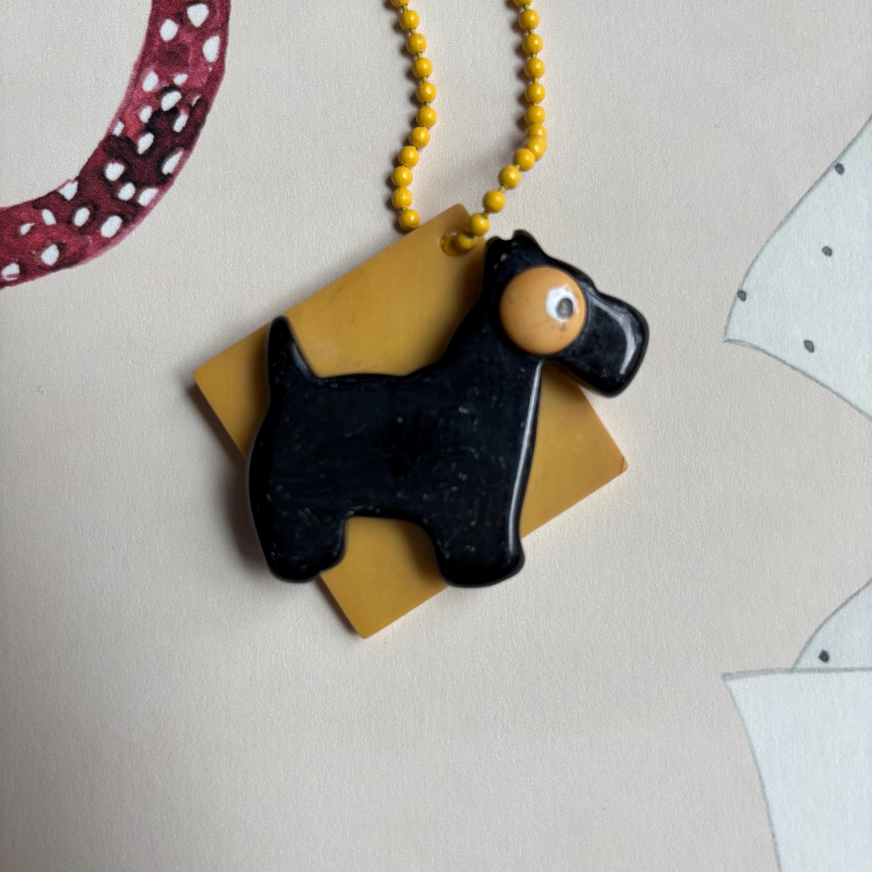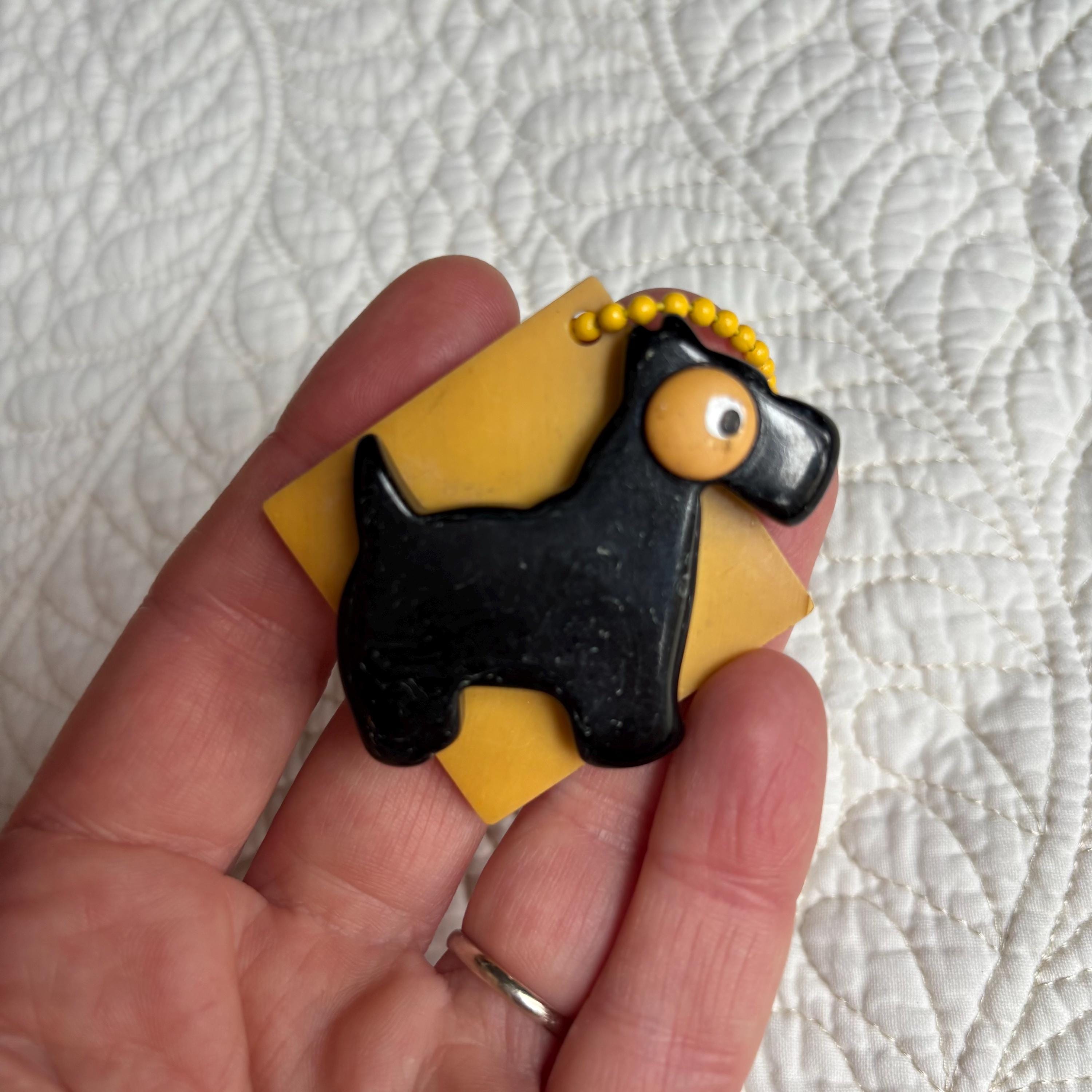 Amazing Bakelite Scottie Dog charm which could be used as a zipper pull, bag charm, key chain, so many ways to wear it! Made of hard to find black Bakelite, with the slightest hint of white in it. The dog has a nice big yellow Bakelite eye, and it is handpainted. The back is yellow Bakelite, and the little chain is yellow, too. So adorable!