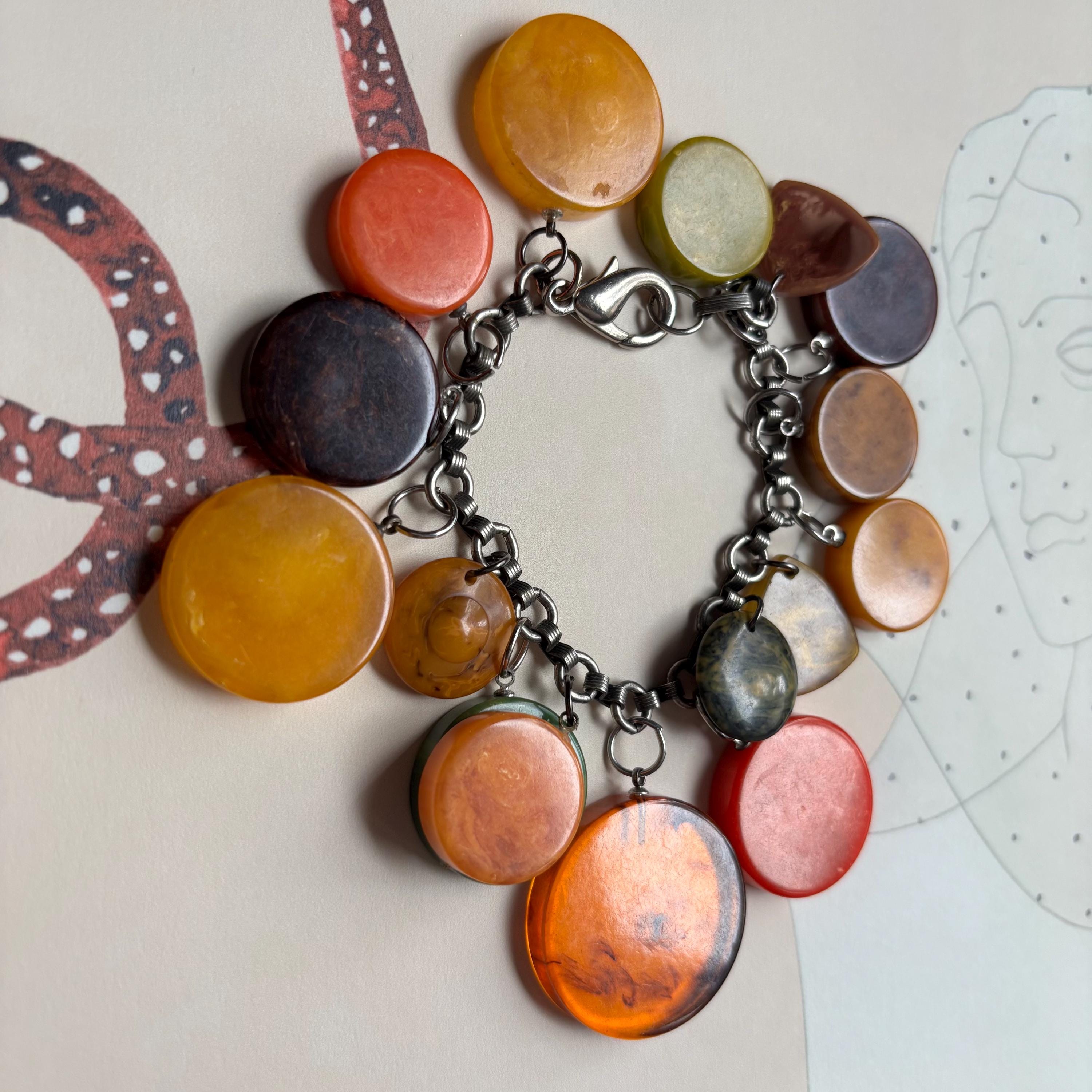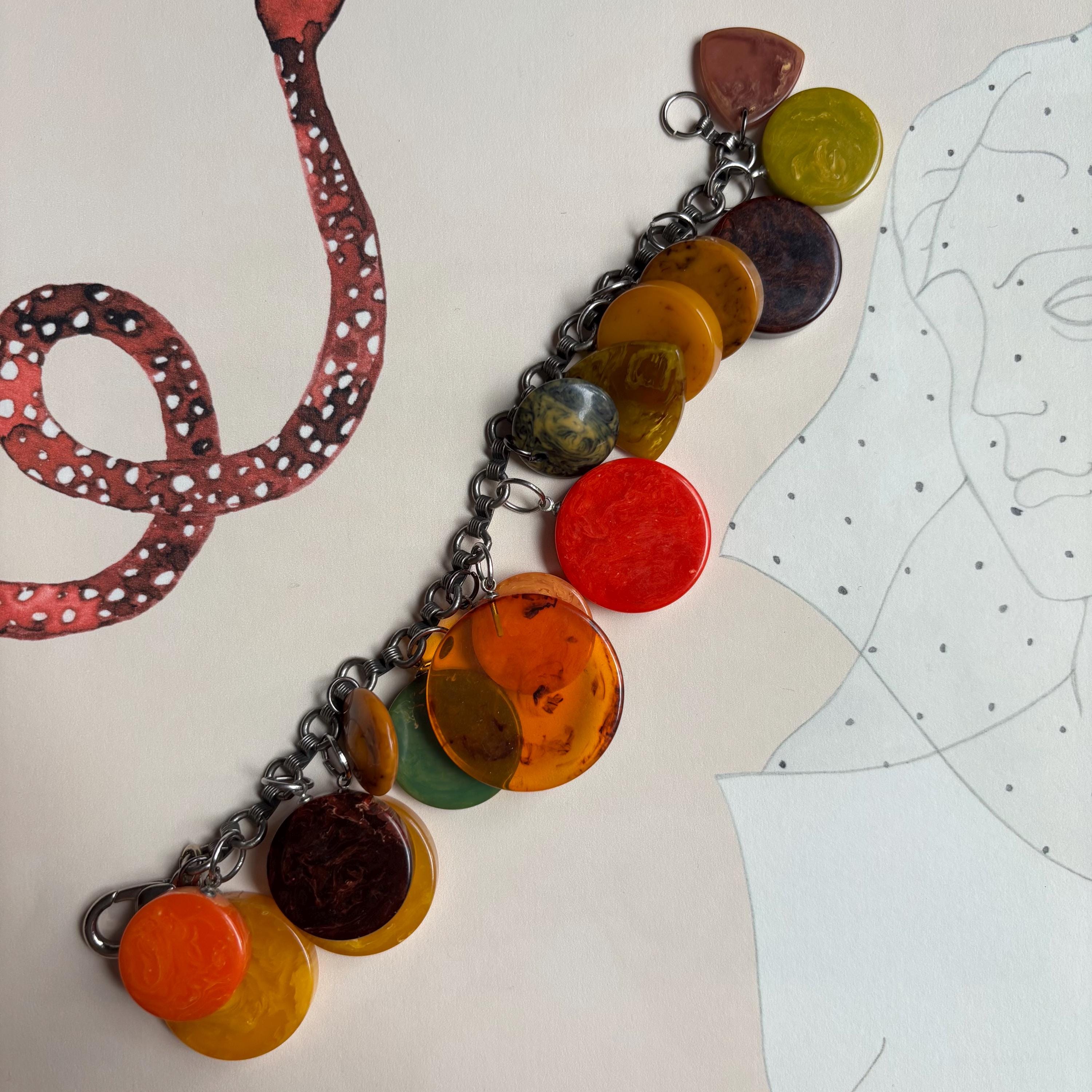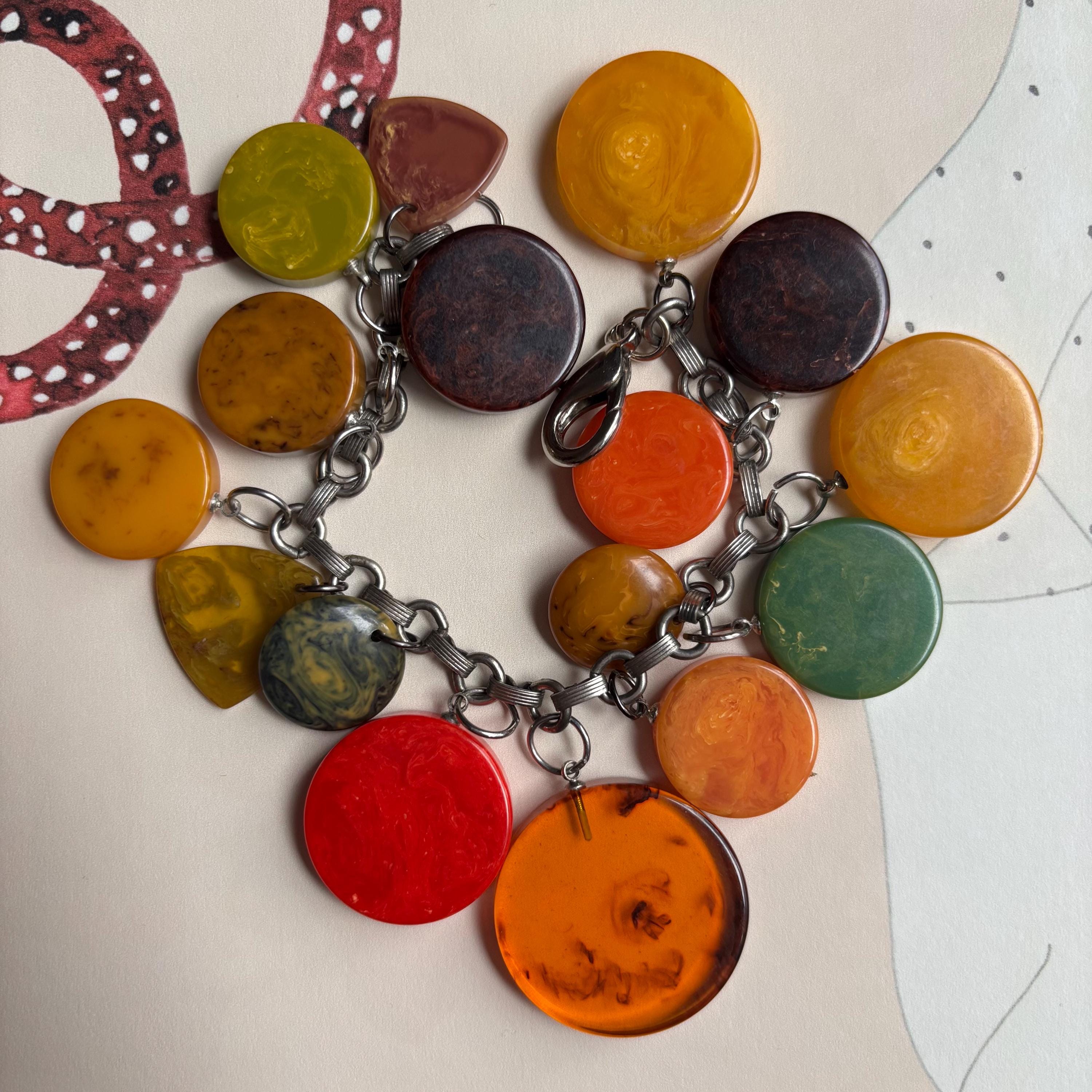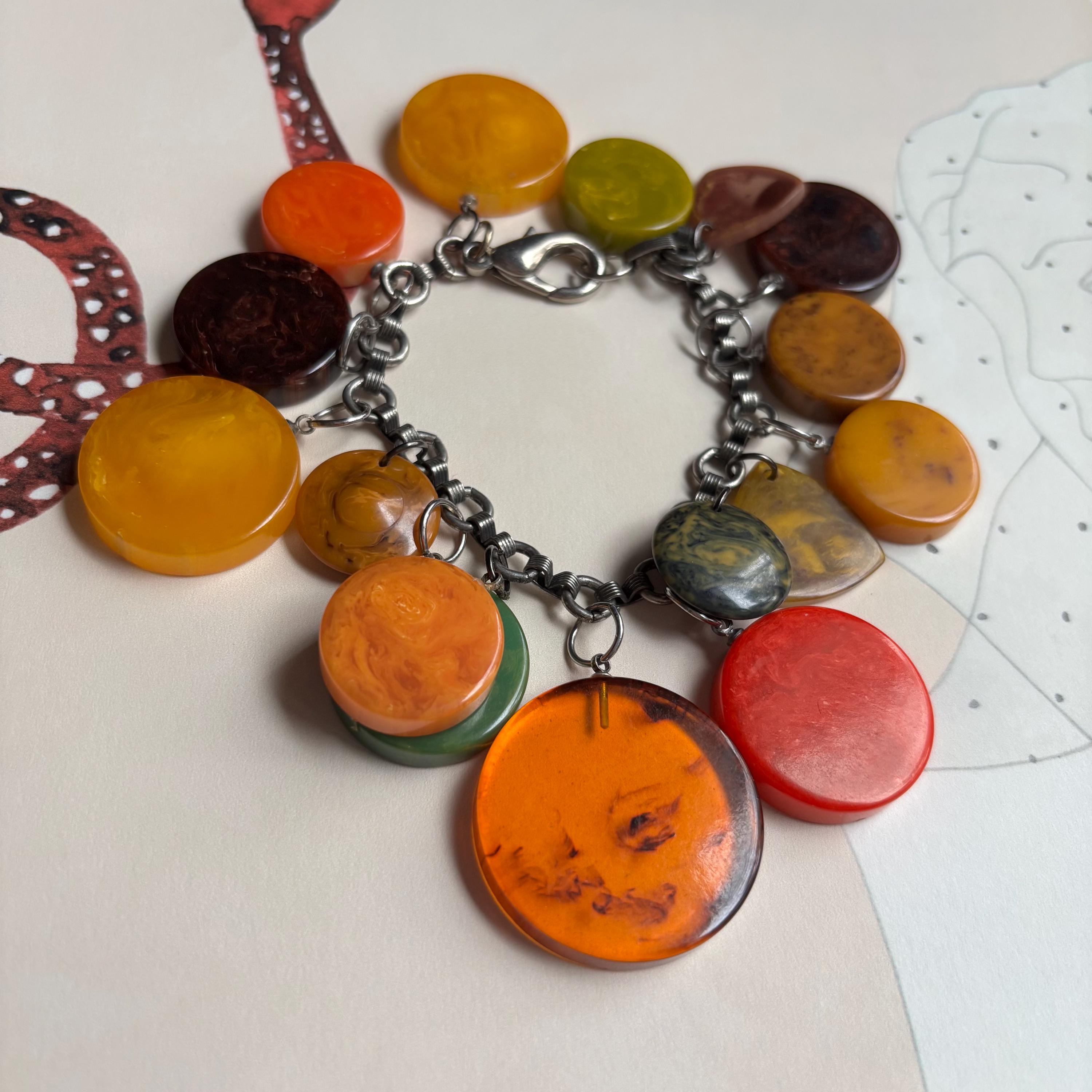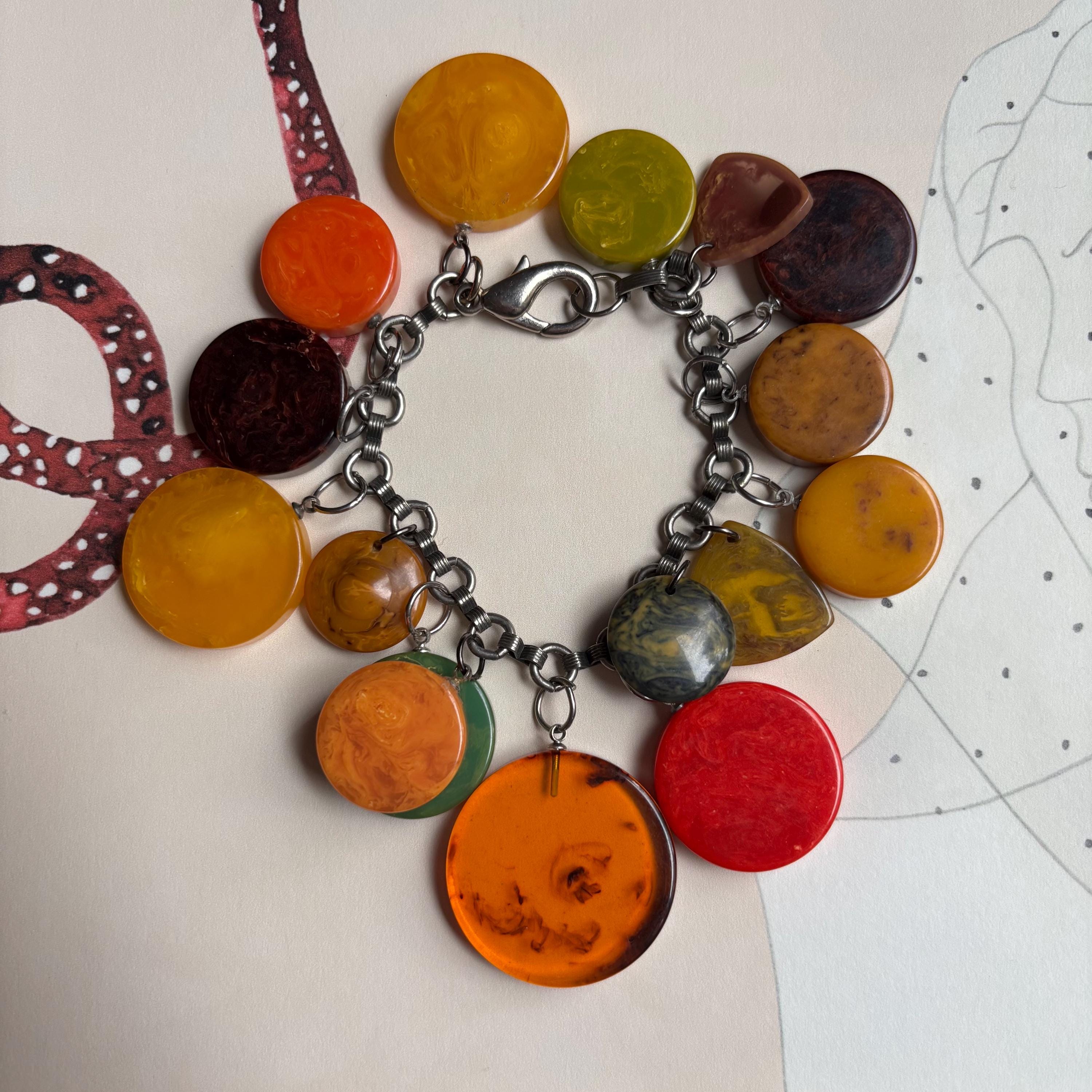 An amazing find! This vintage bracelet is full of gorgeous Bakelite charms in so many of the best marble colours. Apple juice, banana bread, pea soup, blue moon, root beer, rhubarb & custard… a bright red one with yellow marbling, orange and yellow… 16 charms in all. Mostly disc shaped, but there are a couple of flying saucer shaped and rounded triangles, as well. A really special piece!