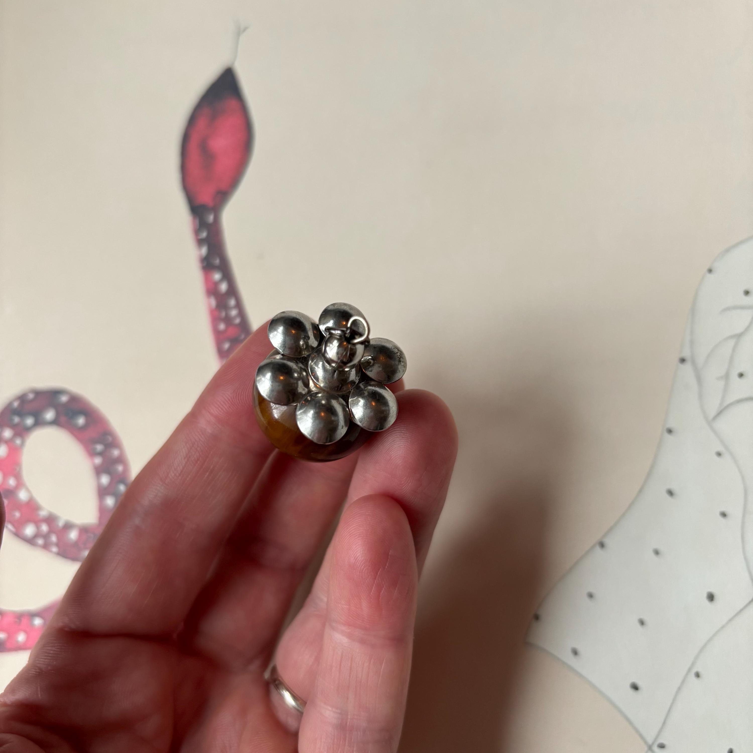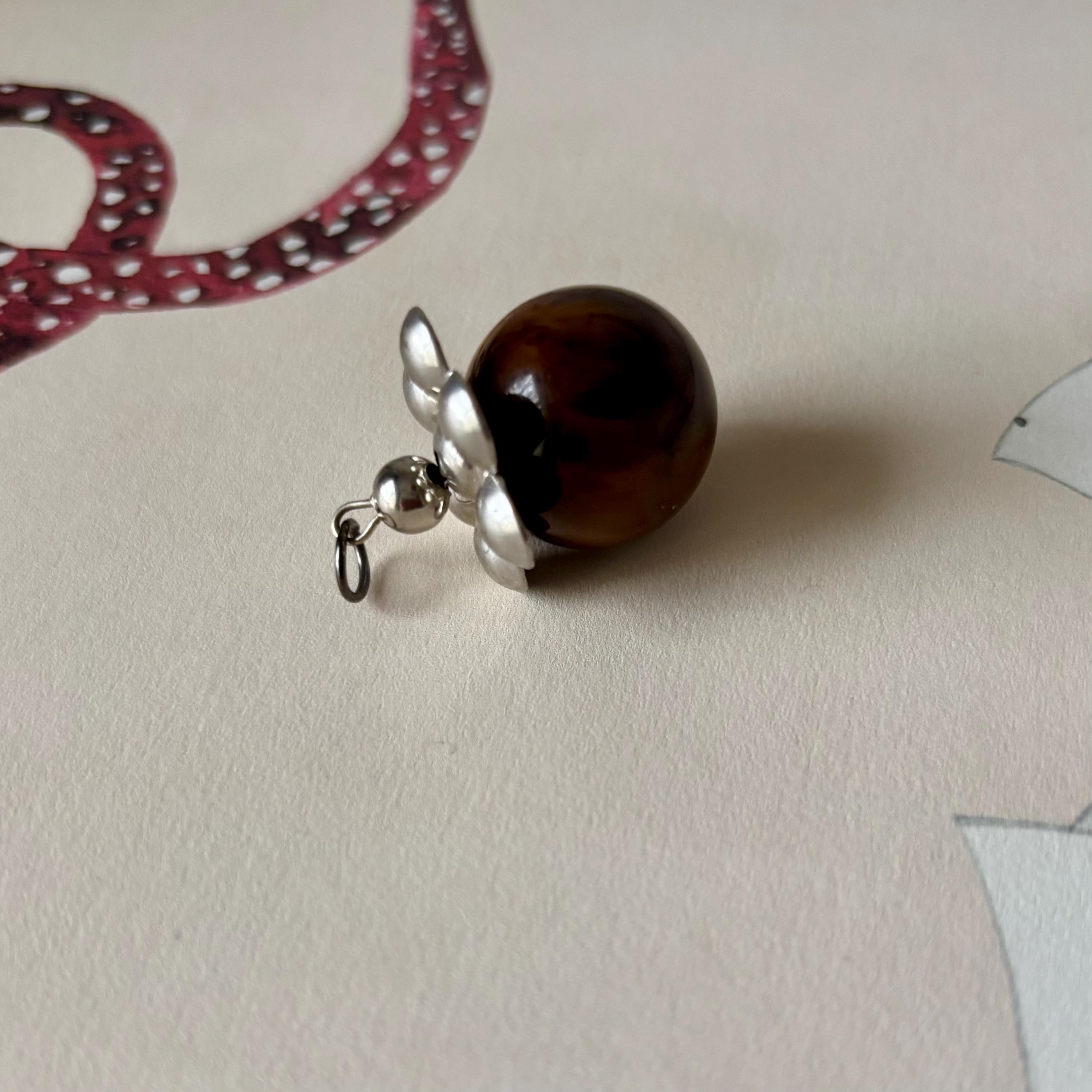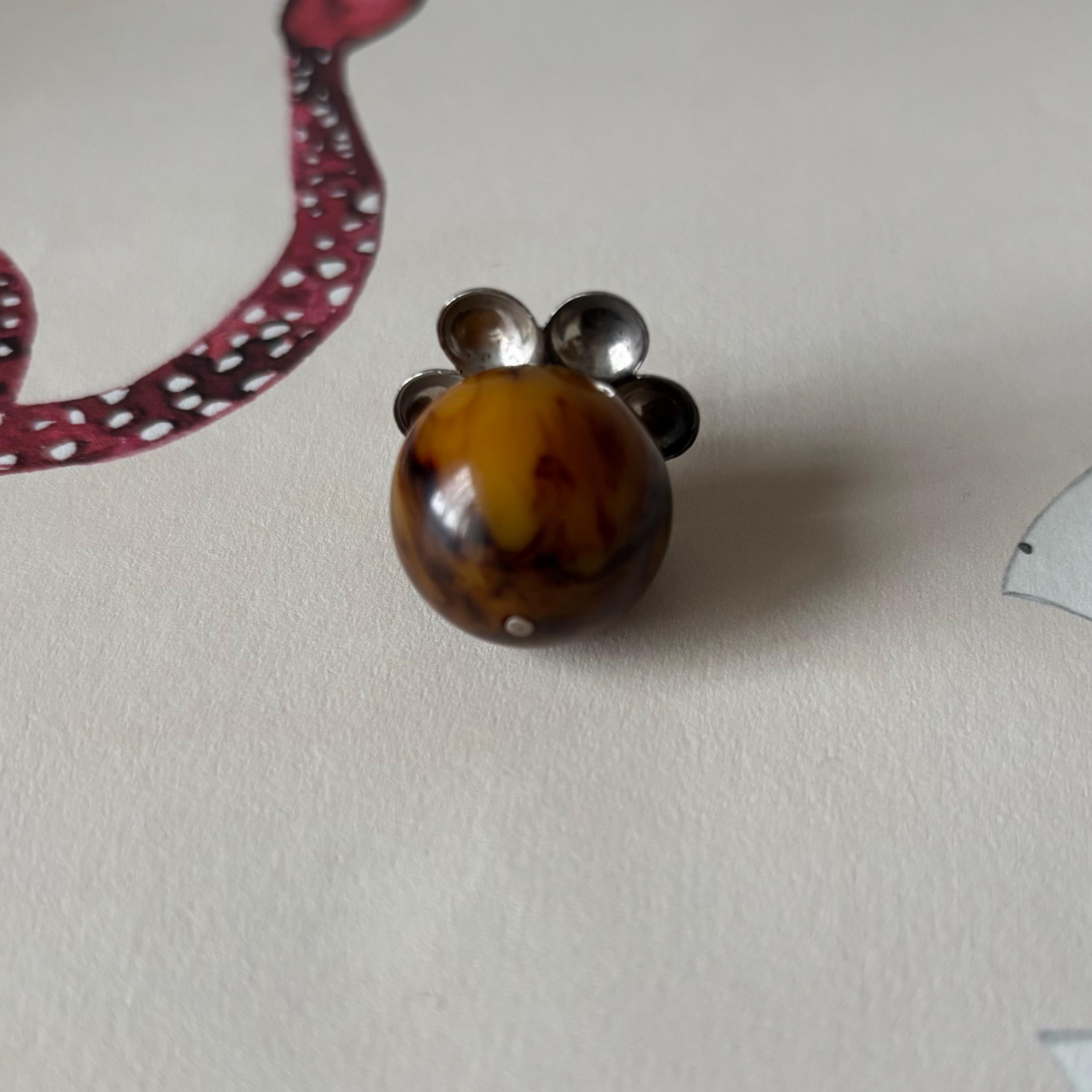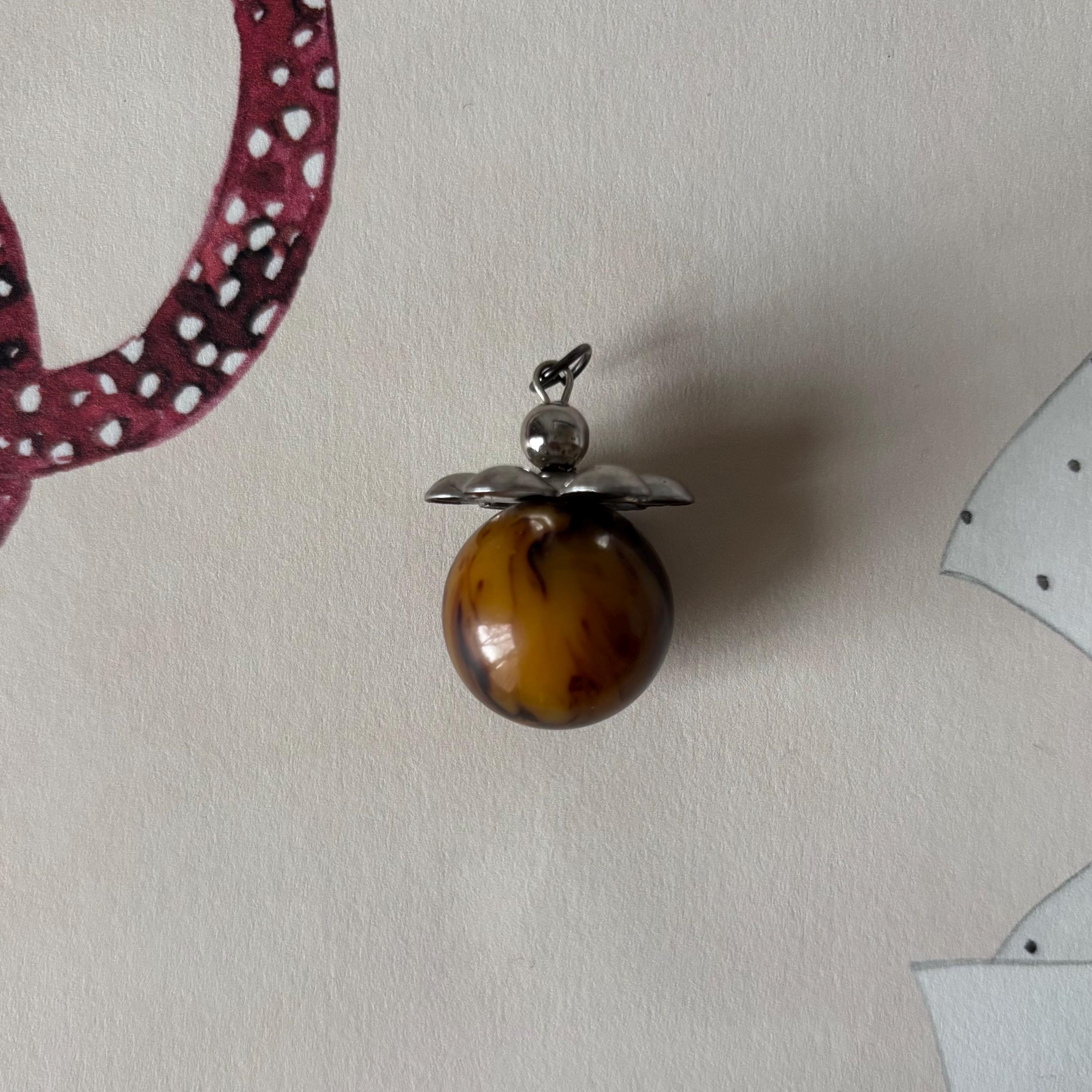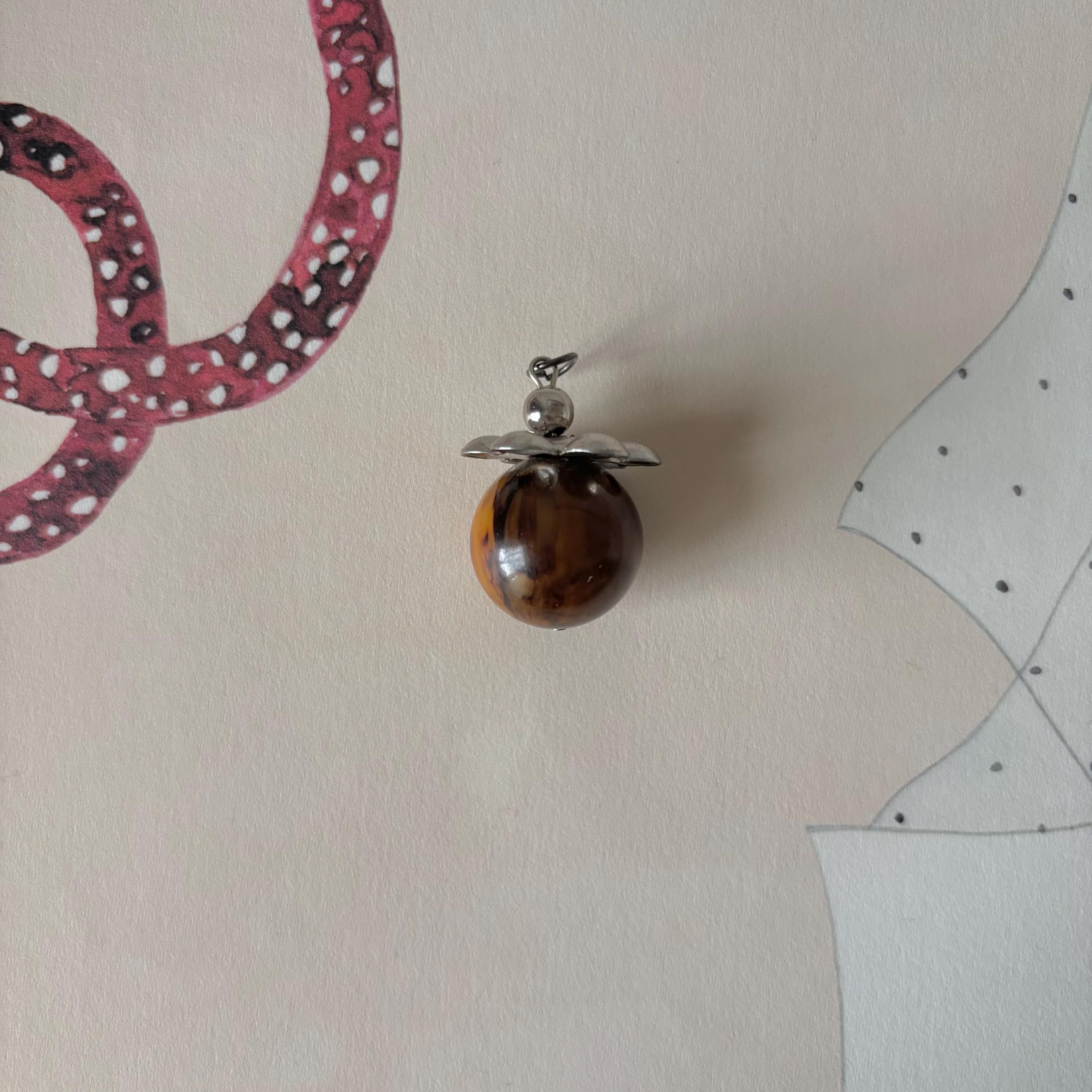 A charming Bakelite pendant! Could also be worn as a charm or zipper pull. A beautifully marbled Bakelite ball that reminds me of chocolate and caramel cream. There is a silver toned metal flower shape on the top.