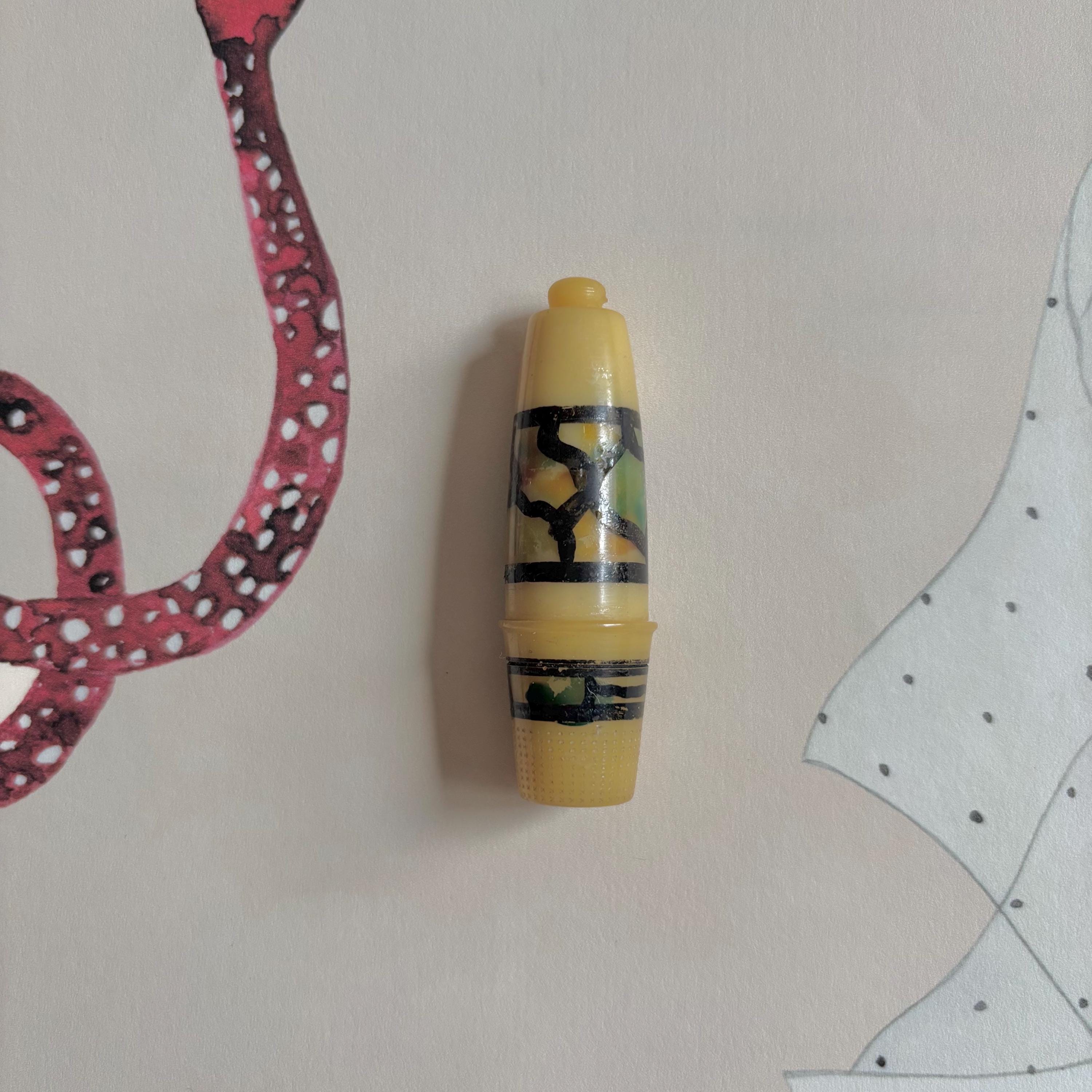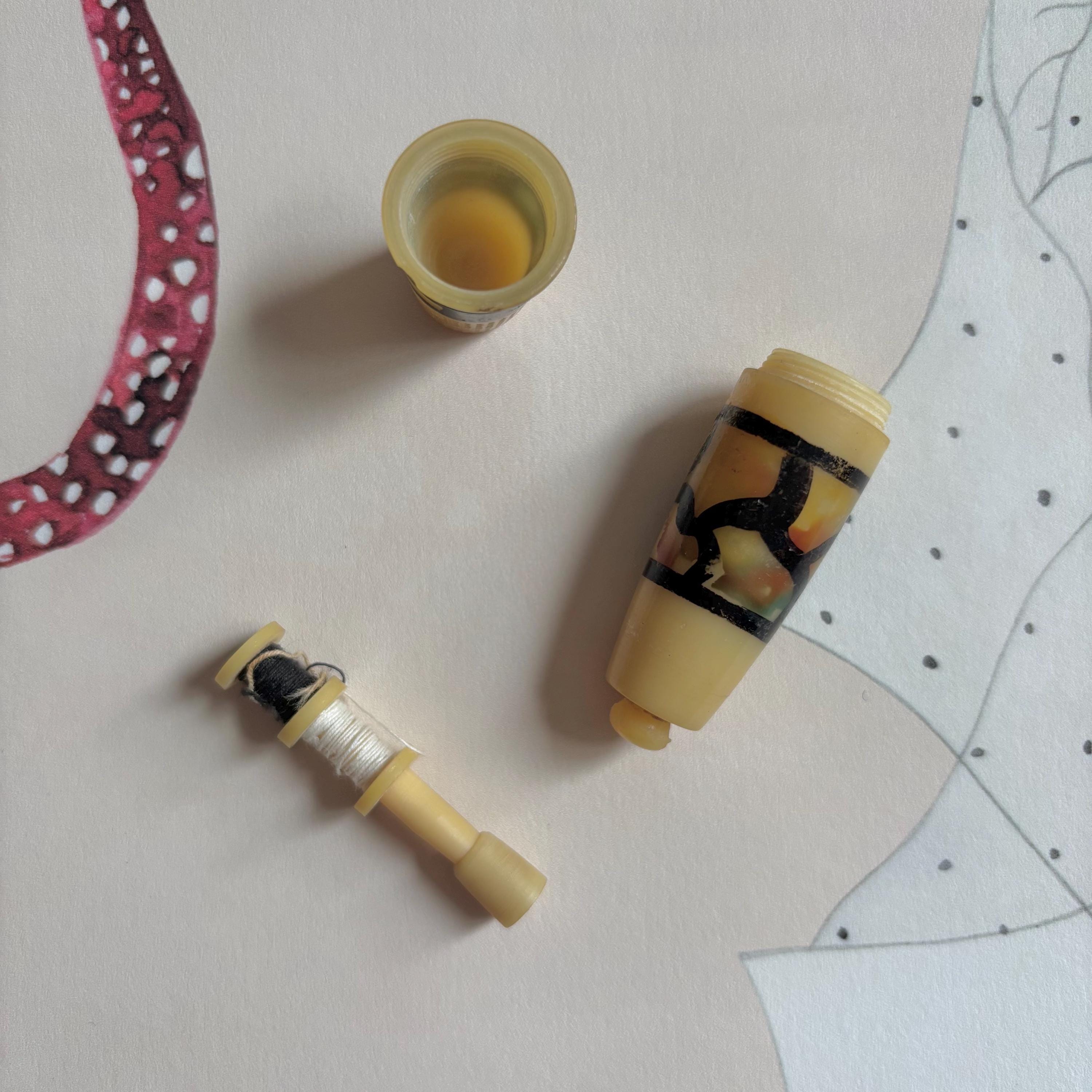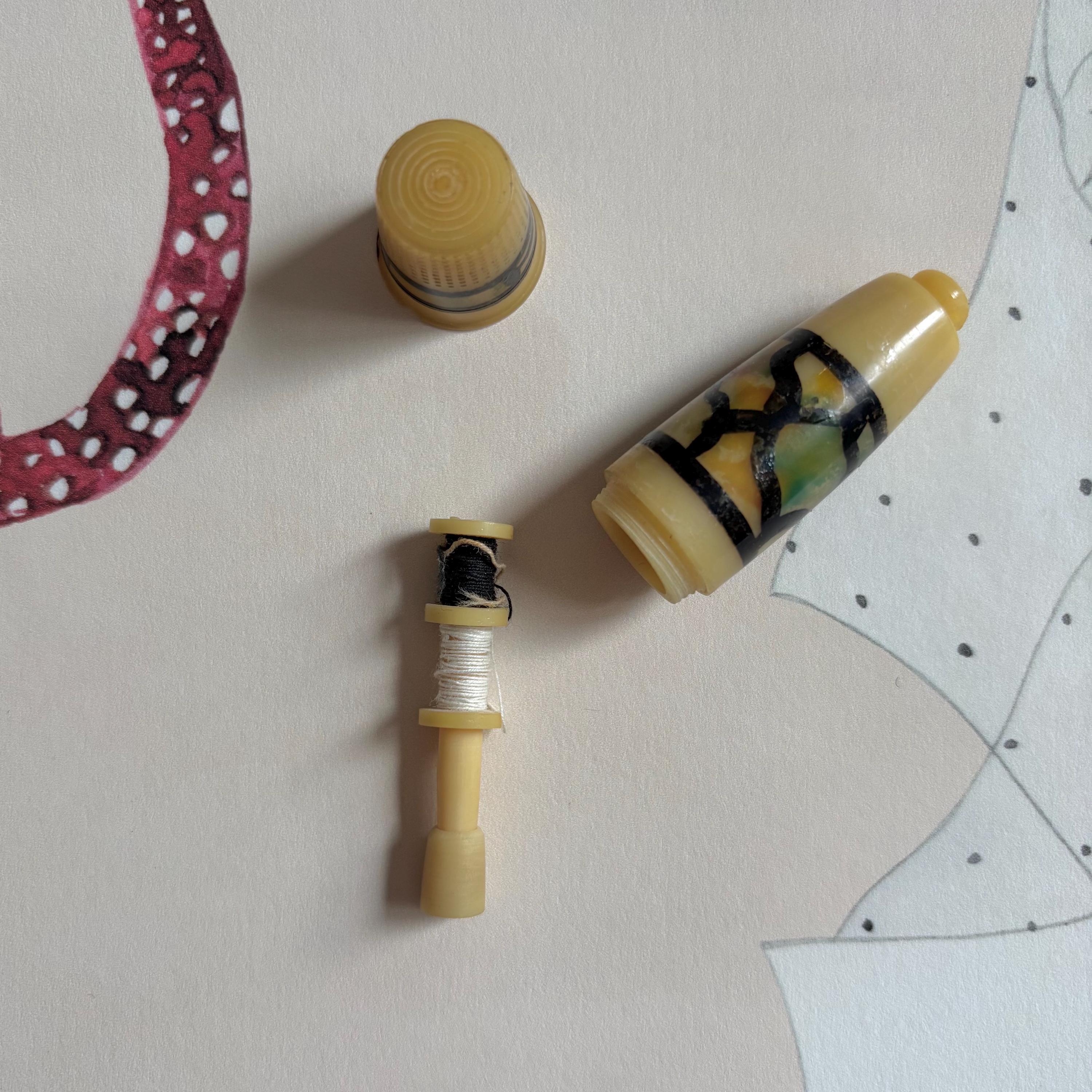 Absolutely charming! This sweet little sewing kit probably originated in France or Germany, and dates to the 1920s-1930s. Early plastic, untested. The thimble unscrews to reveal two small spools of thread inside. You could pop a couple of sewing needles in there, too. The outside is painted in this really interesting pattern that reminds me of stained glass.