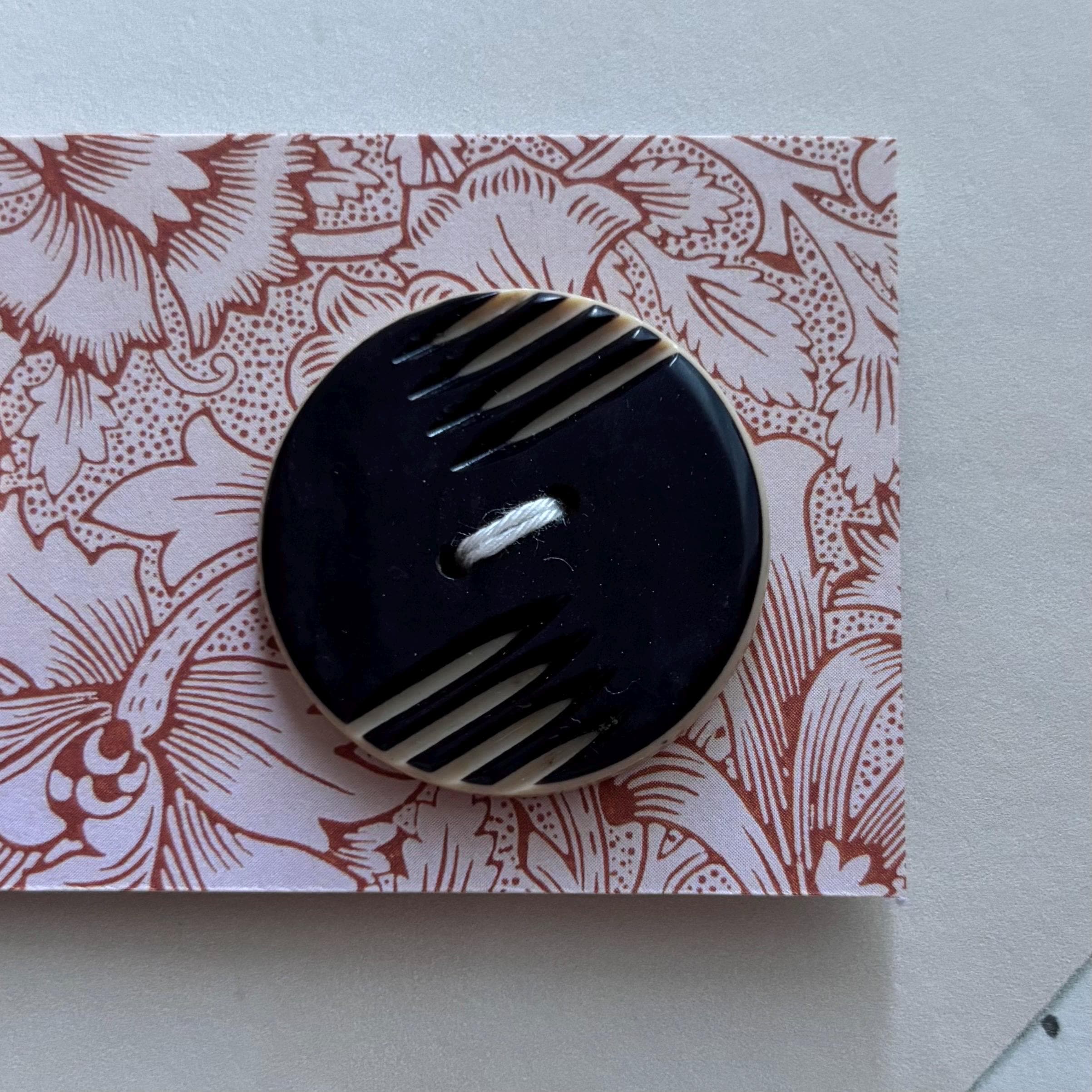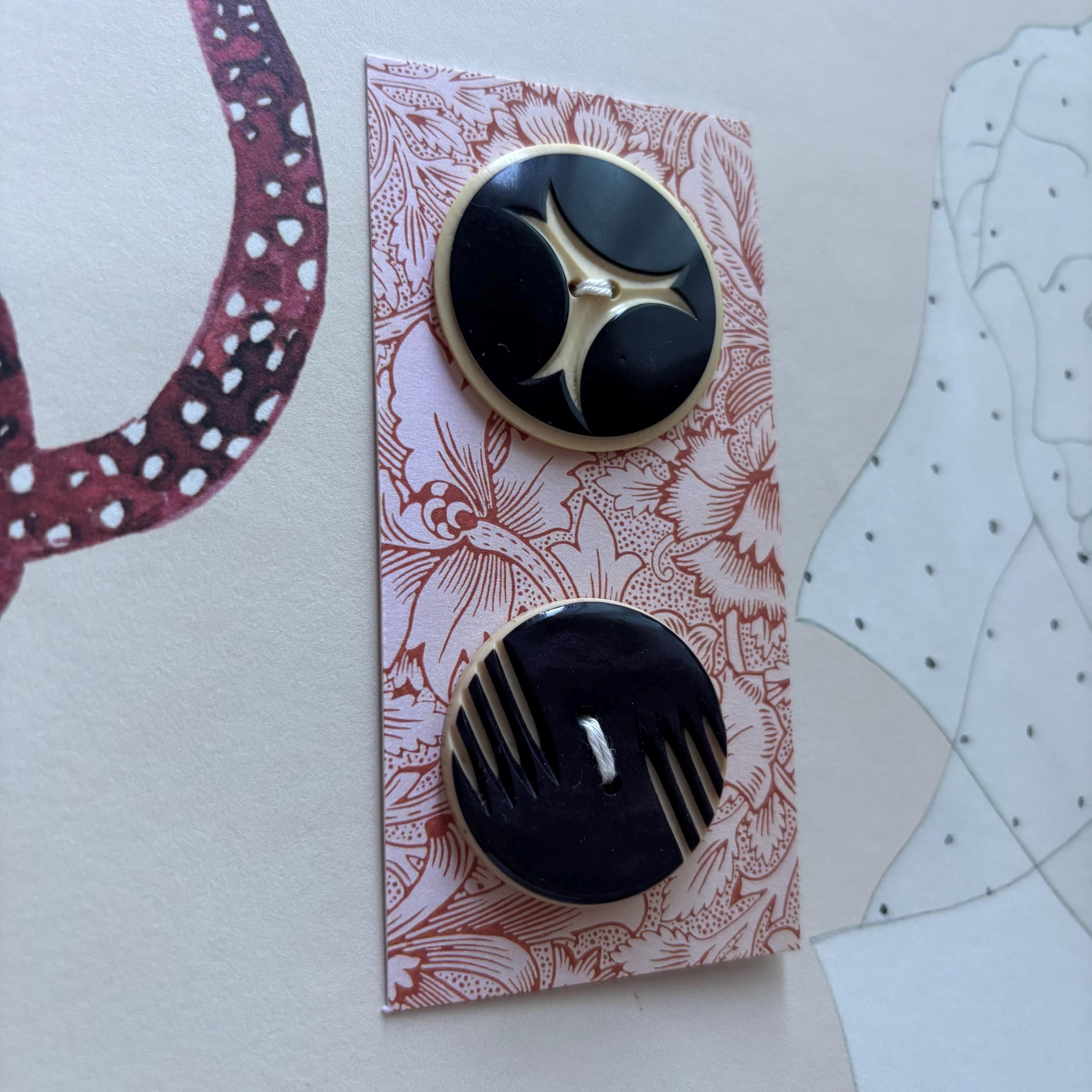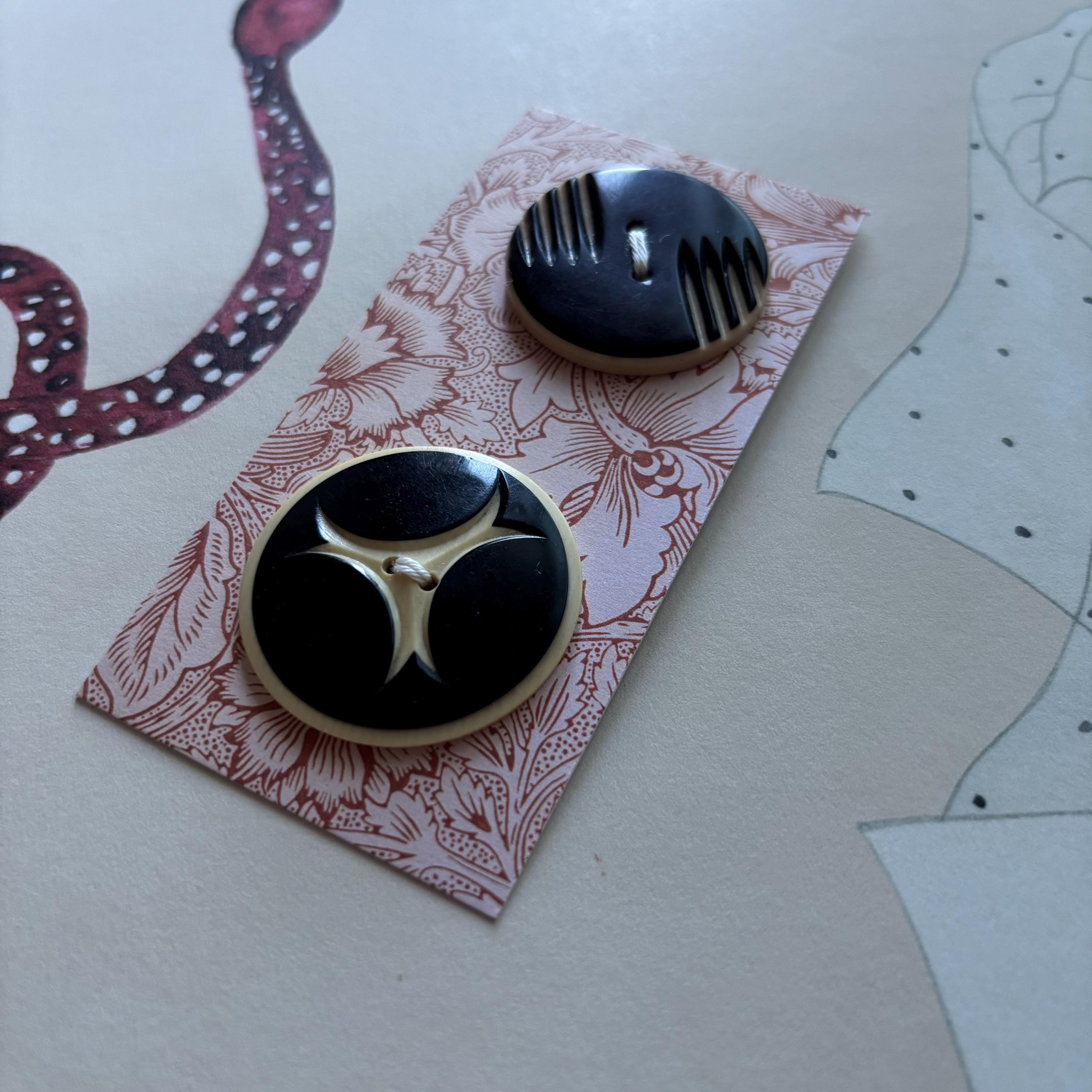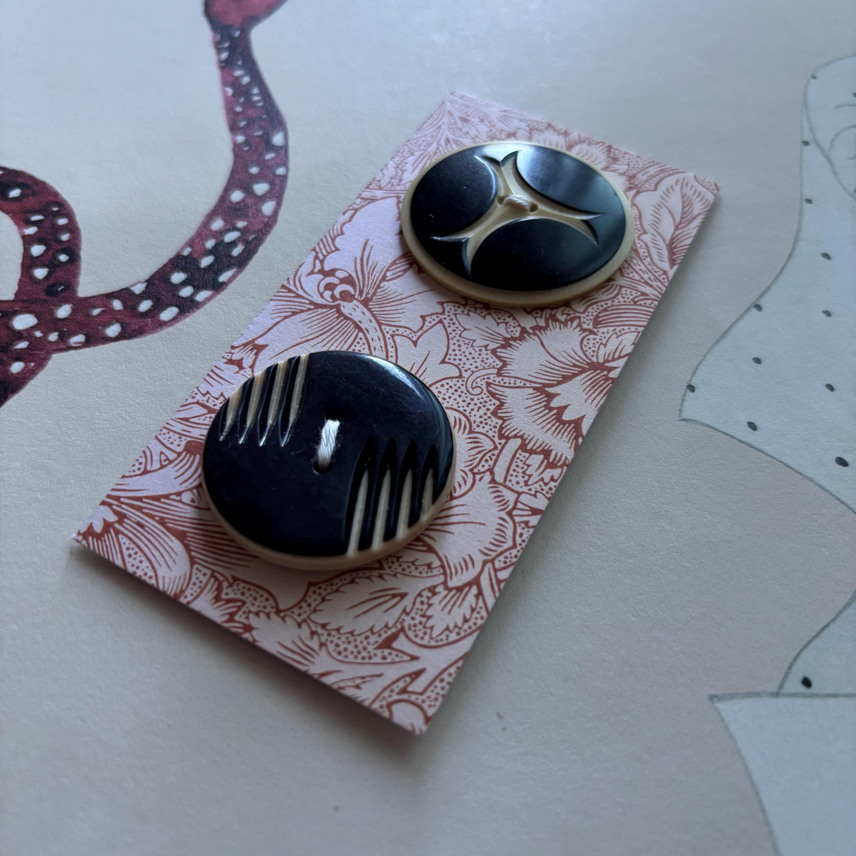 A gorgeous pair of vintage early-to-mid 20th century plastic buttons. Each one has a different pattern and carvings. The button with the parallel lines has a subtle marbling.