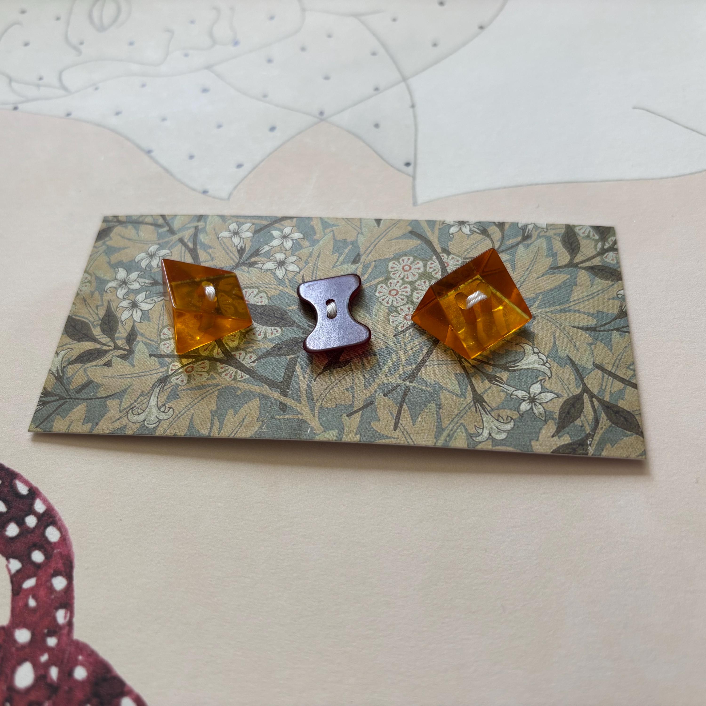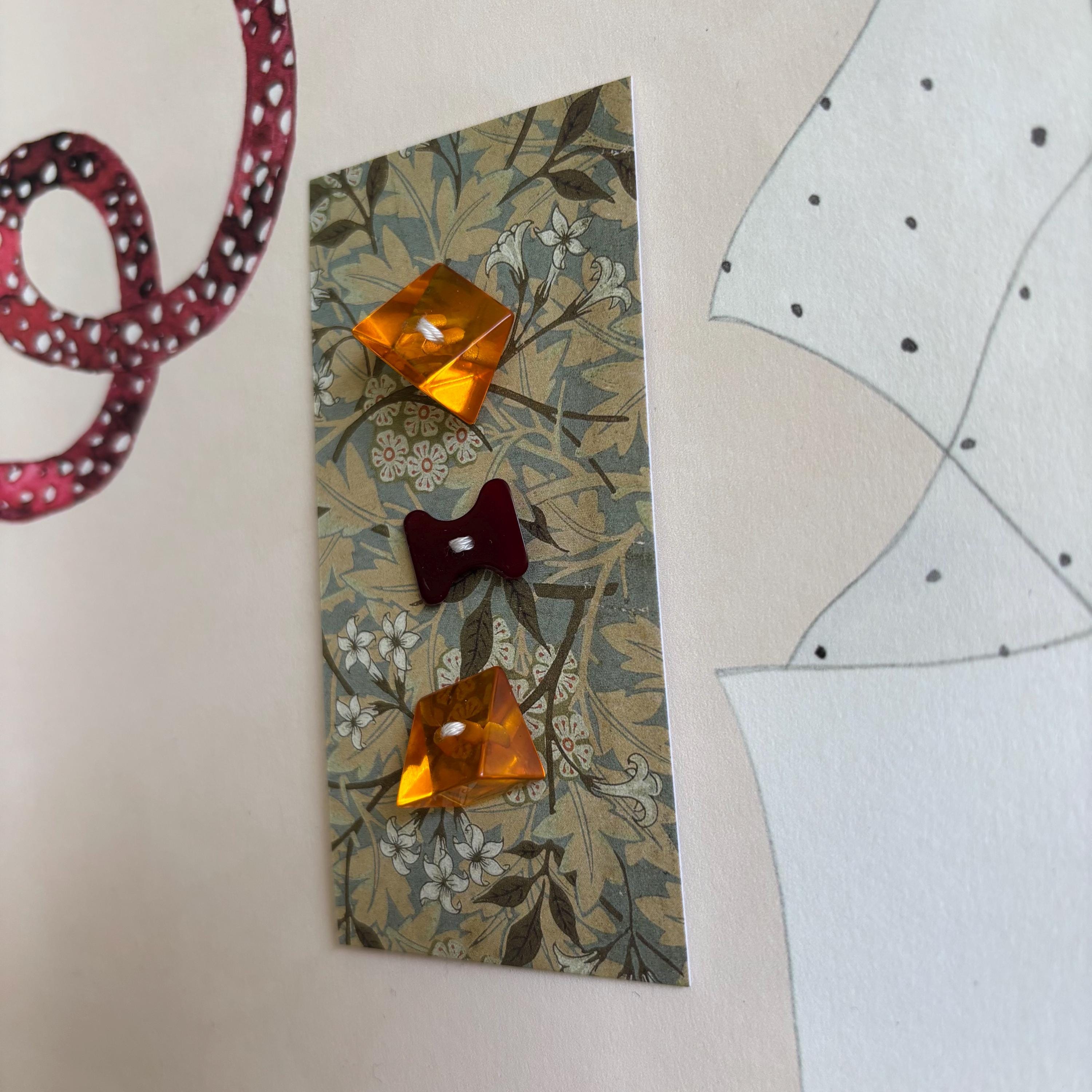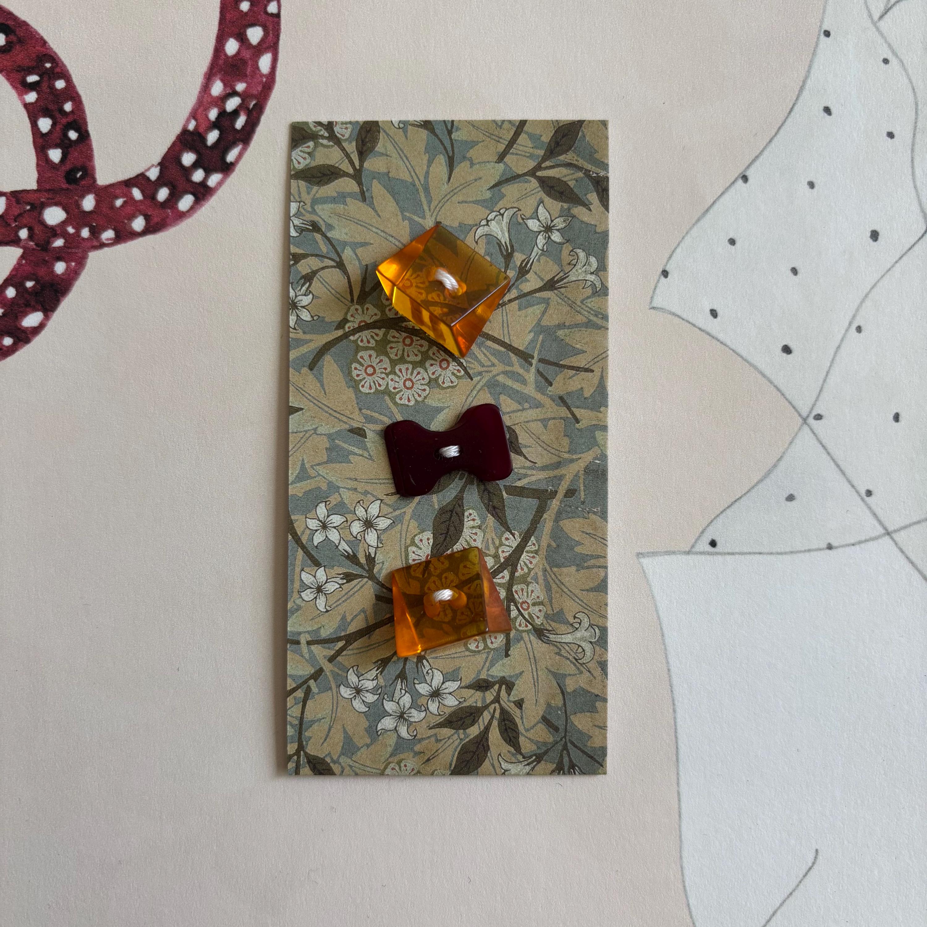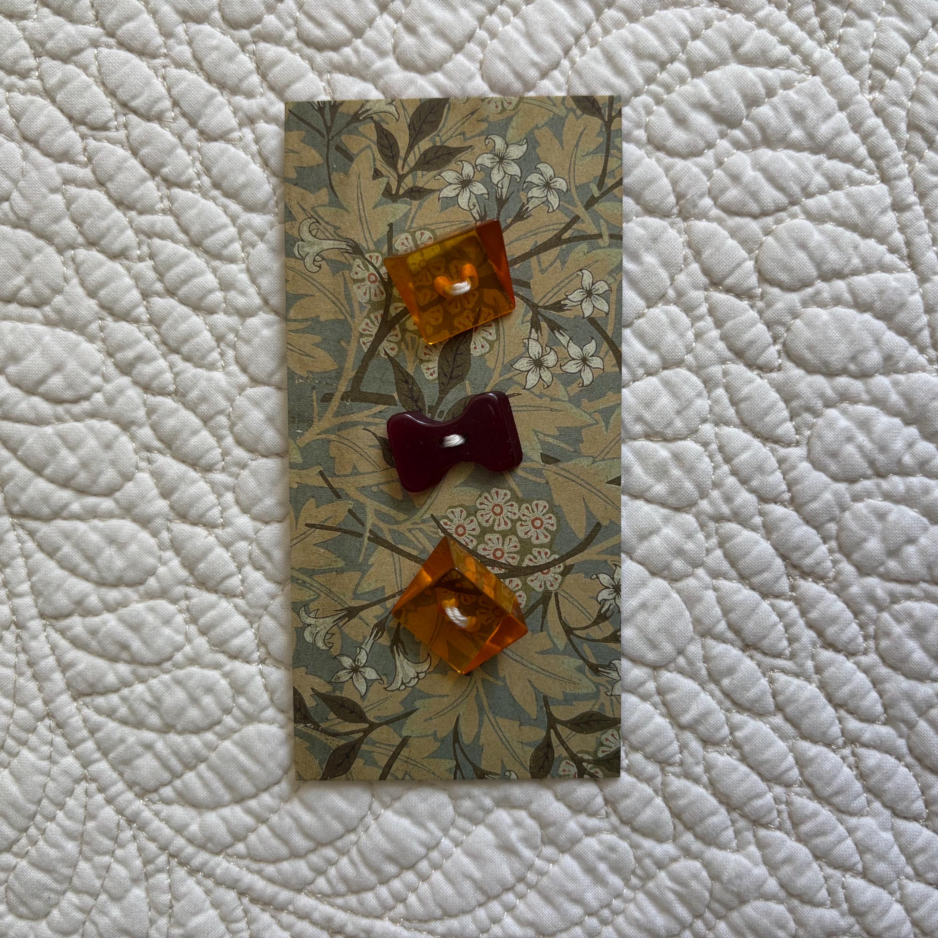 A set of three beautiful Bakelite buttons. Two apple juice coloured wedge-shaped buttons, and one cherry red little bow. Always tested, genuine Bakelite.