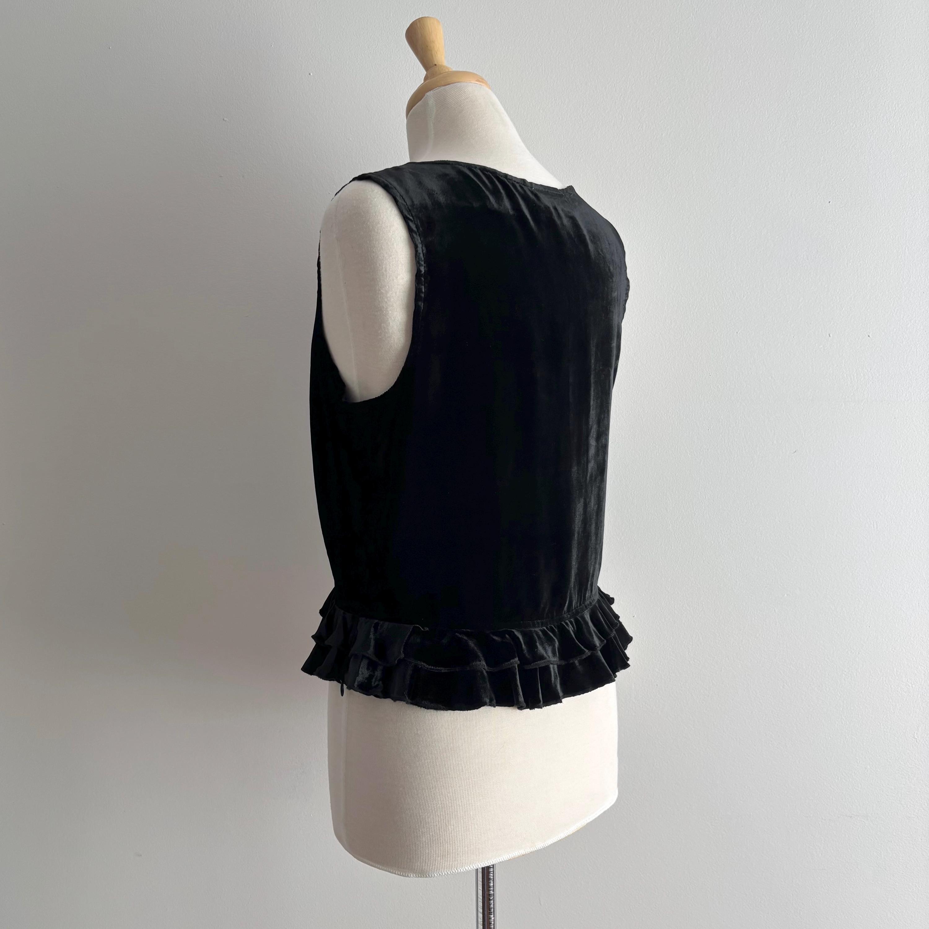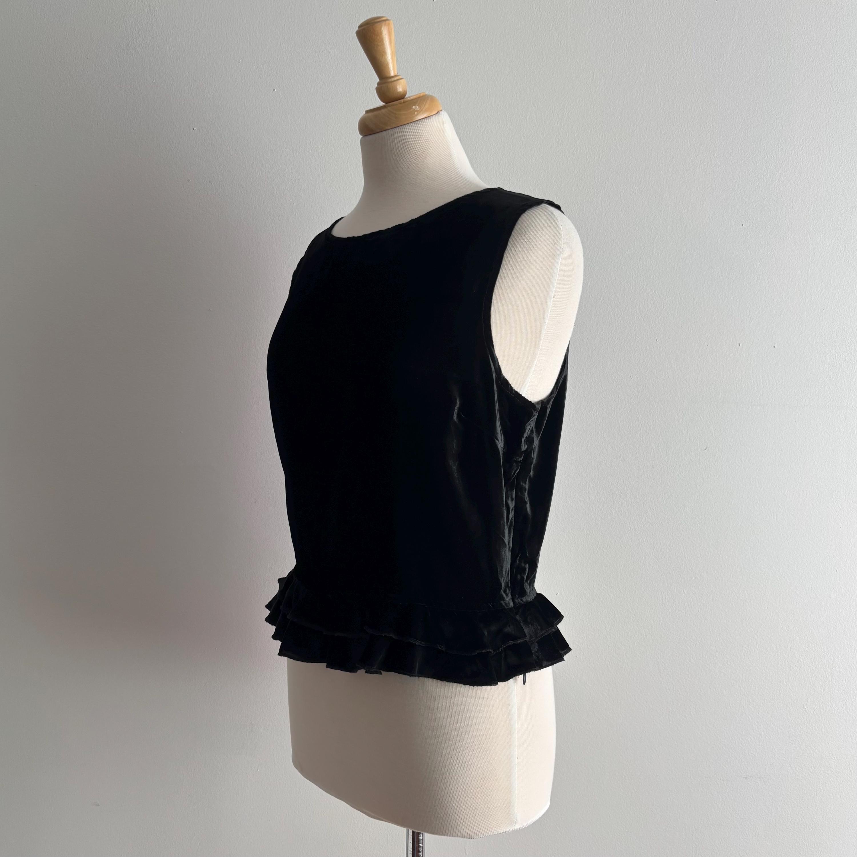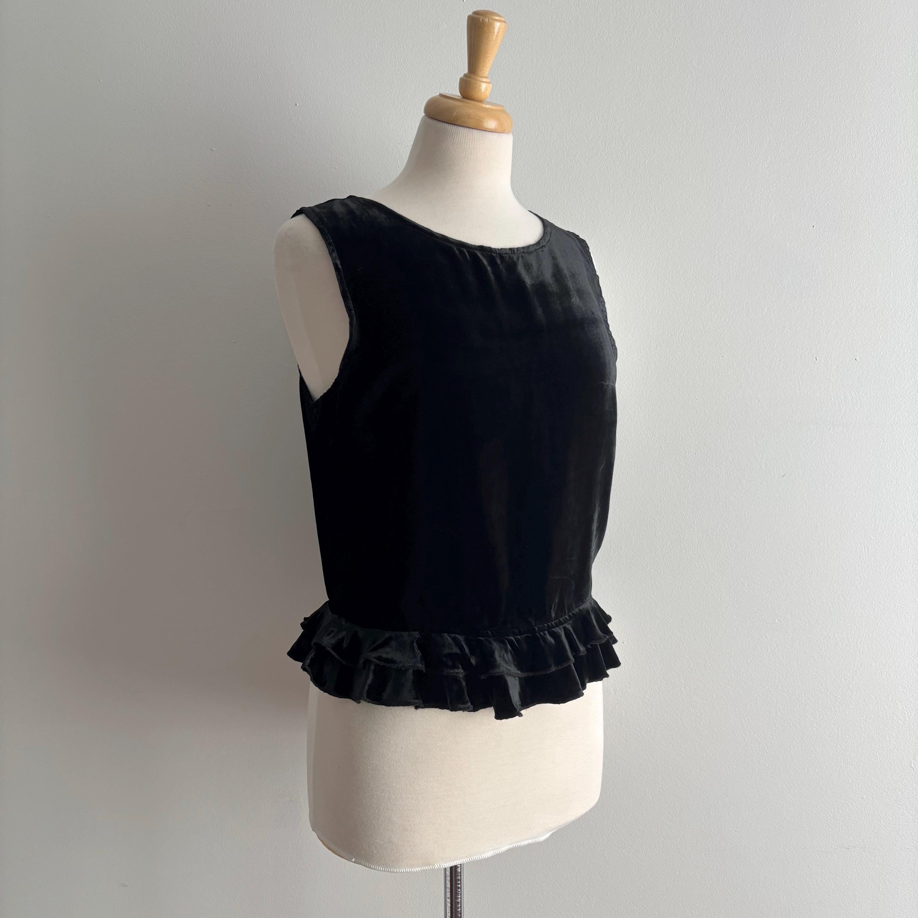A gorgeous black velvet top. Perfect for fall! This vintage 90's Caché top is sleeveless, with a hidden side zip and two layers of ruffle at the waist. Darted bust. Made in the USA. 100% rayon. Size L, please see the measurements for best fit.
