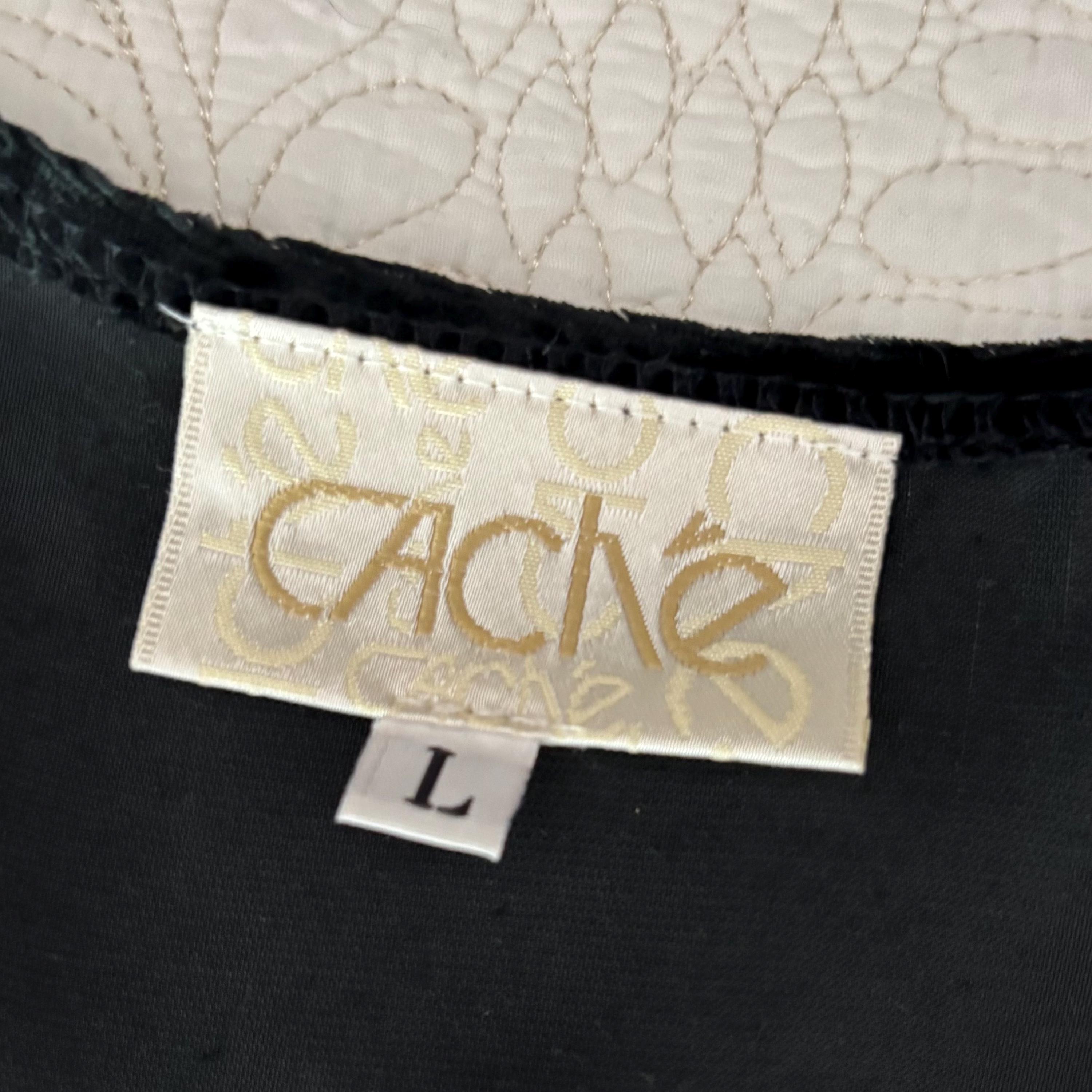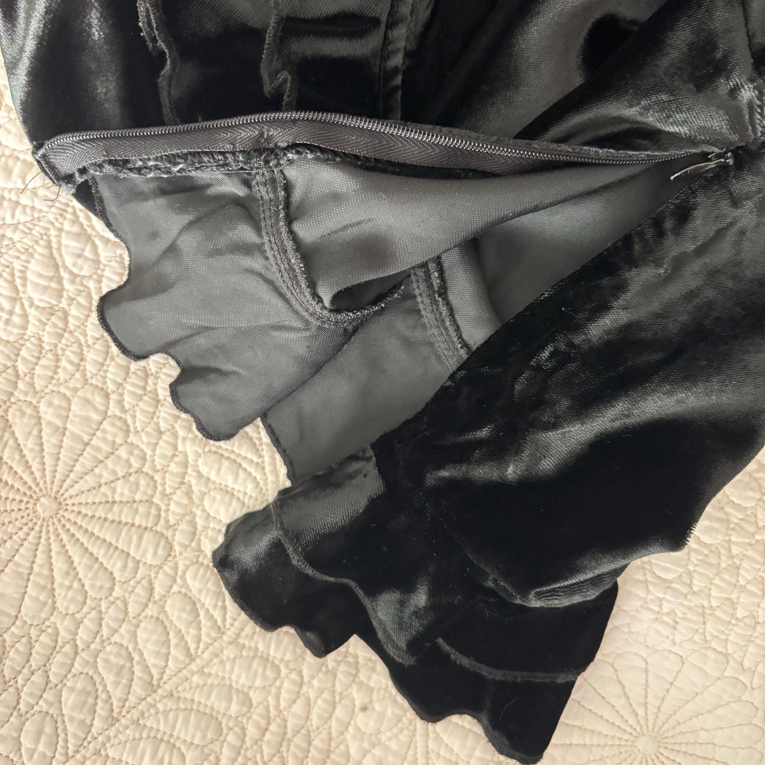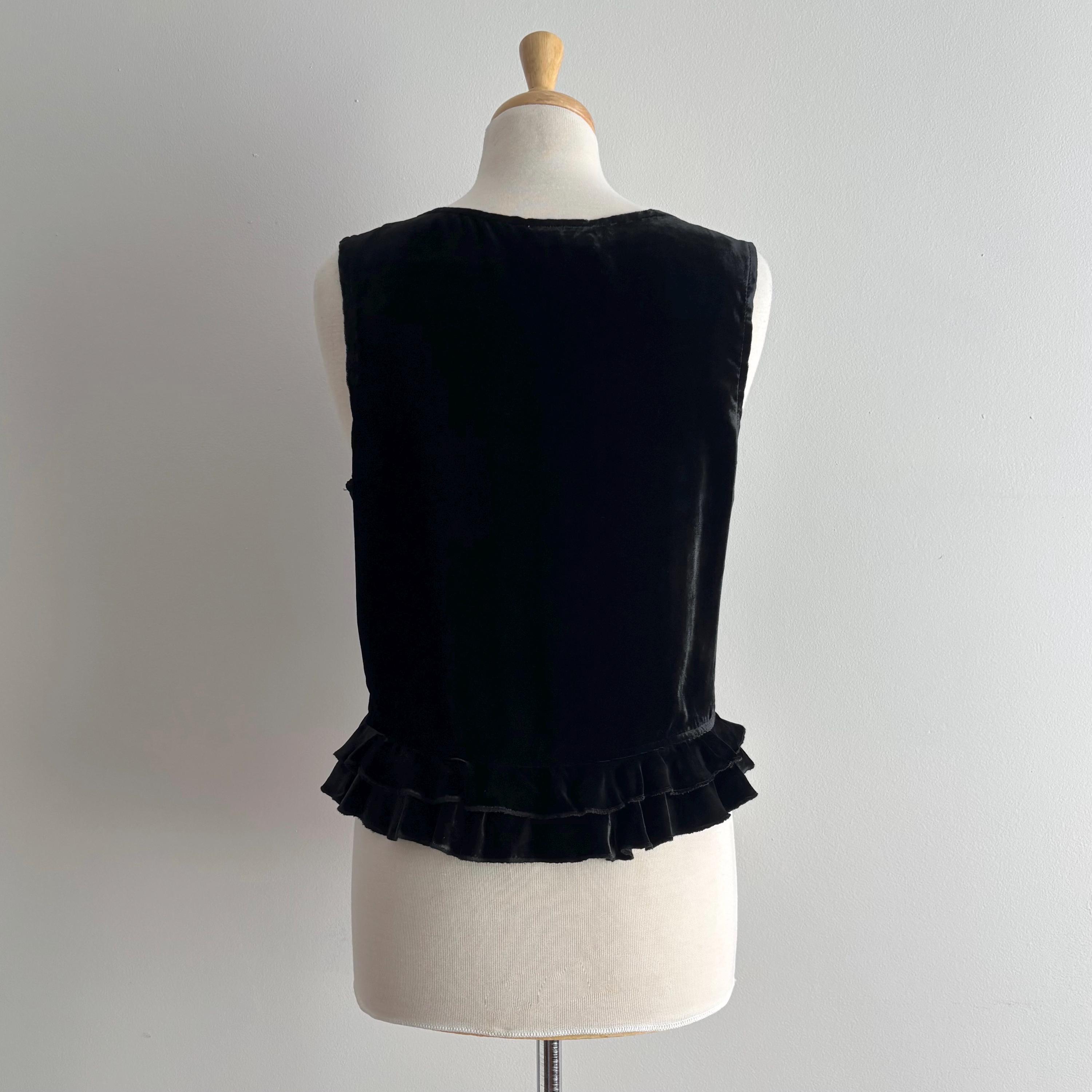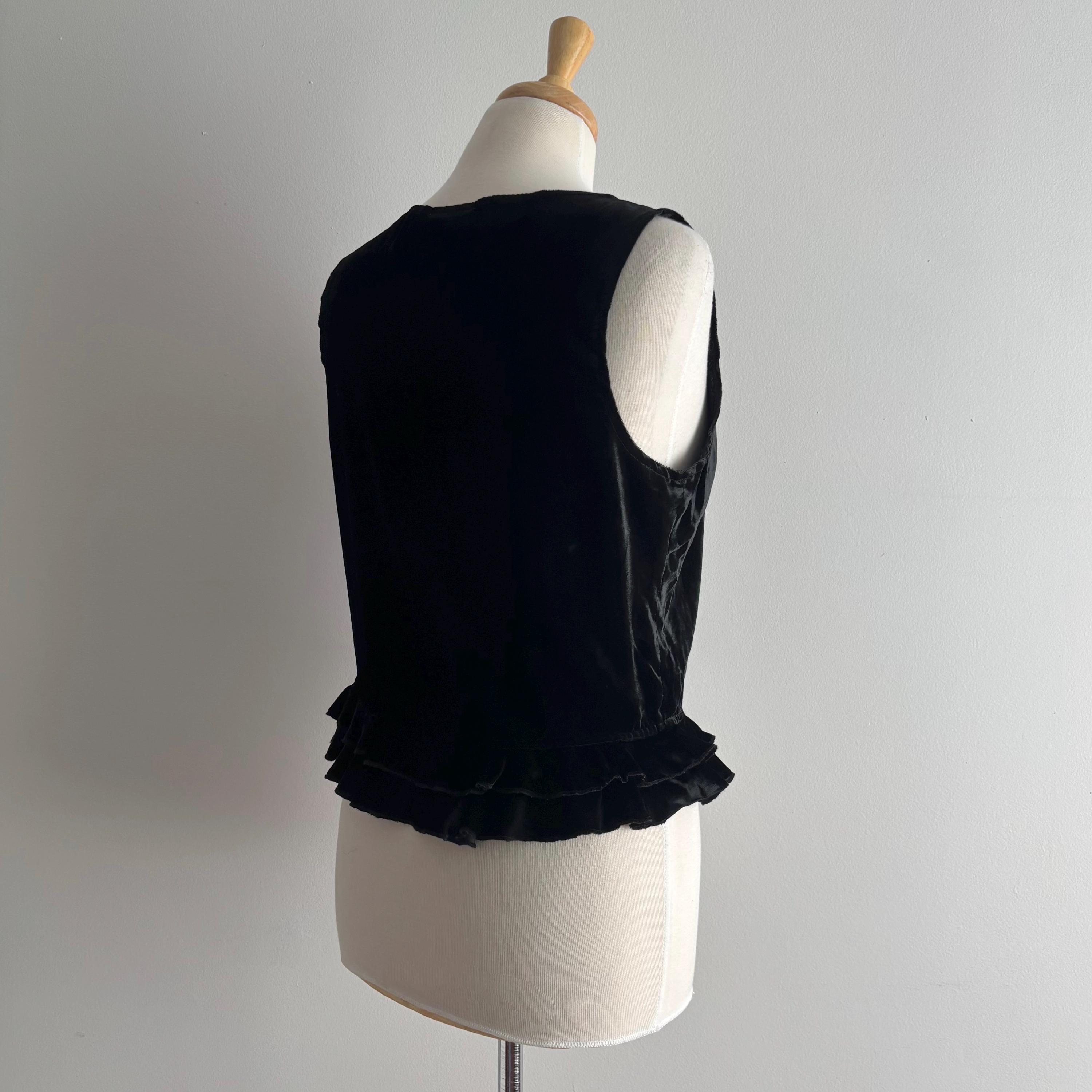 A gorgeous black velvet top. Perfect for fall! This vintage 90's Caché top is sleeveless, with a hidden side zip and two layers of ruffle at the waist. Darted bust. Made in the USA. 100% rayon. Size L, please see the measurements for best fit.