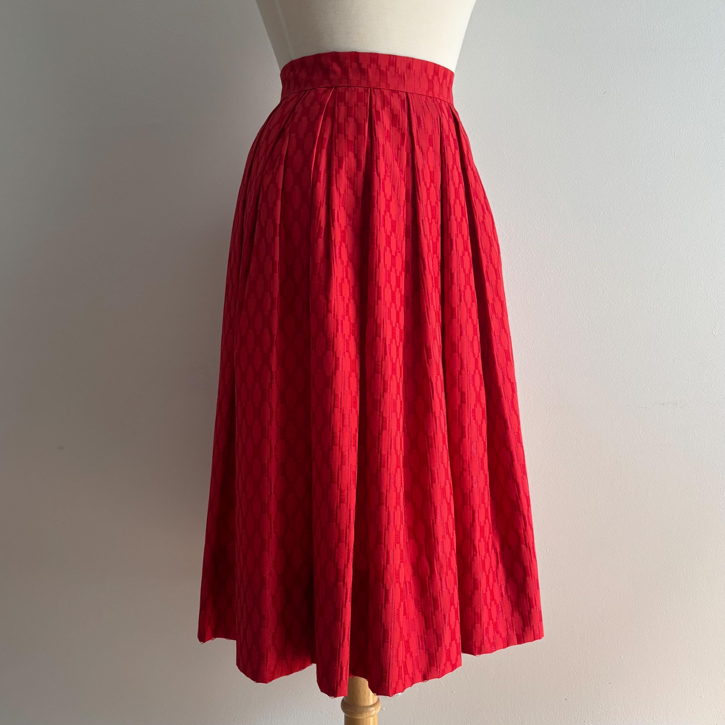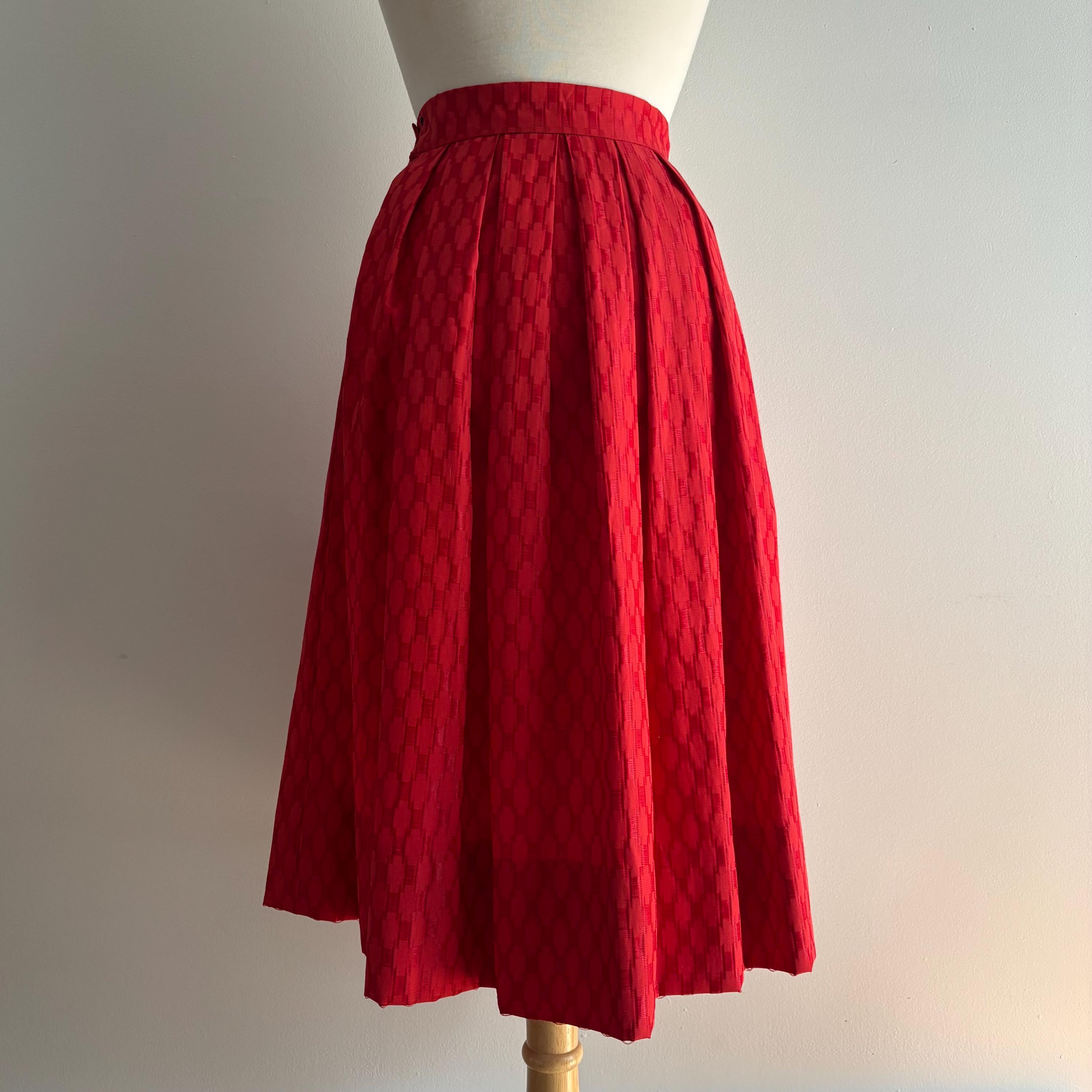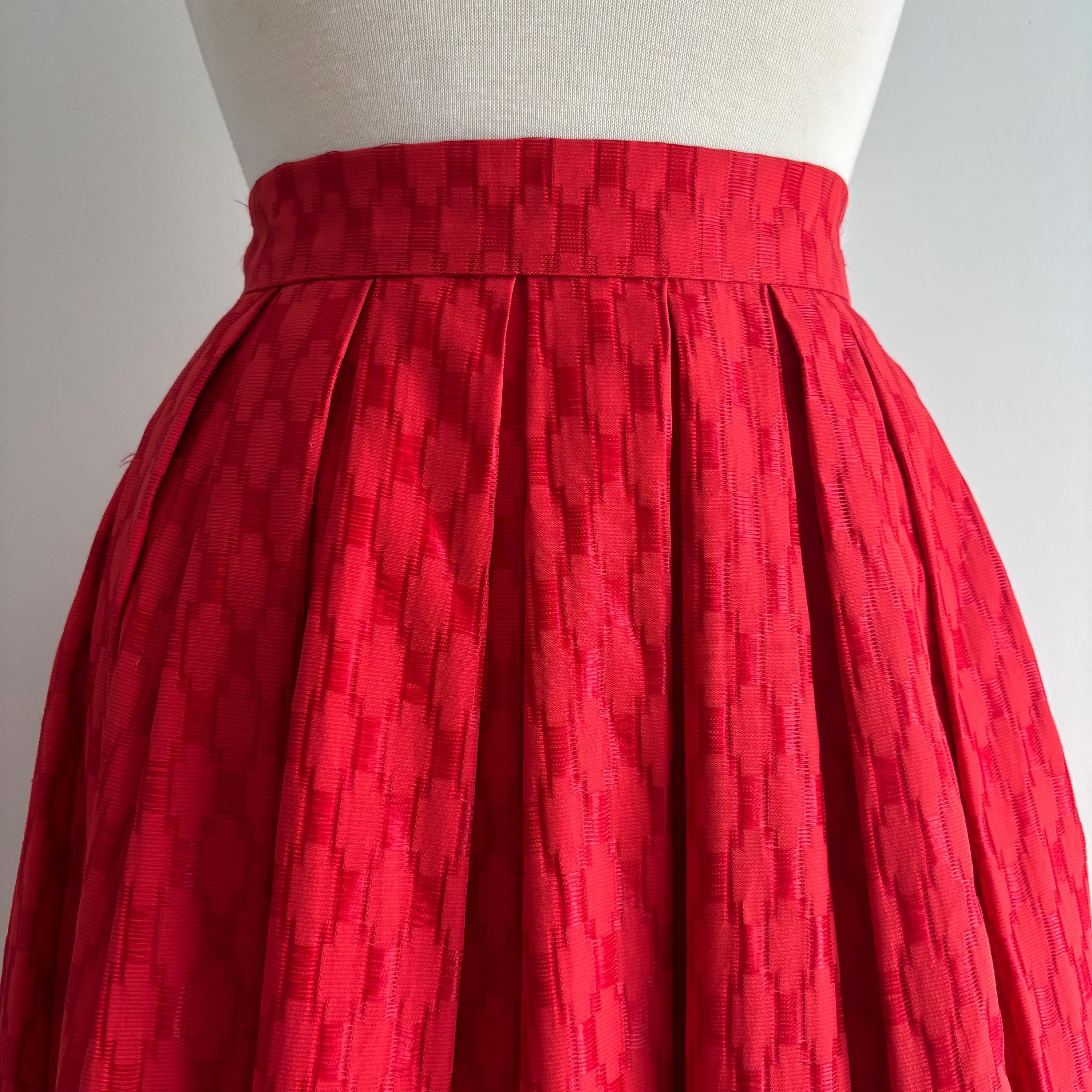 A lovely vintage skirt, with a high waist and lots of volume. While this is a 1950's style, I suspect it was made a bit later later on. The waistband closes at the side with two snaps and a hidden nylon zipper. This would look amazing with a petticoat underneath to hold the volume. The fabric has a pucker and weave with contrasting matte and shiny pattern. Beautifully constructed, with about 3 inches of room in the hem, should you want to adjust the length. No tags. Please see the measurements for best fit.