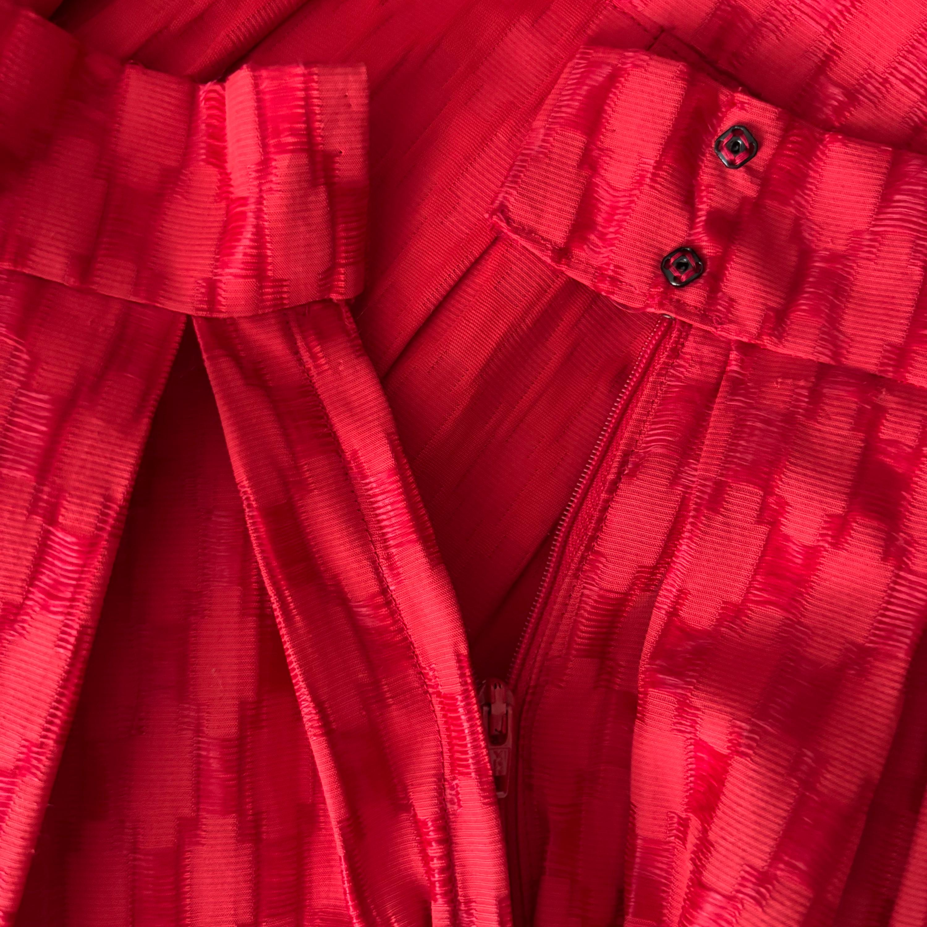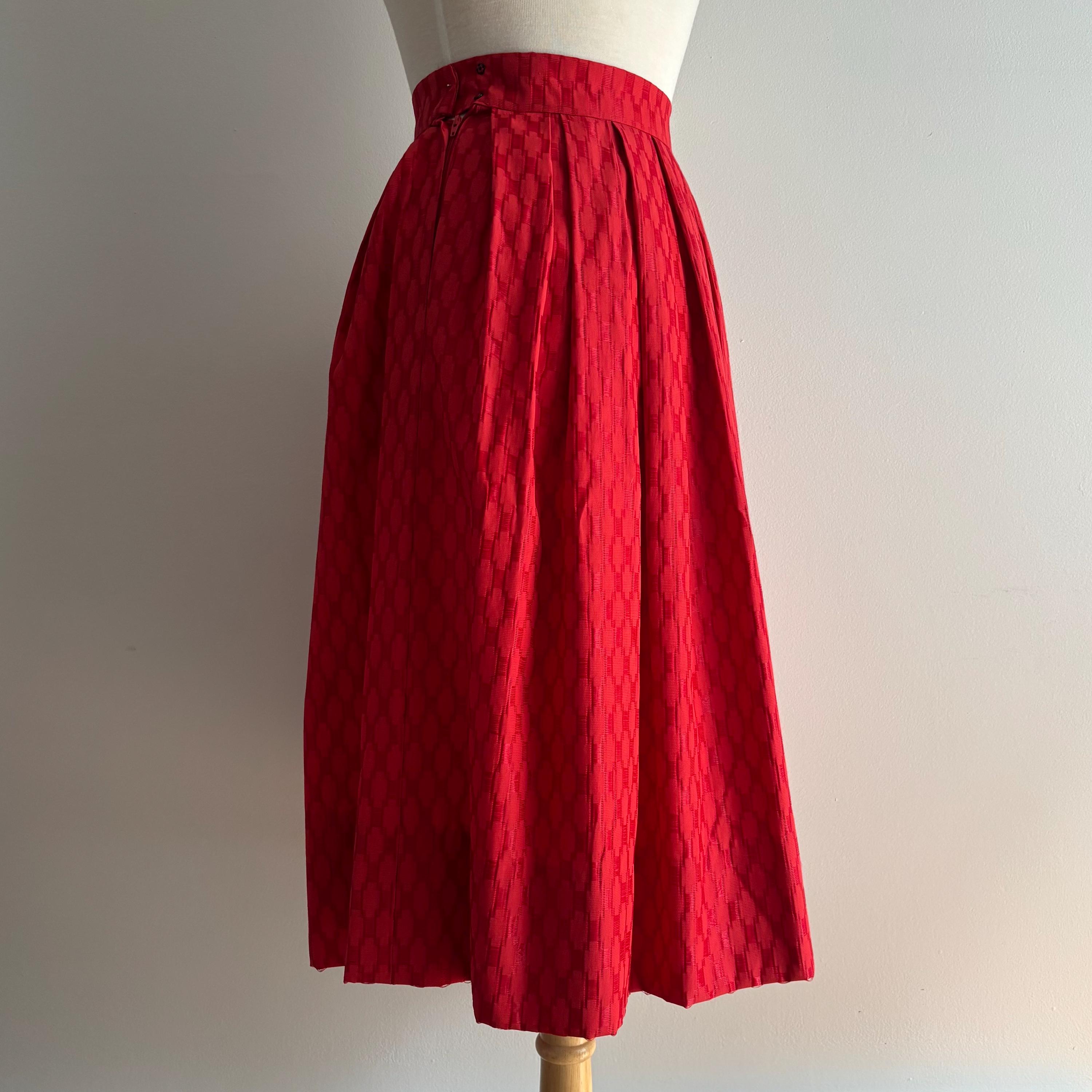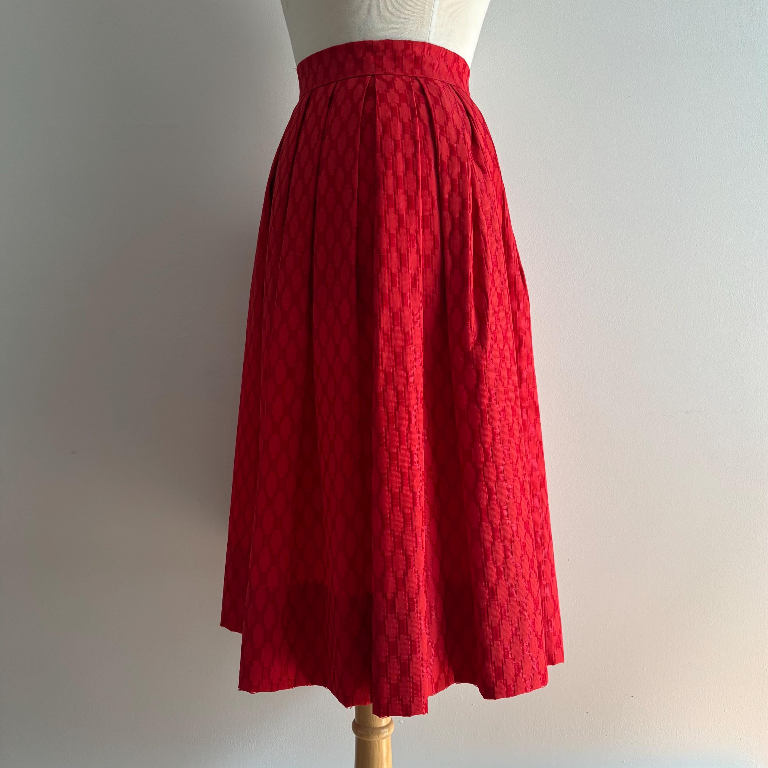 A lovely vintage skirt, with a high waist and lots of volume. While this is a 1950's style, I suspect it was made a bit later later on. The waistband closes at the side with two snaps and a hidden nylon zipper. This would look amazing with a petticoat underneath to hold the volume. The fabric has a pucker and weave with contrasting matte and shiny pattern. Beautifully constructed, with about 3 inches of room in the hem, should you want to adjust the length. No tags. Please see the measurements for best fit.
