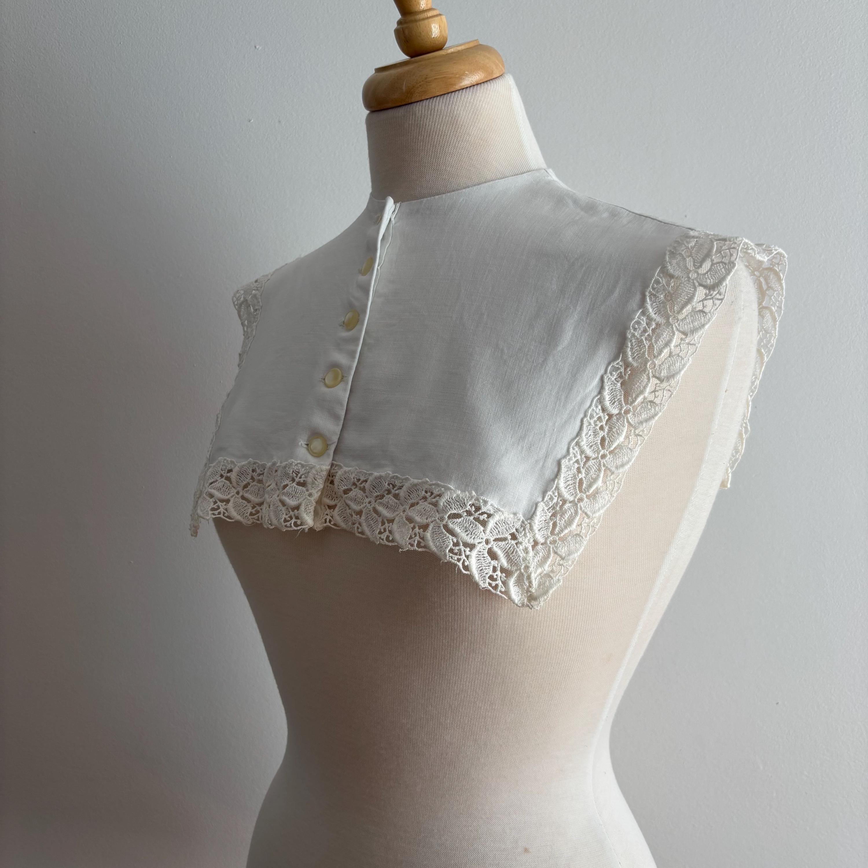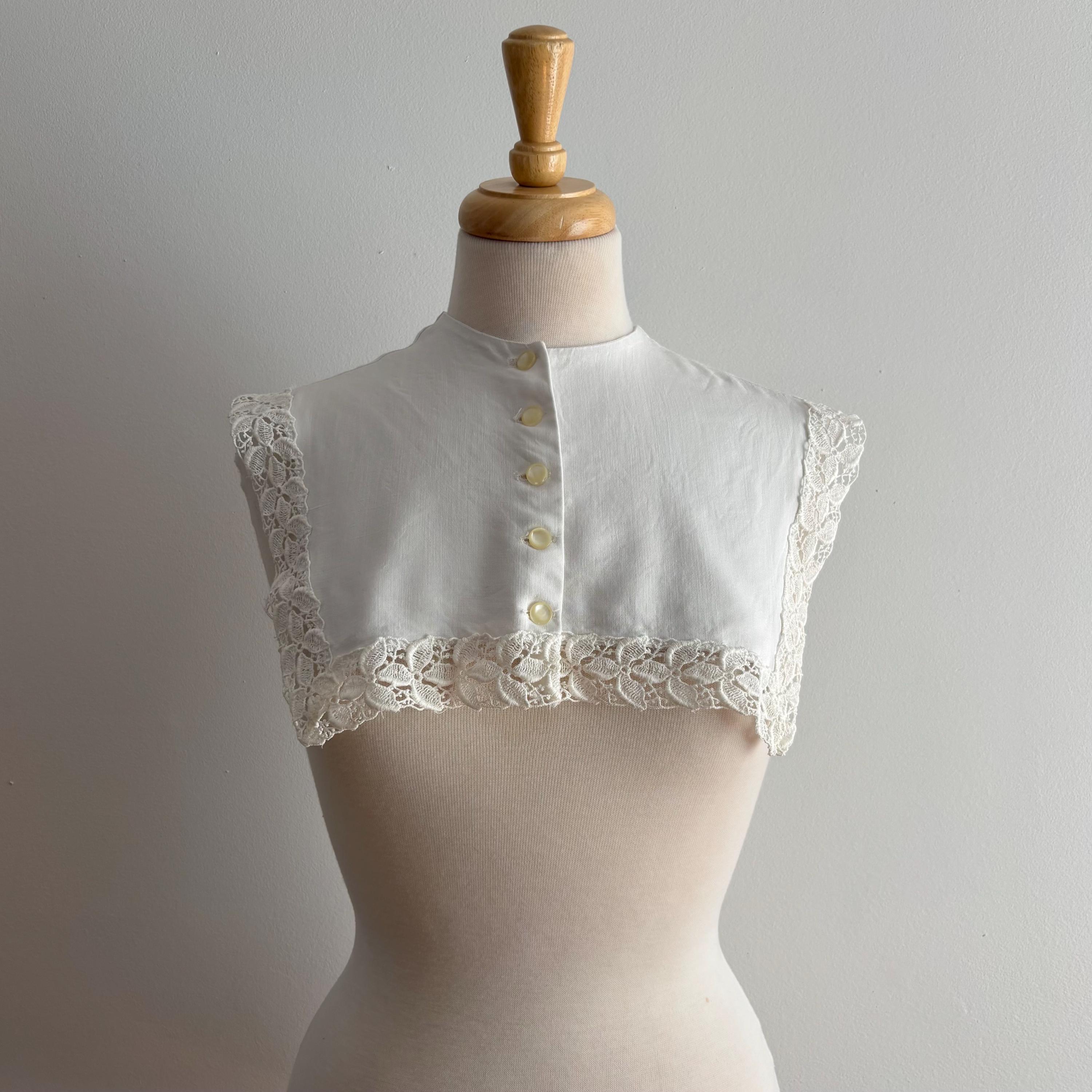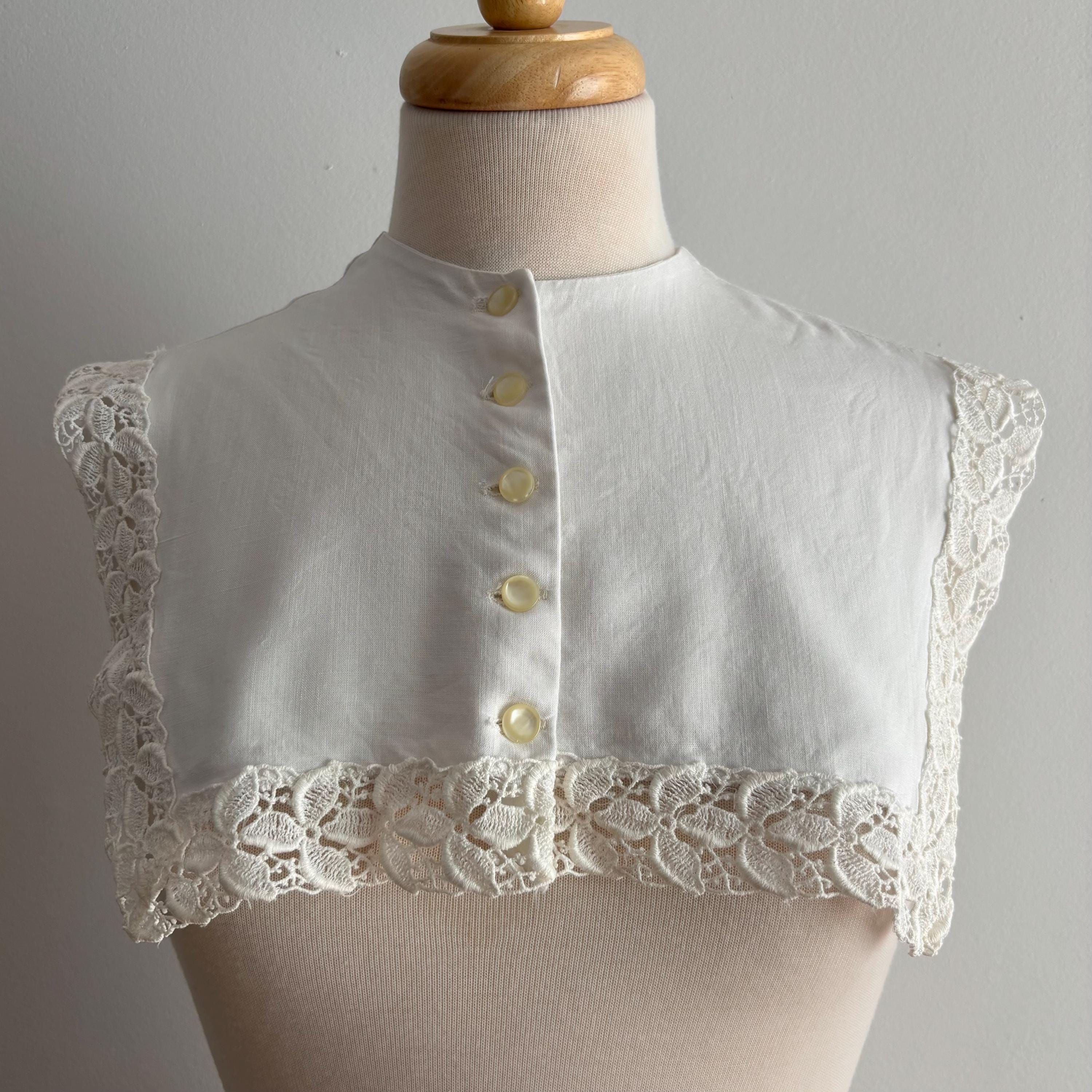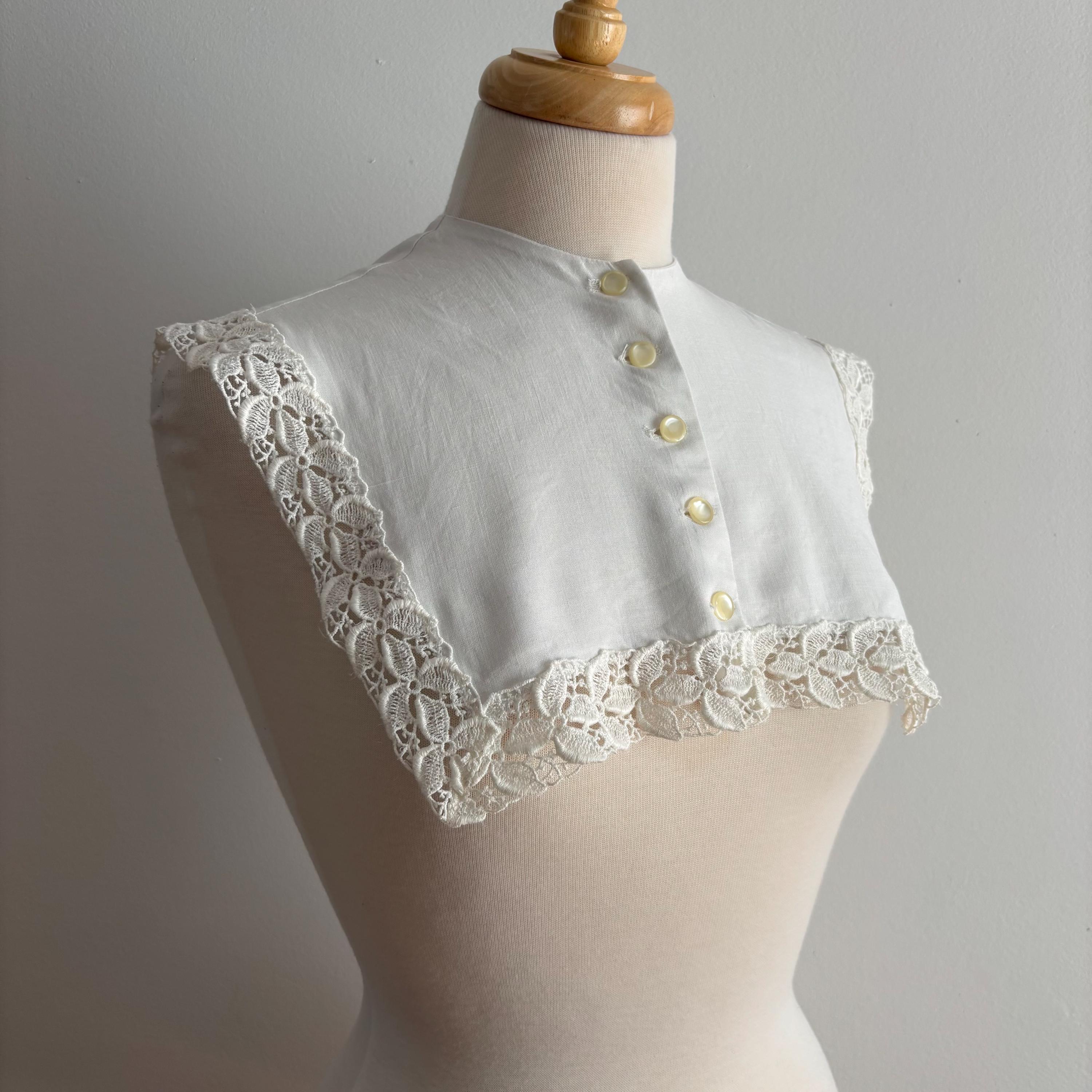 A sweet little collar to add a little something extra. Two layers of fine cotton broadcloth that button at the front, trimmed with a leafy patterned lace. I love popping a collar over a fine knit sweater! Please see the measurements for best fit.