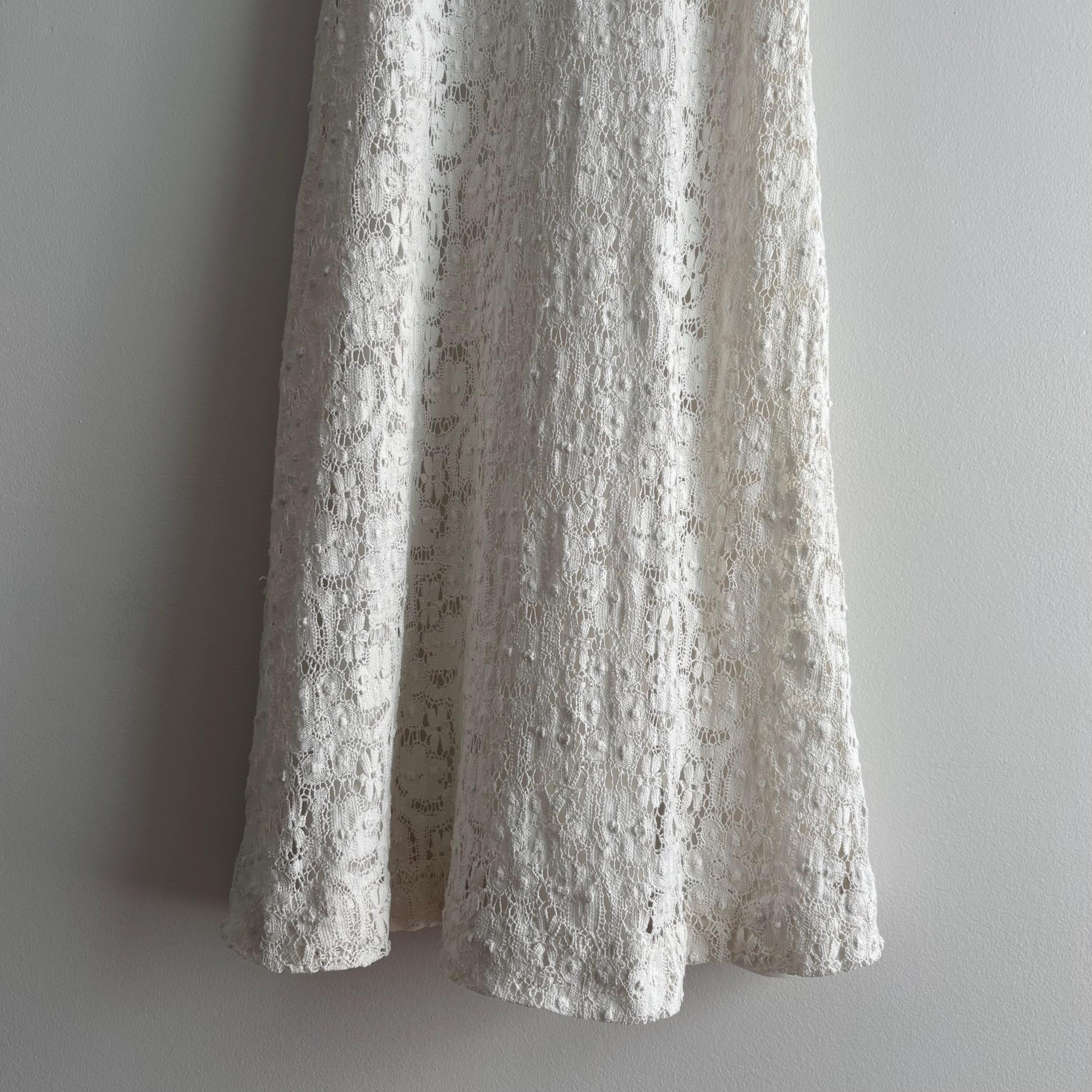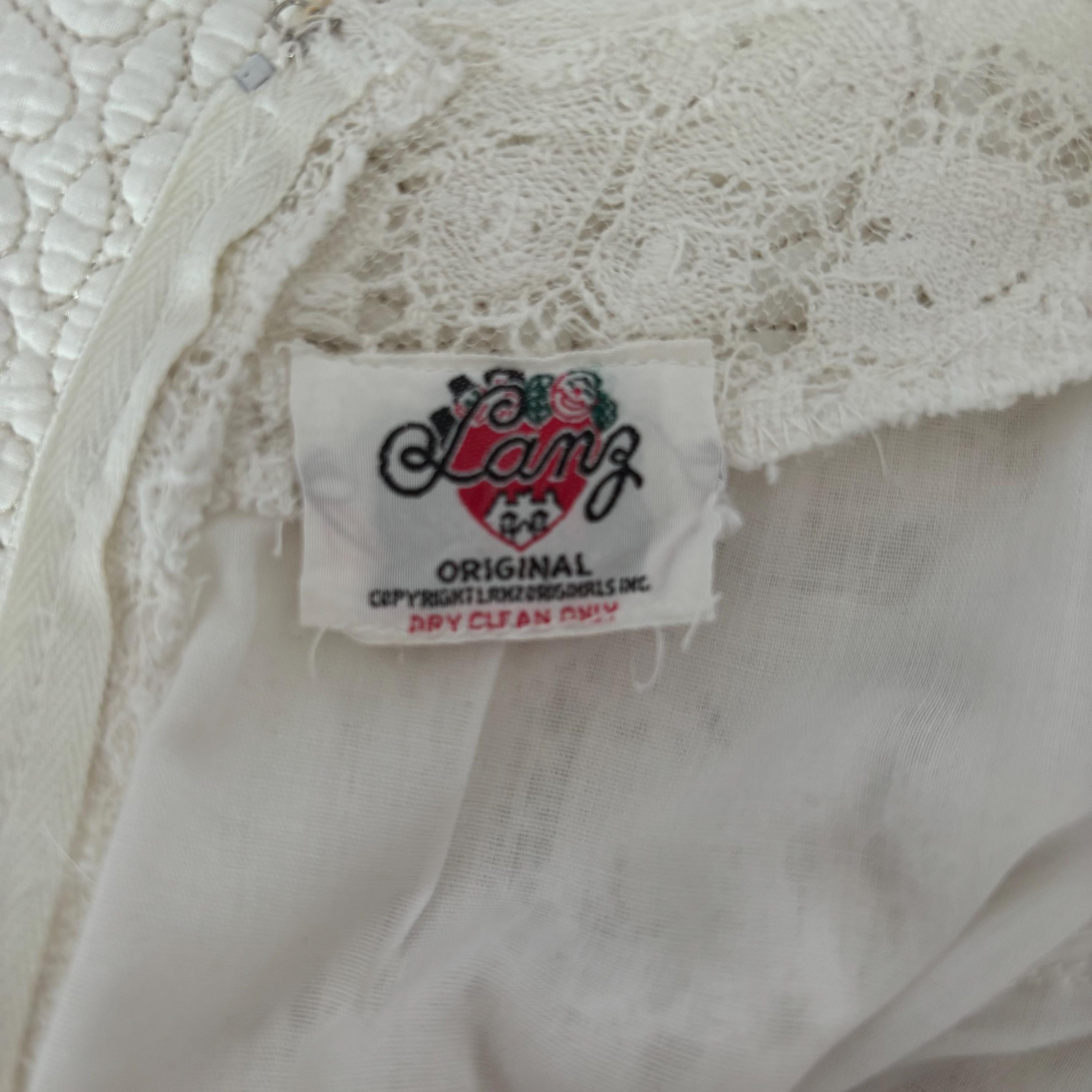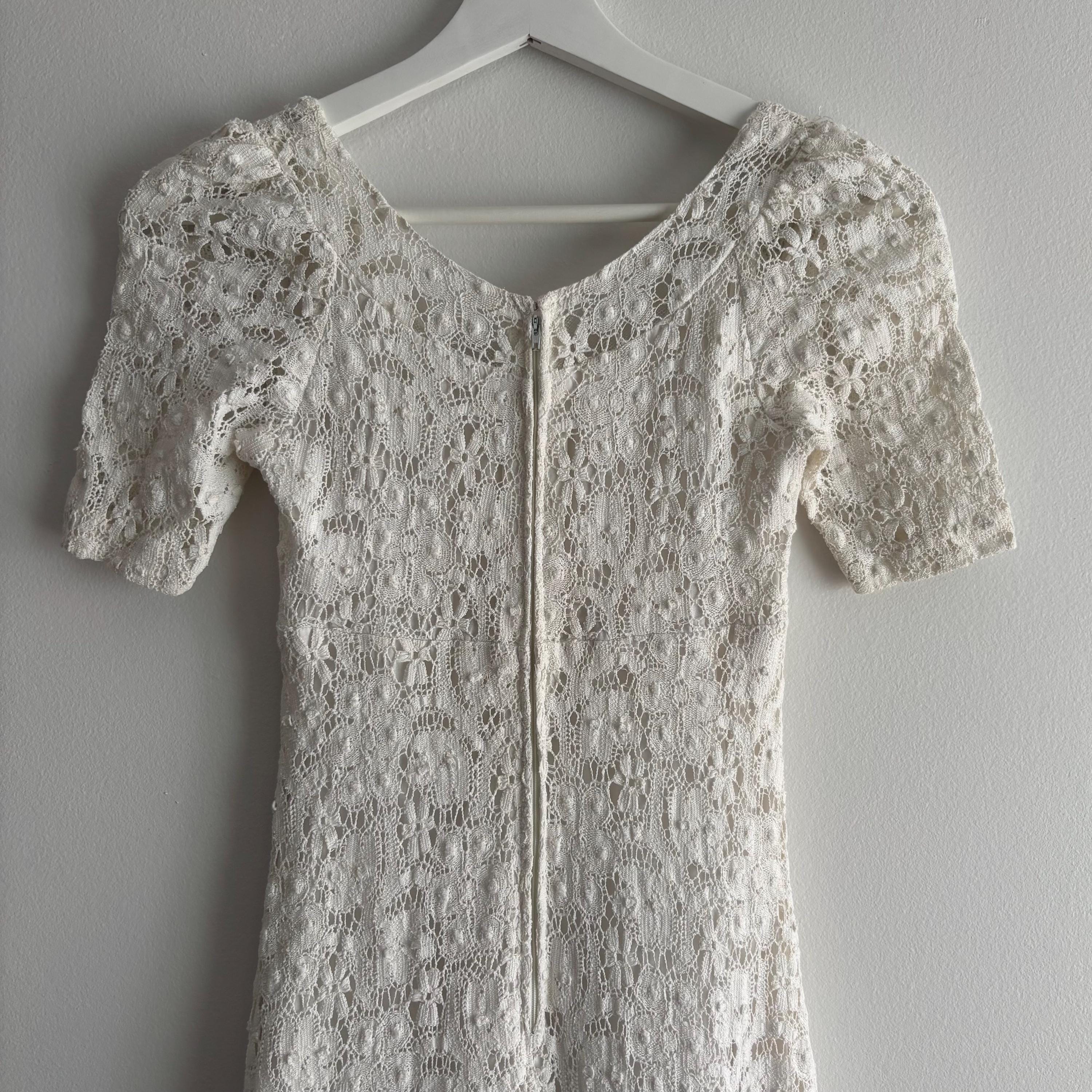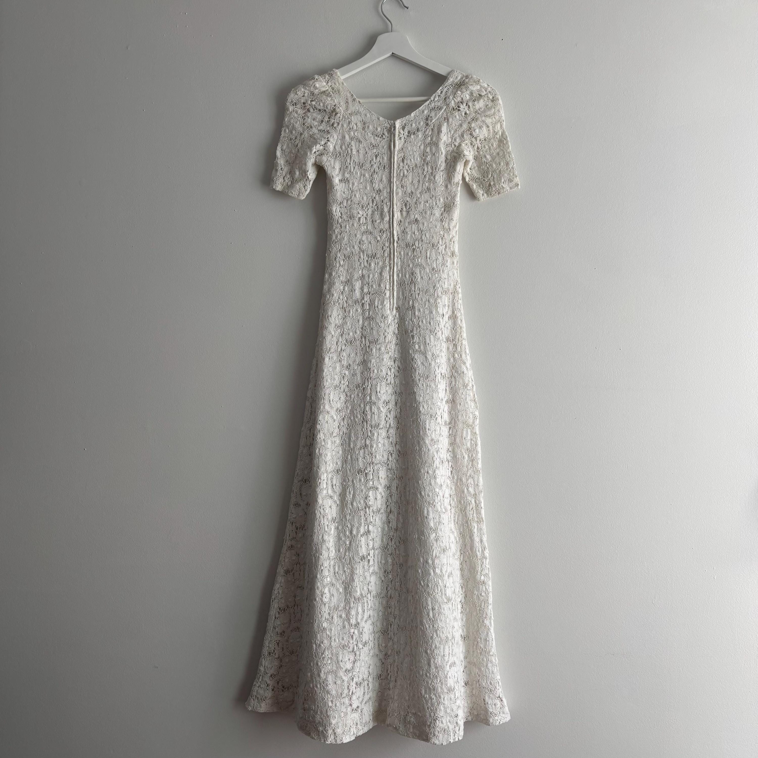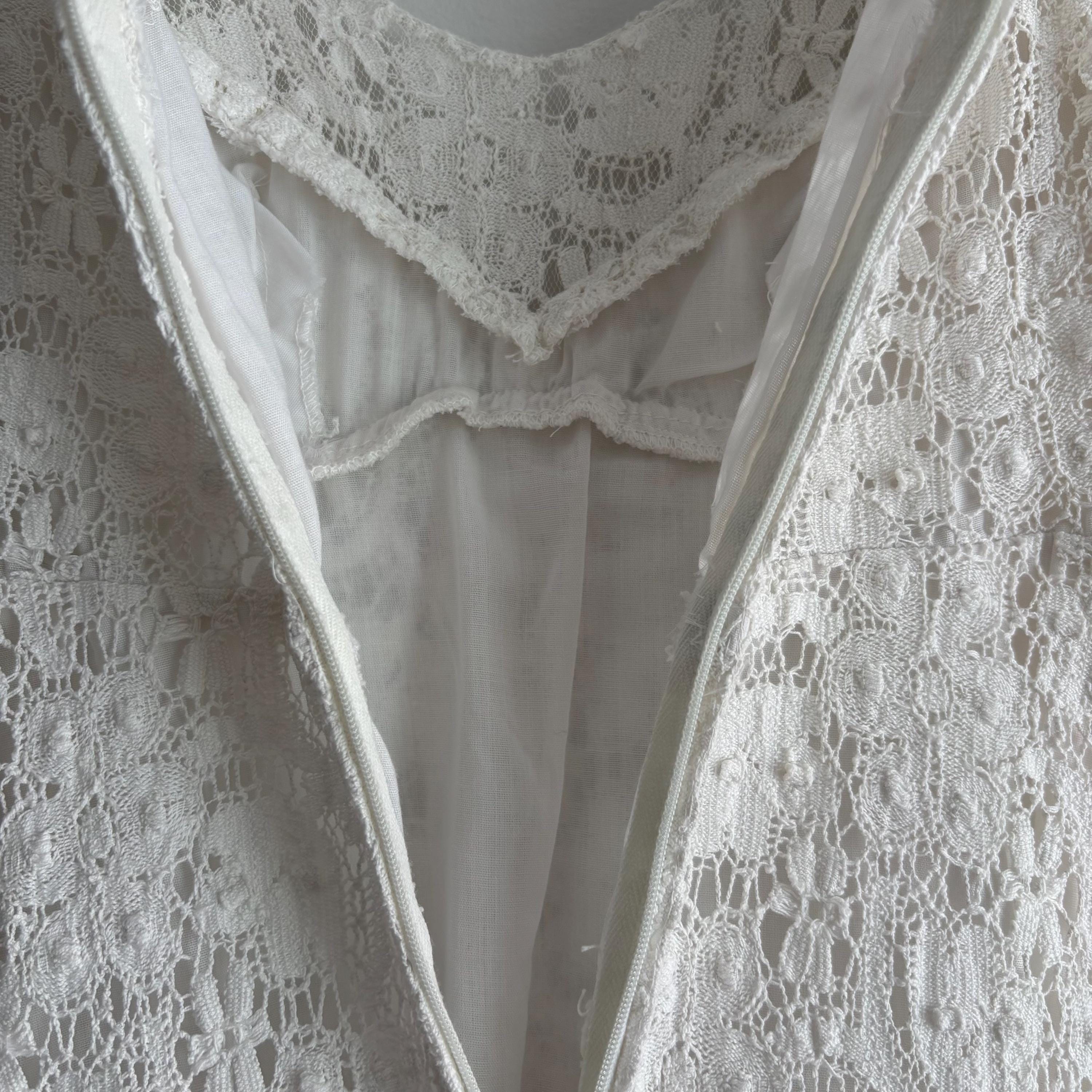 A gorgeous white cotton lace maxi dress by Lanz! So wee, it wouldn't fit my dress form, so please forgive the hanger photos. The dress is extraordinary, fully lined in white cotton, except for the sleeves and neckline. It zips up at the back, and closes with a hook and eye closure at the neck. The dress is fitted through the bust with an empire waist, and maxi length skirt. There are little loops to keep your bra straps in place. No size tag, so please see the measurements for best fit.