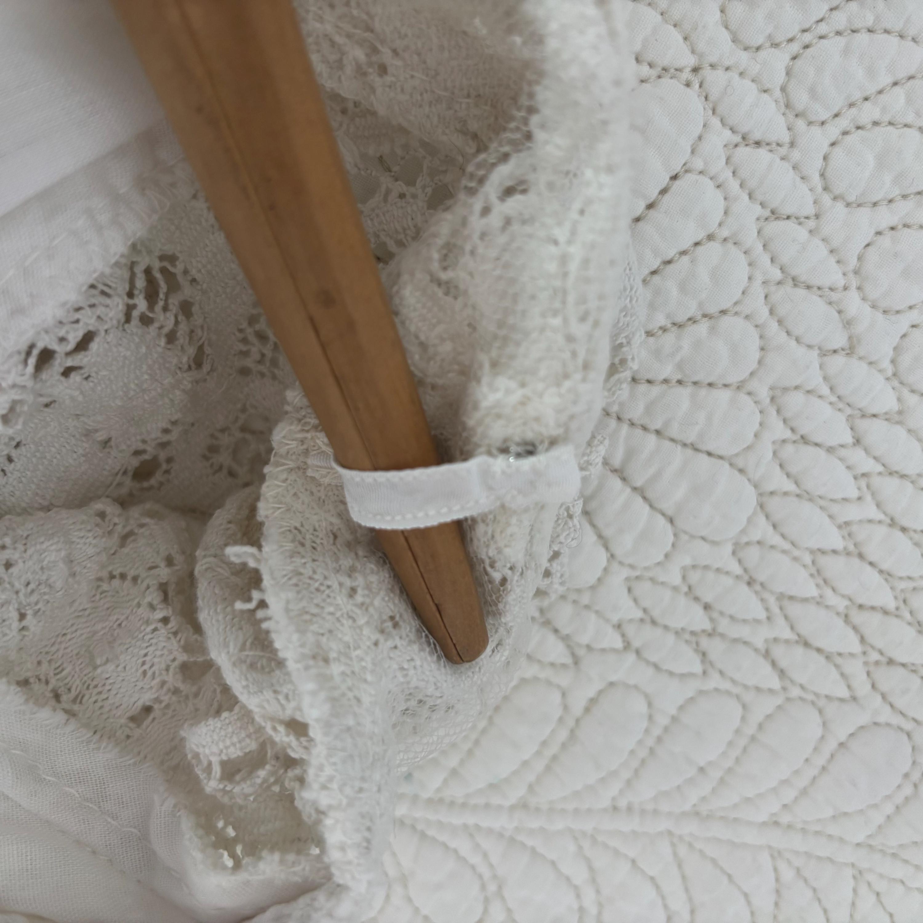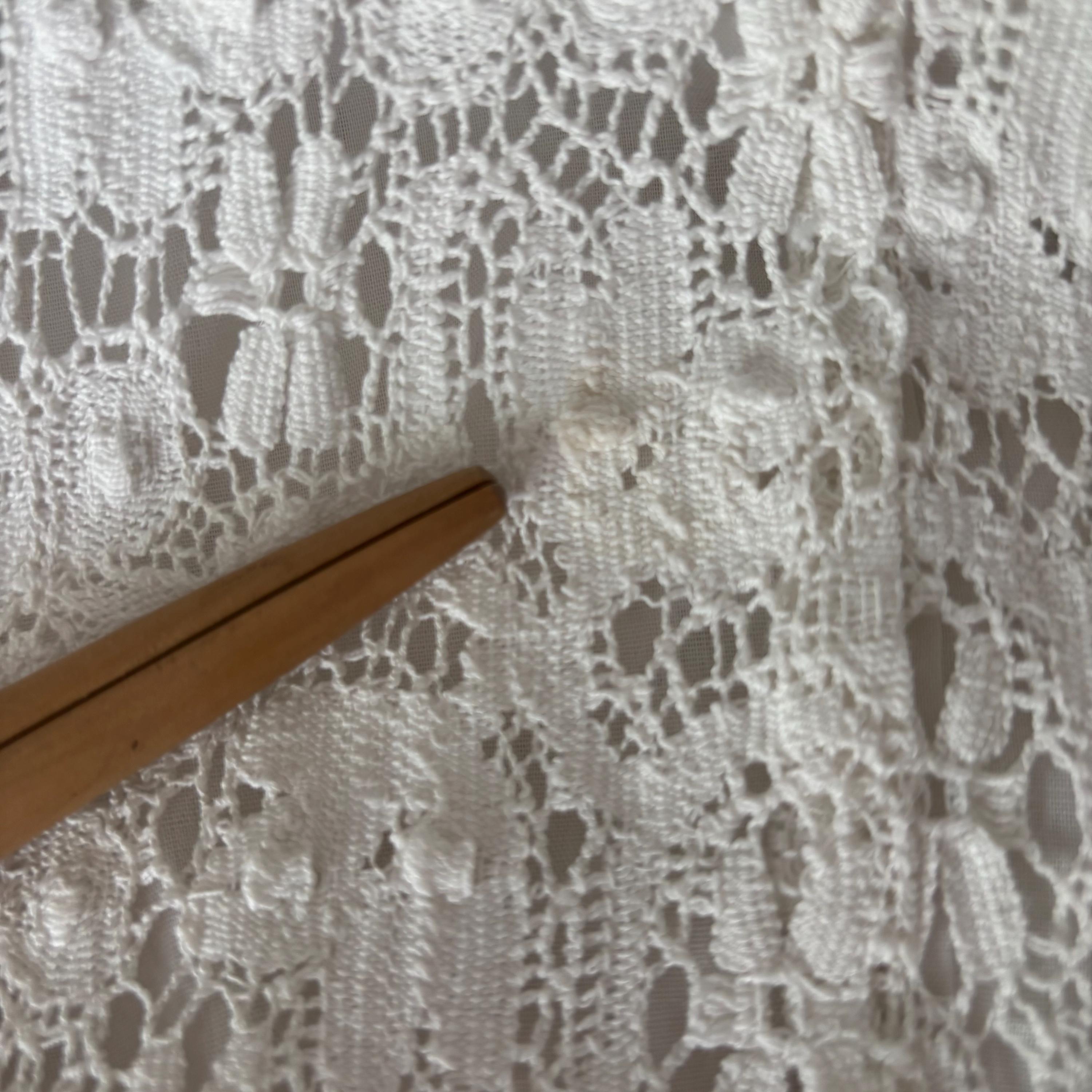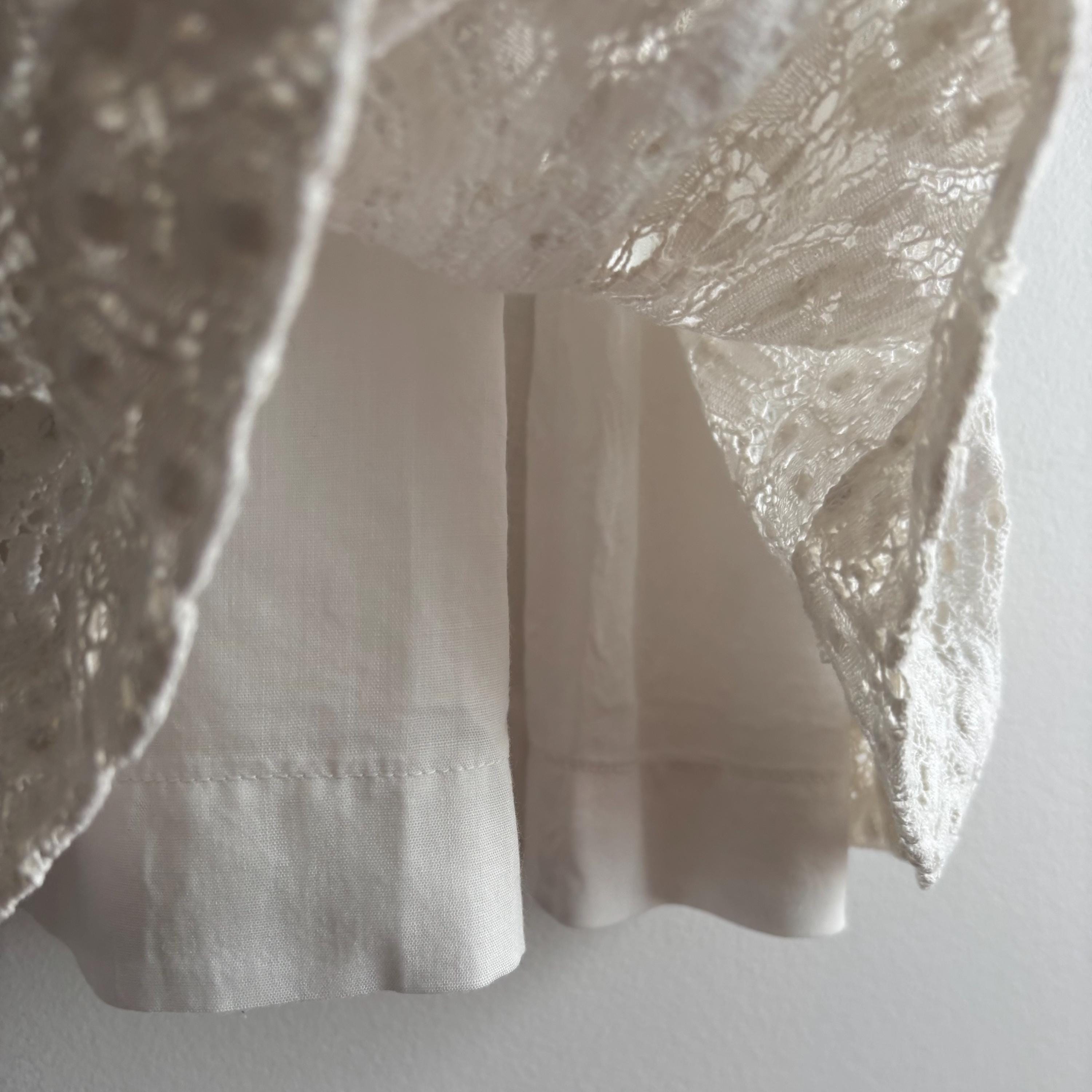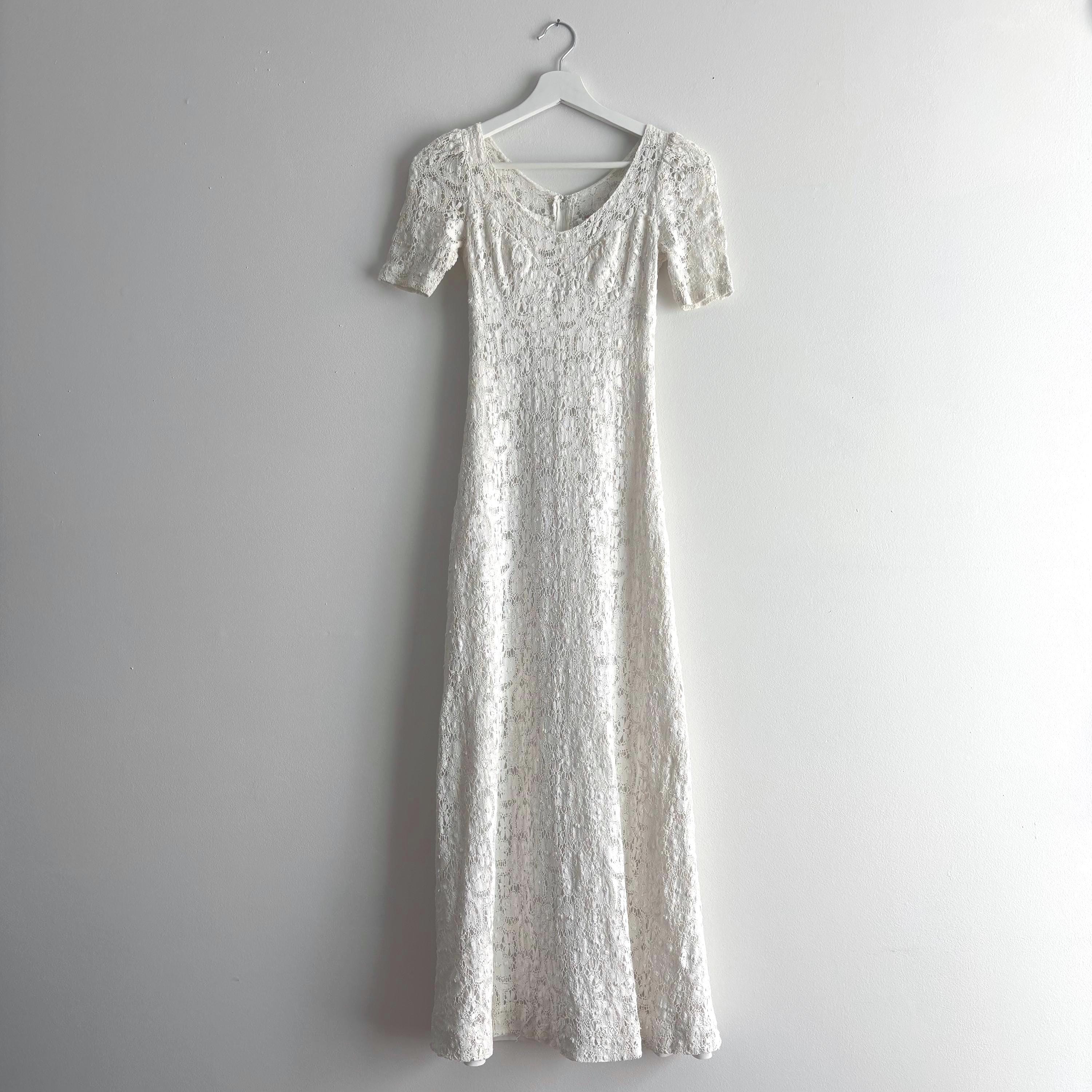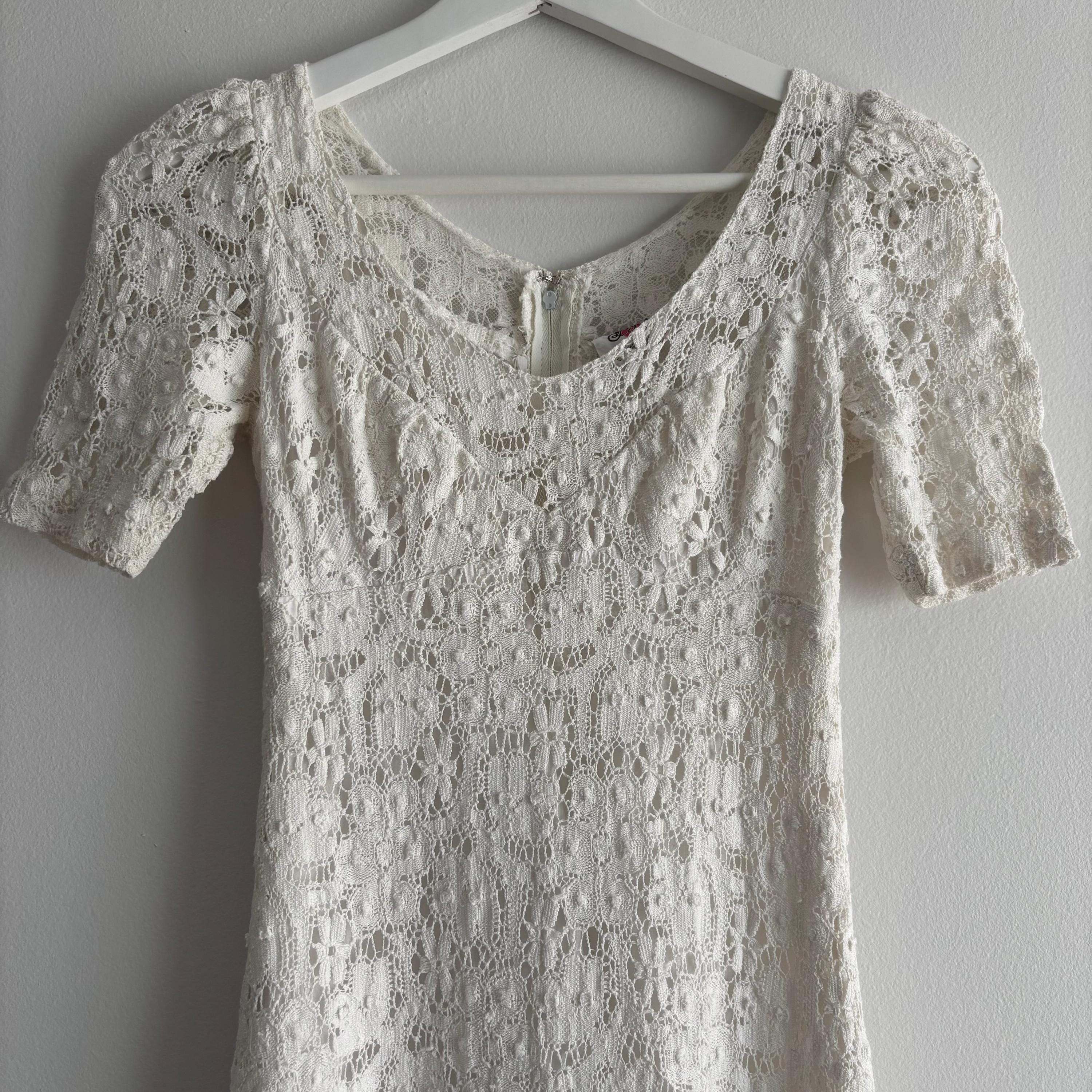 A gorgeous white cotton lace maxi dress by Lanz! So wee, it wouldn't fit my dress form, so please forgive the hanger photos. The dress is extraordinary, fully lined in white cotton, except for the sleeves and neckline. It zips up at the back, and closes with a hook and eye closure at the neck. The dress is fitted through the bust with an empire waist, and maxi length skirt. There are little loops to keep your bra straps in place. No size tag, so please see the measurements for best fit.