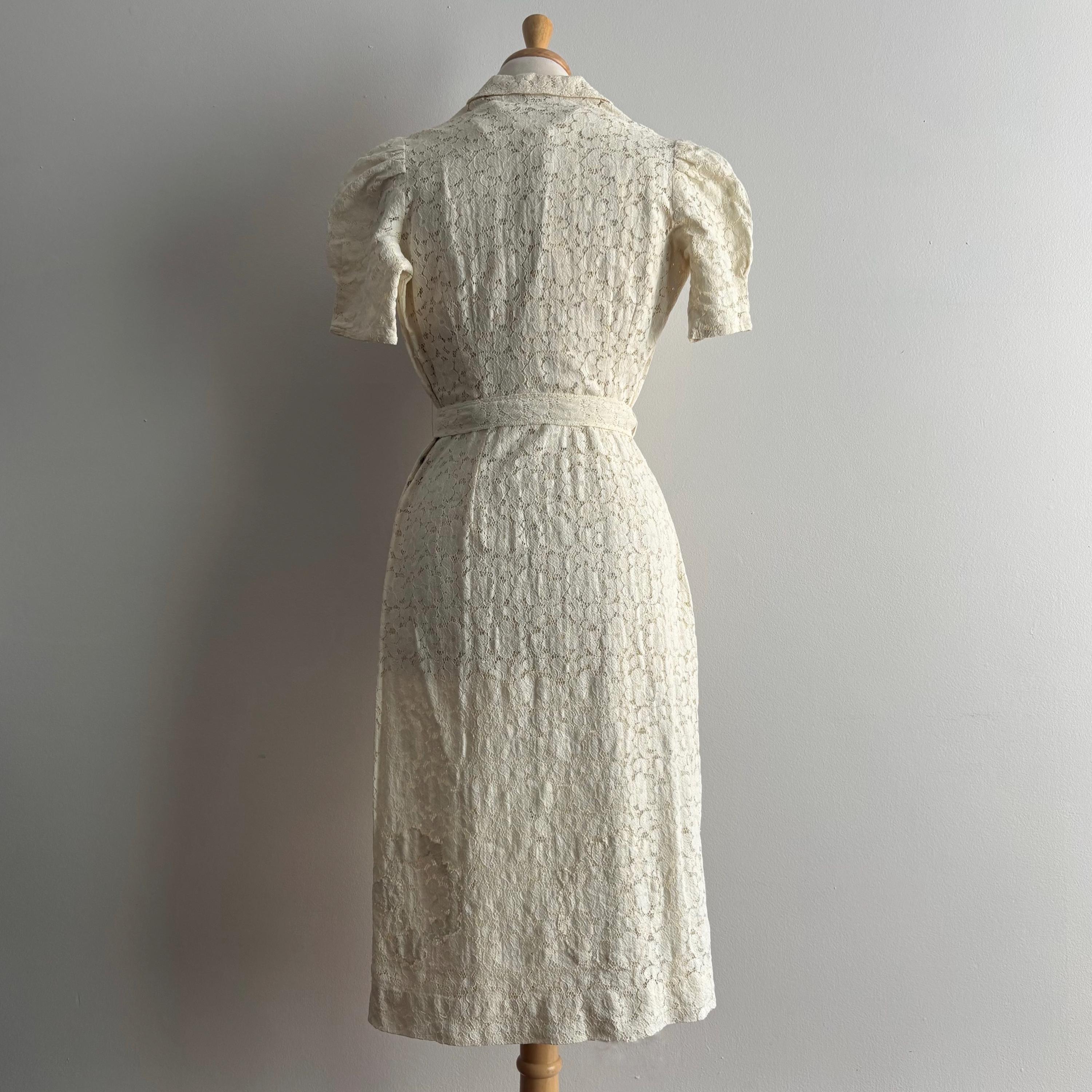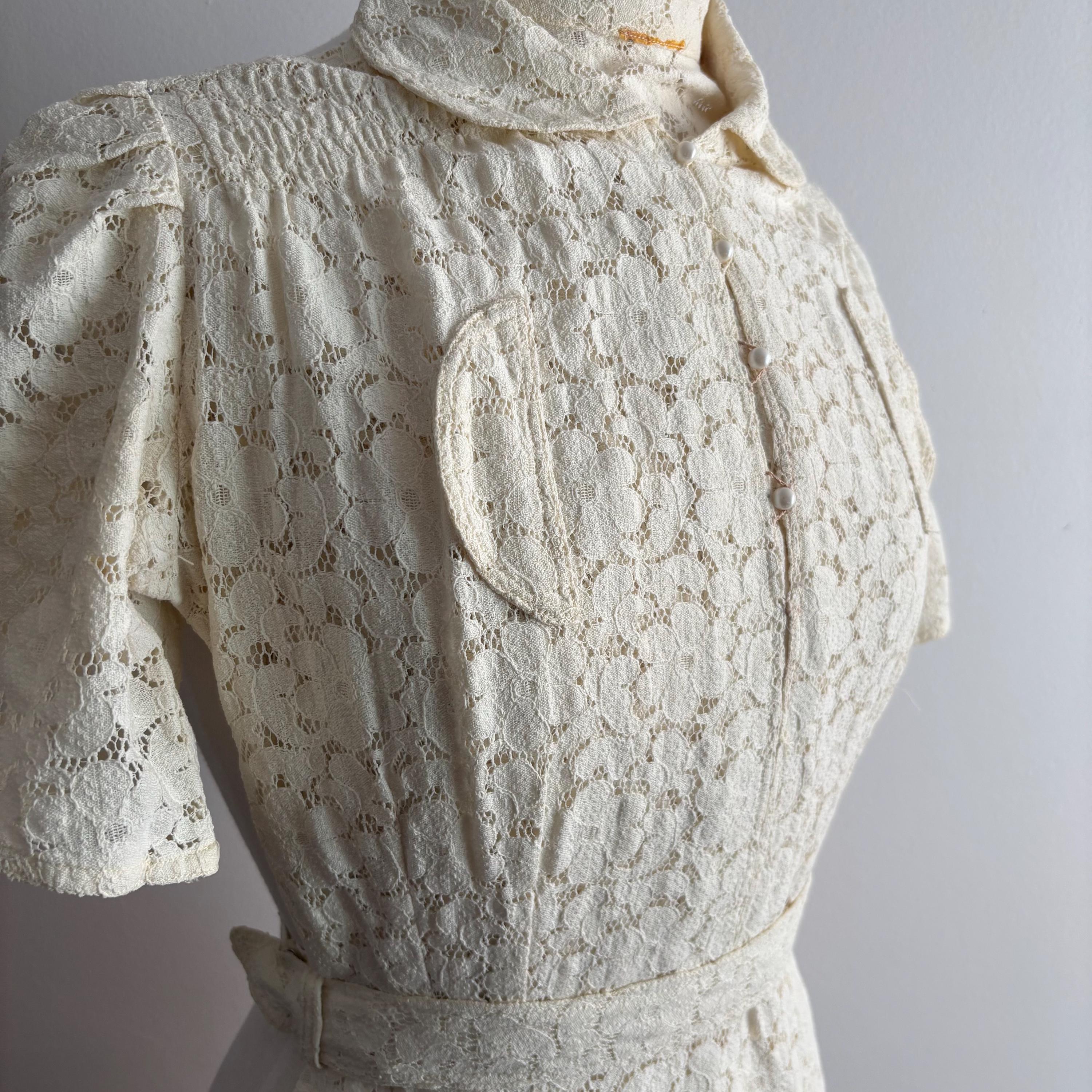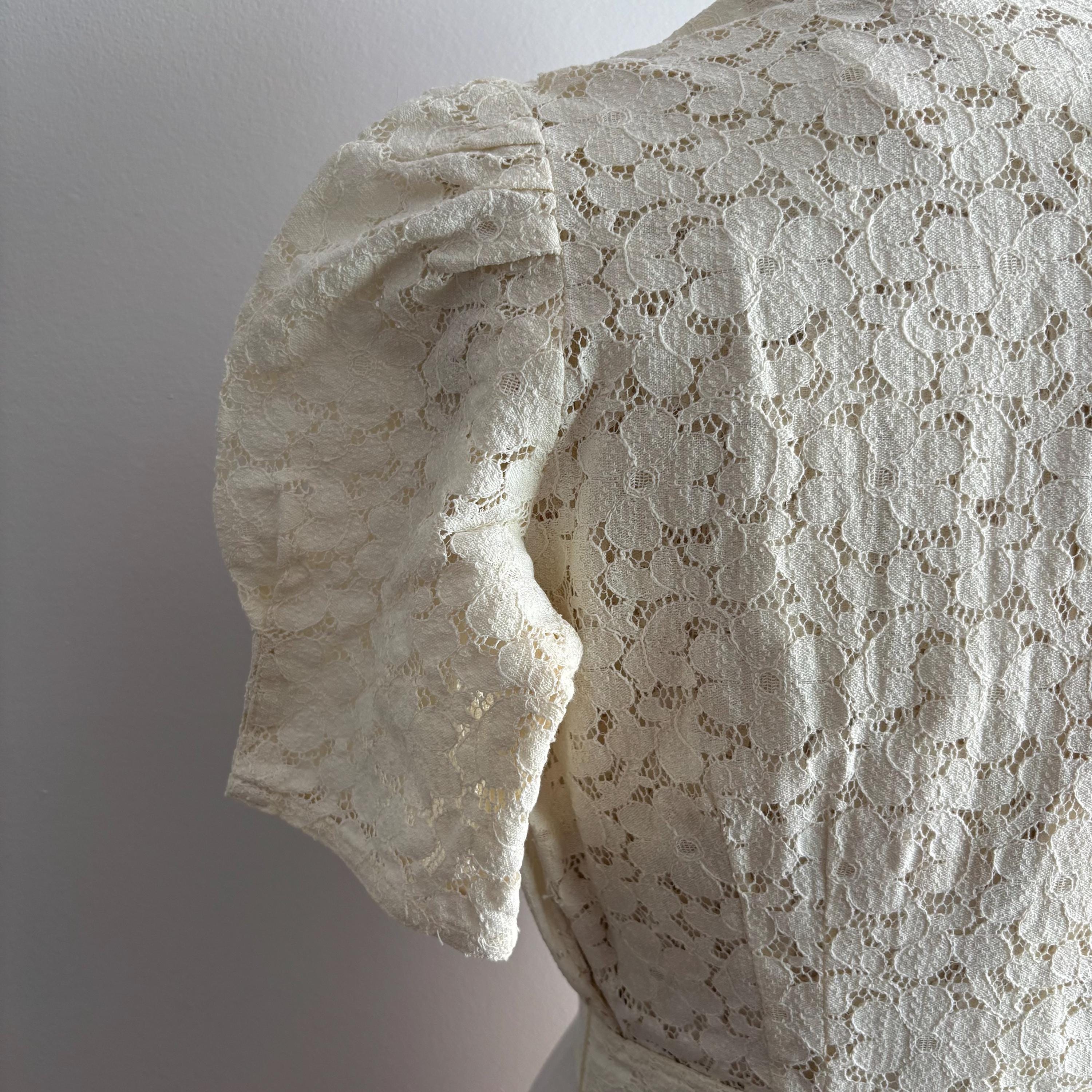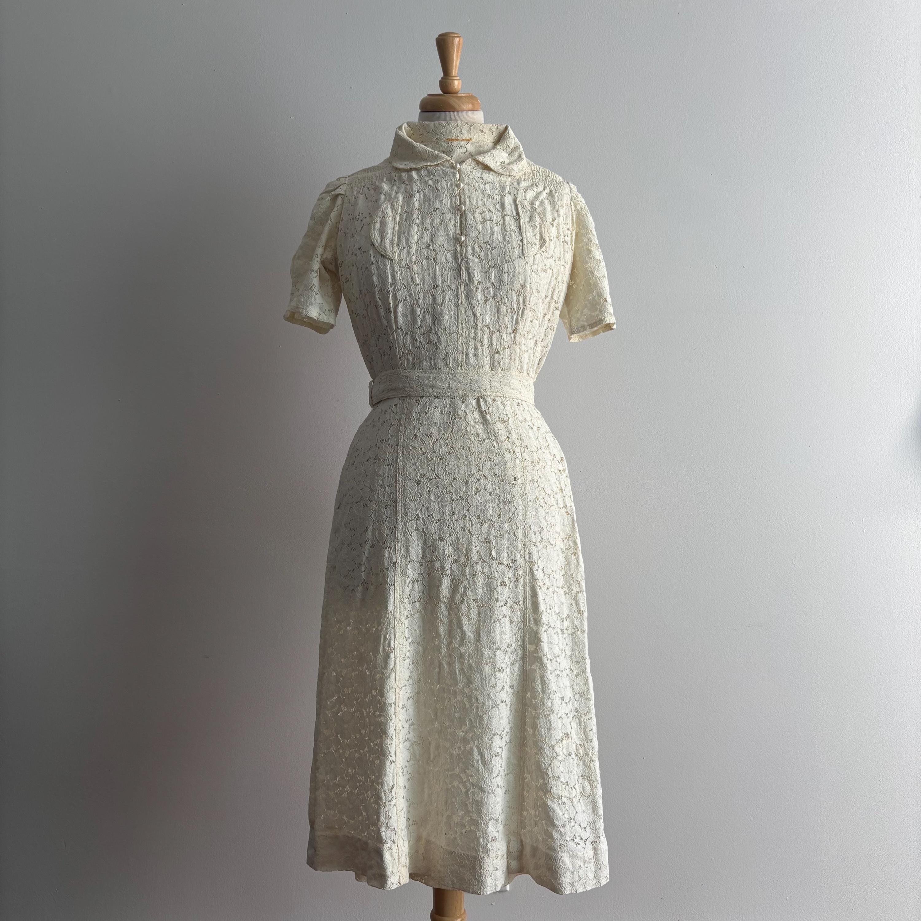 A gorgeous vintage dress, done up in a parchment coloured floral lace. So many charming details, from the Peter Pan collar, to the subtle puff of the sleeves. The pearly buttons and the matching lace belt... such a special dress! It is unlined, though it will look a bit less see-through in the photos, as I had to pin it to the mannequin. The dress buttons at the chest, and has snaps and hook-and-eye closures at the side waist. No tags, so please see the measurements for best fit.