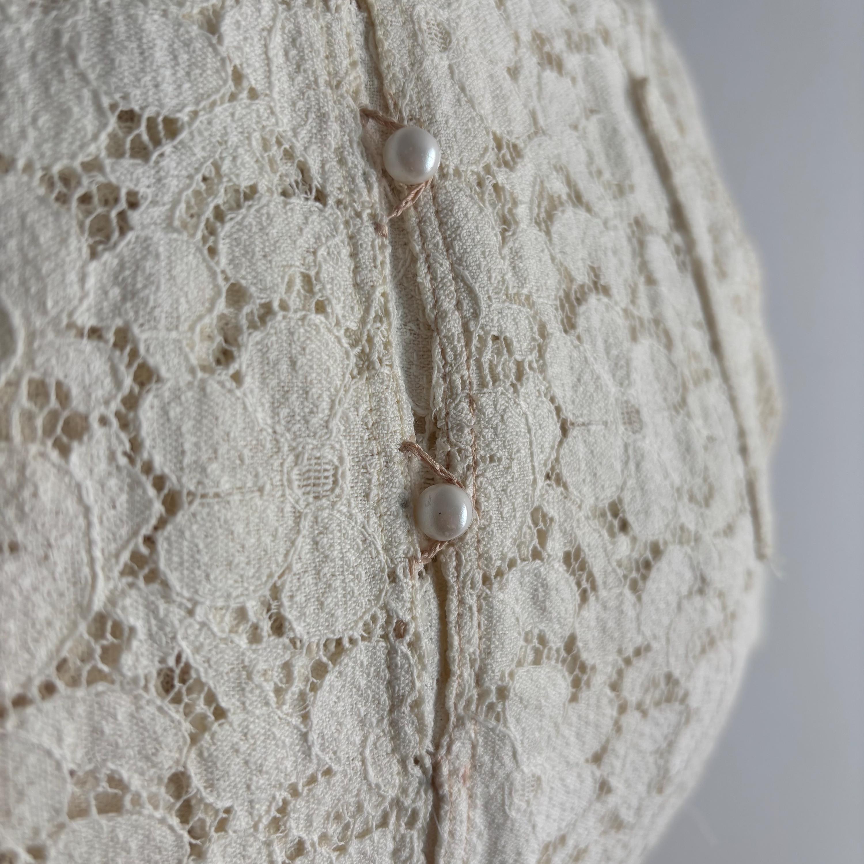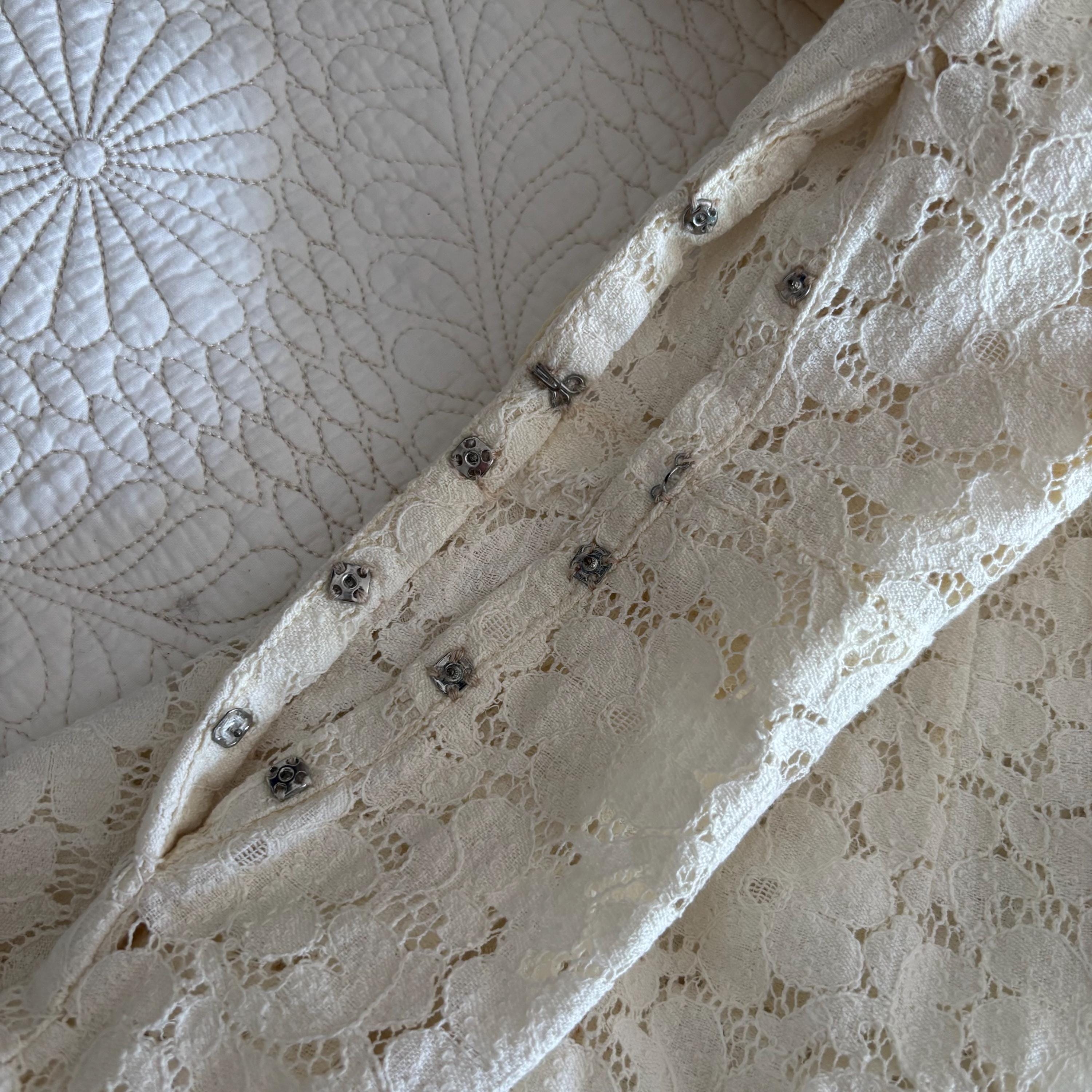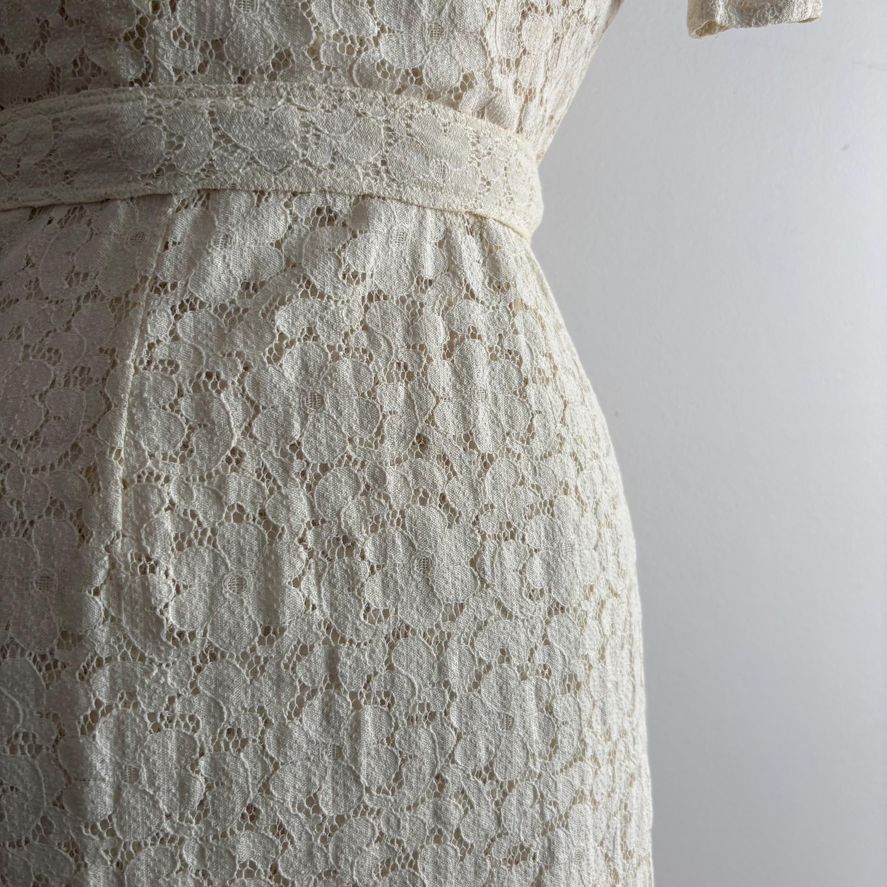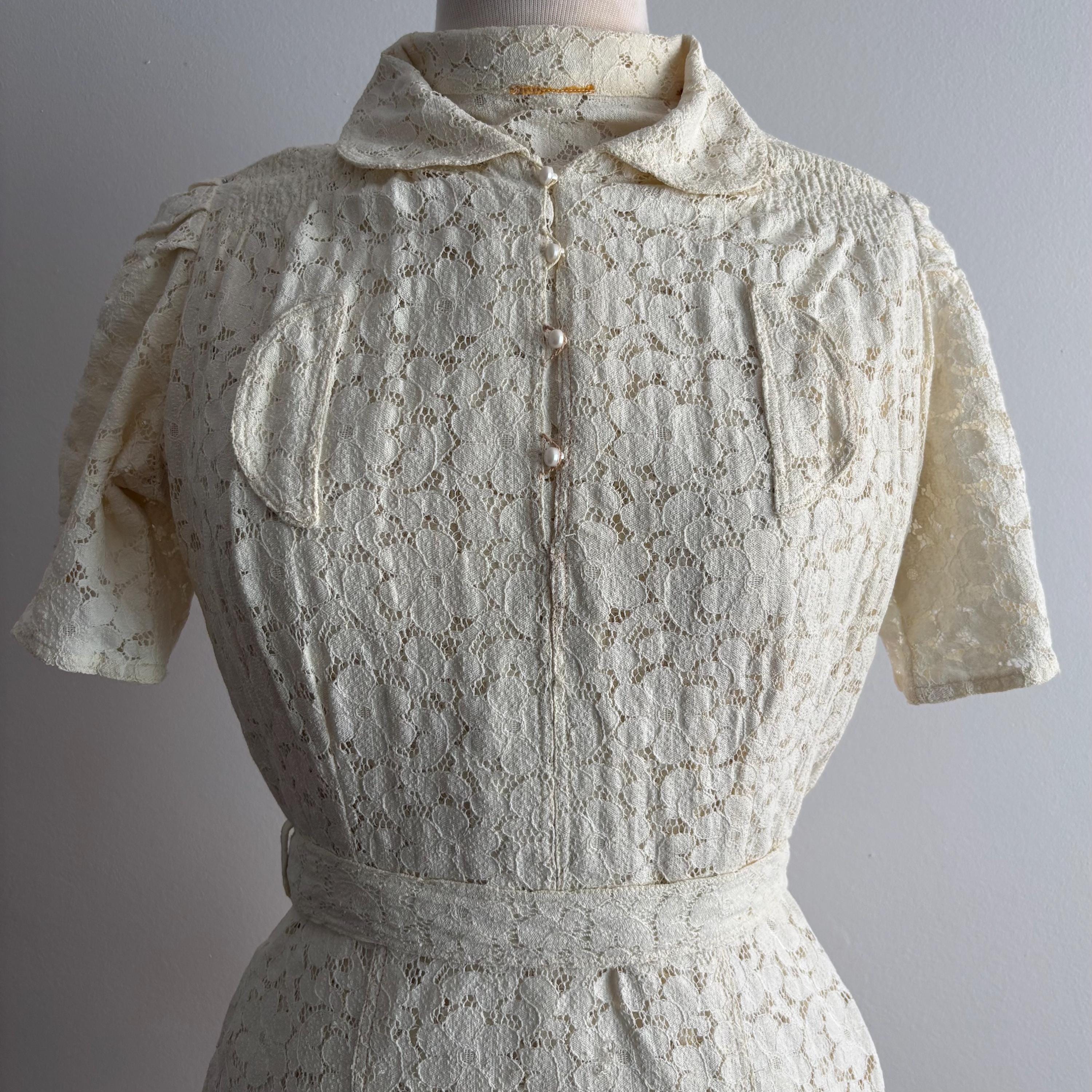 A gorgeous vintage dress, done up in a parchment coloured floral lace. So many charming details, from the Peter Pan collar, to the subtle puff of the sleeves. The pearly buttons and the matching lace belt... such a special dress! It is unlined, though it will look a bit less see-through in the photos, as I had to pin it to the mannequin. The dress buttons at the chest, and has snaps and hook-and-eye closures at the side waist. No tags, so please see the measurements for best fit.