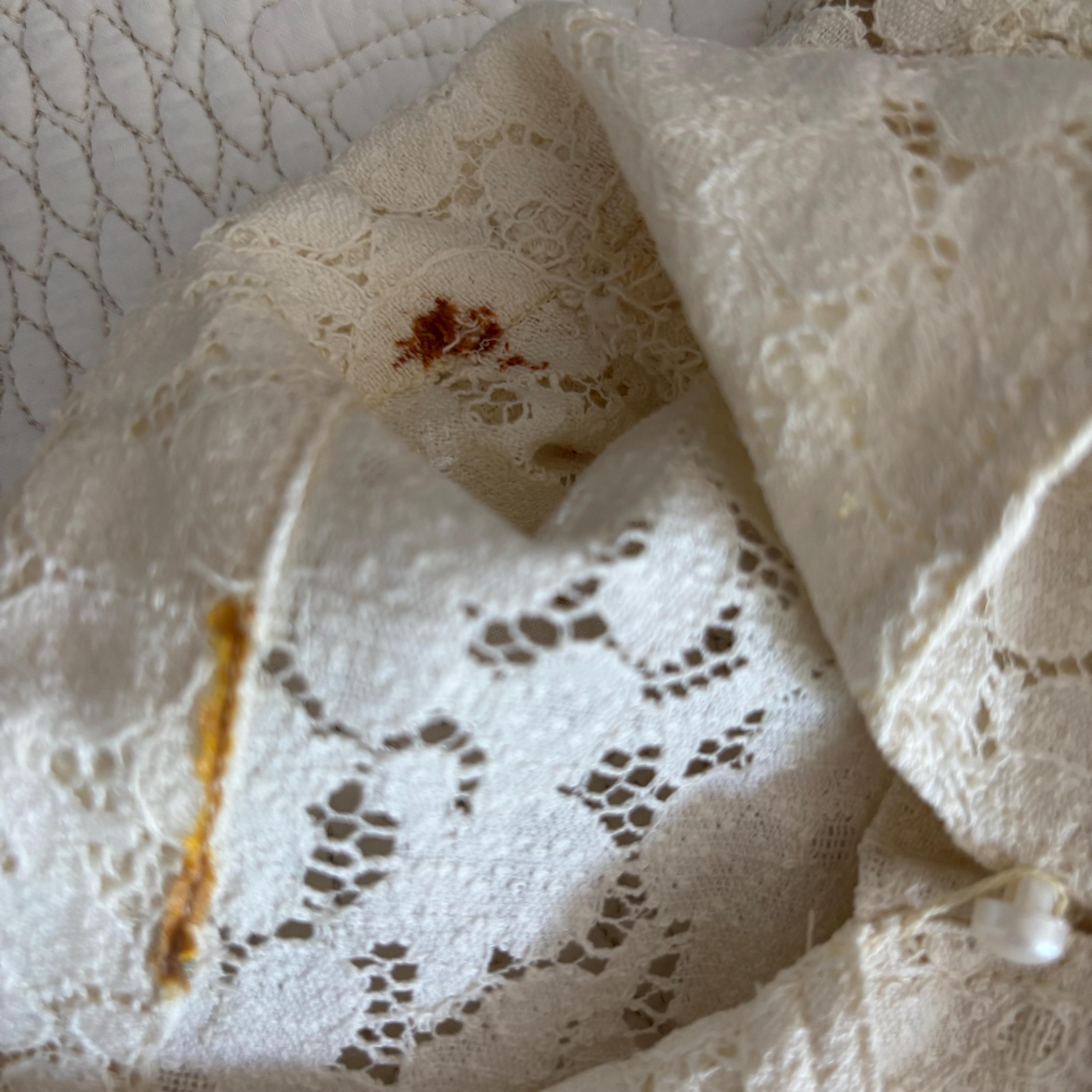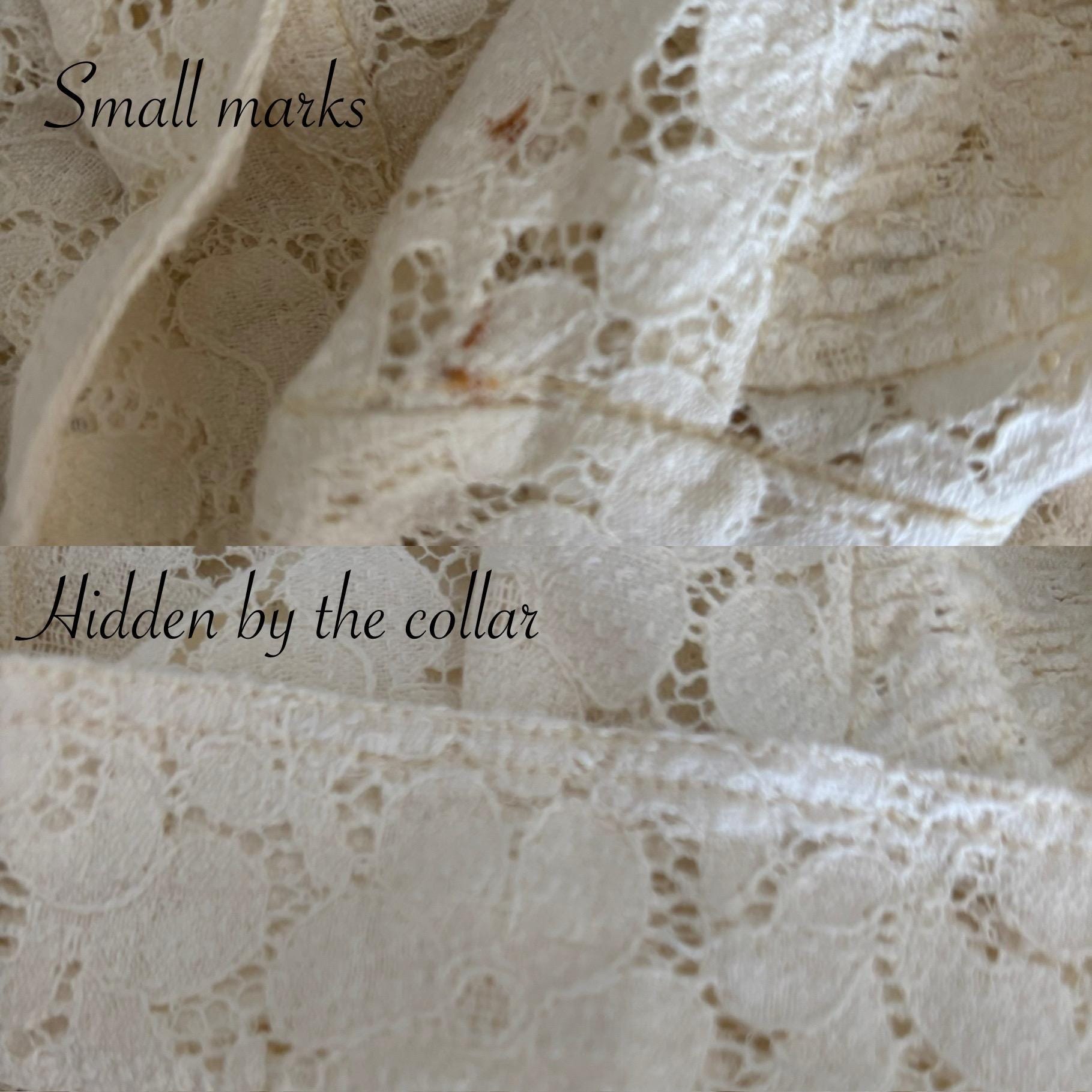Vintage, very good condition. There are two marks on the inner collar which cannot be seen when worn. They look like rust marks from a wire hanger. One mark does show through a bit on the outside of the dress, but this is hidden by the collar. I have included a split photo of the mark before, and after, with the collar in place. It's worth mentioning that there are two slightly different shades of thread used in this dress. A cream thread that matches the lace, and a slightly darker thread. Perhaps the maker ran out of one shade whilst sewing the dress, or someone made some repairs at some point in time. Not a big deal, but I do like to be thorough. The dress presents beautifully, and is clean and ready to wear!