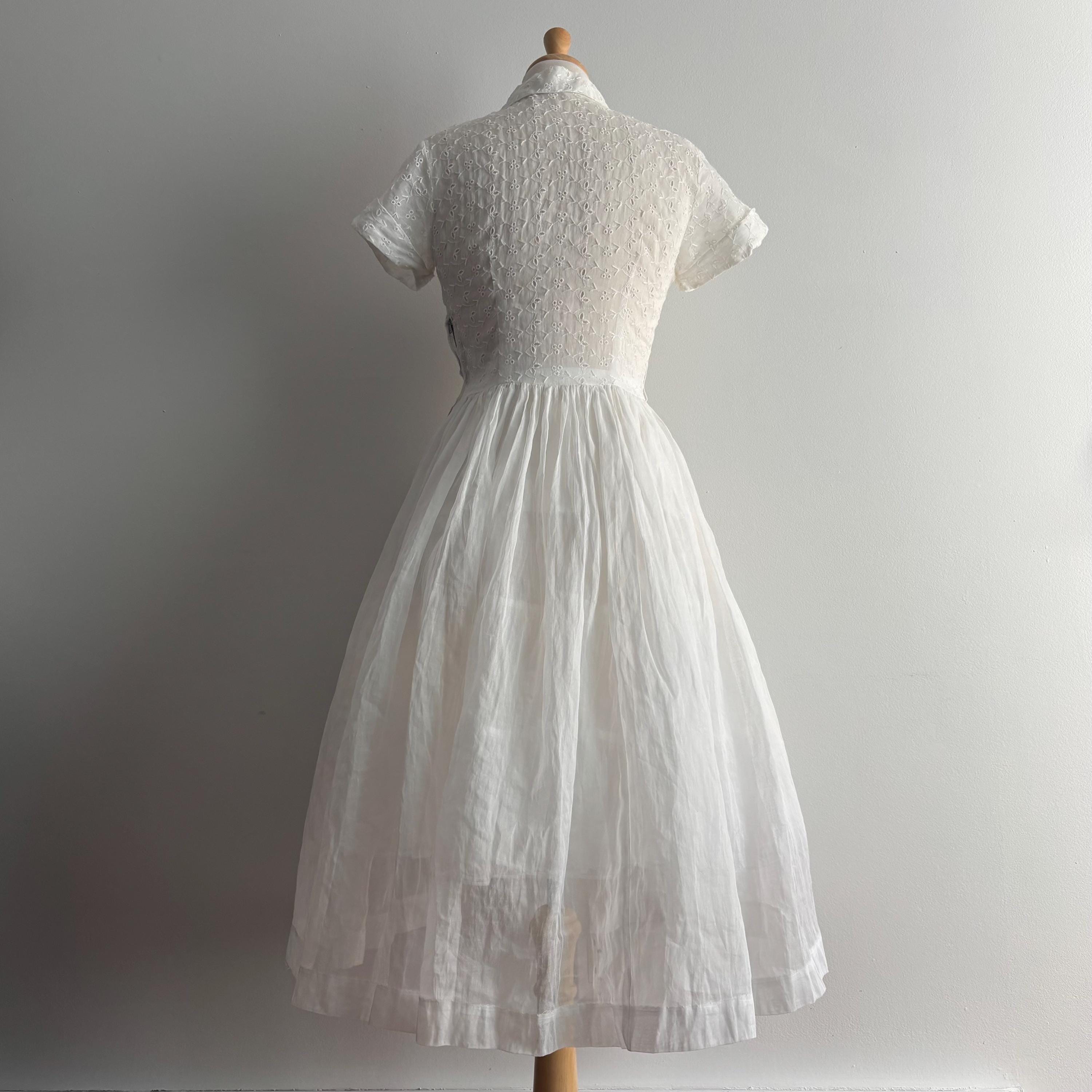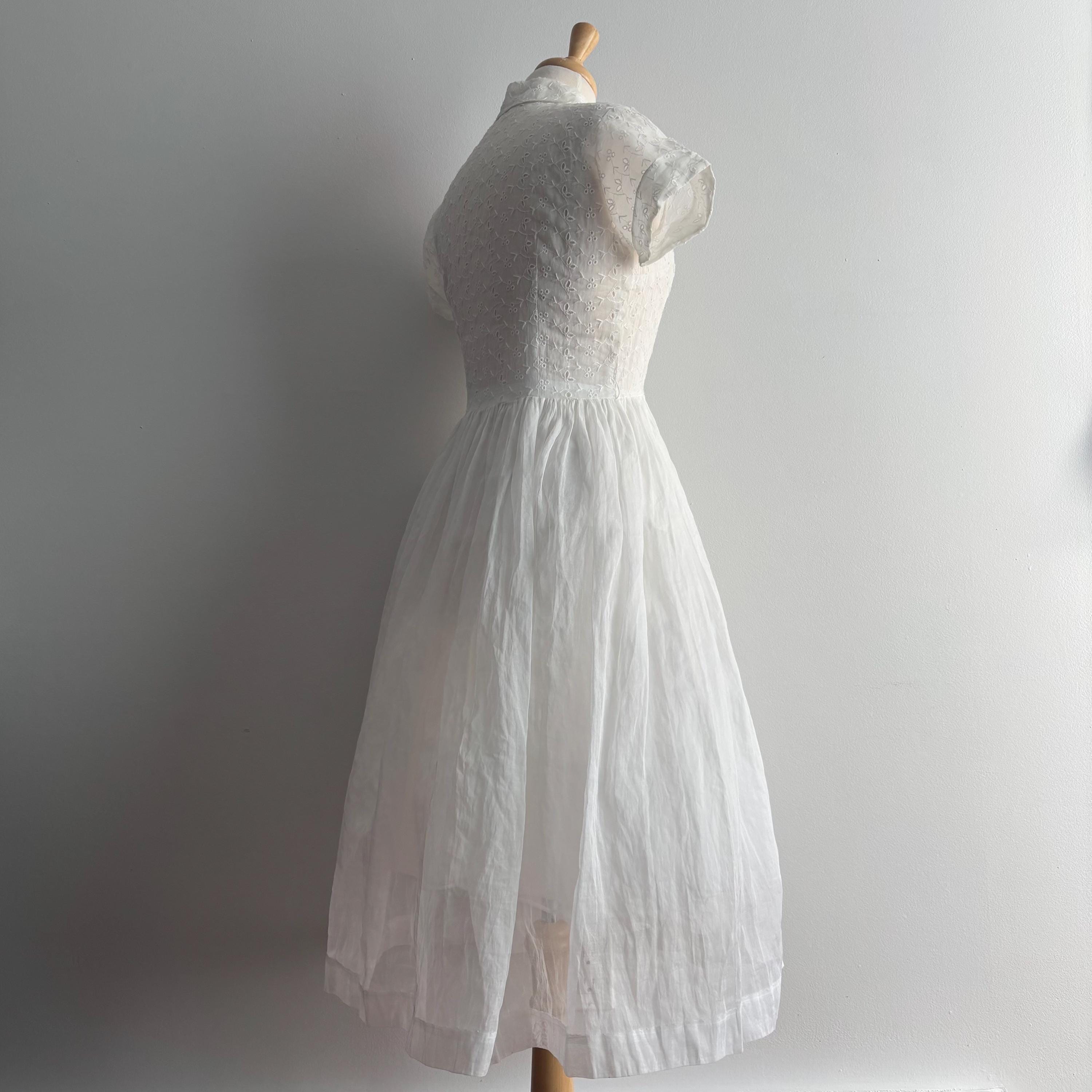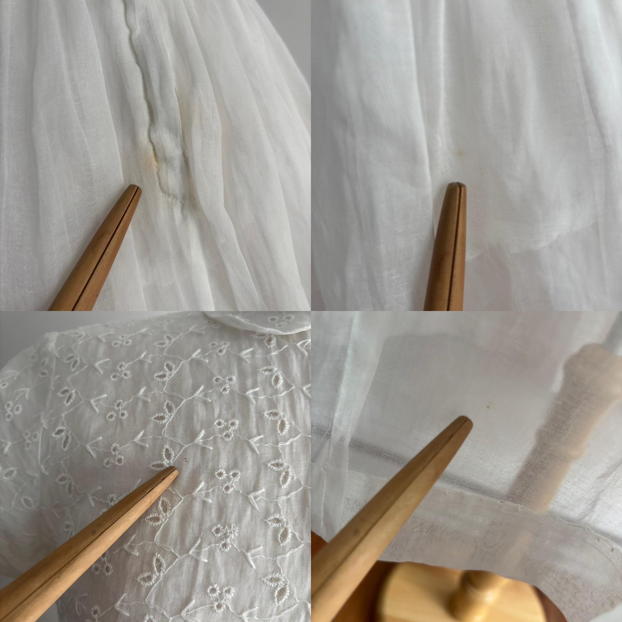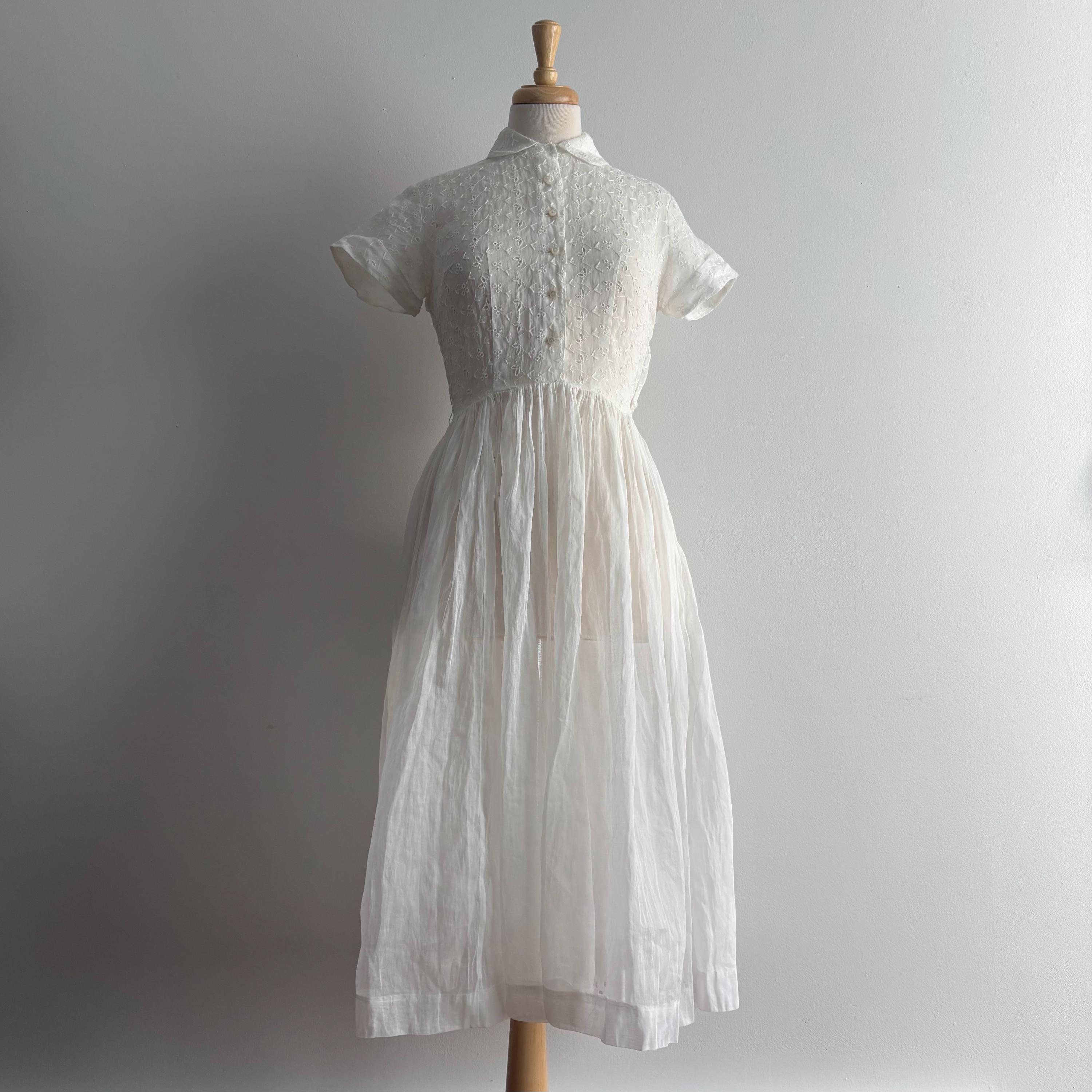 Vintage, good condition overall, with notes: There are a few little spots or marks that I have photographed. The most significant being a faint mark near the base of the zipper. This manages to stay hidden in the folds of the skirt. There are a couple of other very small spots, as you can see in the photos. One on the upper chest, which looks to me like a brooch or corsage was pinned there and the metal discoloured the fabric where the pin pierced the fabric. Once a few inches below that, a very faint small mark. The other two are very tiny spots on the skirt, as pictured. No underarm discolouration. The dress has been revived to a nice bright white, the buttons re-stitched firmly into place, and has very minimal wear for a 75 year old dress. Such a beauty!