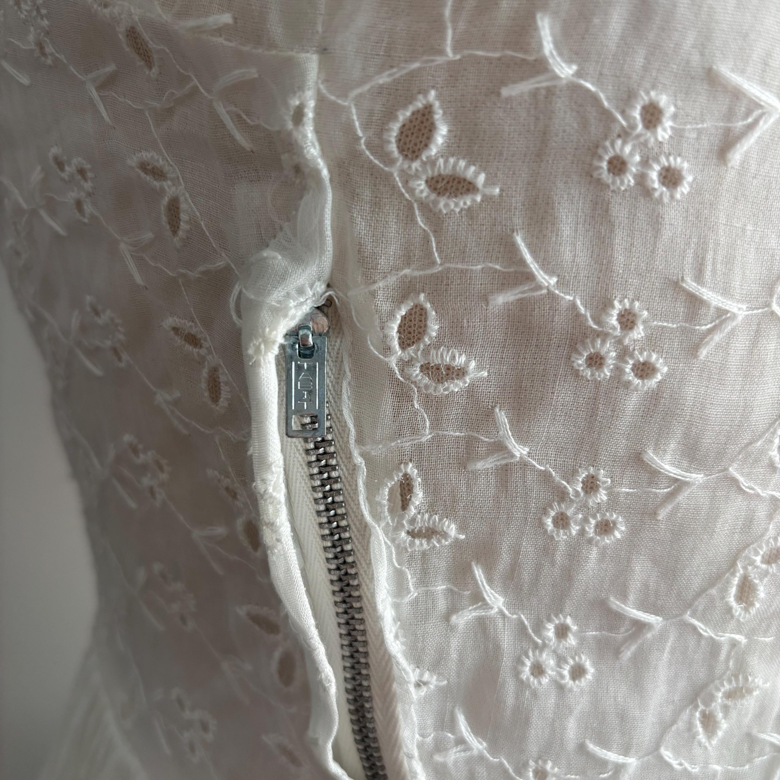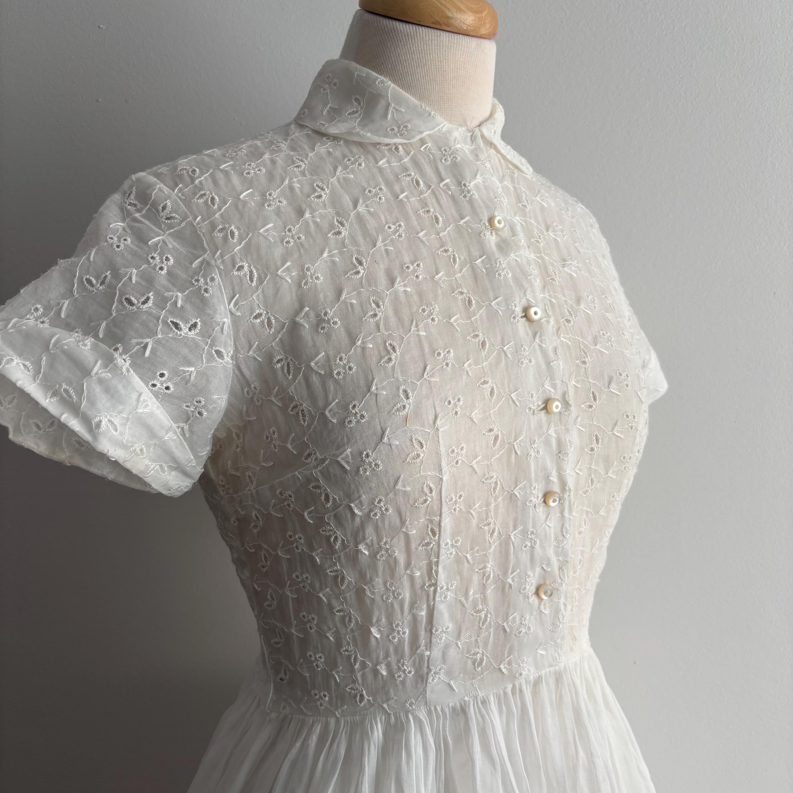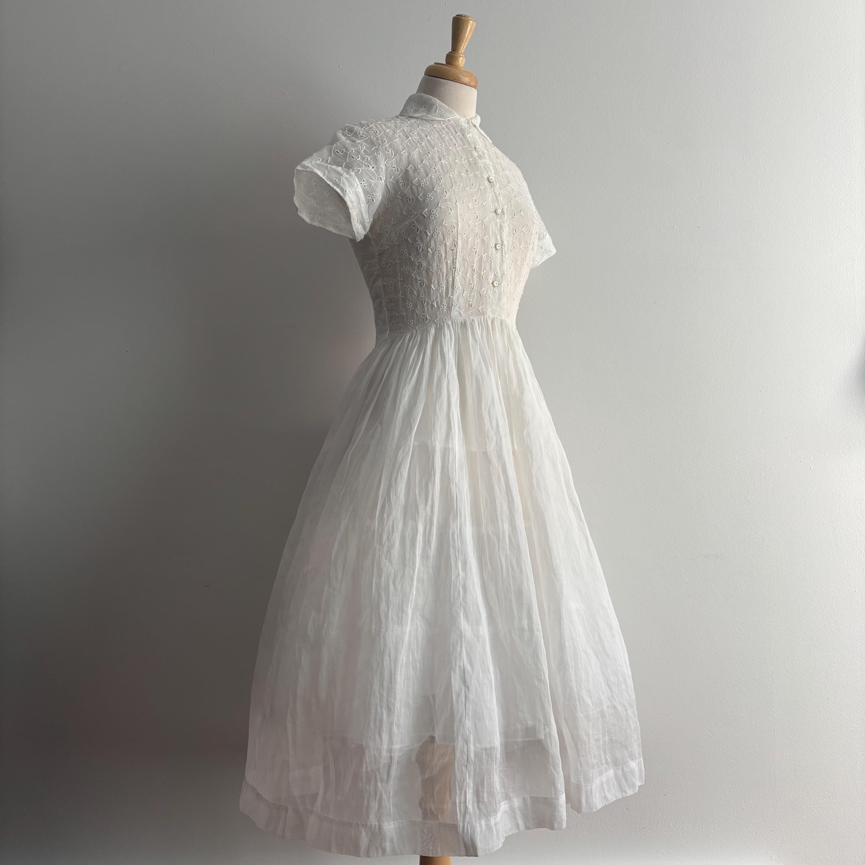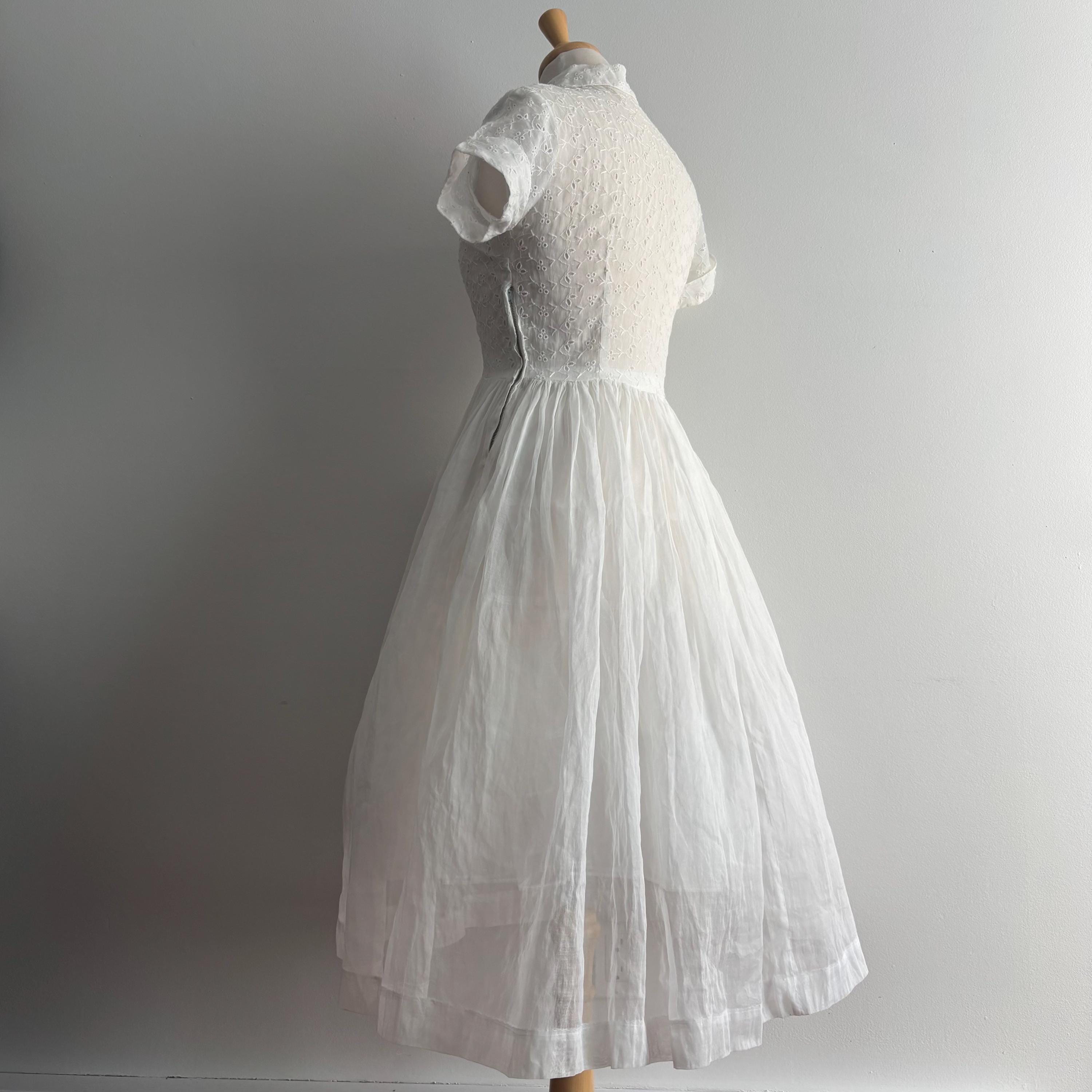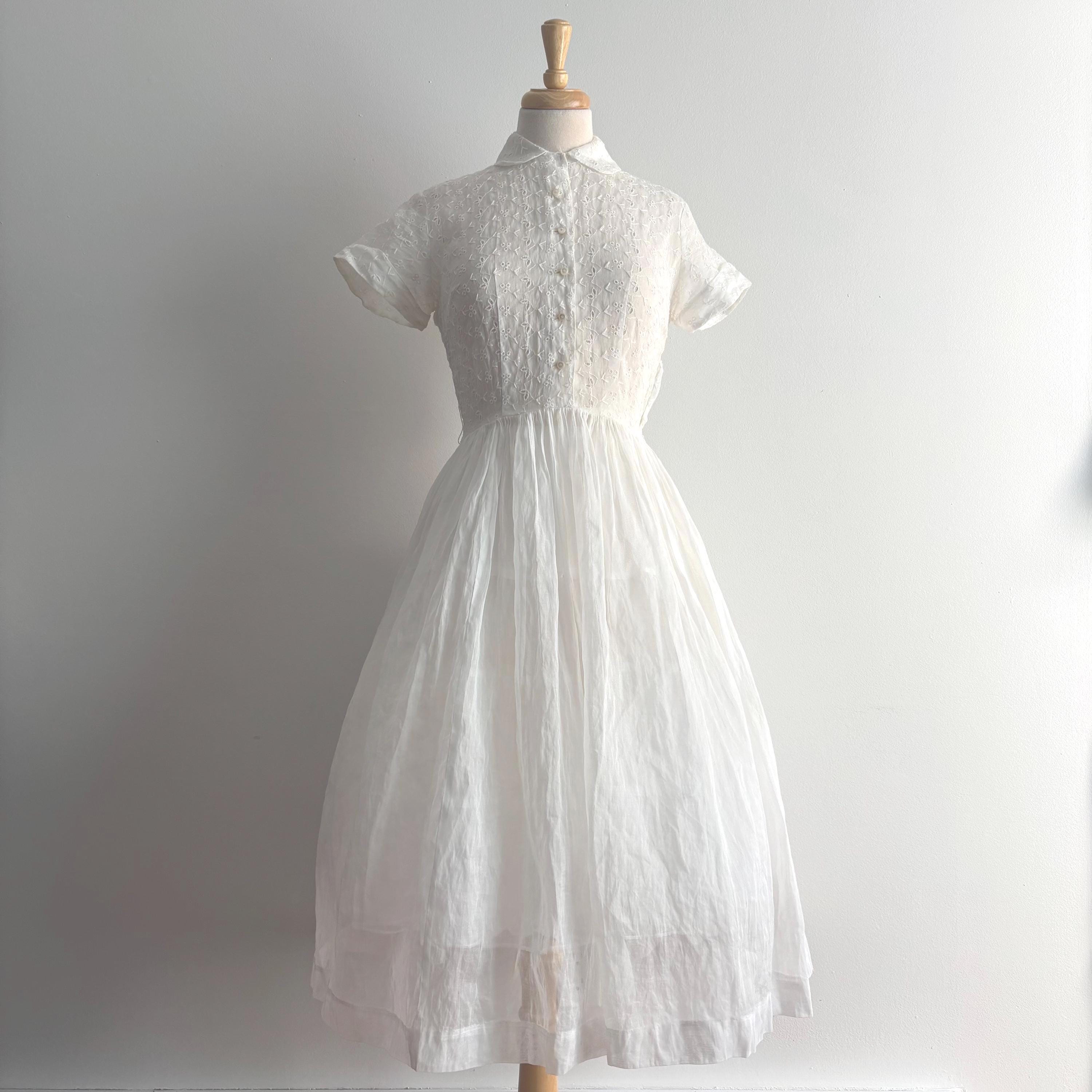Vintage, good condition overall, with notes: There are a few little spots or marks that I have photographed. The most significant being a faint mark near the base of the zipper. This manages to stay hidden in the folds of the skirt. There are a couple of other very small spots, as you can see in the photos. One on the upper chest, which looks to me like a brooch or corsage was pinned there and the metal discoloured the fabric where the pin pierced the fabric. Once a few inches below that, a very faint small mark. The other two are very tiny spots on the skirt, as pictured. No underarm discolouration. The dress has been revived to a nice bright white, the buttons re-stitched firmly into place, and has very minimal wear for a 75 year old dress. Such a beauty!