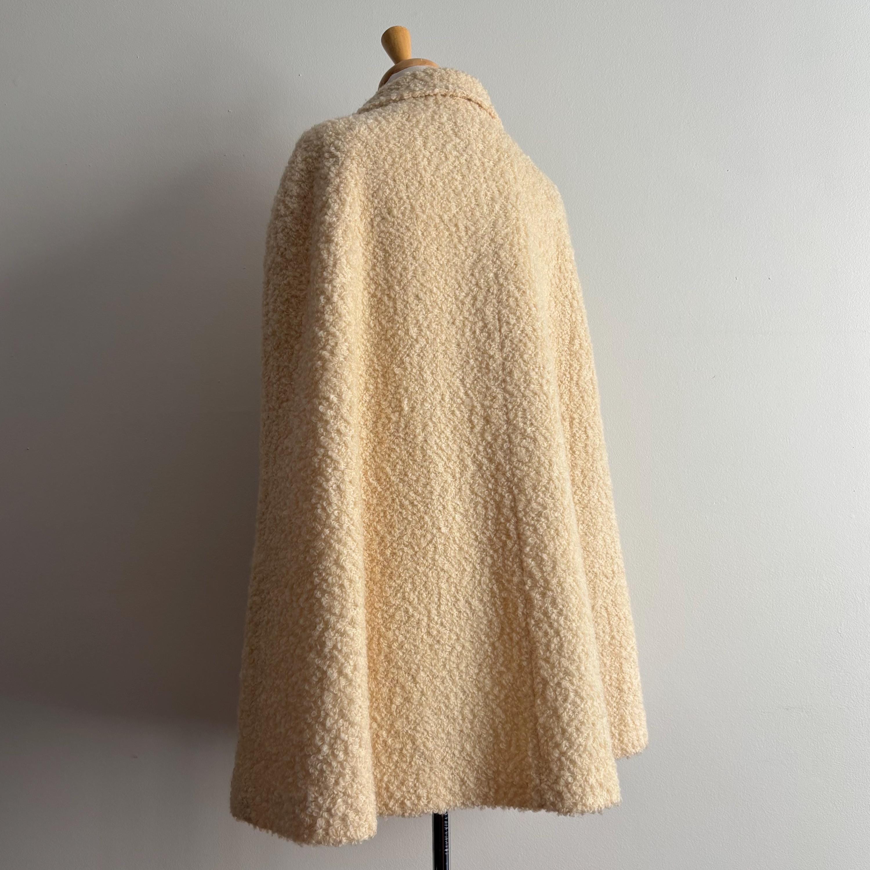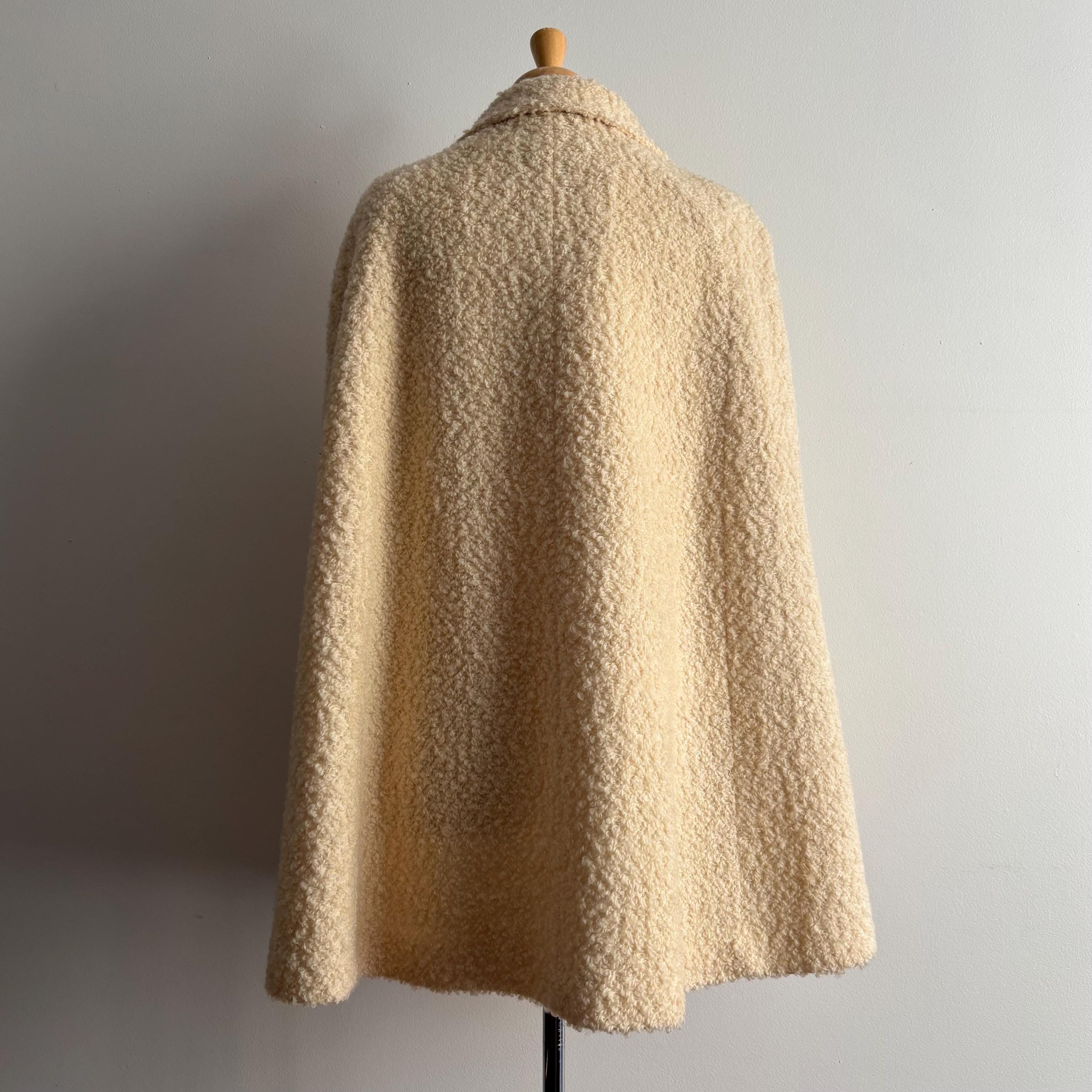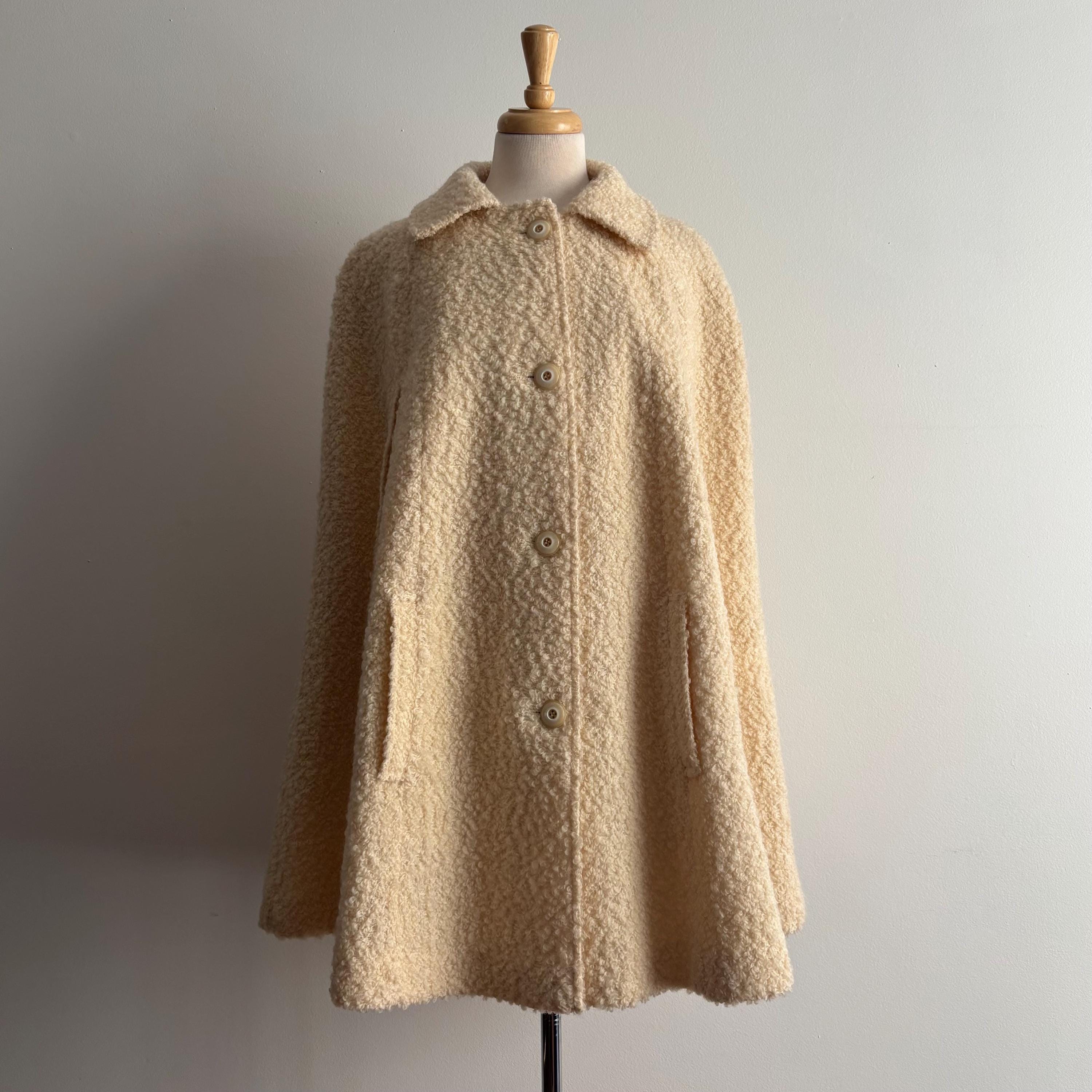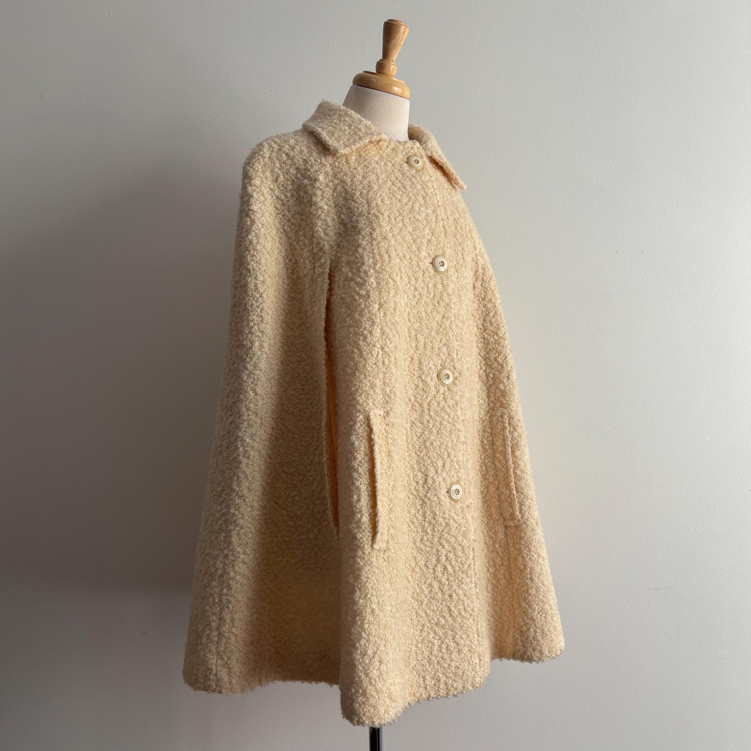 A gorgeous cream bouclé 1960's cape. Perfect for your fall and winter wanderings. Curly textured fabric, fully lined. The cape has a lovely collar, and buttons down the front with matching faux horn resin buttons. Yes, there are pockets! Sherwood of Ohio, size 6. Please see the measurements for best fit.