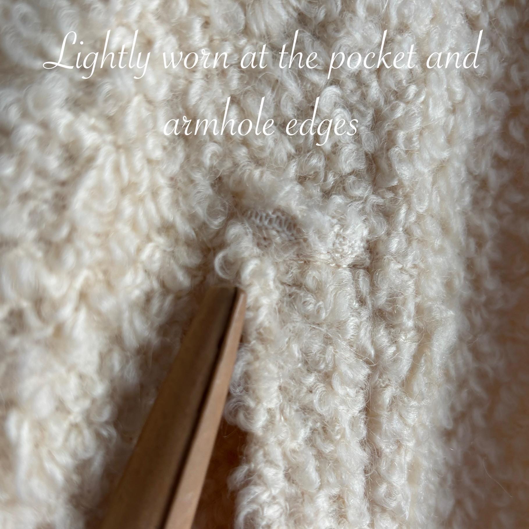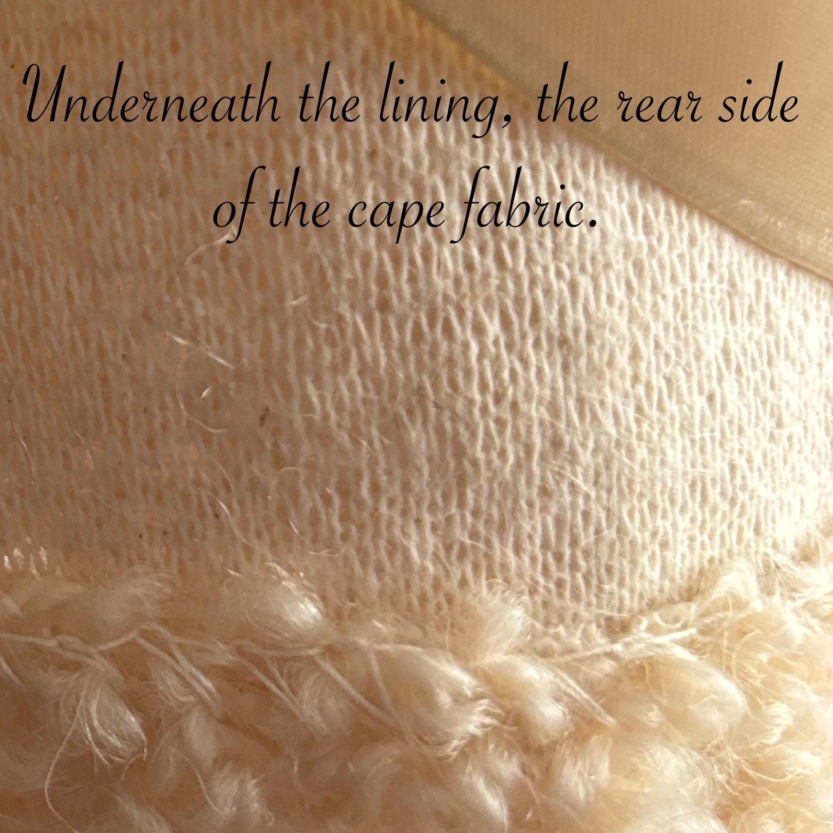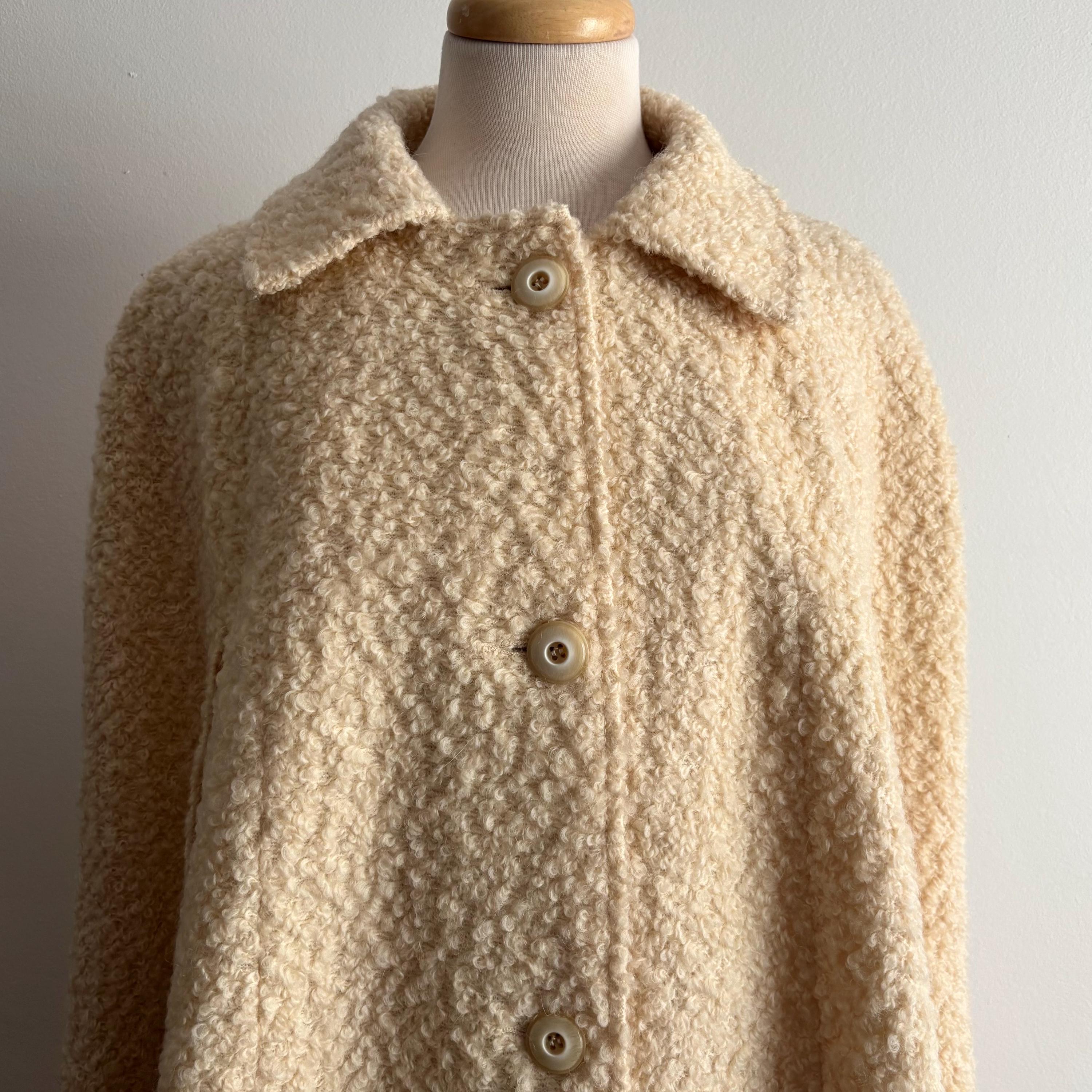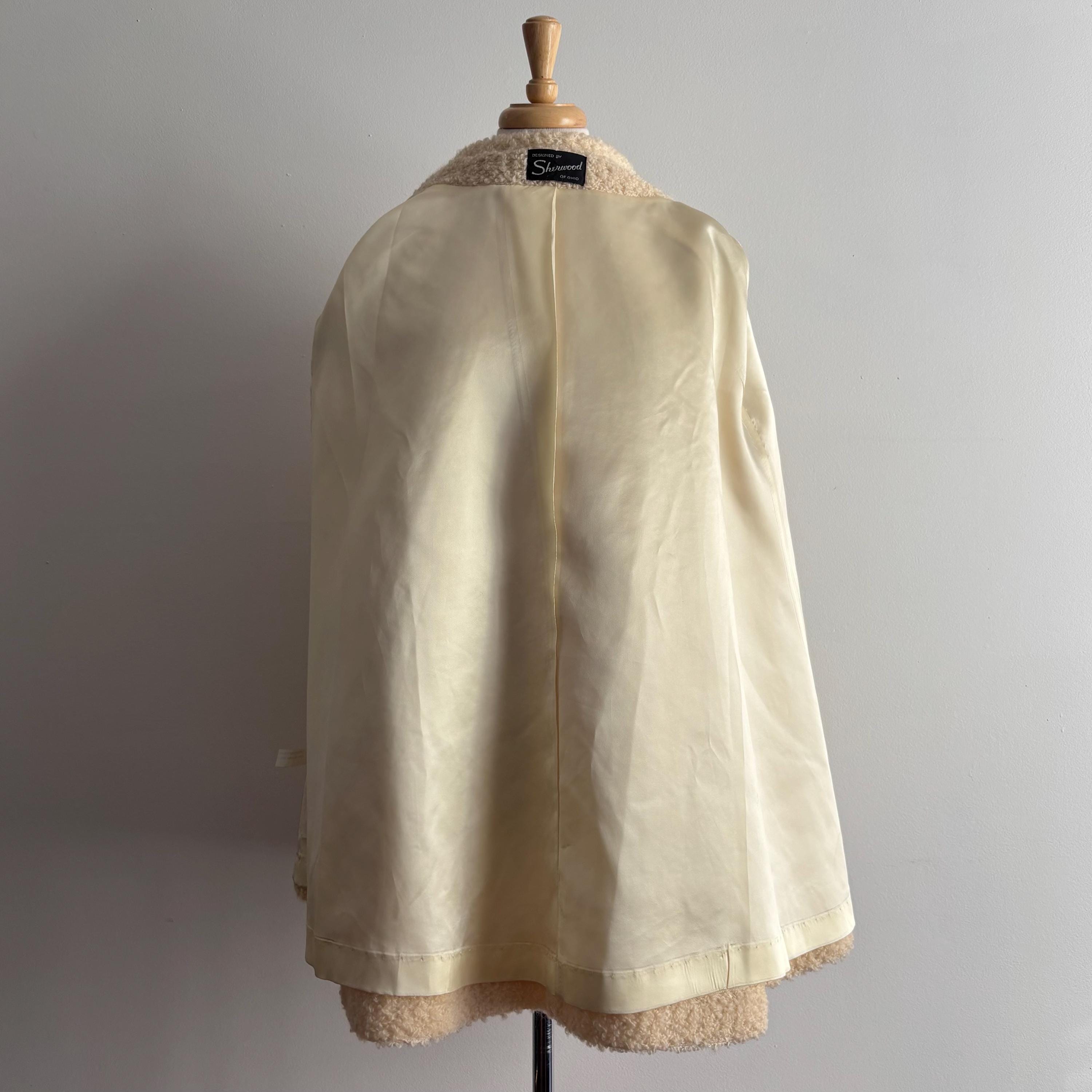 A gorgeous cream bouclé 1960's cape. Perfect for your fall and winter wanderings. Curly textured fabric, fully lined. The cape has a lovely collar, and buttons down the front with matching faux horn resin buttons. Yes, there are pockets! Sherwood of Ohio, size 6. Please see the measurements for best fit.