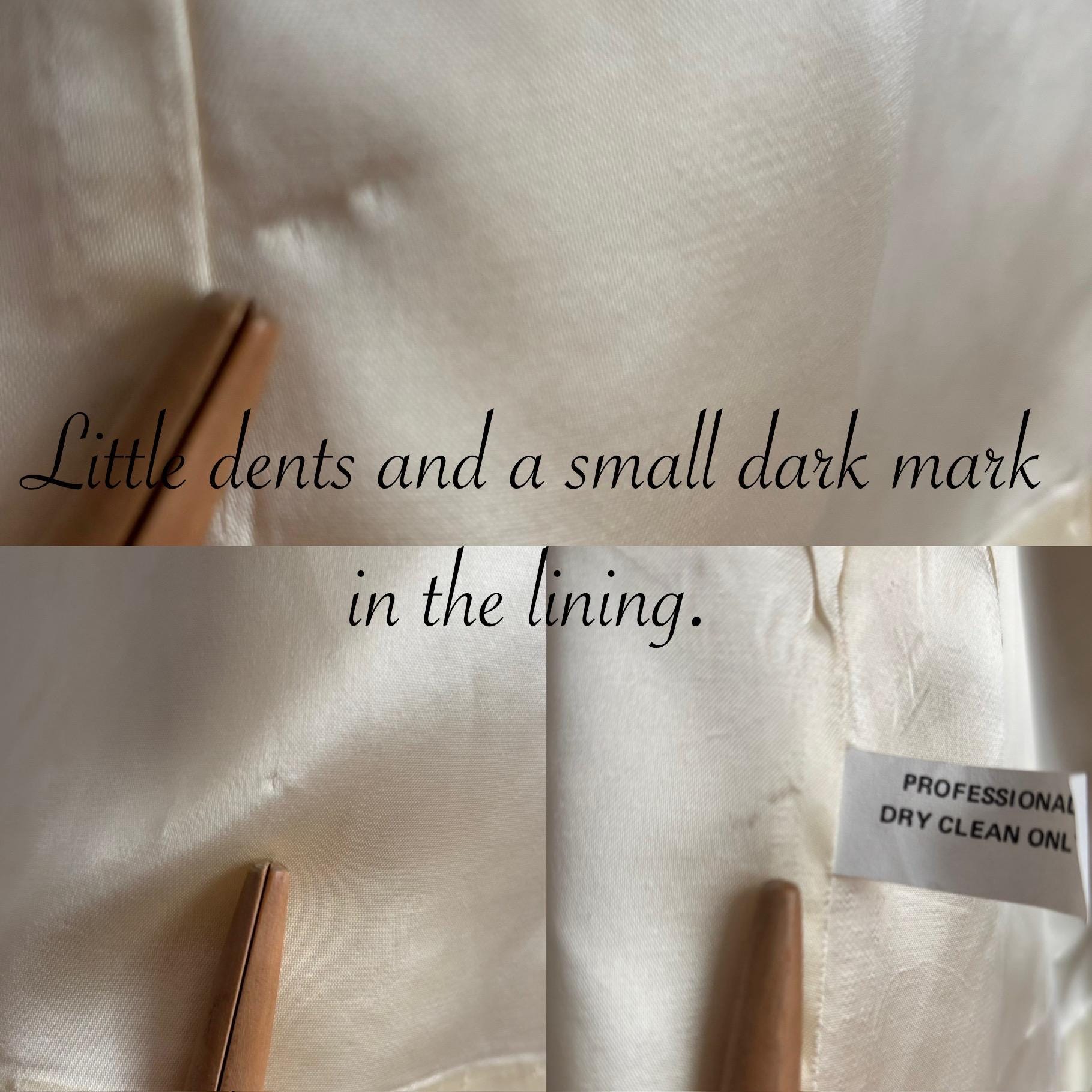 Vintage, very good condition, overall. There is some light wear at the edges of the pocket seams. The lining has a couple of small spots, all as pictured. Otherwise, excellent! Clean and ready to wear.