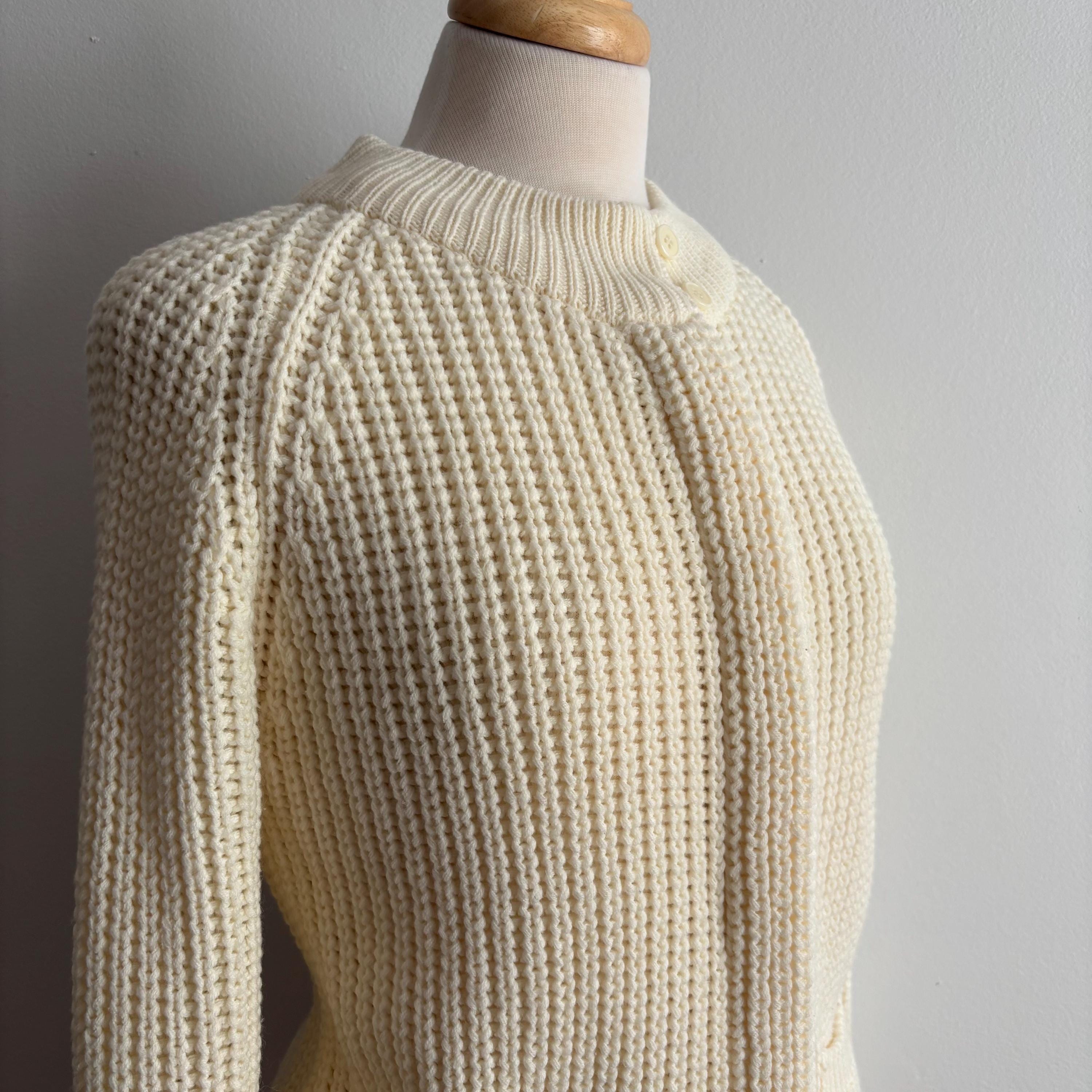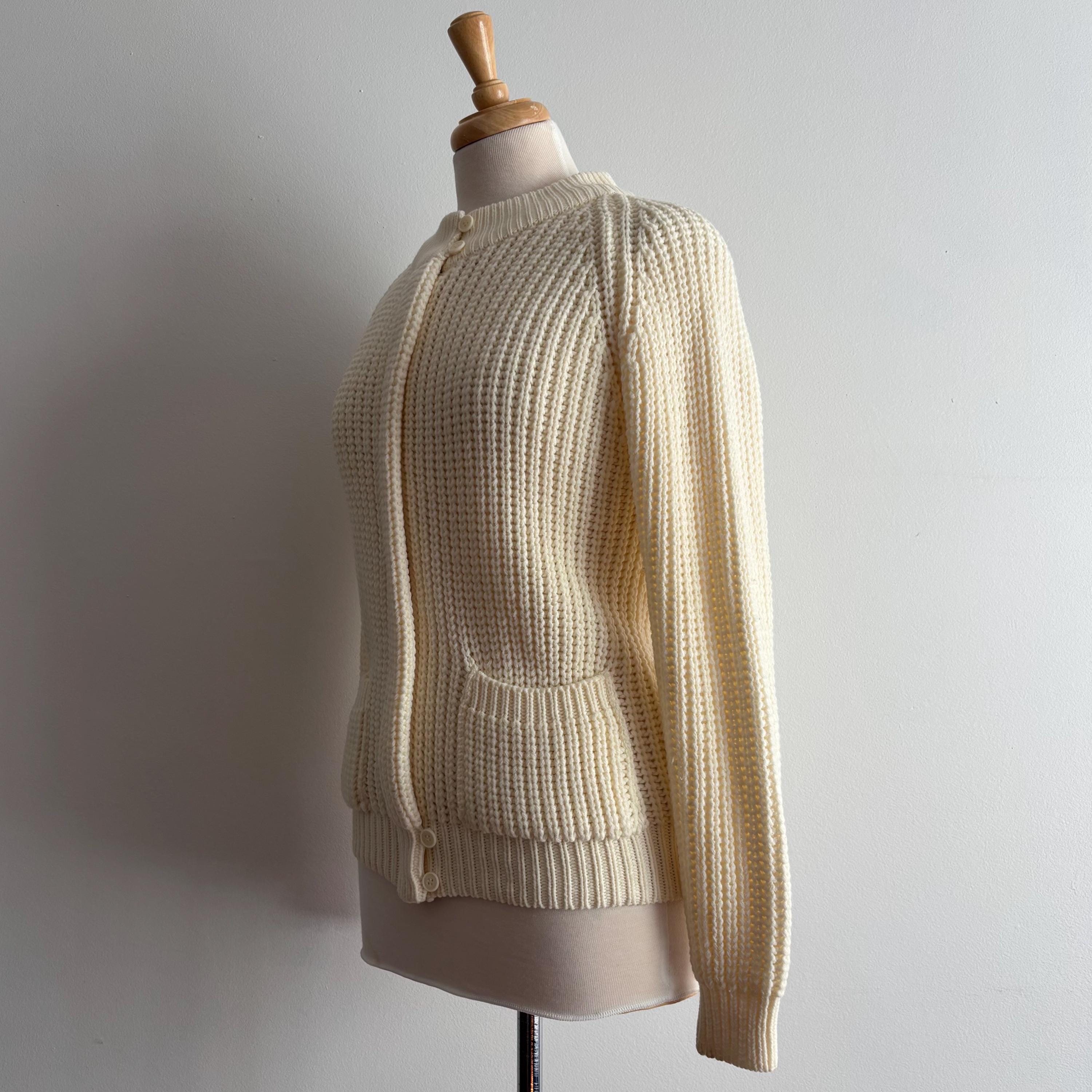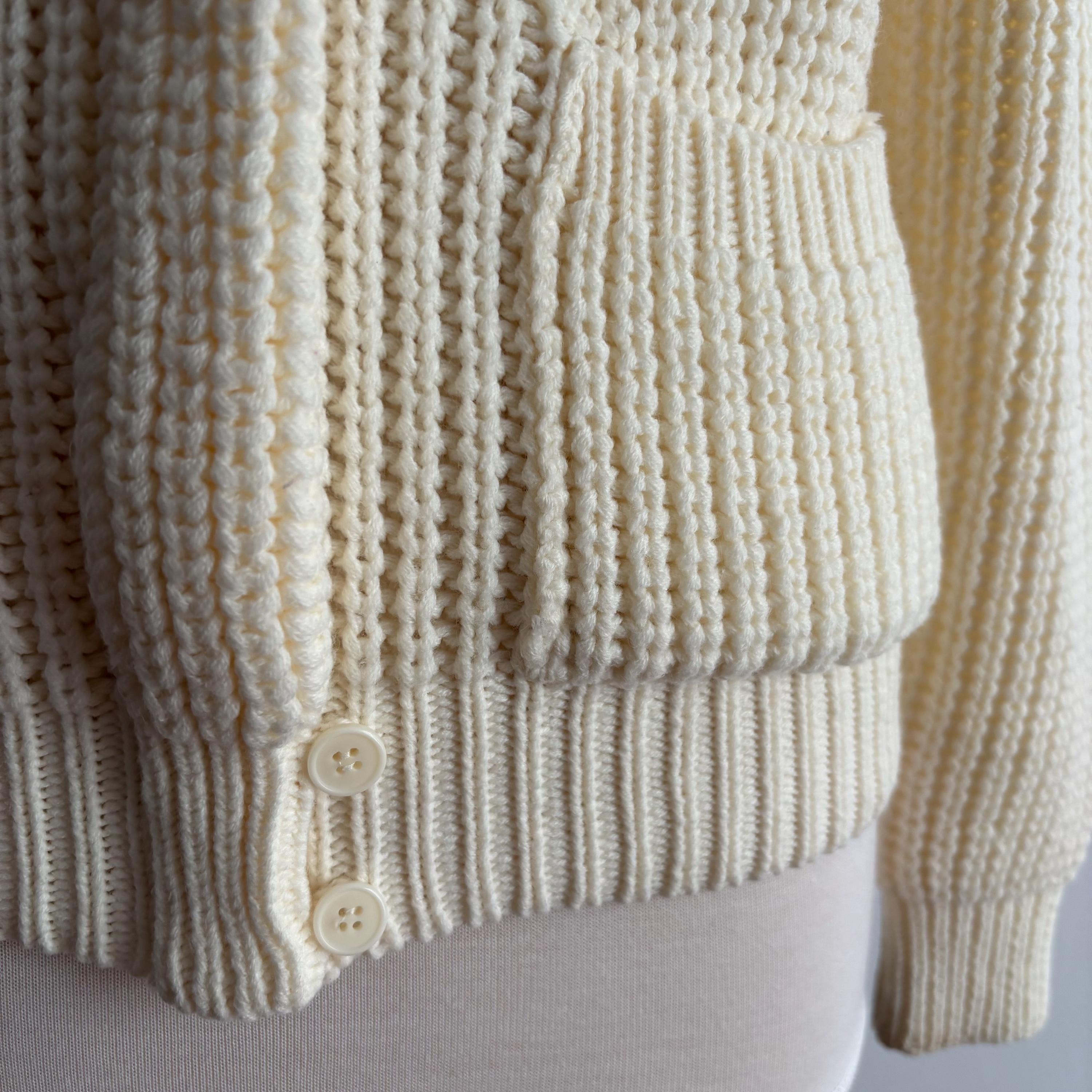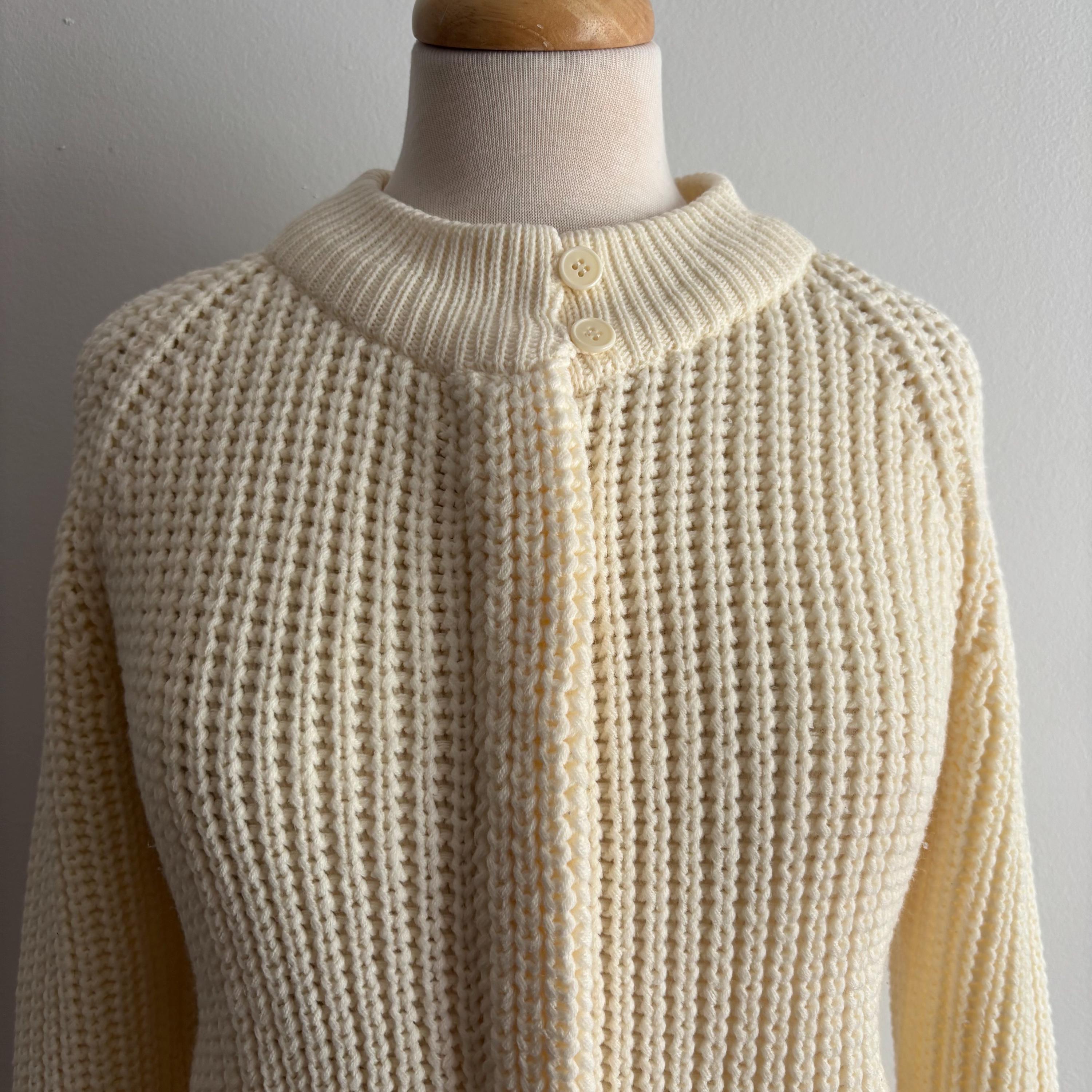 A good and cozy zip-up cardigan. The 80's sweater is made of an ivory acrylic yarn, with a nylon zipper, and matching buttons at the collar and waist. Long sleeves, and two front pockets to keep your hands warm. The perfect extra layer as the days get shorter and the nights cooler. 100% acrylic, Made in Korea. Size S. Please see the measurements for best fit.