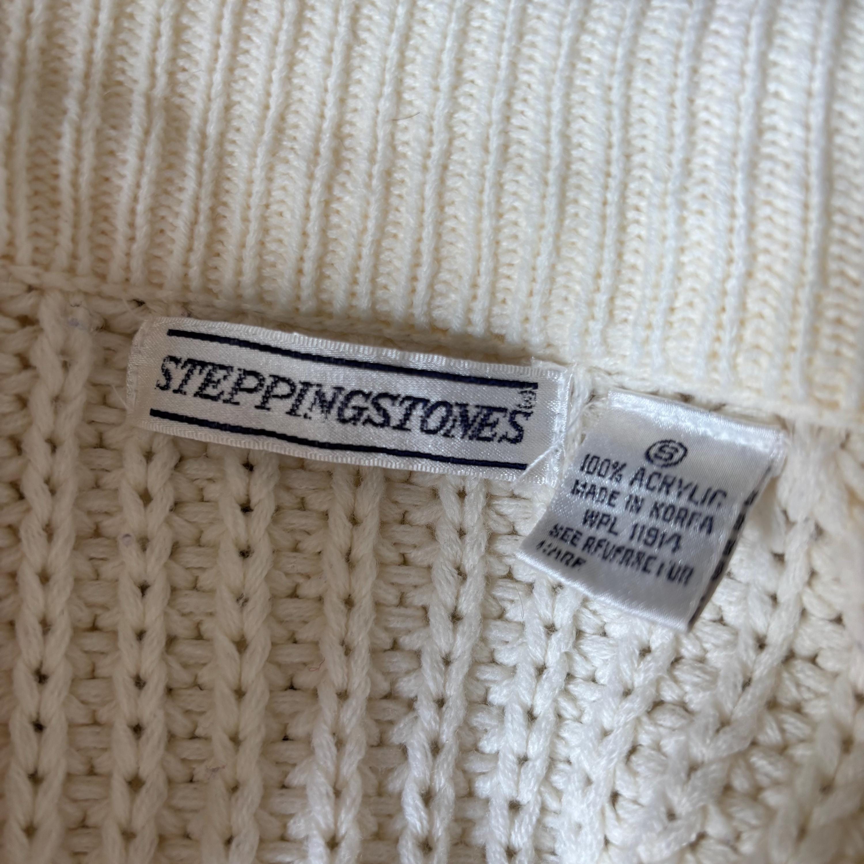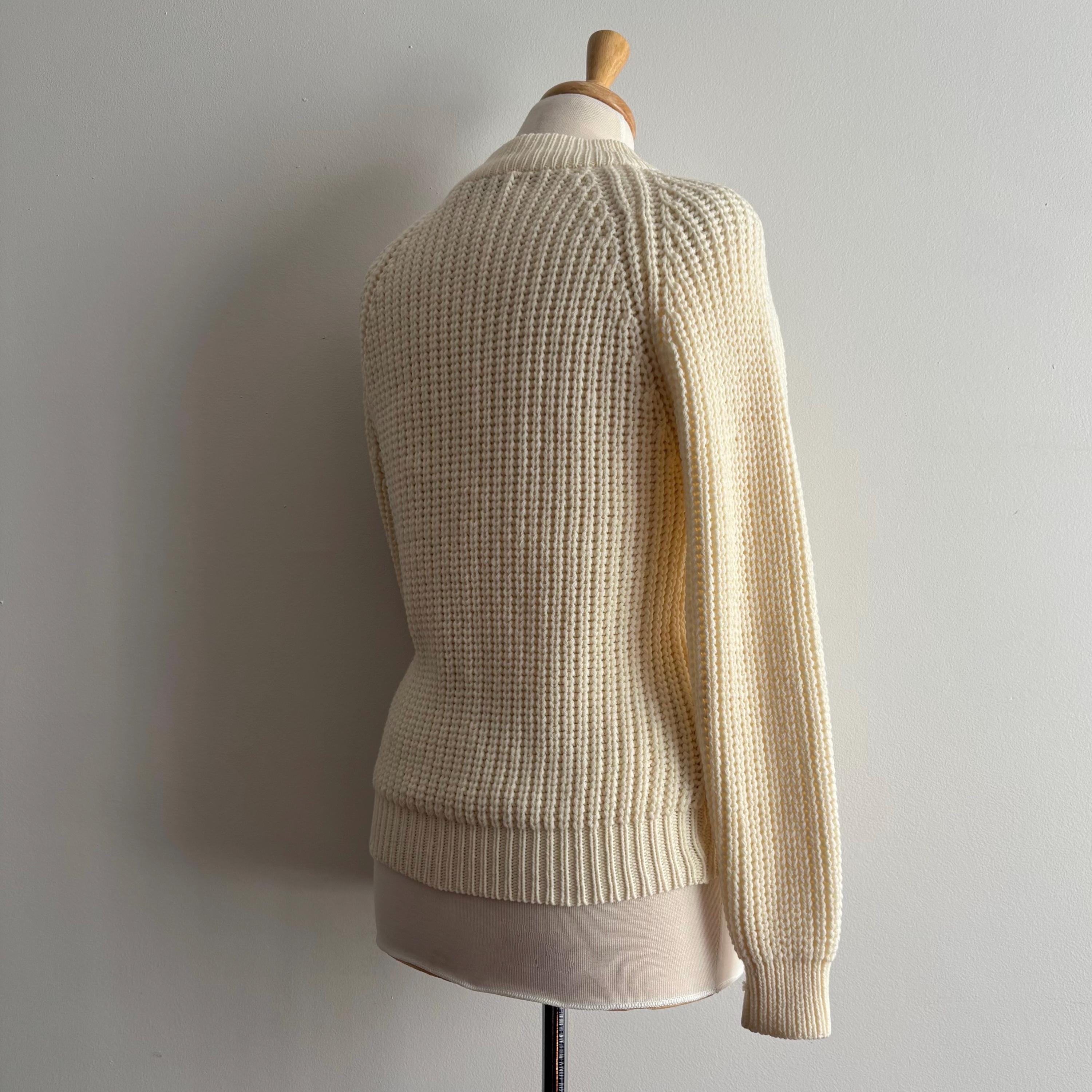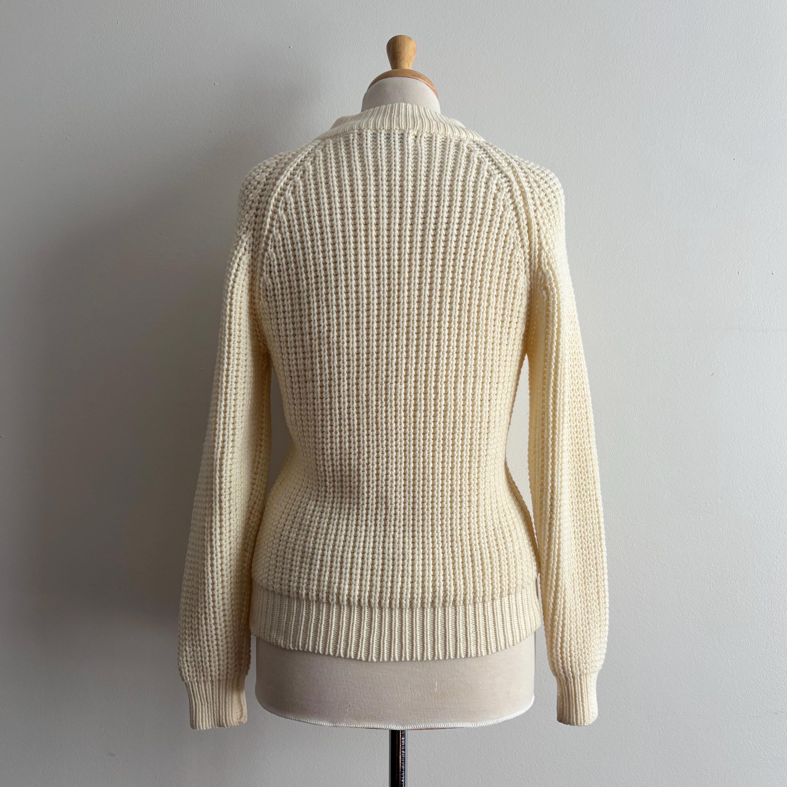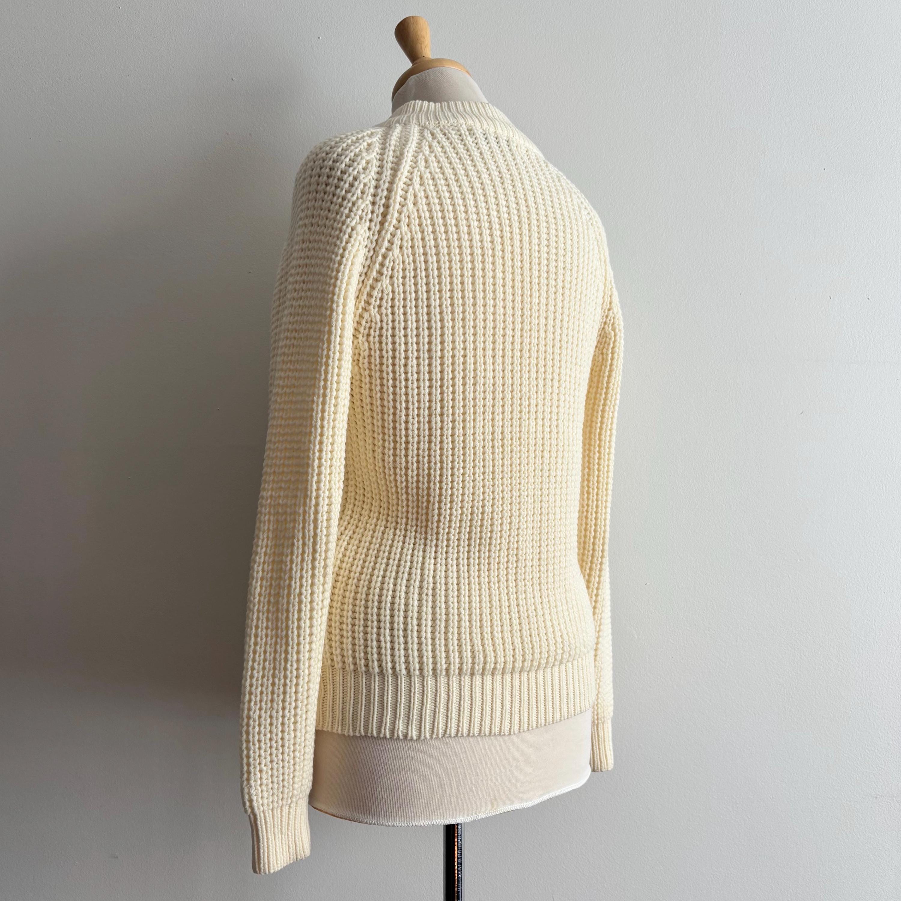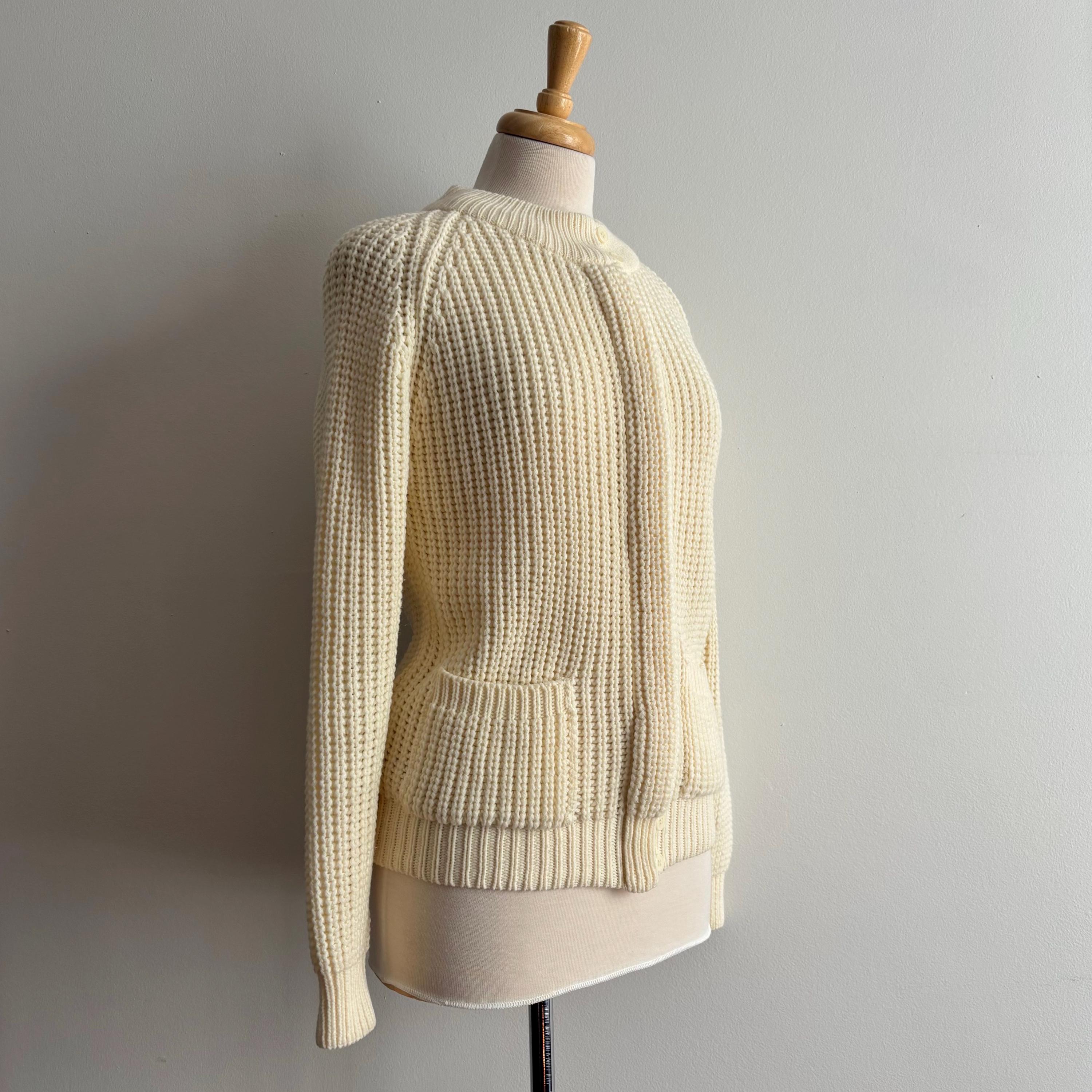 A good and cozy zip-up cardigan. The 80's sweater is made of an ivory acrylic yarn, with a nylon zipper, and matching buttons at the collar and waist. Long sleeves, and two front pockets to keep your hands warm. The perfect extra layer as the days get shorter and the nights cooler. 100% acrylic, Made in Korea. Size S. Please see the measurements for best fit.