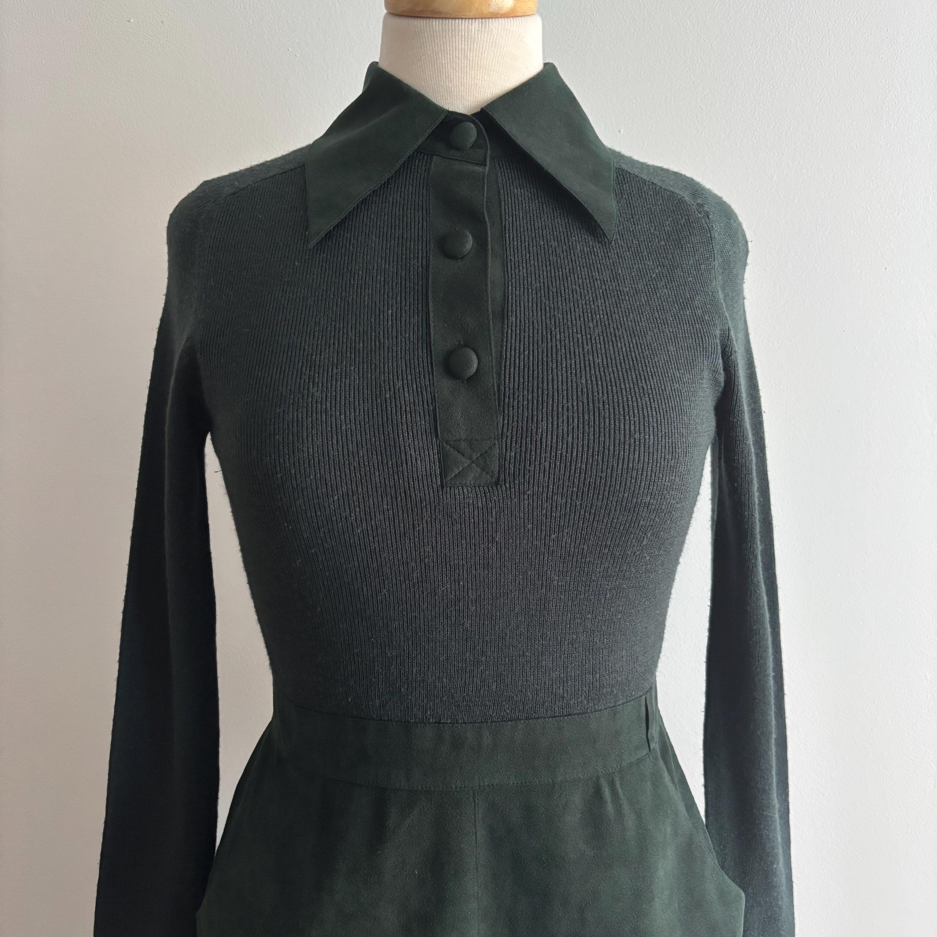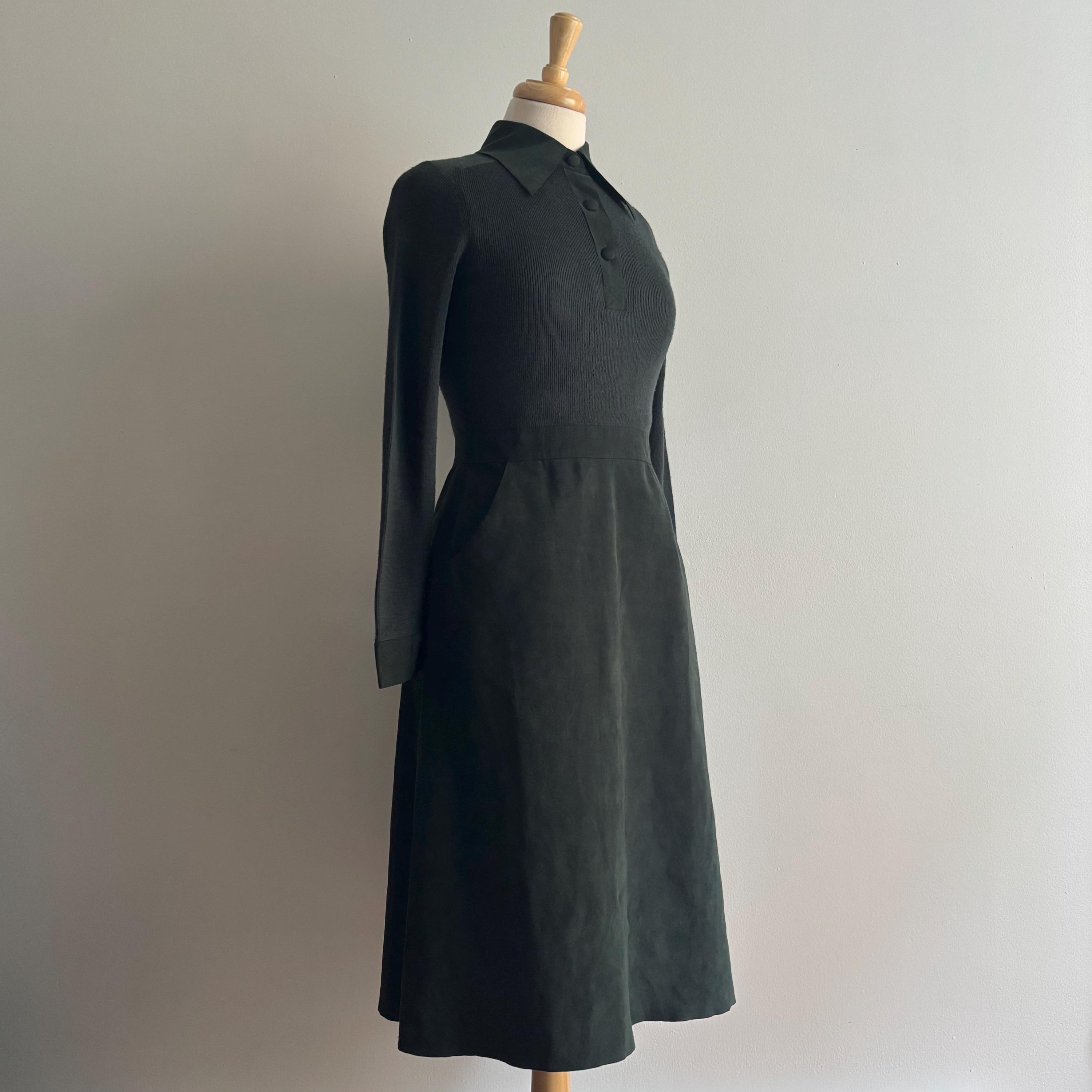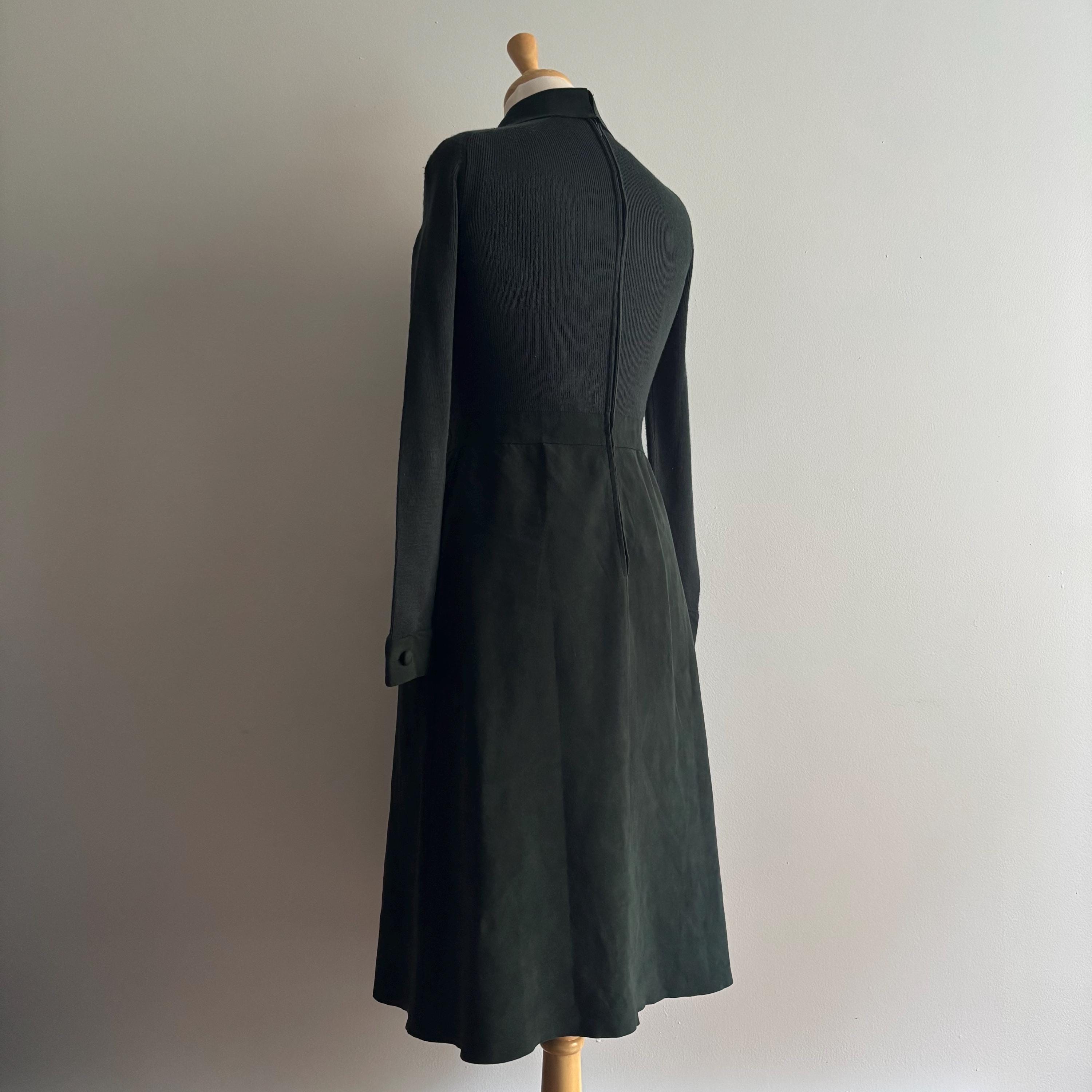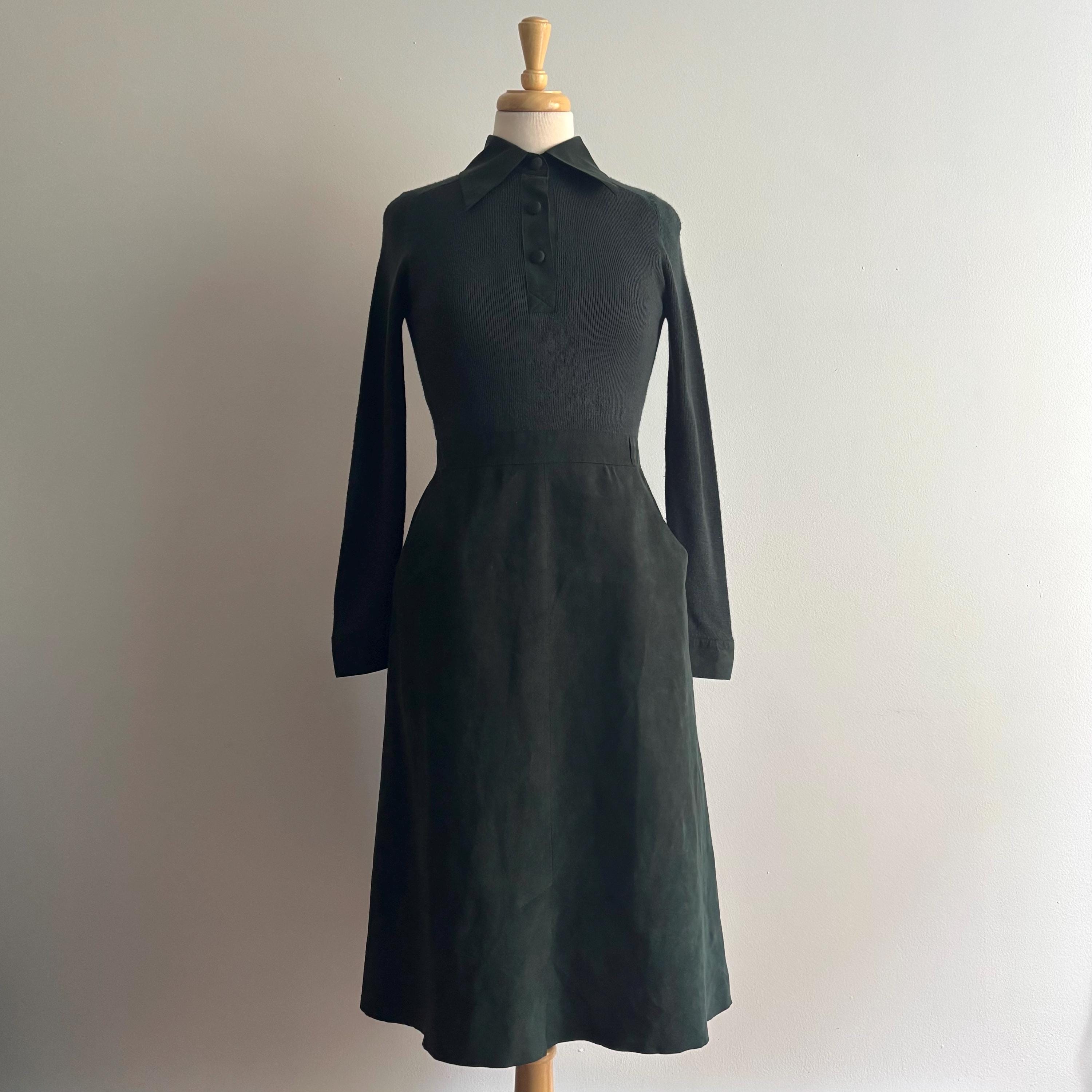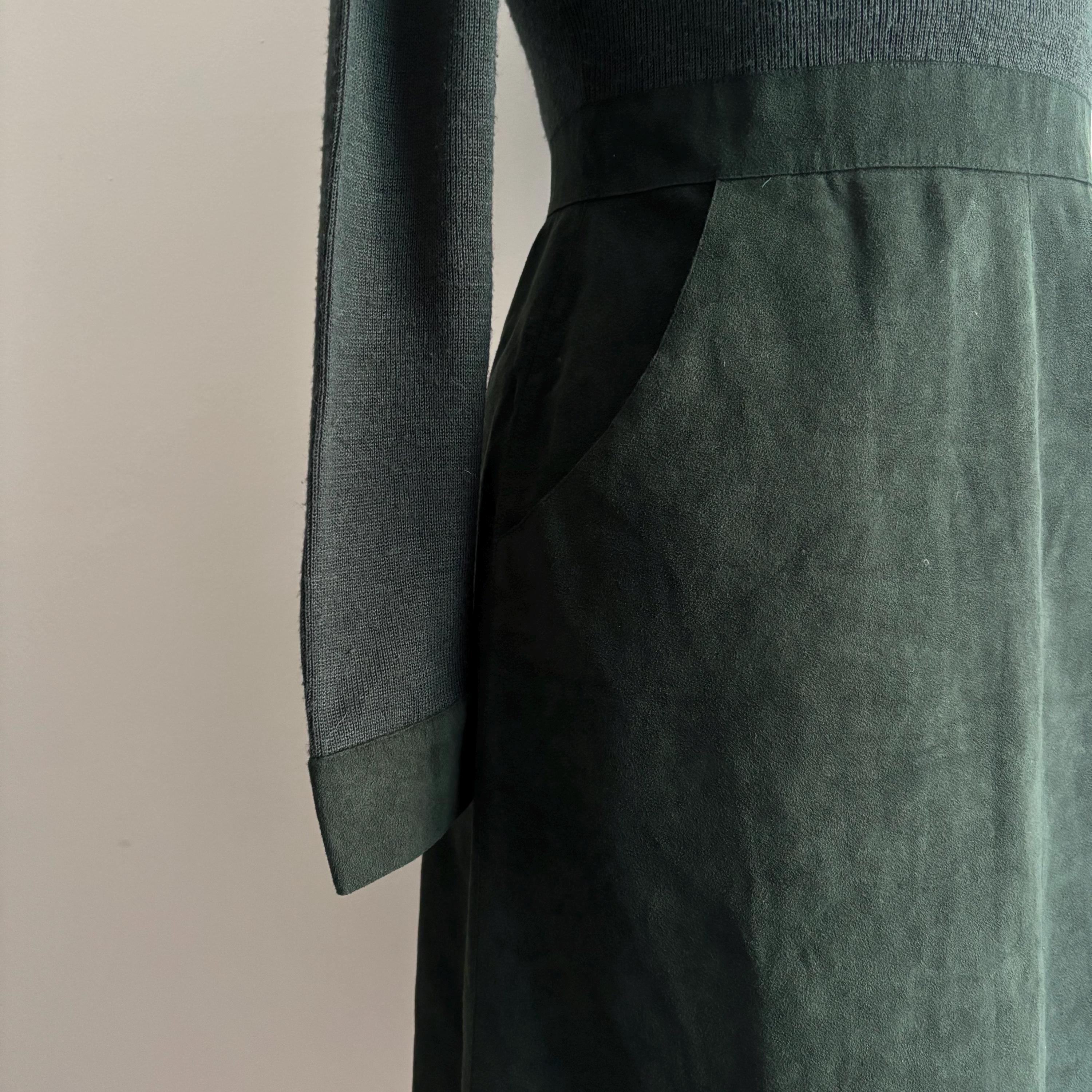 A beautiful, deep forest green dress! This 1970s dress has a lovely contrast in textures, with a fine rib knit top, accented by suede-like collar, cuffs, trims and skirt. The midi length skirt has a trompe l'oeil belt effect (though no real belt or belt loops) and a pocket at either side. The top half of the dress is lined, except for the sleeves. While you could perhaps unbutton the front to slip in and out of it, the dress also conveniently zips up the back to close. The perfect dress for your autumn forest walks! 100% acrylic. Made in Hong Kong. Vintage size 8, so please see the measurements for best fit.