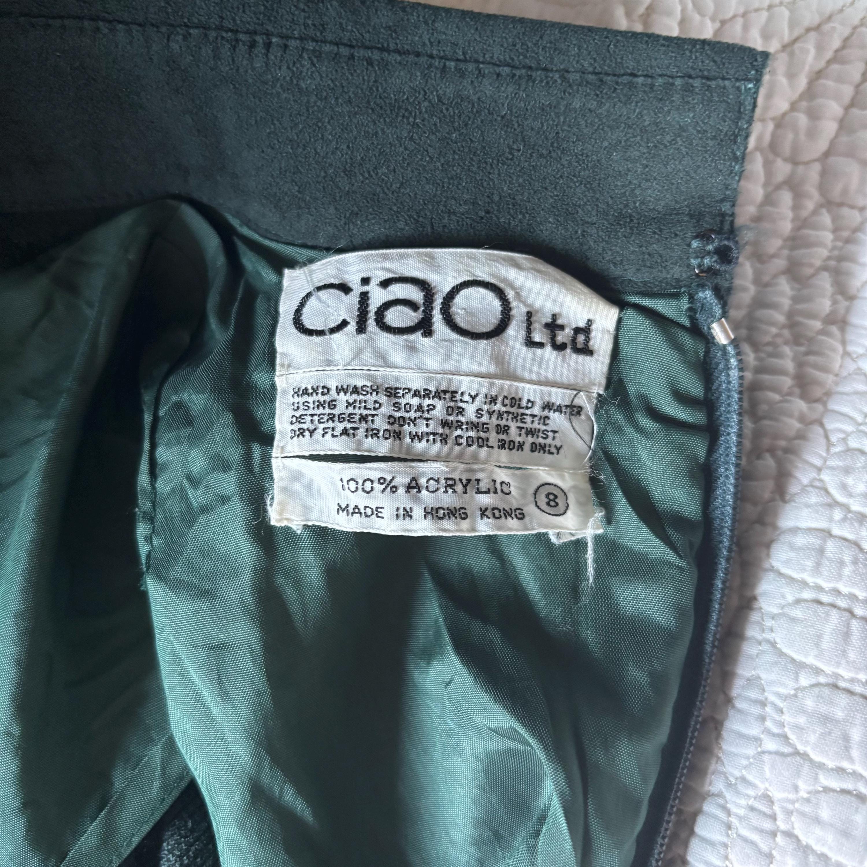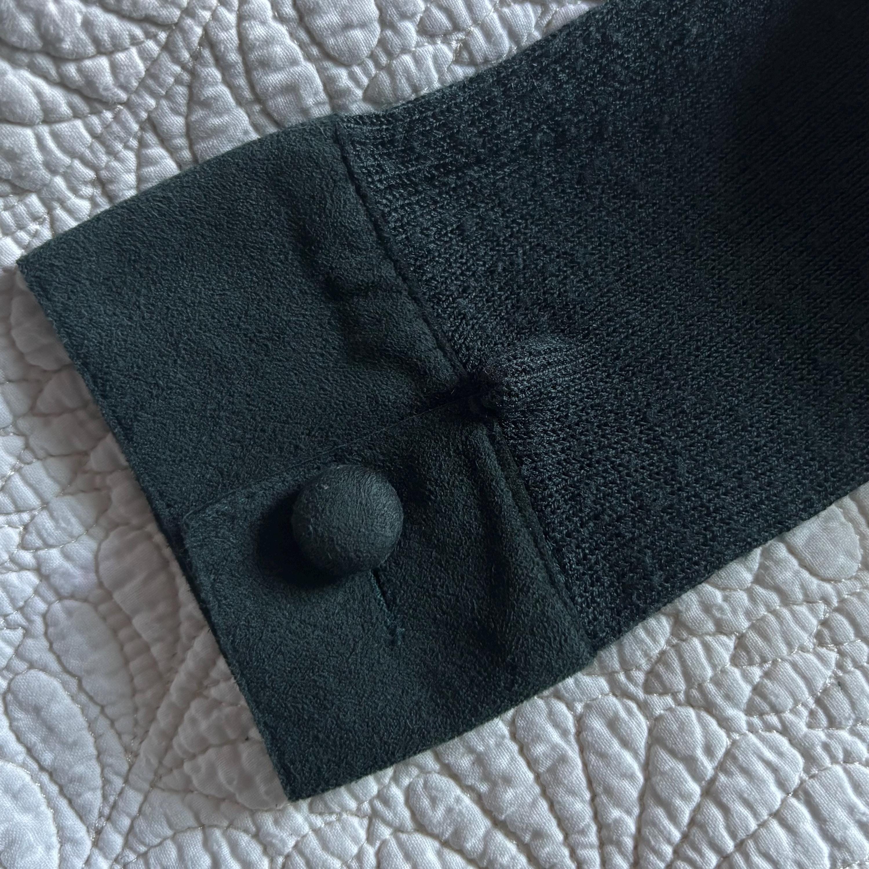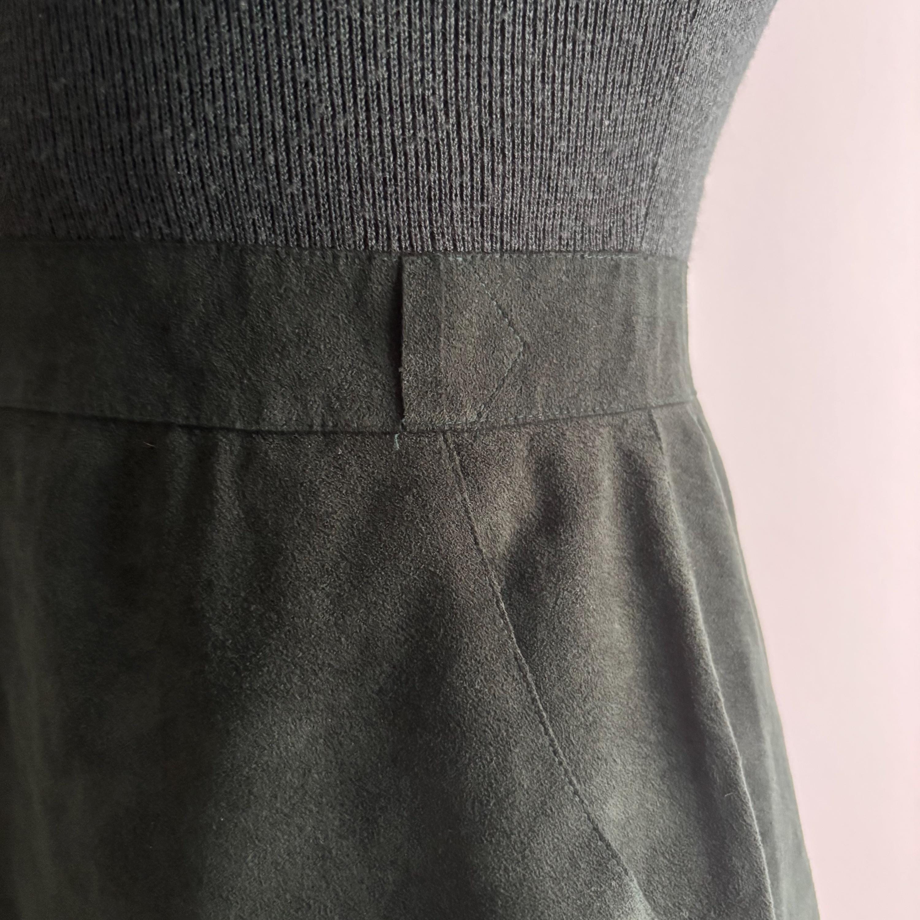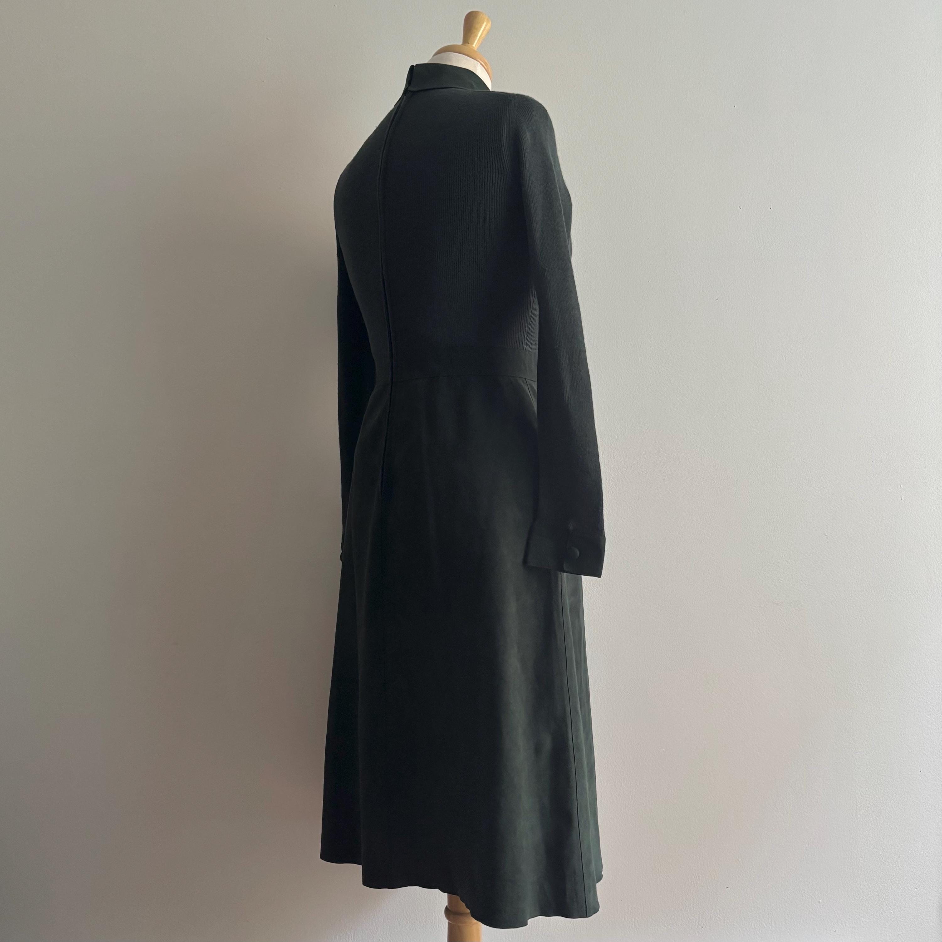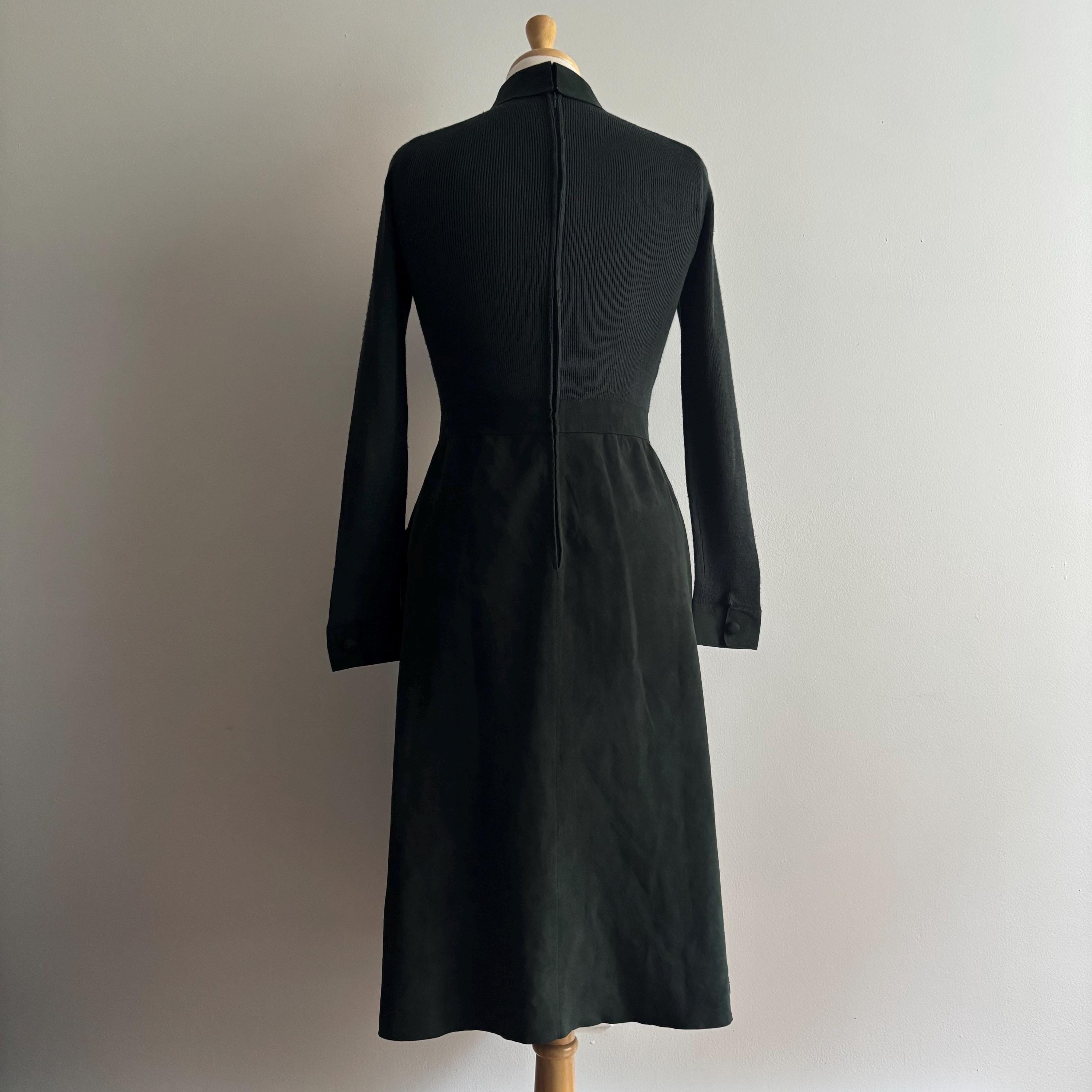 A beautiful, deep forest green dress! This 1970s dress has a lovely contrast in textures, with a fine rib knit top, accented by suede-like collar, cuffs, trims and skirt. The midi length skirt has a trompe l'oeil belt effect (though no real belt or belt loops) and a pocket at either side. The top half of the dress is lined, except for the sleeves. While you could perhaps unbutton the front to slip in and out of it, the dress also conveniently zips up the back to close. The perfect dress for your autumn forest walks! 100% acrylic. Made in Hong Kong. Vintage size 8, so please see the measurements for best fit.