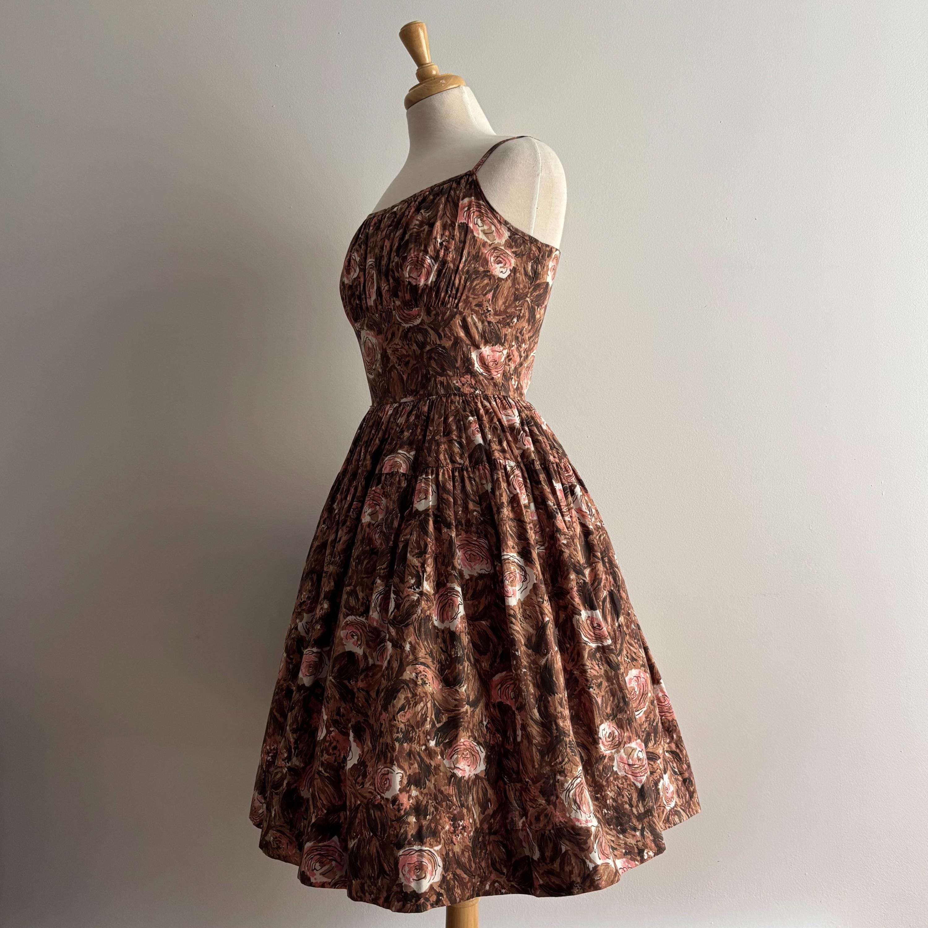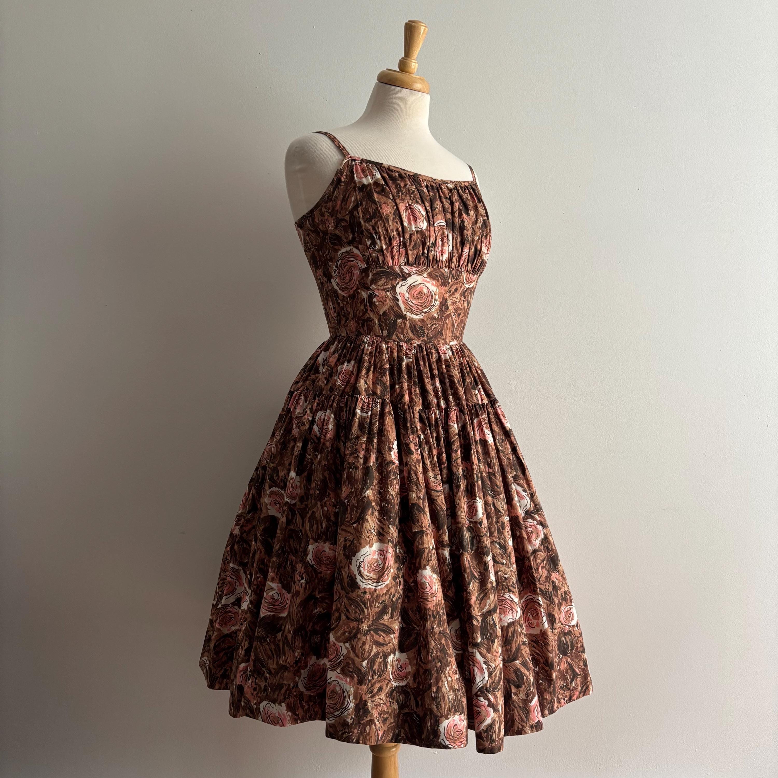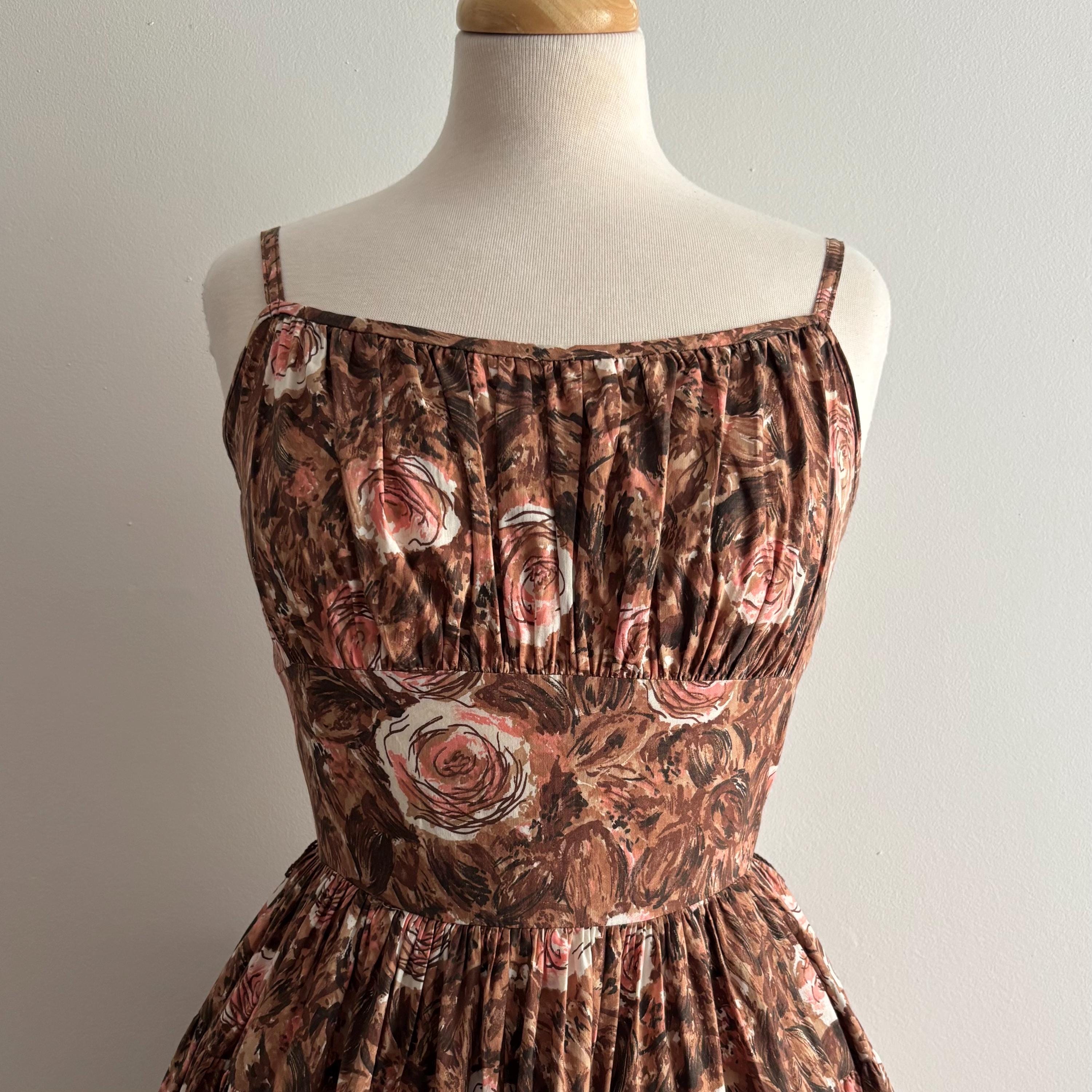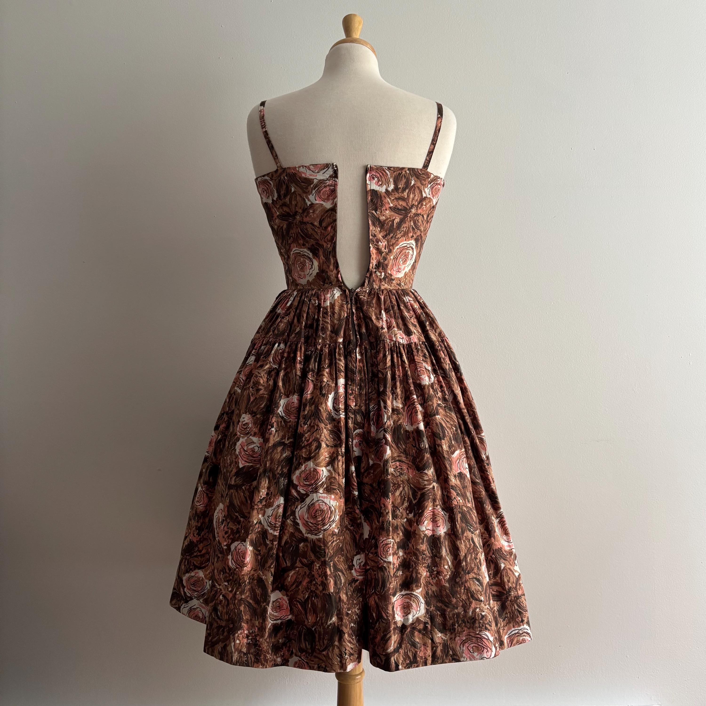 An absolutely gorgeous 1950's Nelly Don dress! Fitted from the underbust through the waist, with a voluminous full skirt. Shown here with and without a crinoline. The dress zips up the back with a nice long metal zipper. The print is a painterly blend of pink roses and brown petals and brush strokes. I think I see pinecones, too! The skirt looks to have been hemmed at some point, so you could turn down another 2.5 inches or so if you wanted more length. Please see the measurements for best fit!