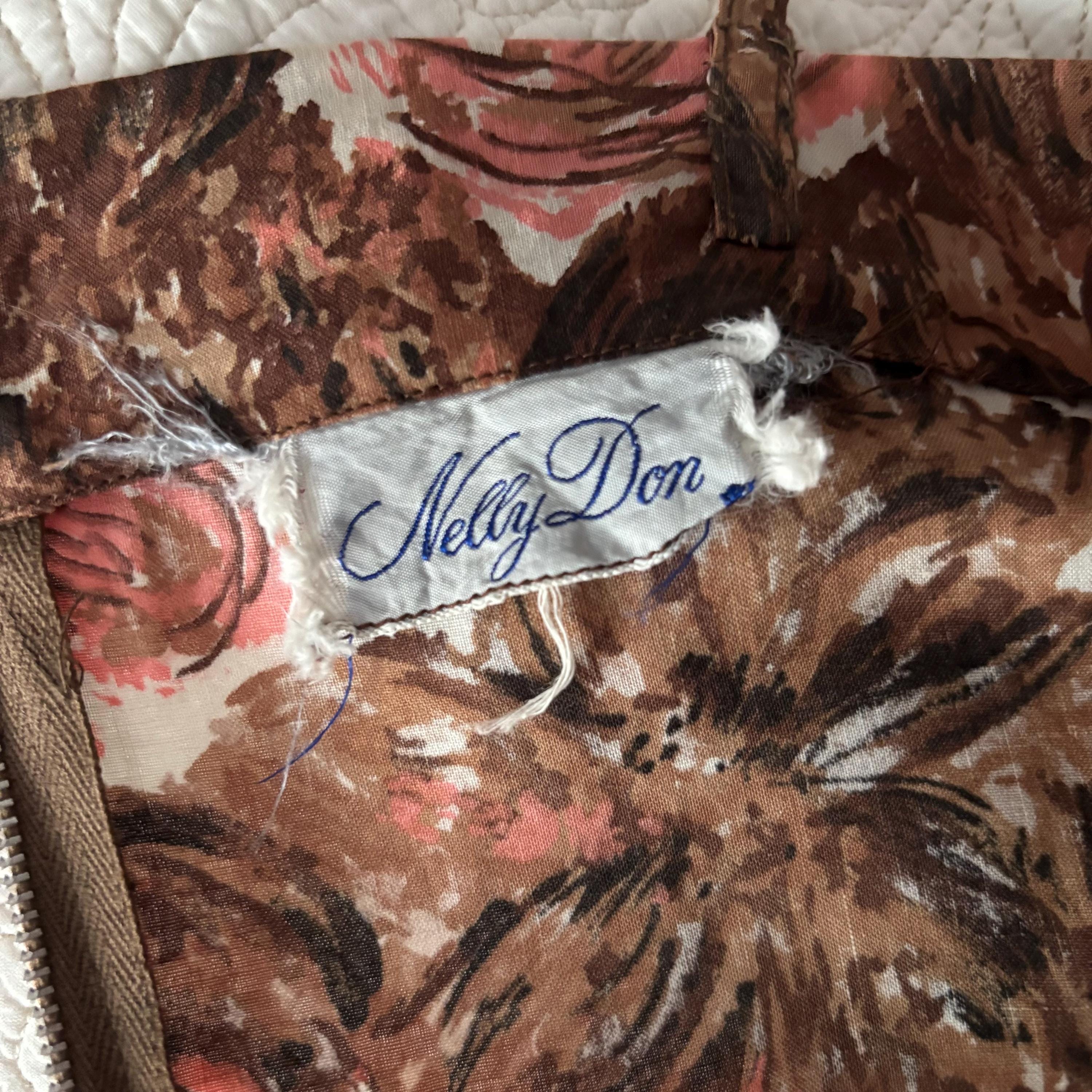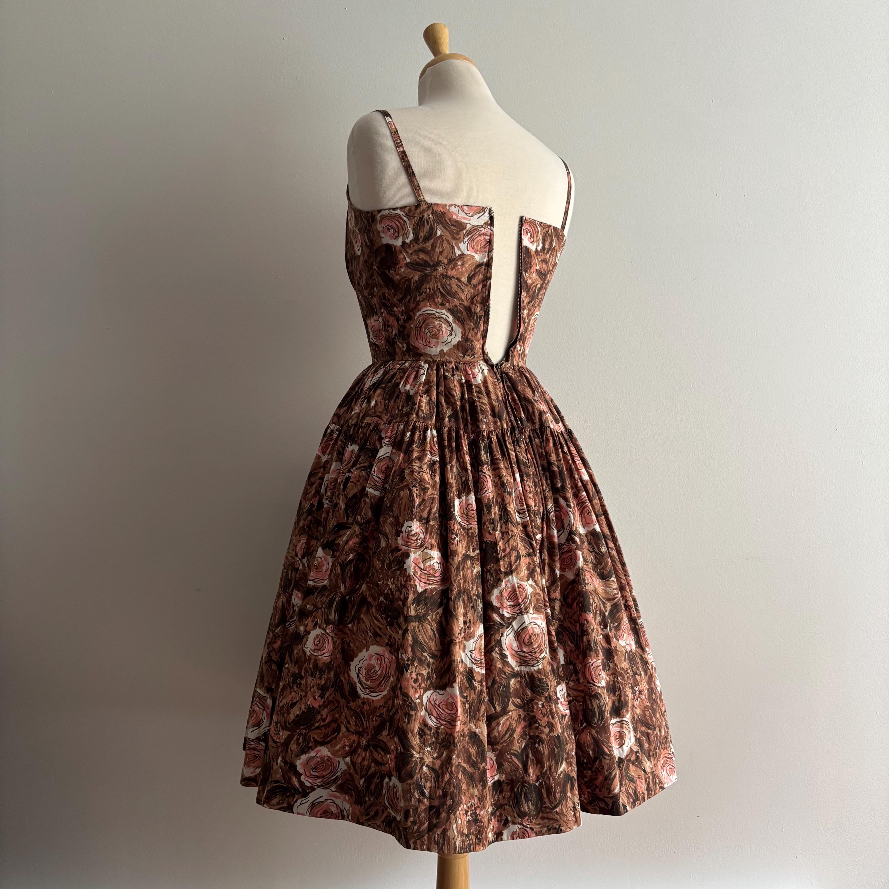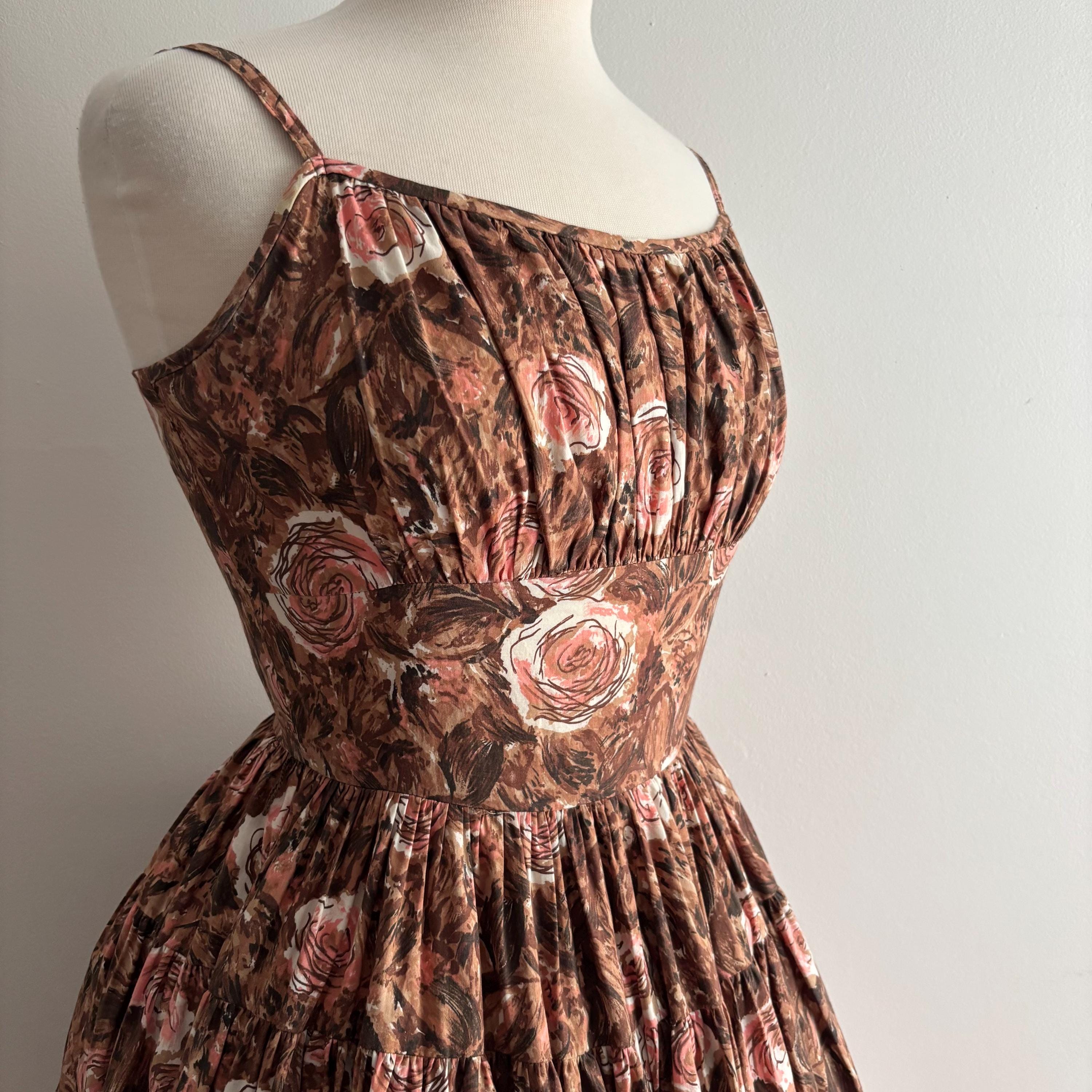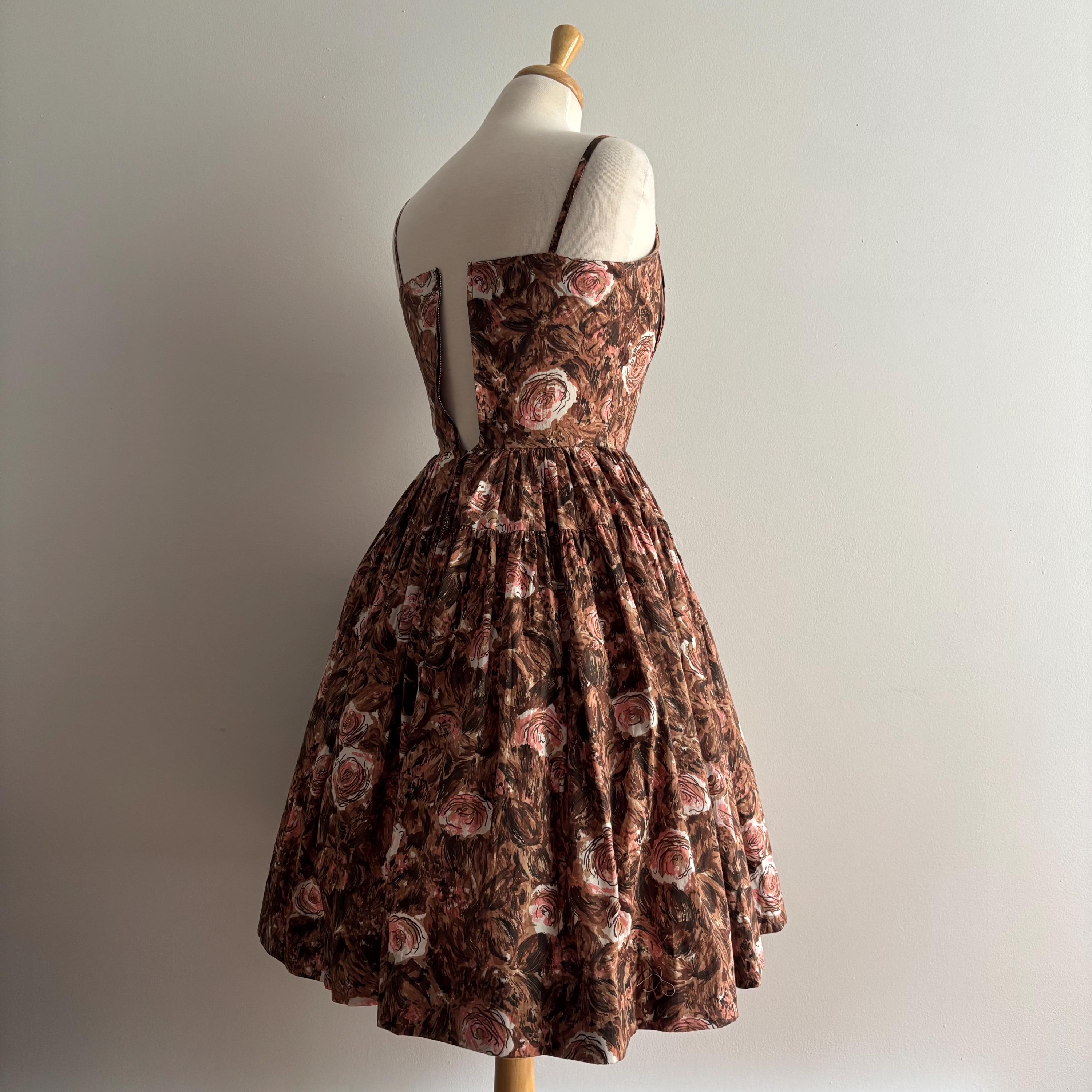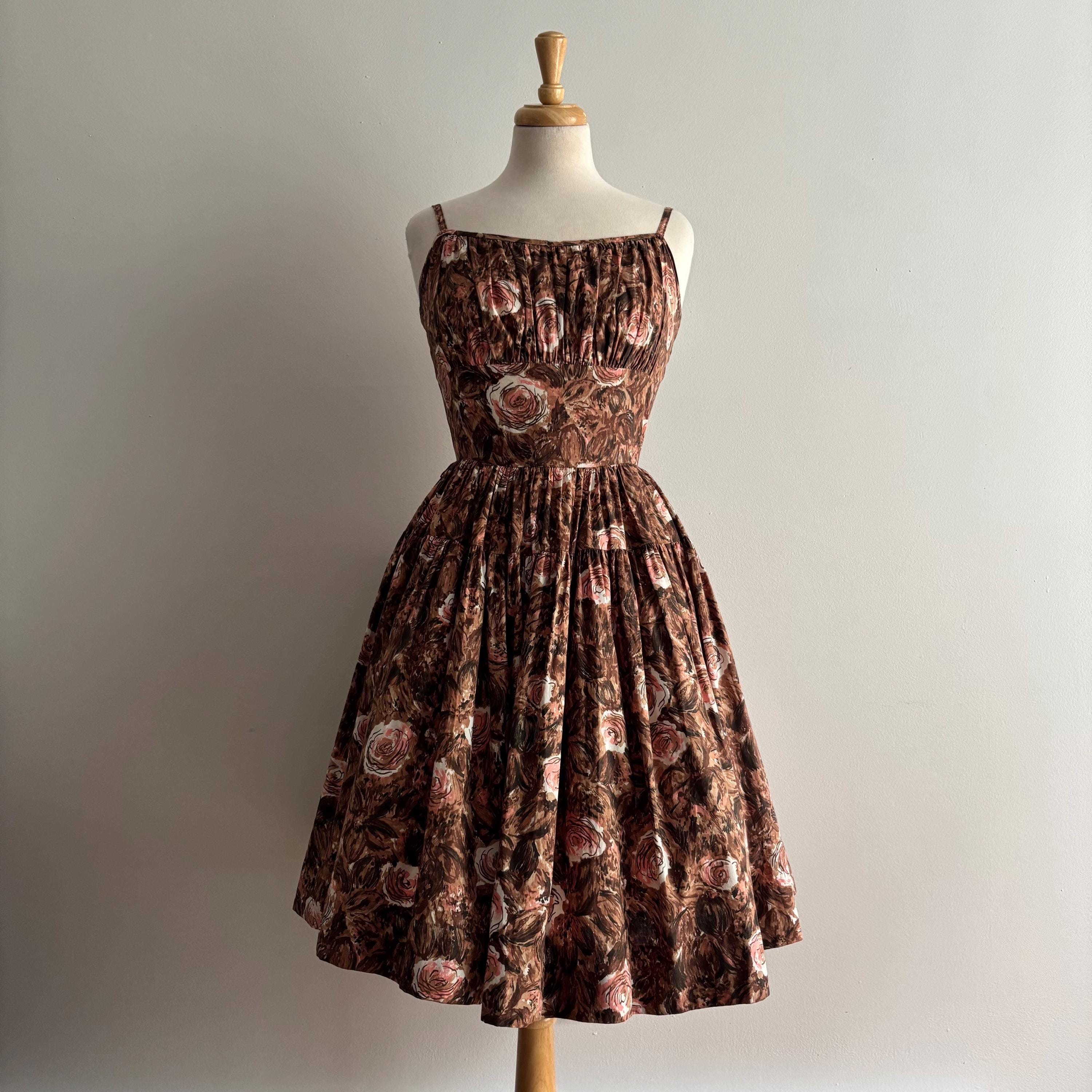 An absolutely gorgeous 1950's Nelly Don dress! Fitted from the underbust through the waist, with a voluminous full skirt. Shown here with and without a crinoline. The dress zips up the back with a nice long metal zipper. The print is a painterly blend of pink roses and brown petals and brush strokes. I think I see pinecones, too! The skirt looks to have been hemmed at some point, so you could turn down another 2.5 inches or so if you wanted more length. Please see the measurements for best fit!