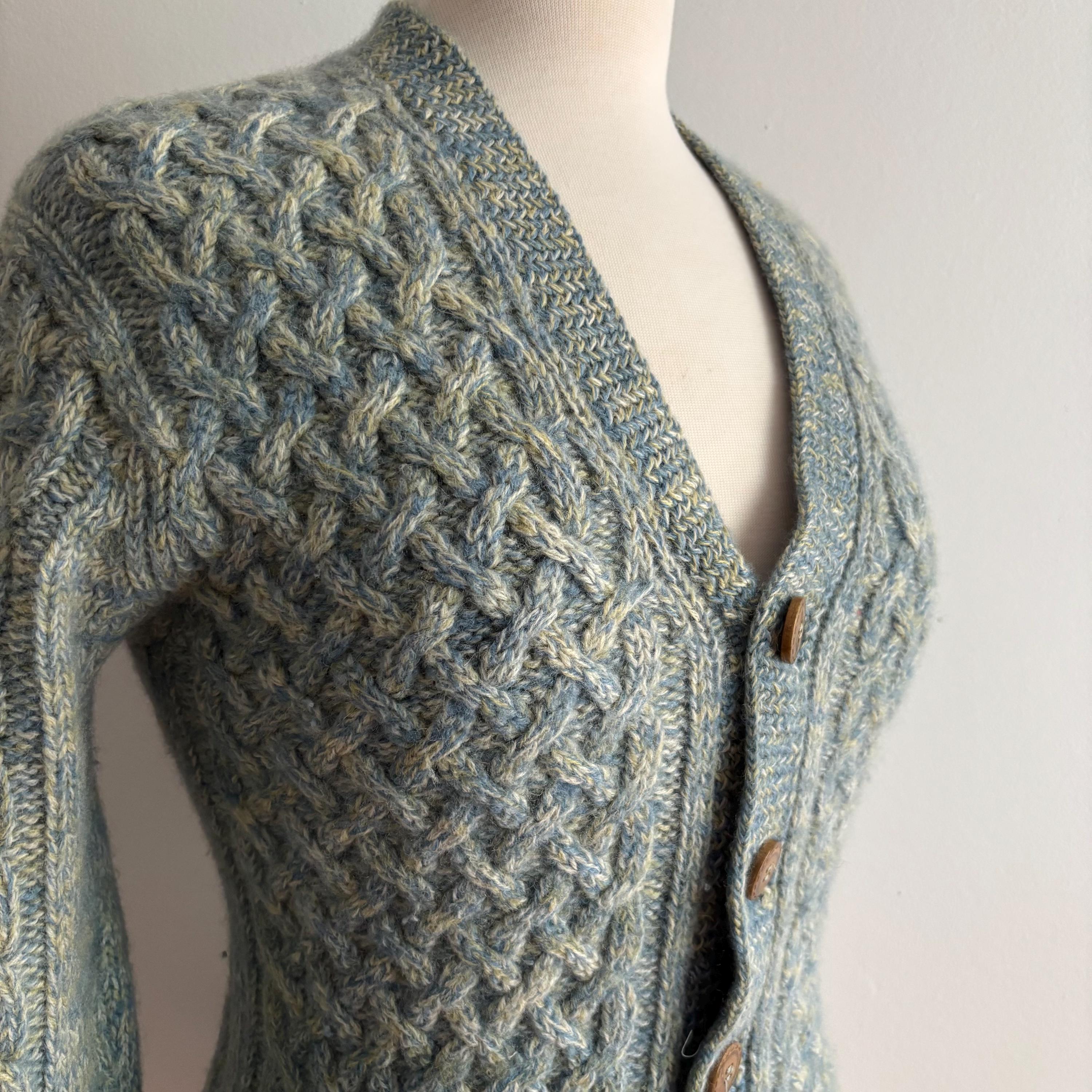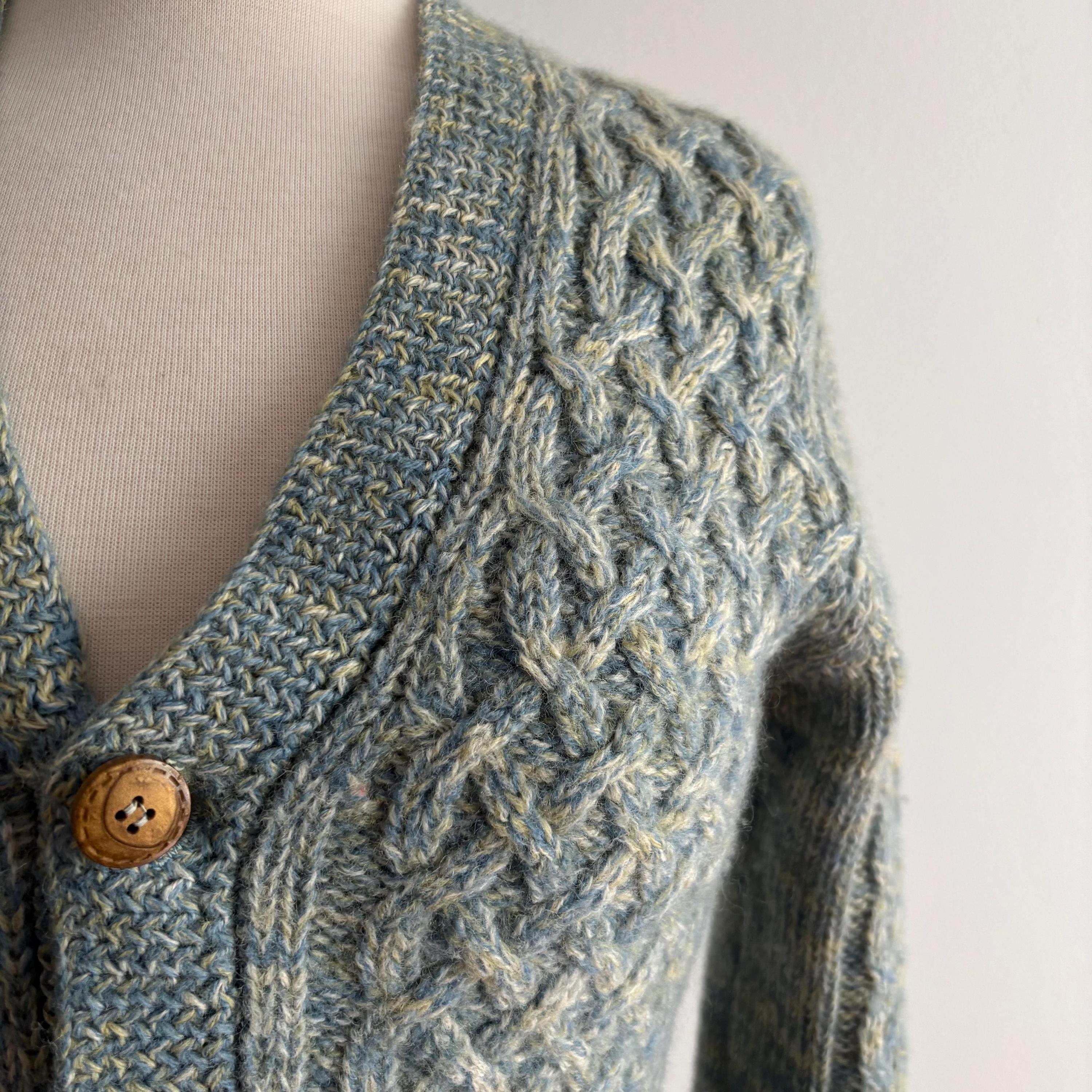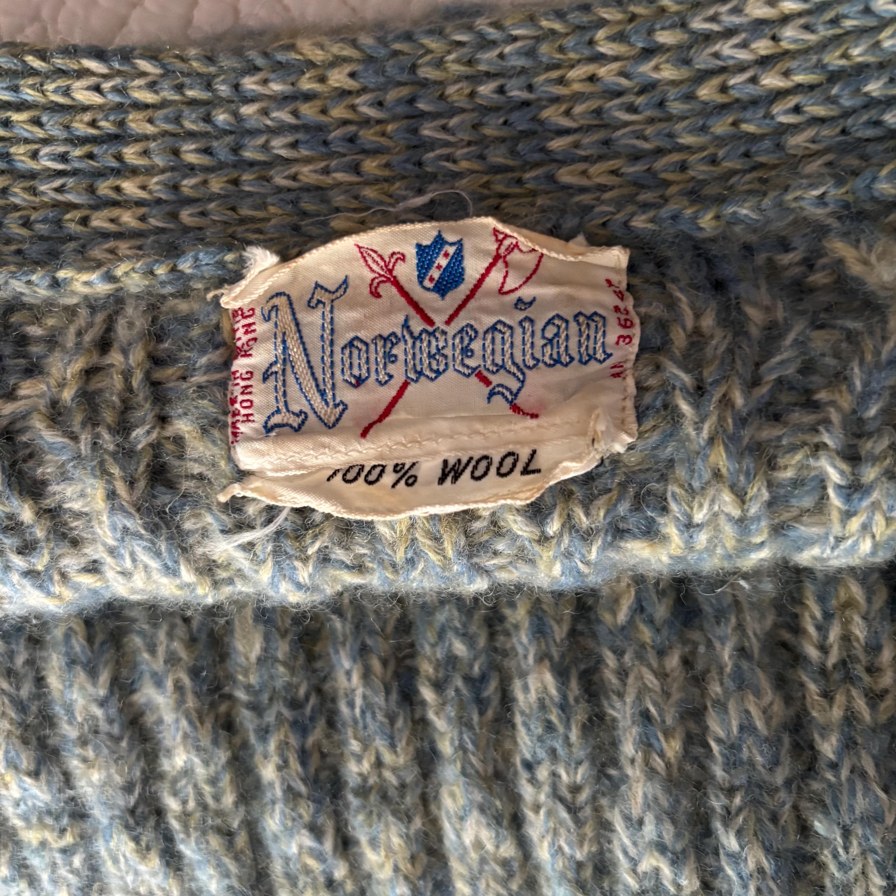 A cozy 1970's vintage cardigan, made of blue and cream wool with hints of yellow. Slim fitting, with a v-neck and long sleeves, the cardigan buttons down the front. There is an extra button sewn into the back side of the placket, in case you lose one! Norwegian brand. Made in Hong Kong. 100% wool. No size tag, please see the measurements for best fit.