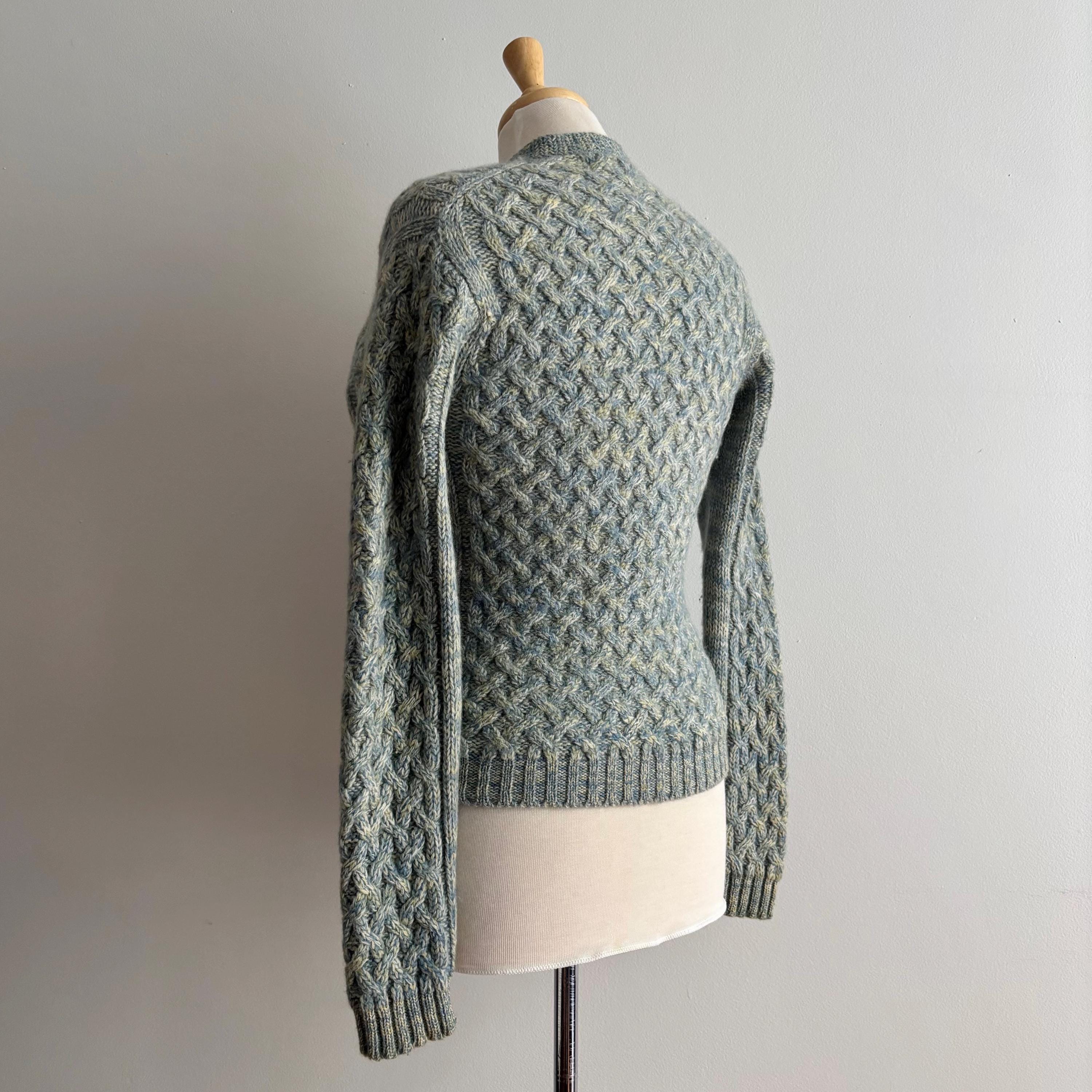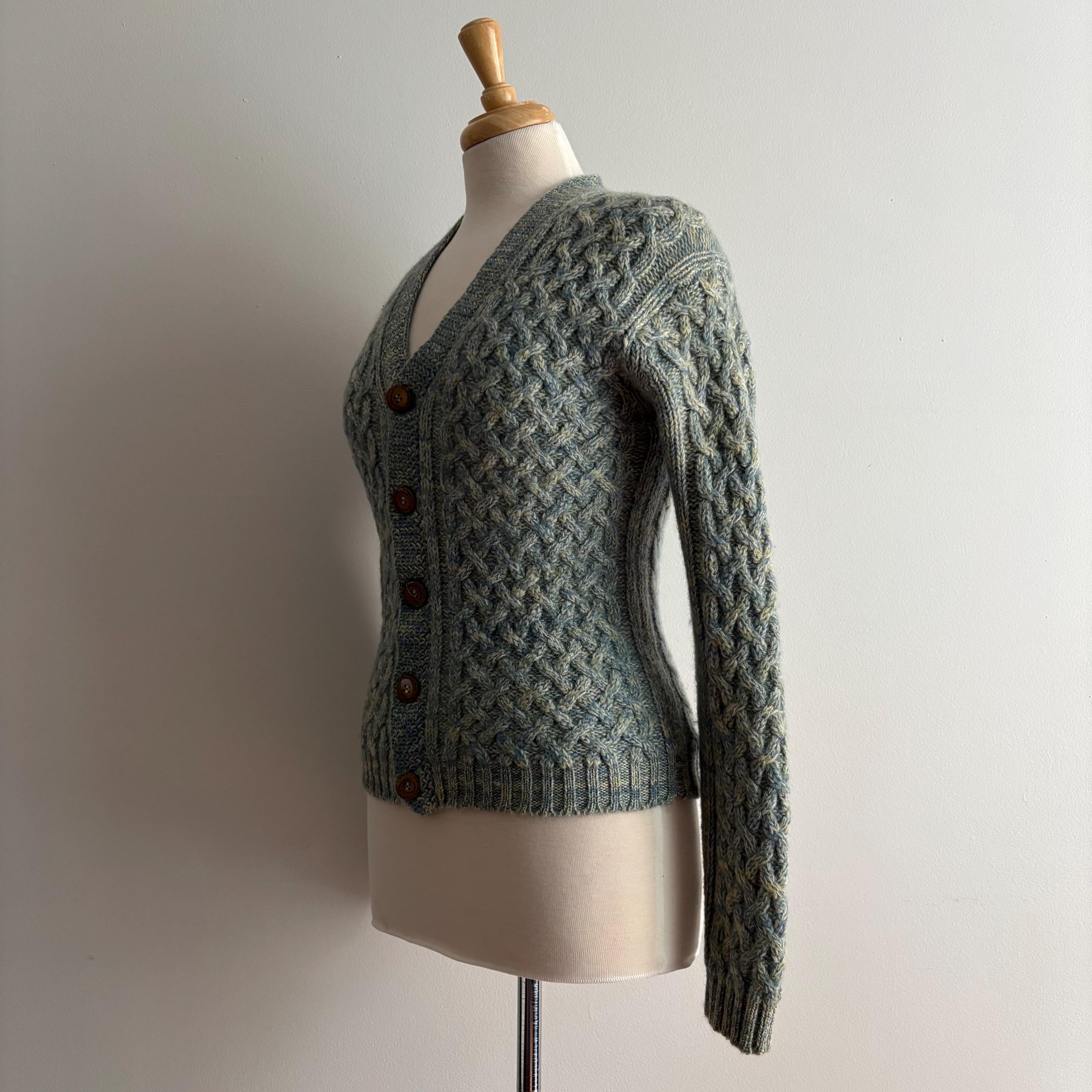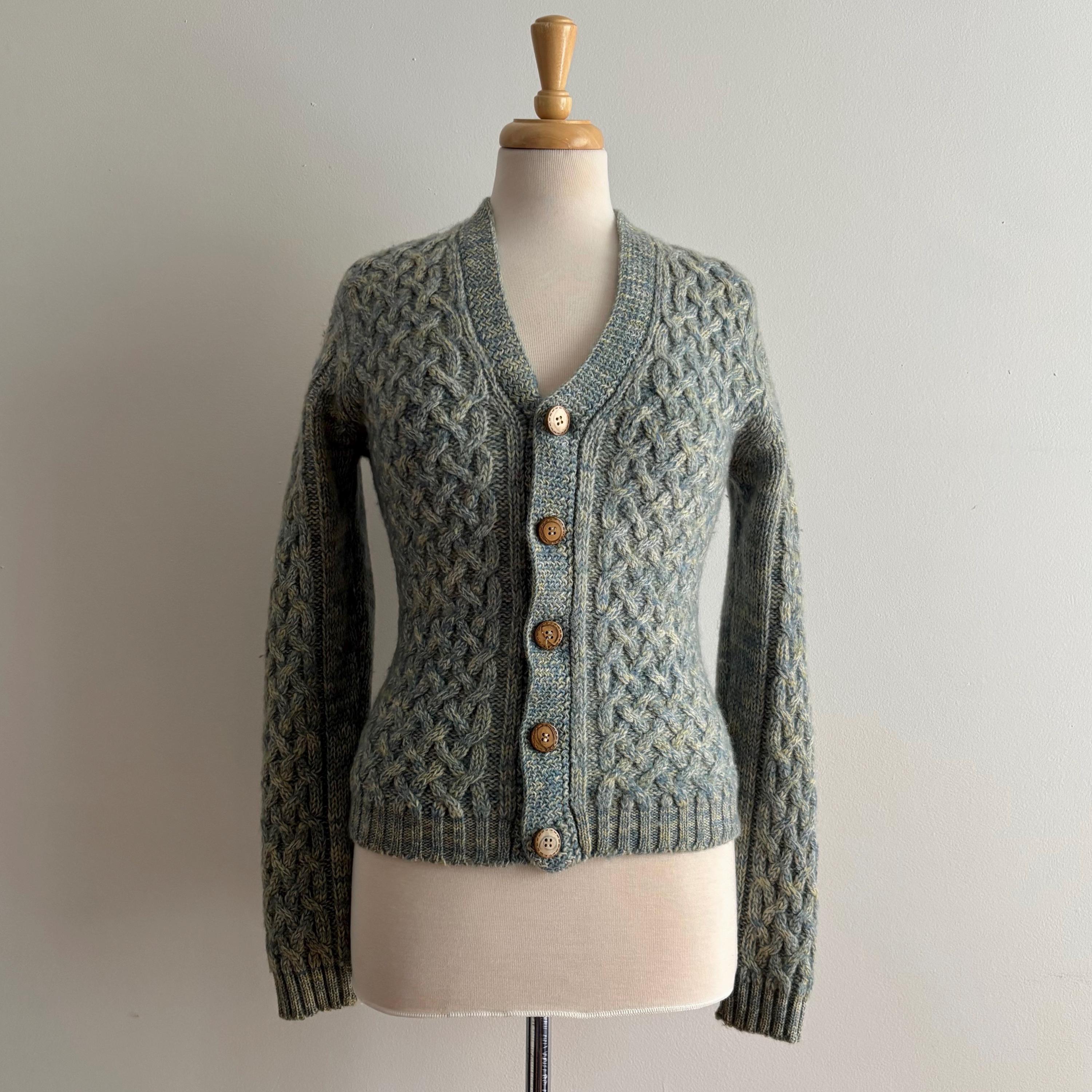 A cozy 1970's vintage cardigan, made of blue and cream wool with hints of yellow. Slim fitting, with a v-neck and long sleeves, the cardigan buttons down the front. There is an extra button sewn into the back side of the placket, in case you lose one! Norwegian brand. Made in Hong Kong. 100% wool. No size tag, please see the measurements for best fit.