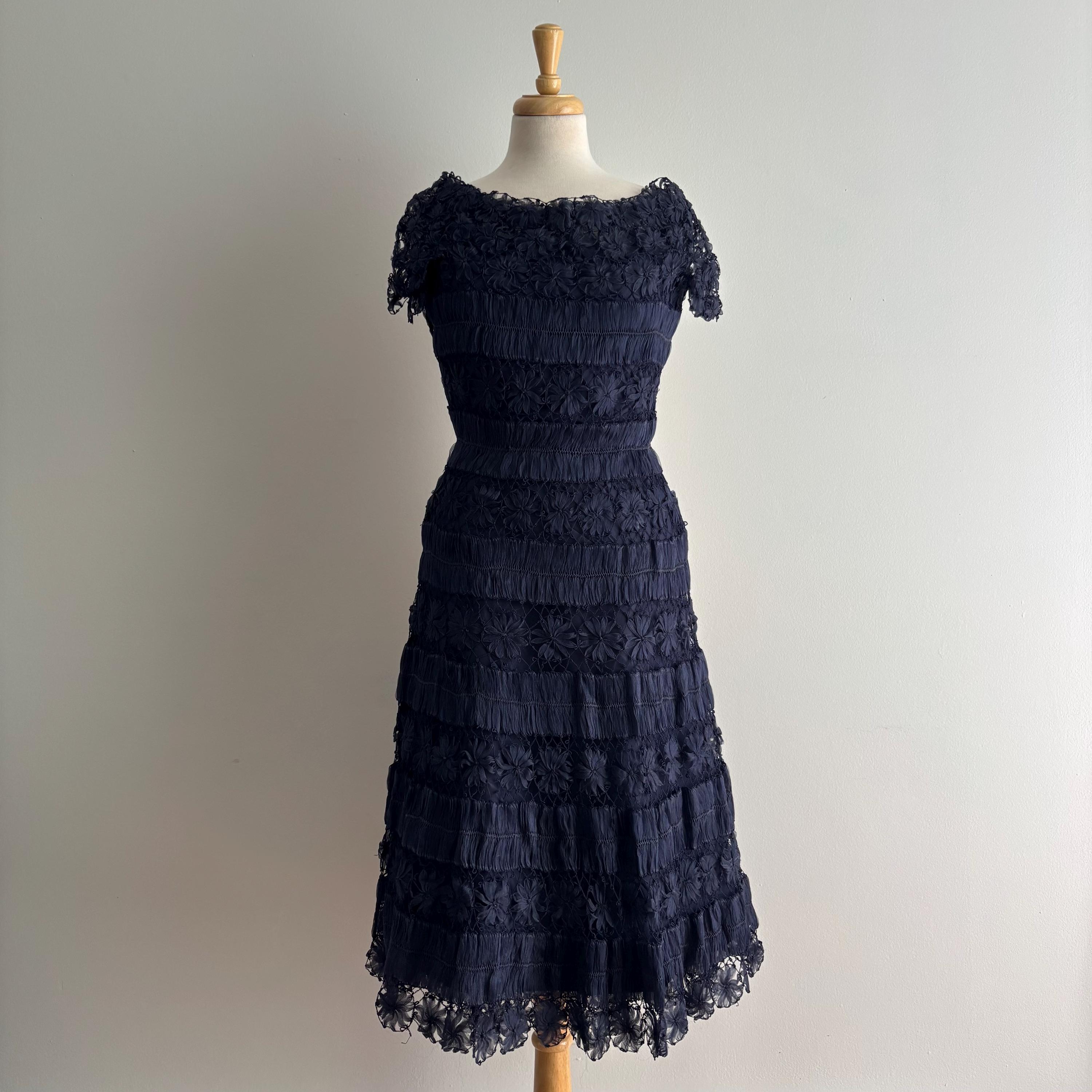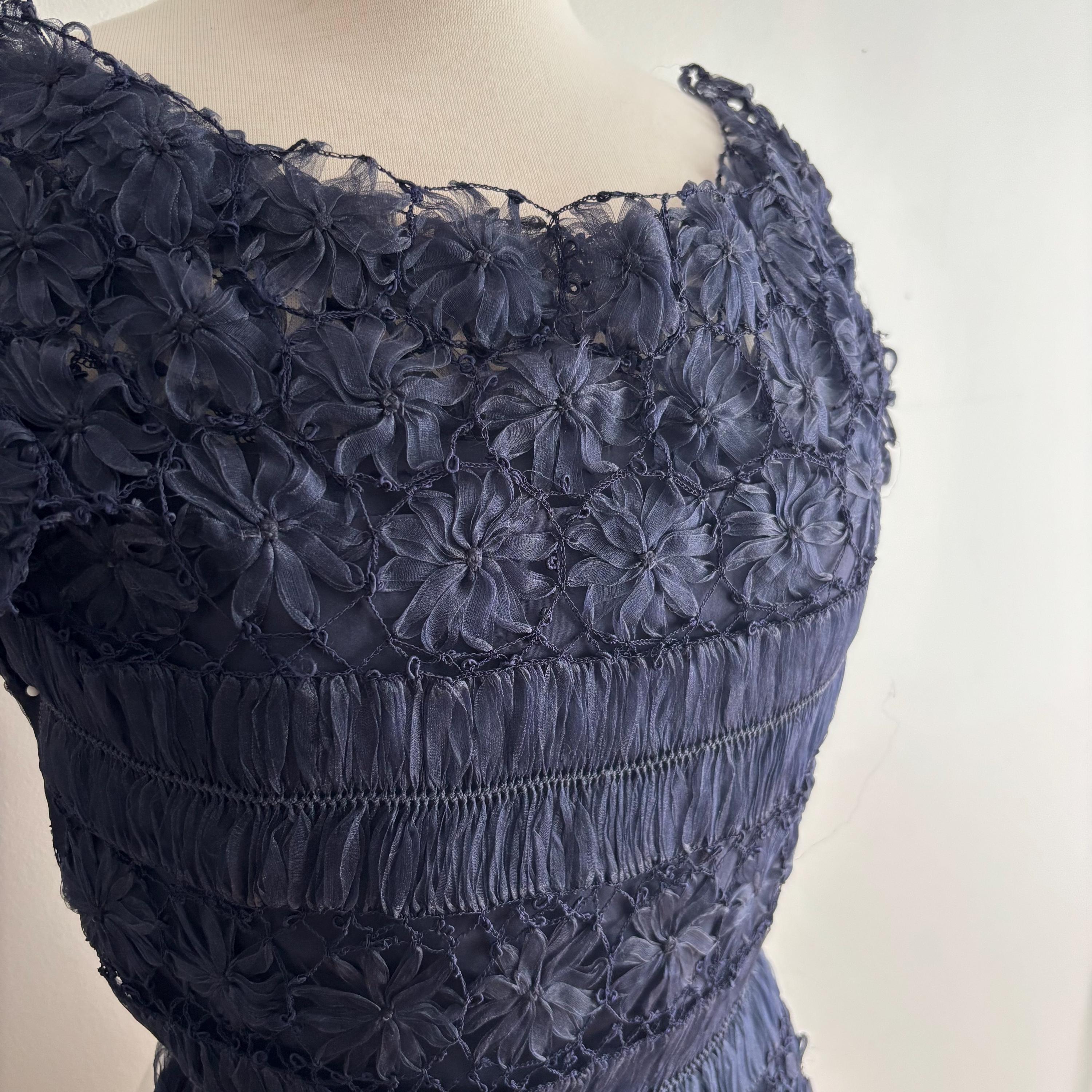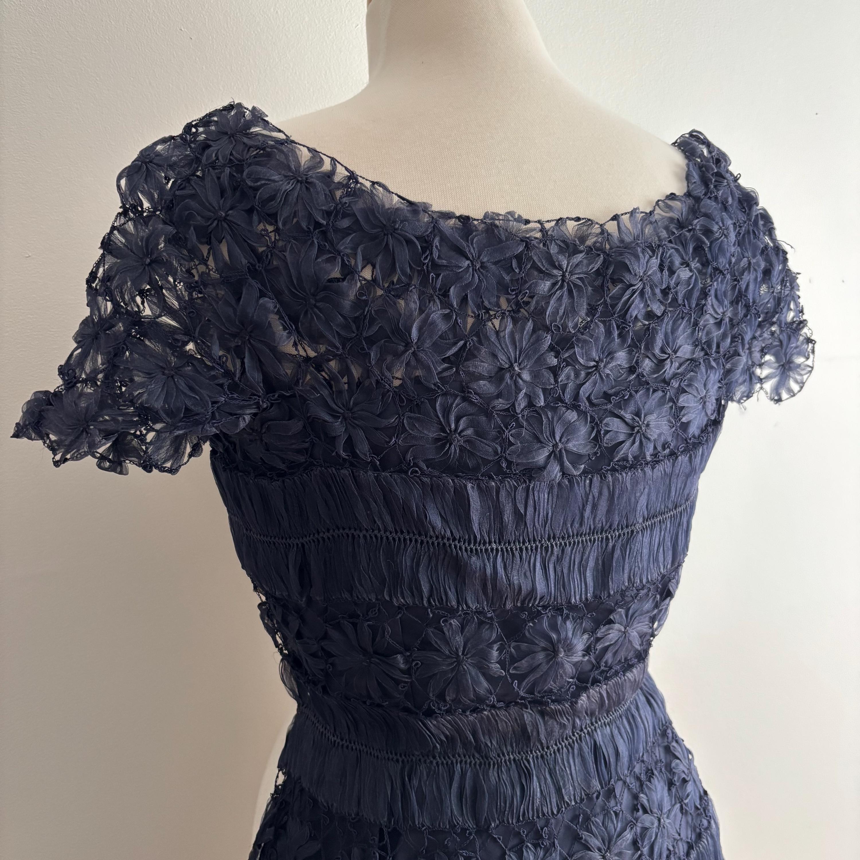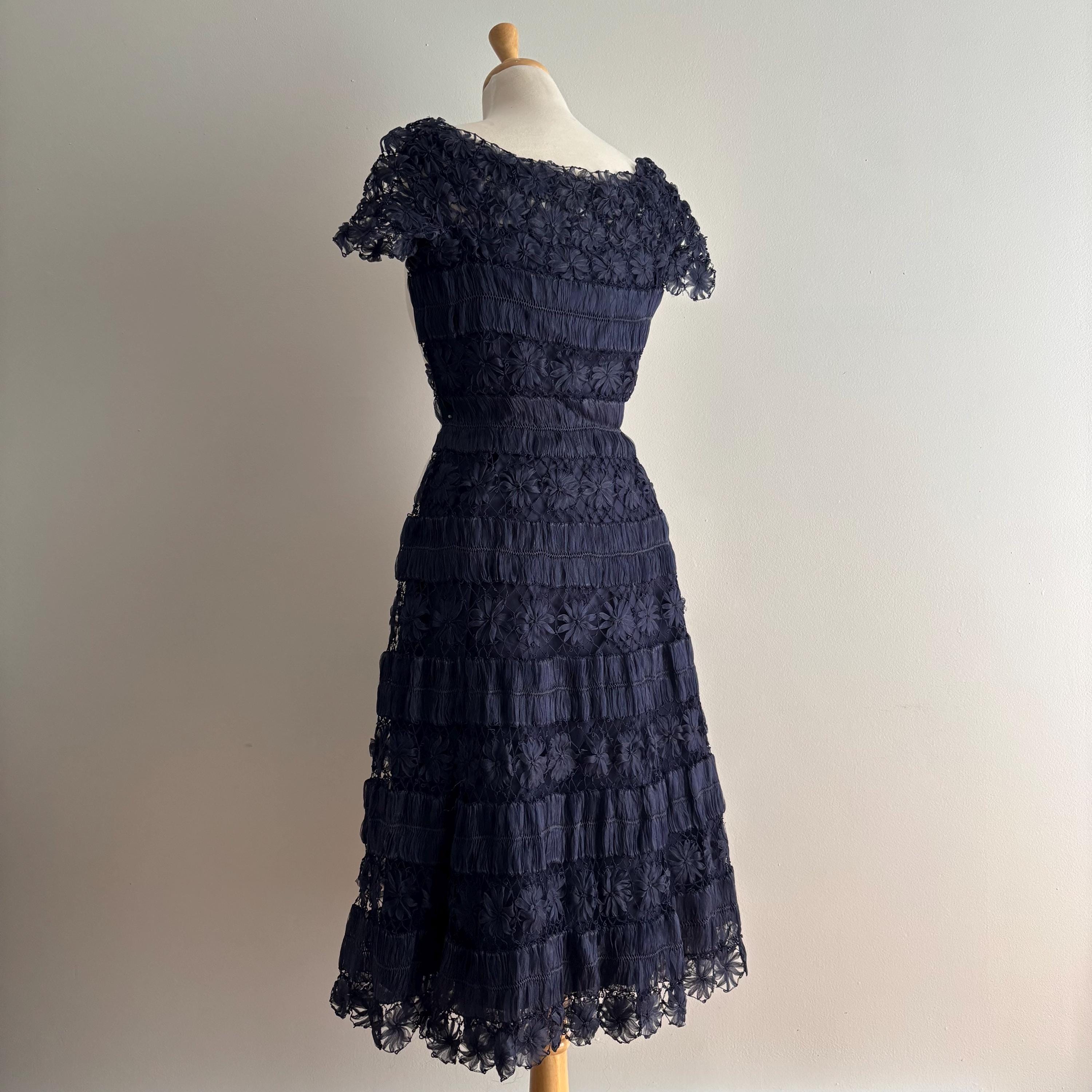 Stunning 1950s darkest blue hairpin lace dress! This incredible dress features a wide neck and cap sleeves, fitted to the waist. The dress is lined from the top of bust down, which may be difficult to discern in my photos, as I had to pin the dress to my dress form. There is a metal zipper at one side. The lining is nylon or similar. The lace layer is made of silk organdy ribbon. I did manage to trim some loose fibres and burn them to confirm. The dress is handmade, which is an incredible feat. The sheer time investment is mind blowing! An absolutely beautiful heirloom piece. Please see the measurements for best fit!