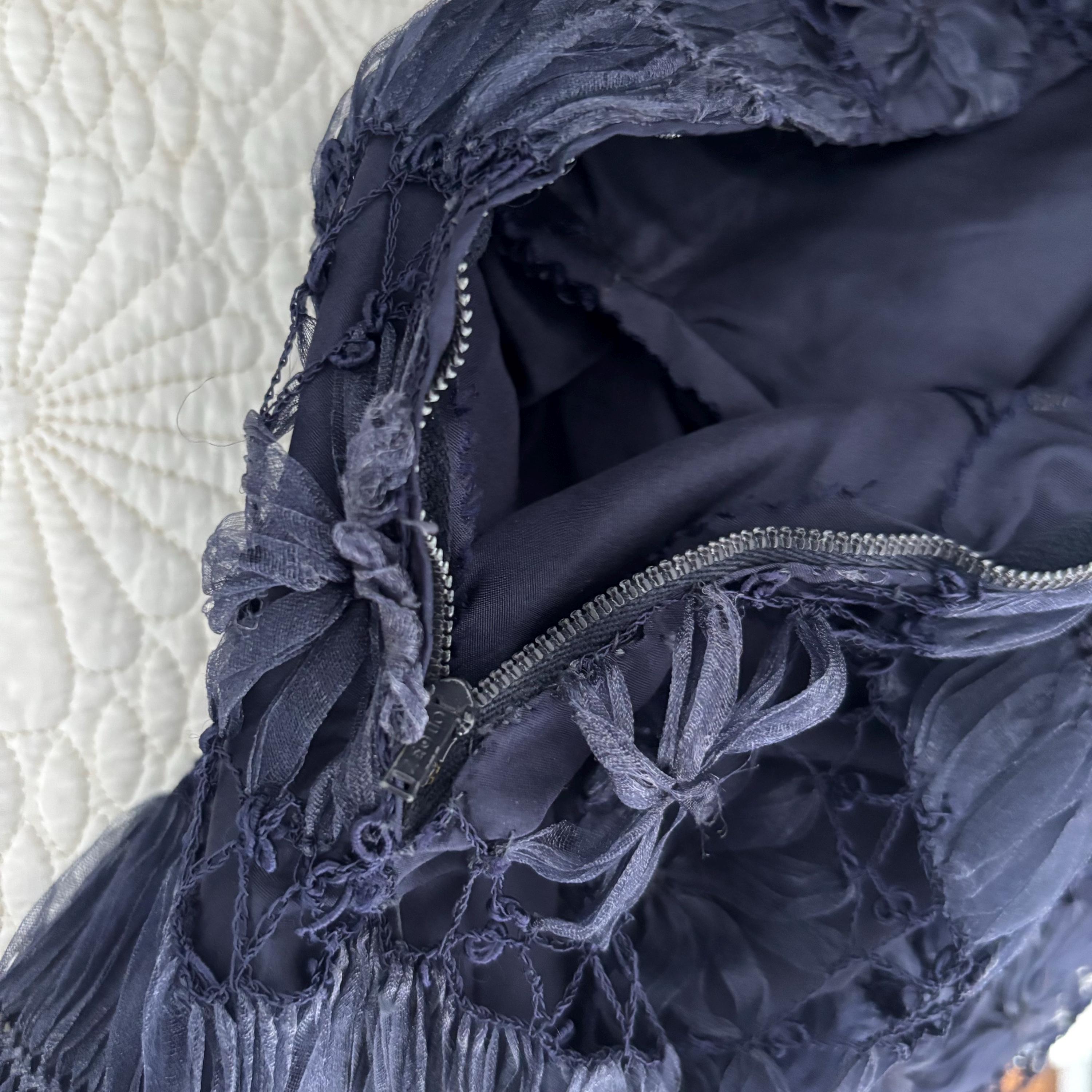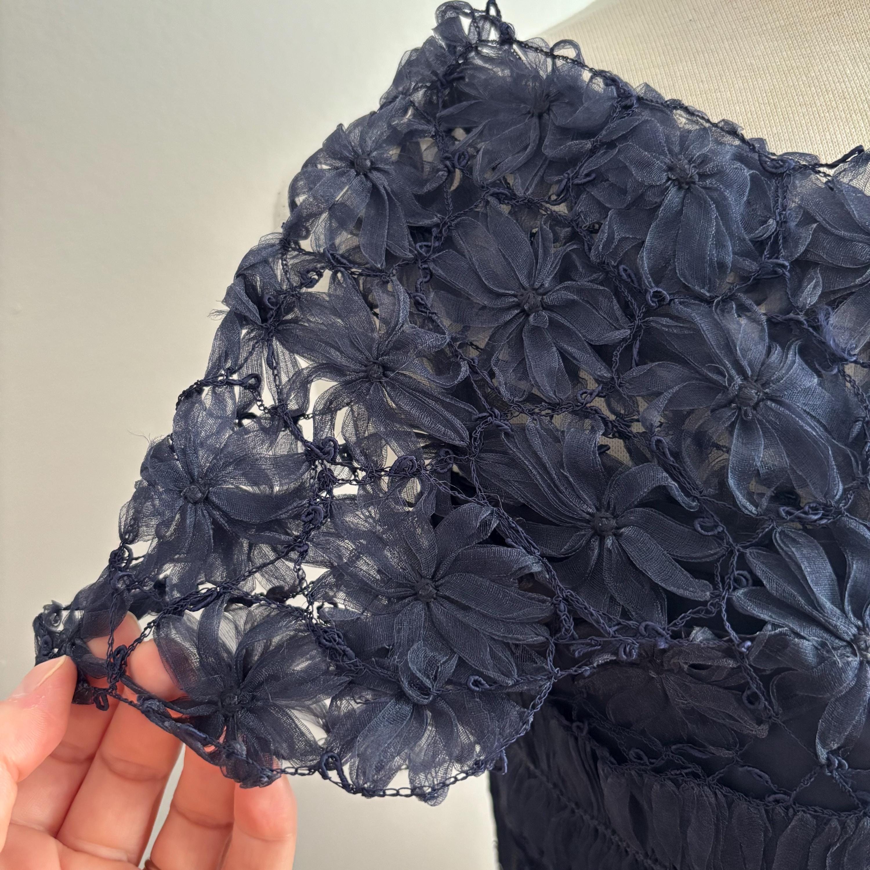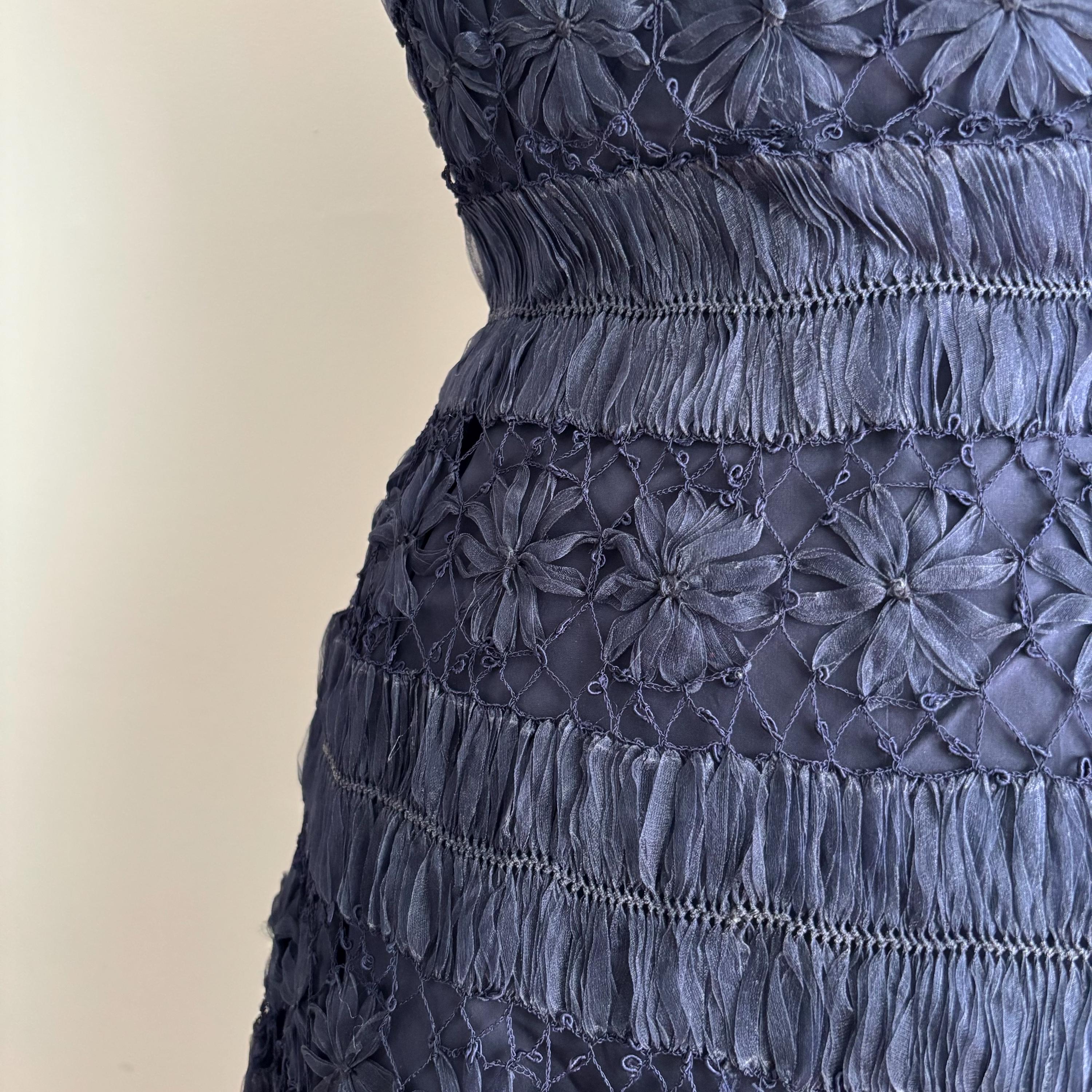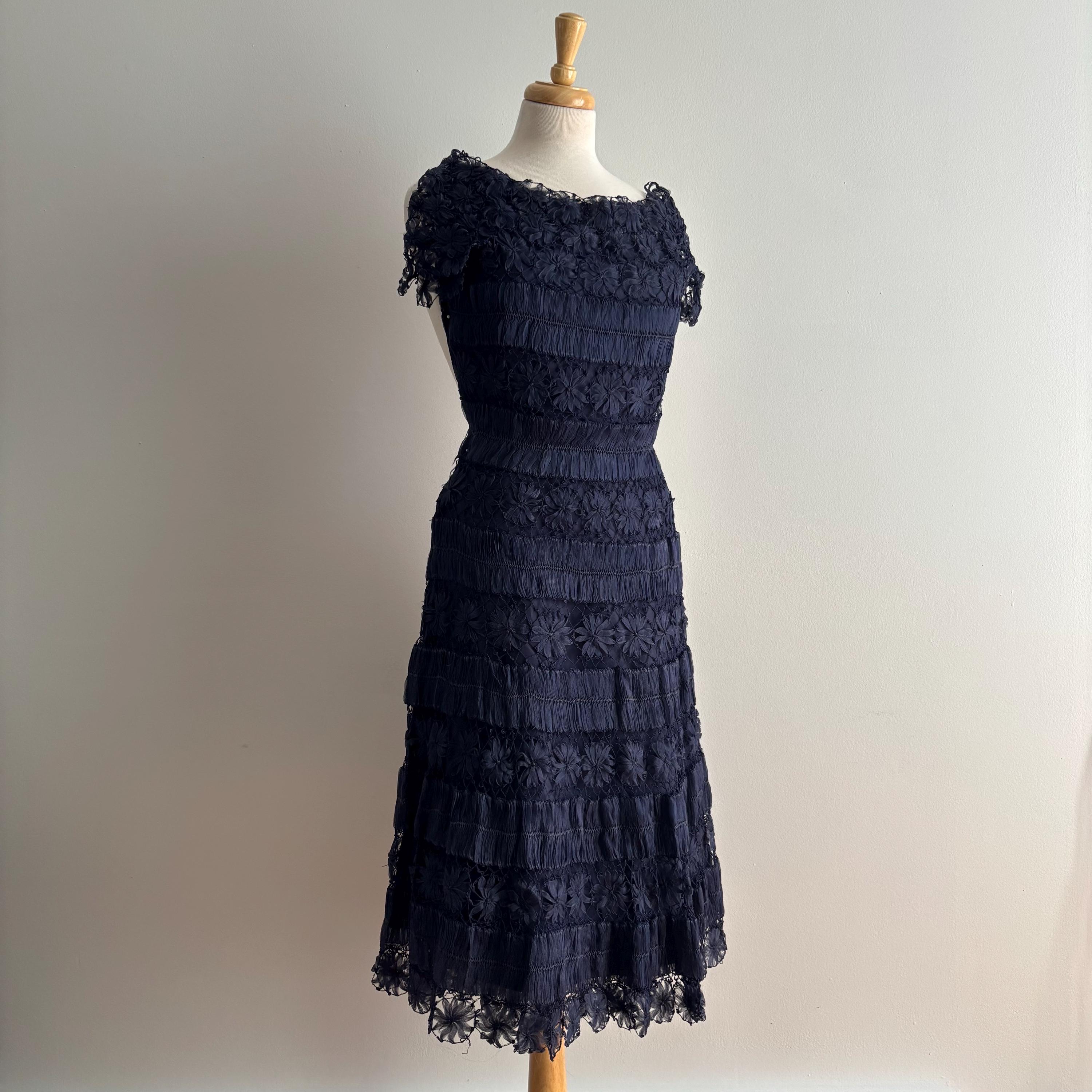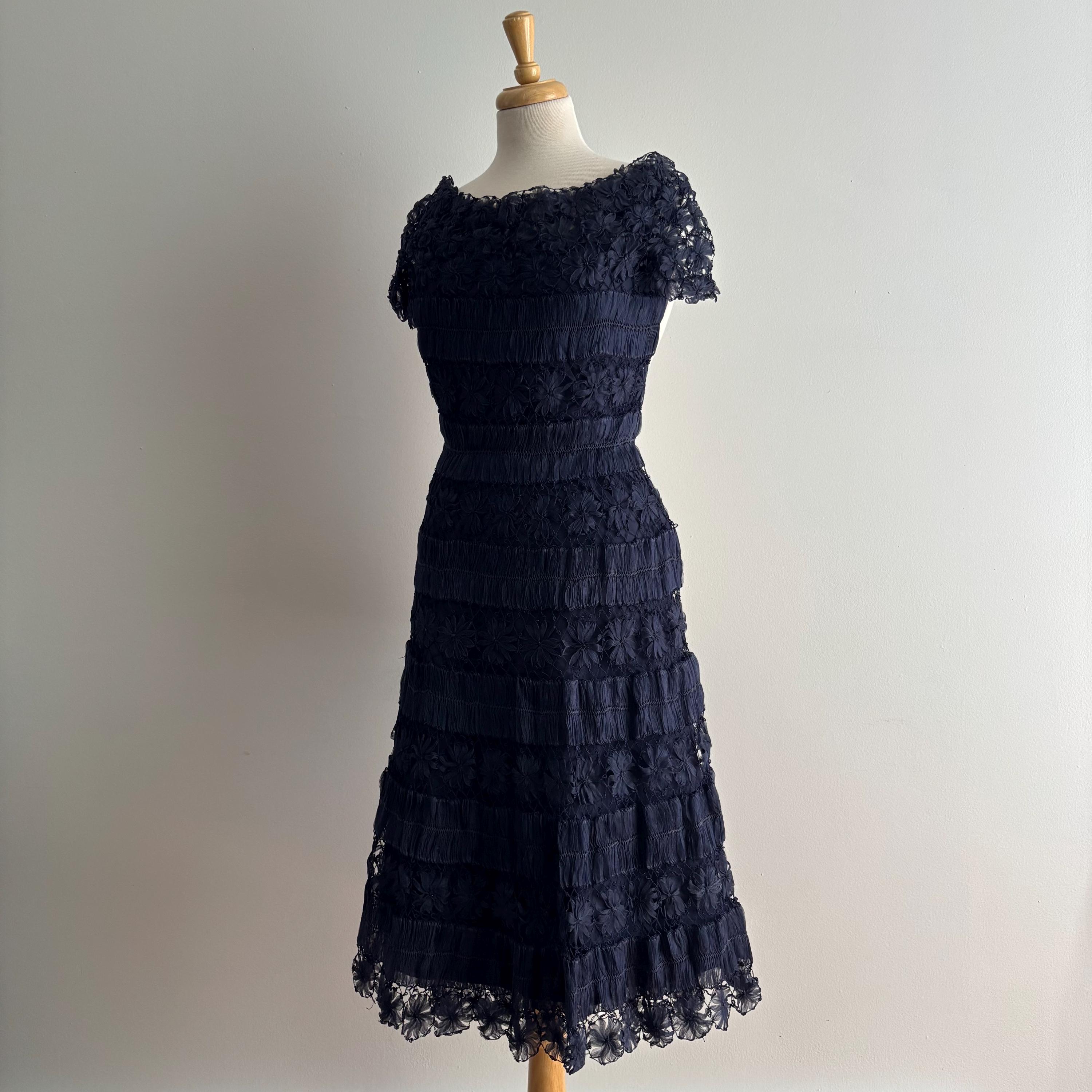 Stunning 1950s darkest blue hairpin lace dress! This incredible dress features a wide neck and cap sleeves, fitted to the waist. The dress is lined from the top of bust down, which may be difficult to discern in my photos, as I had to pin the dress to my dress form. There is a metal zipper at one side. The lining is nylon or similar. The lace layer is made of silk organdy ribbon. I did manage to trim some loose fibres and burn them to confirm. The dress is handmade, which is an incredible feat. The sheer time investment is mind blowing! An absolutely beautiful heirloom piece. Please see the measurements for best fit!
