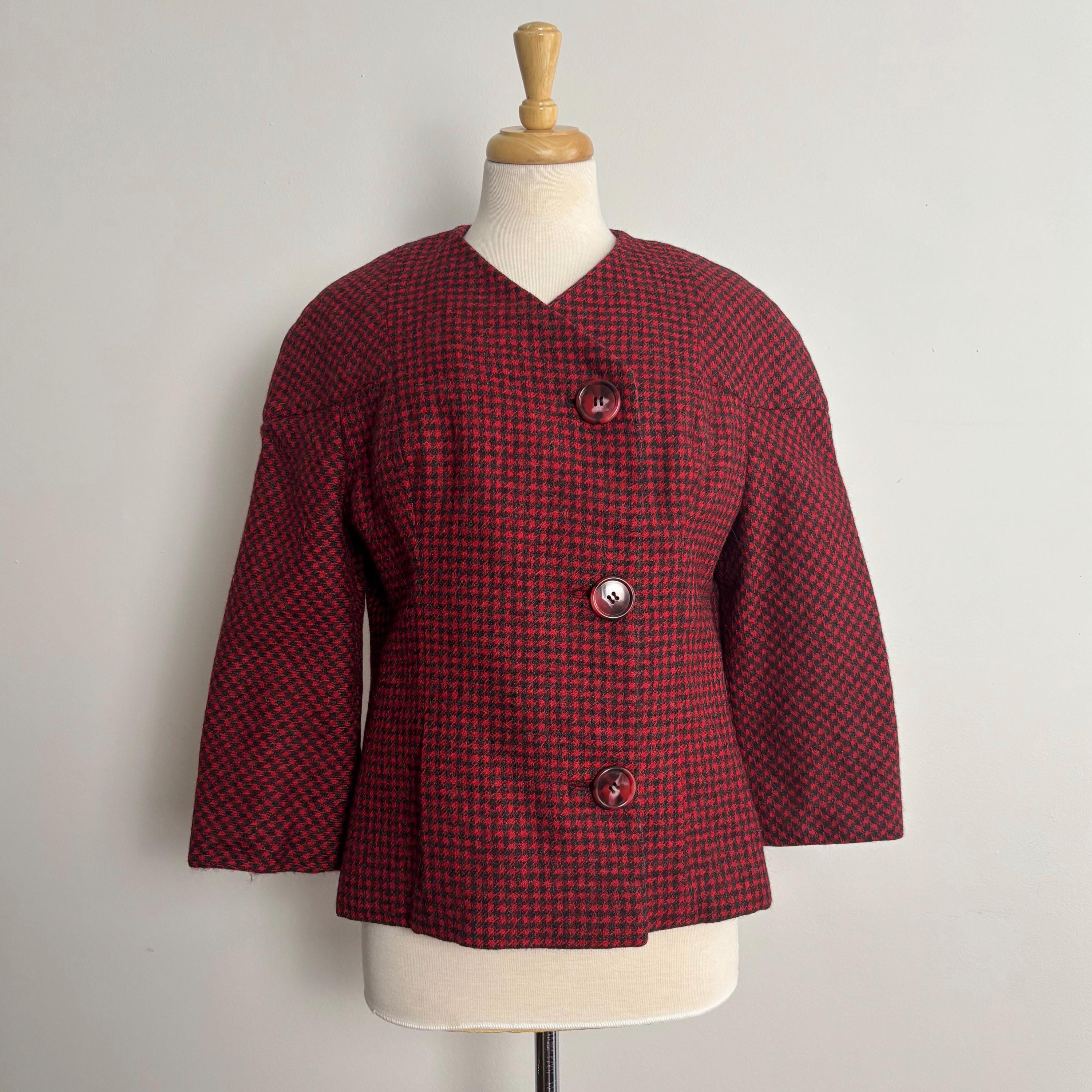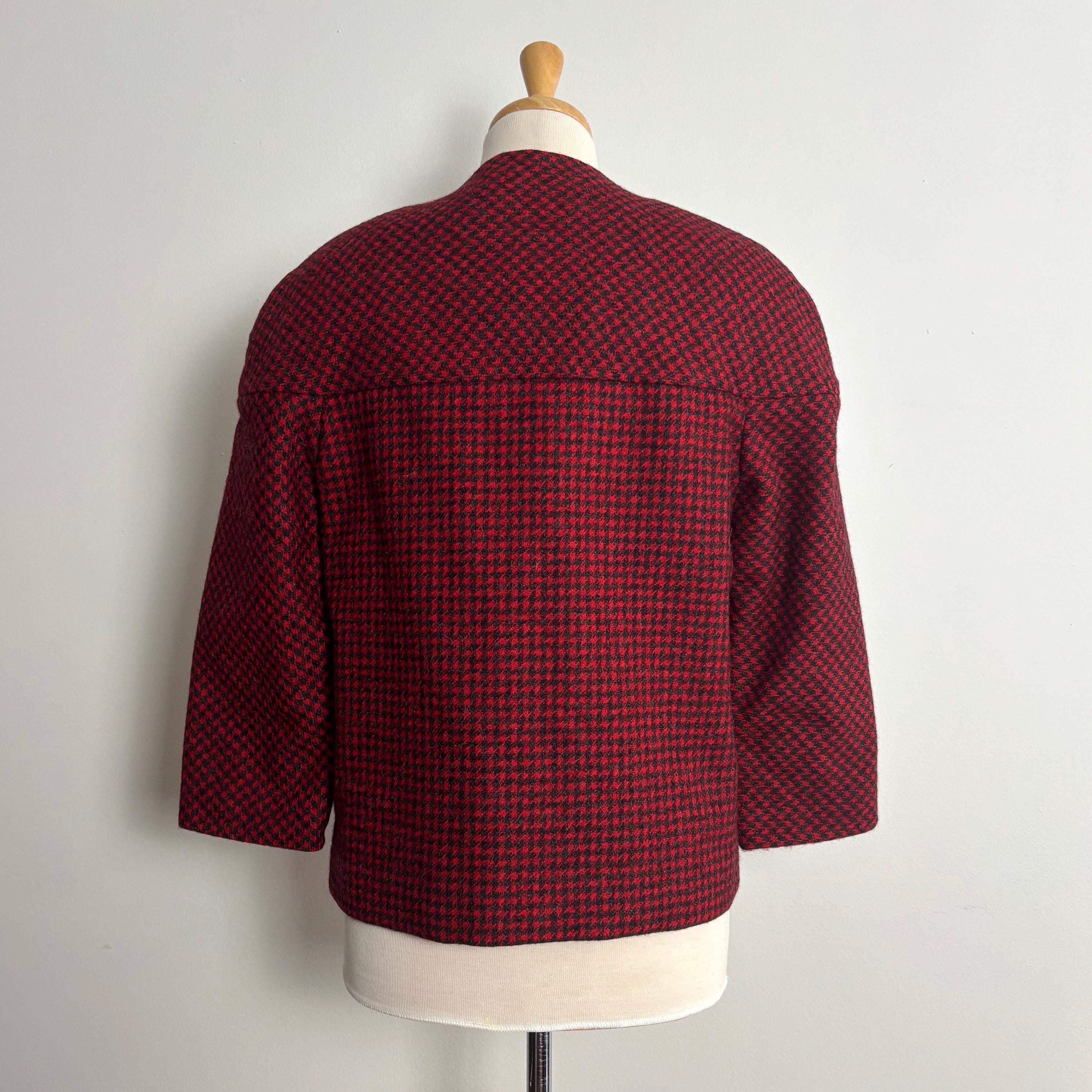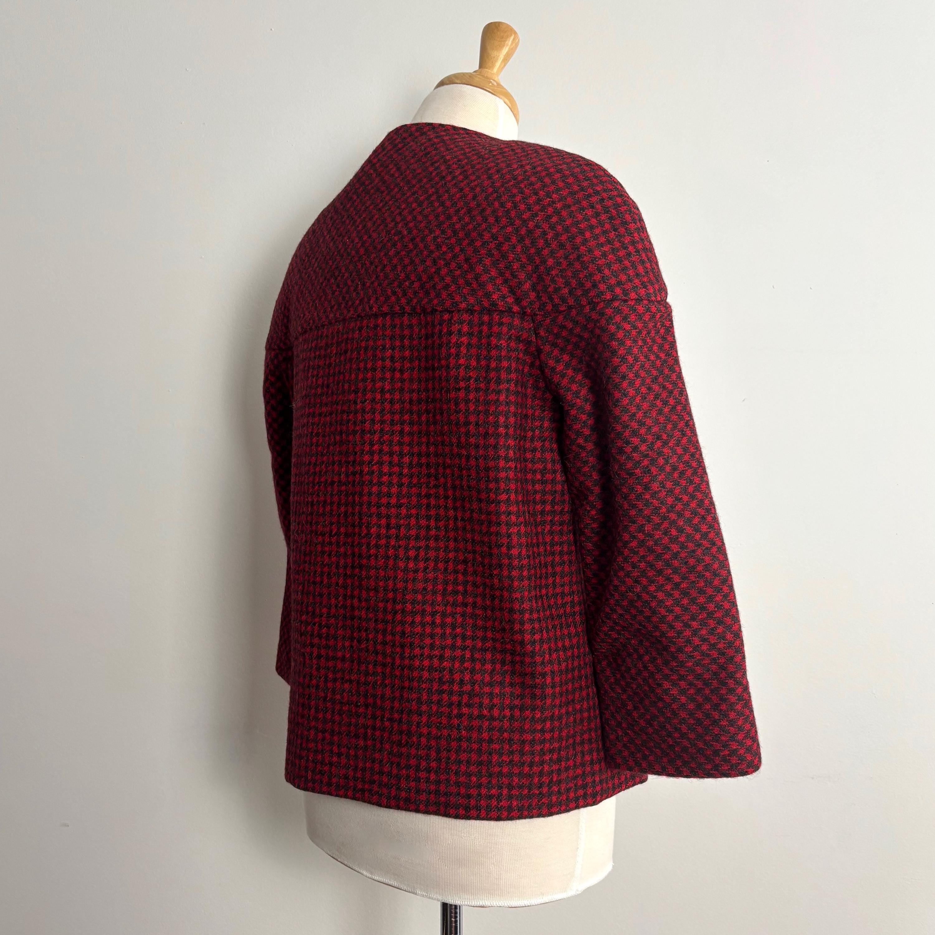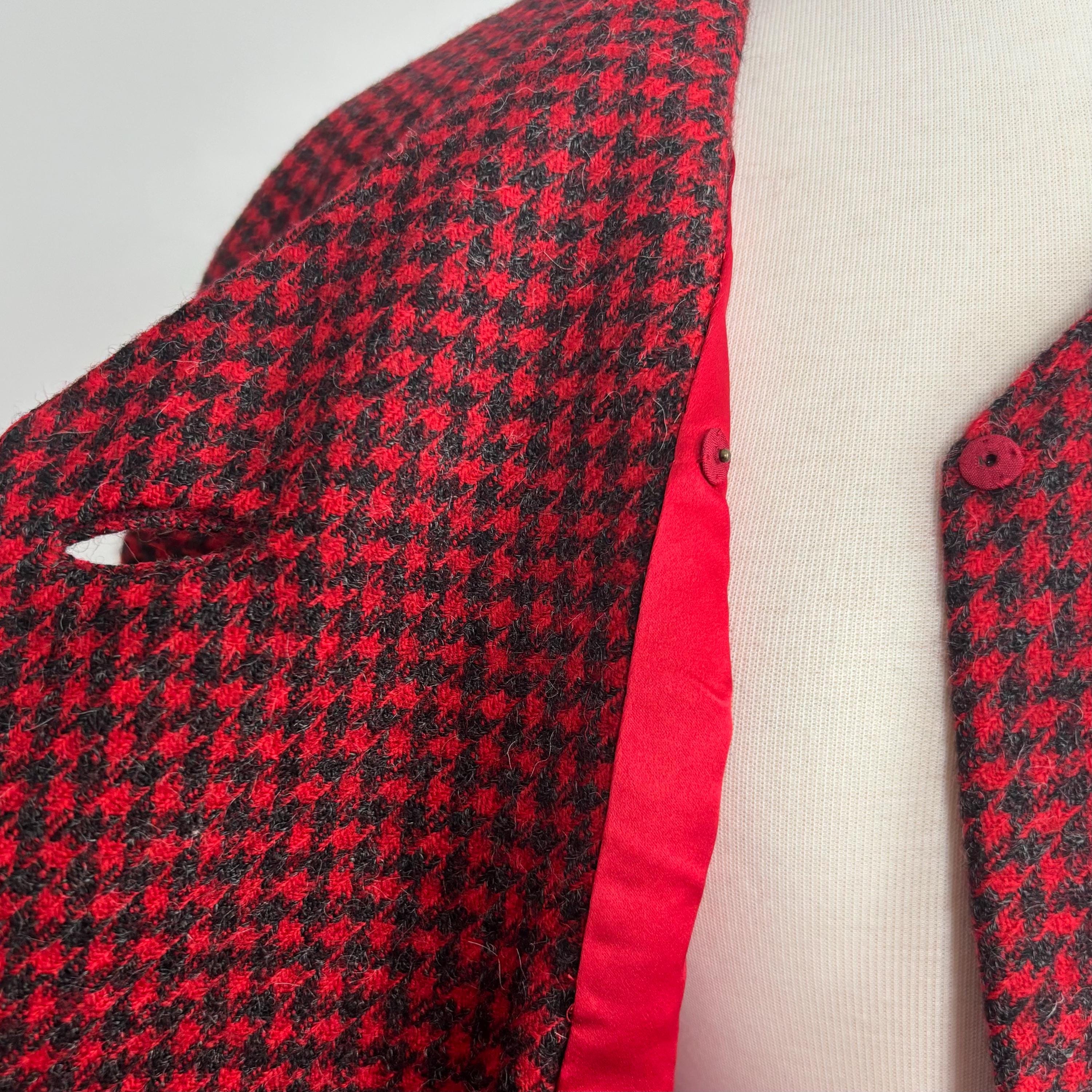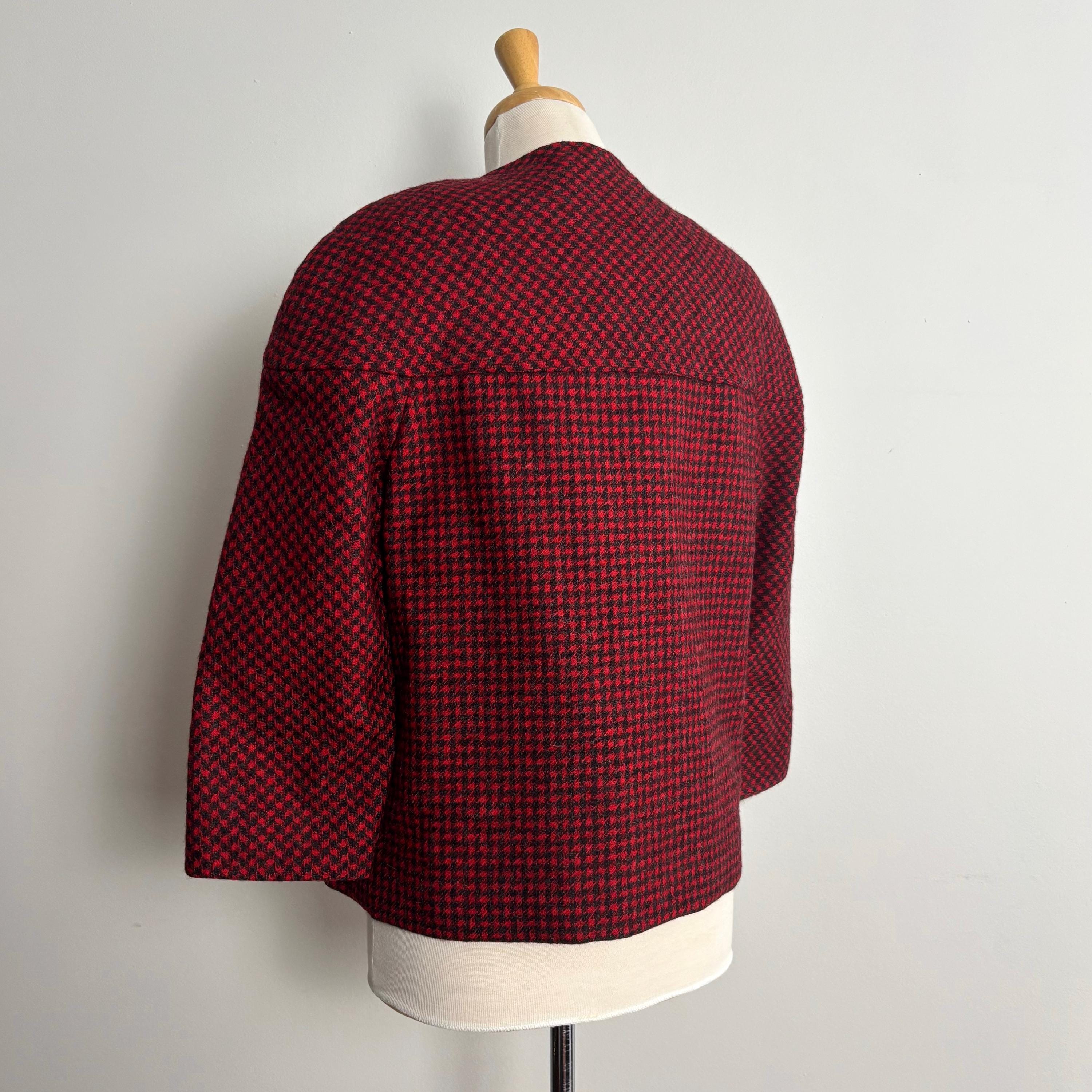 Incredible vintage 1960s Galanos jacket! This red and charcoal grey houndstooth jacket is amazing. Wool, with red satin lining. The shoulders are quite structured and really hold that nice round shape. The buttons are set off centre, with a snap closure inside to hold the neck closed. Unbeatable tailoring, as to be expected from this great couturier. The nipped in waist cuts a flattering silhouette. Bracelet length sleeves. Very small pockets, but pockets nevertheless. The hem is weighted at either side. No size tag, please see the measurements for best fit.