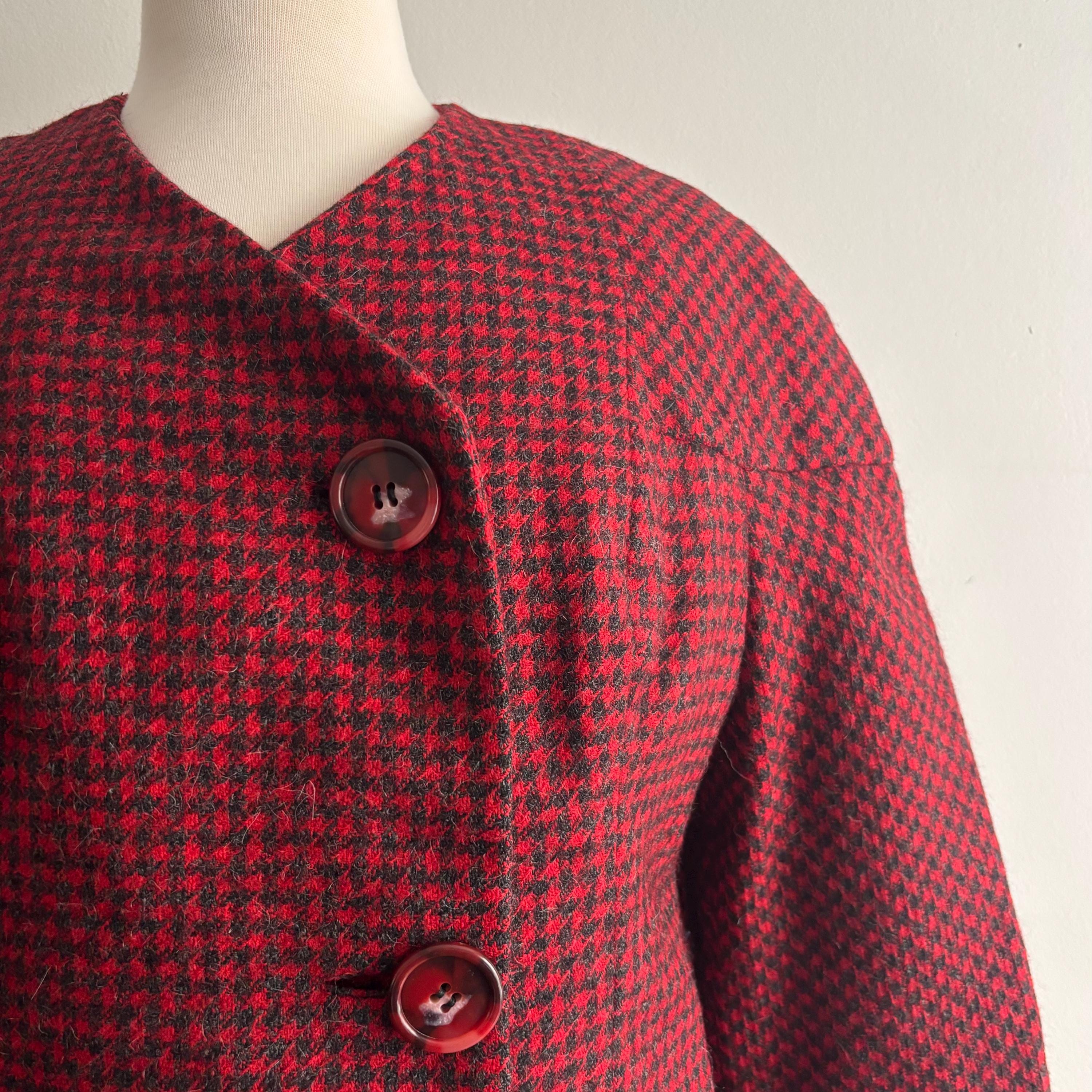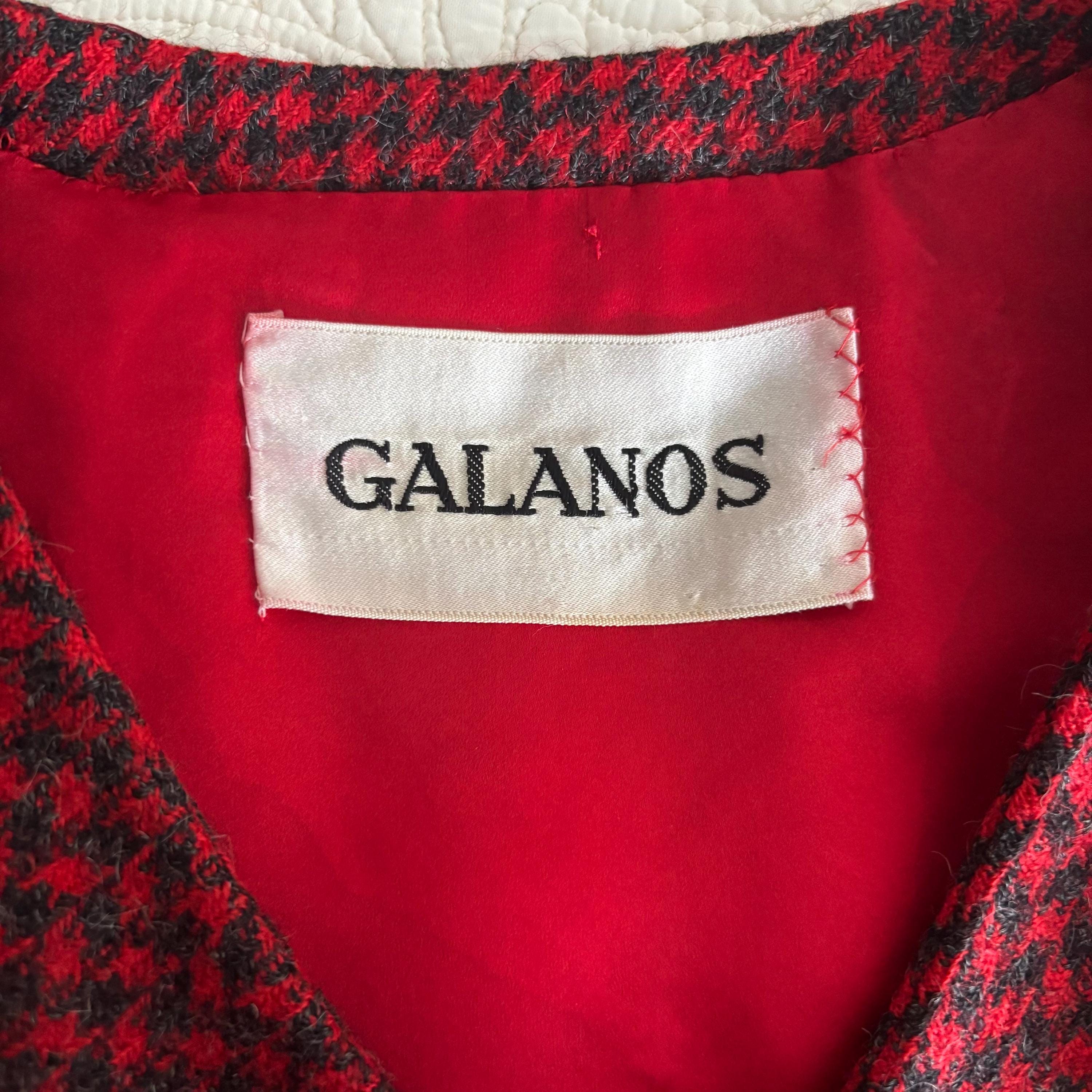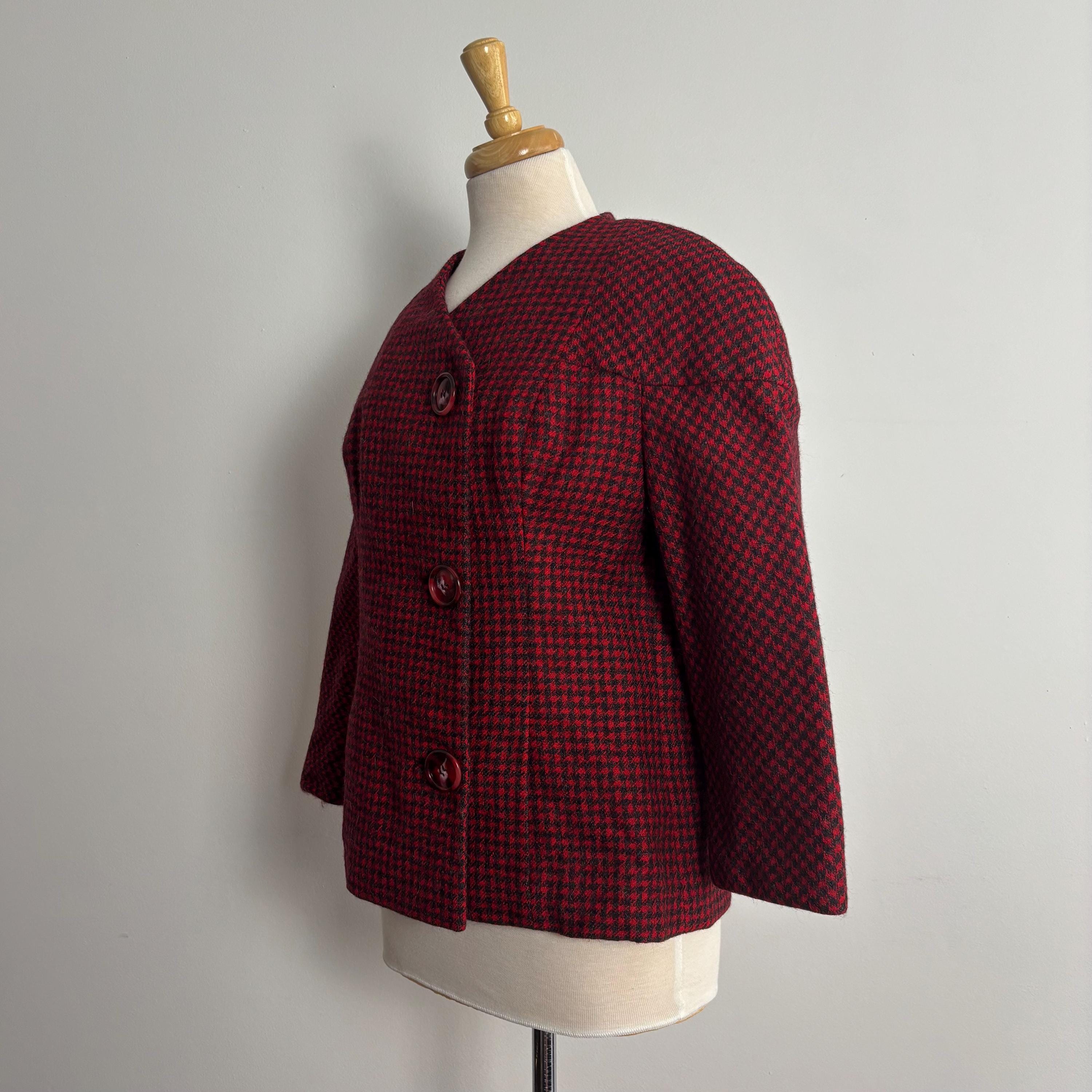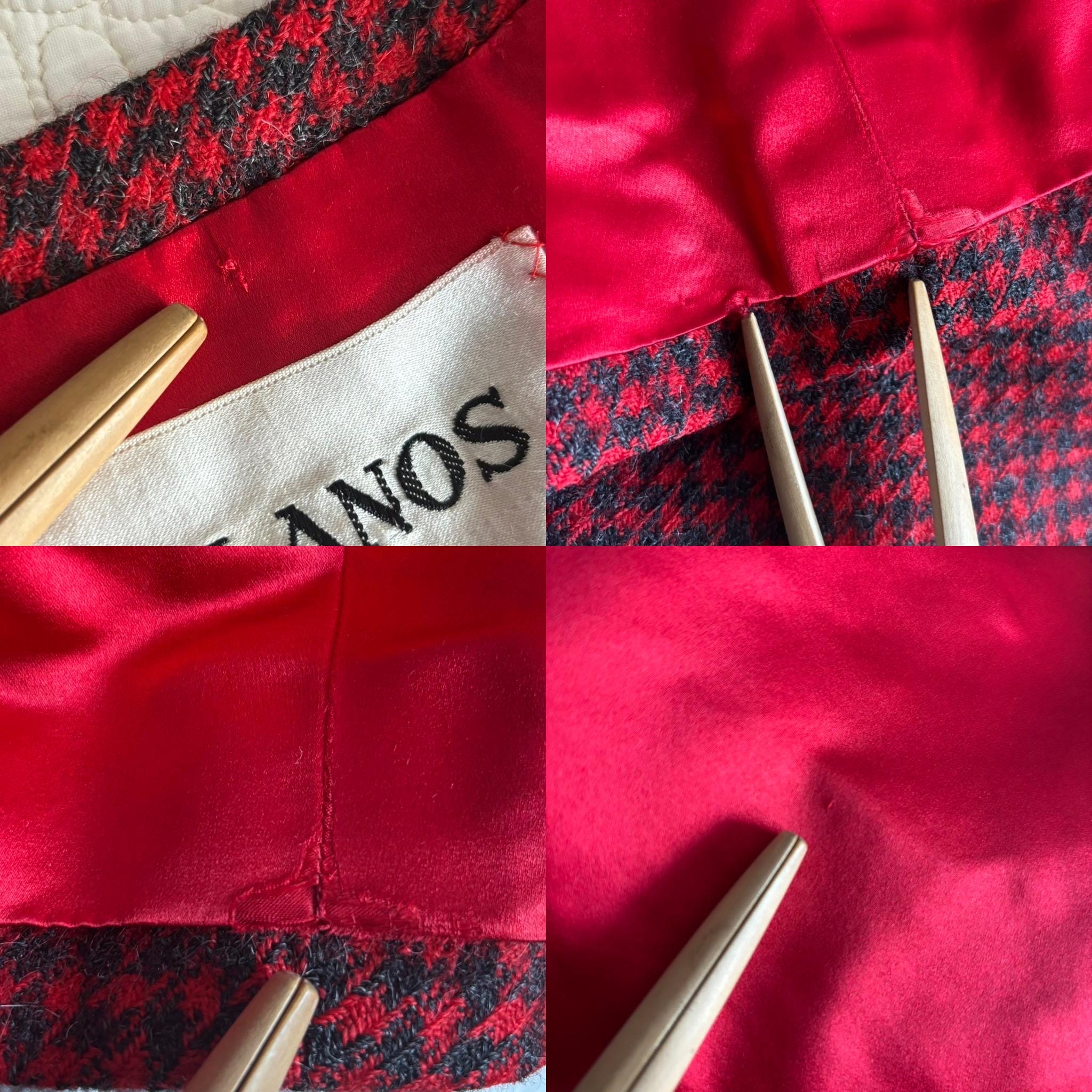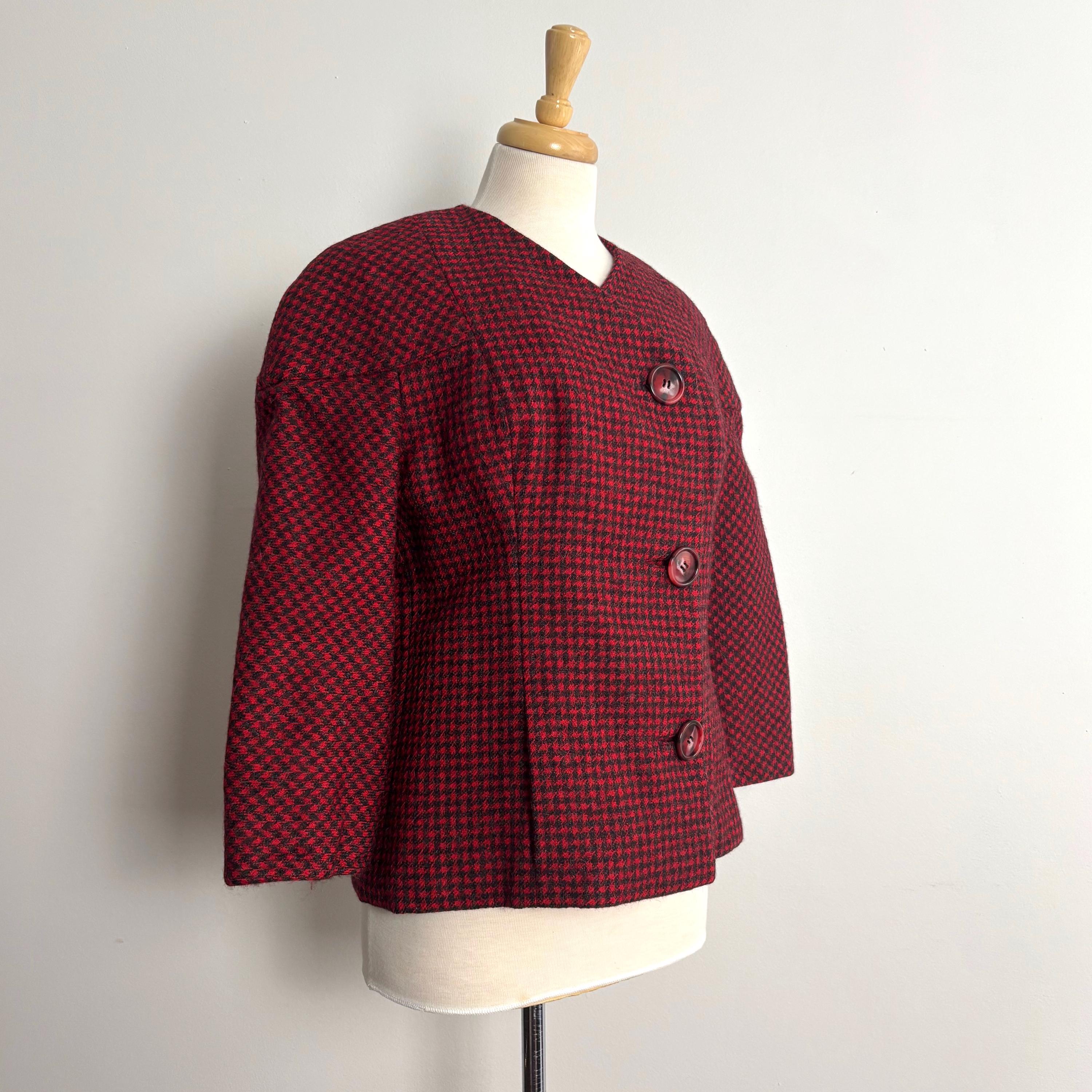 Incredible vintage 1960s Galanos jacket! This red and charcoal grey houndstooth jacket is amazing. Wool, with red satin lining. The shoulders are quite structured and really hold that nice round shape. The buttons are set off centre, with a snap closure inside to hold the neck closed. Unbeatable tailoring, as to be expected from this great couturier. The nipped in waist cuts a flattering silhouette. Bracelet length sleeves. Very small pockets, but pockets nevertheless. The hem is weighted at either side. No size tag, please see the measurements for best fit.
