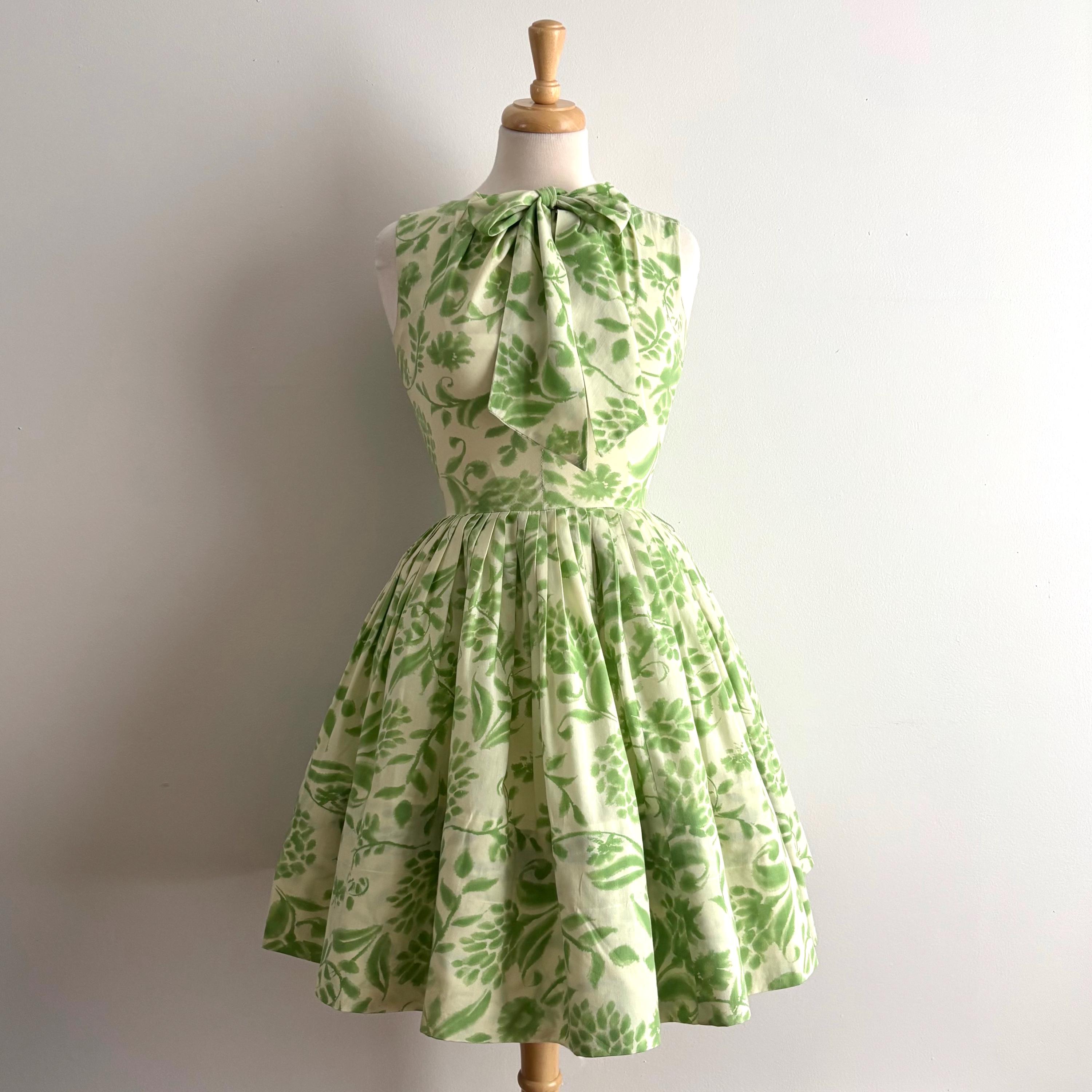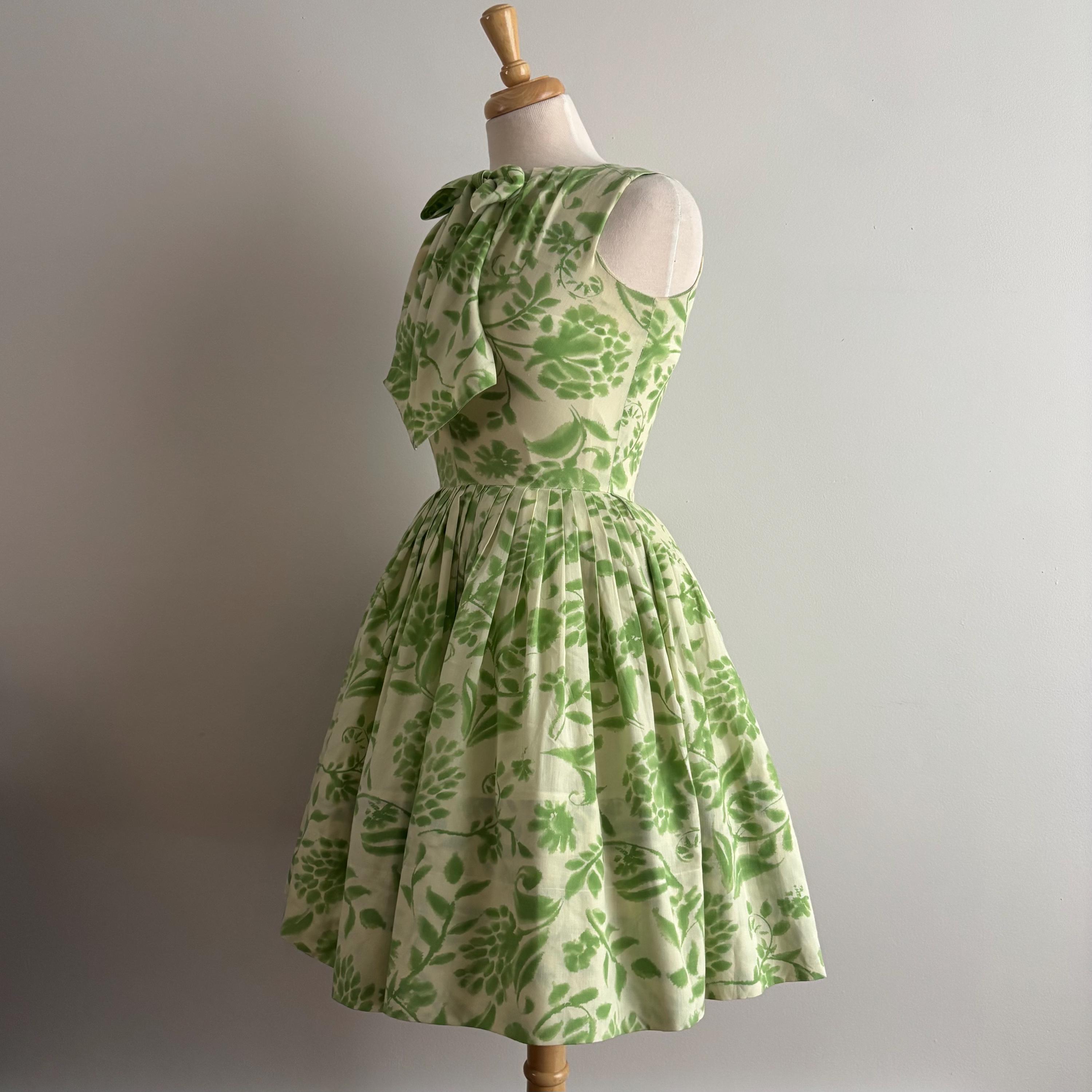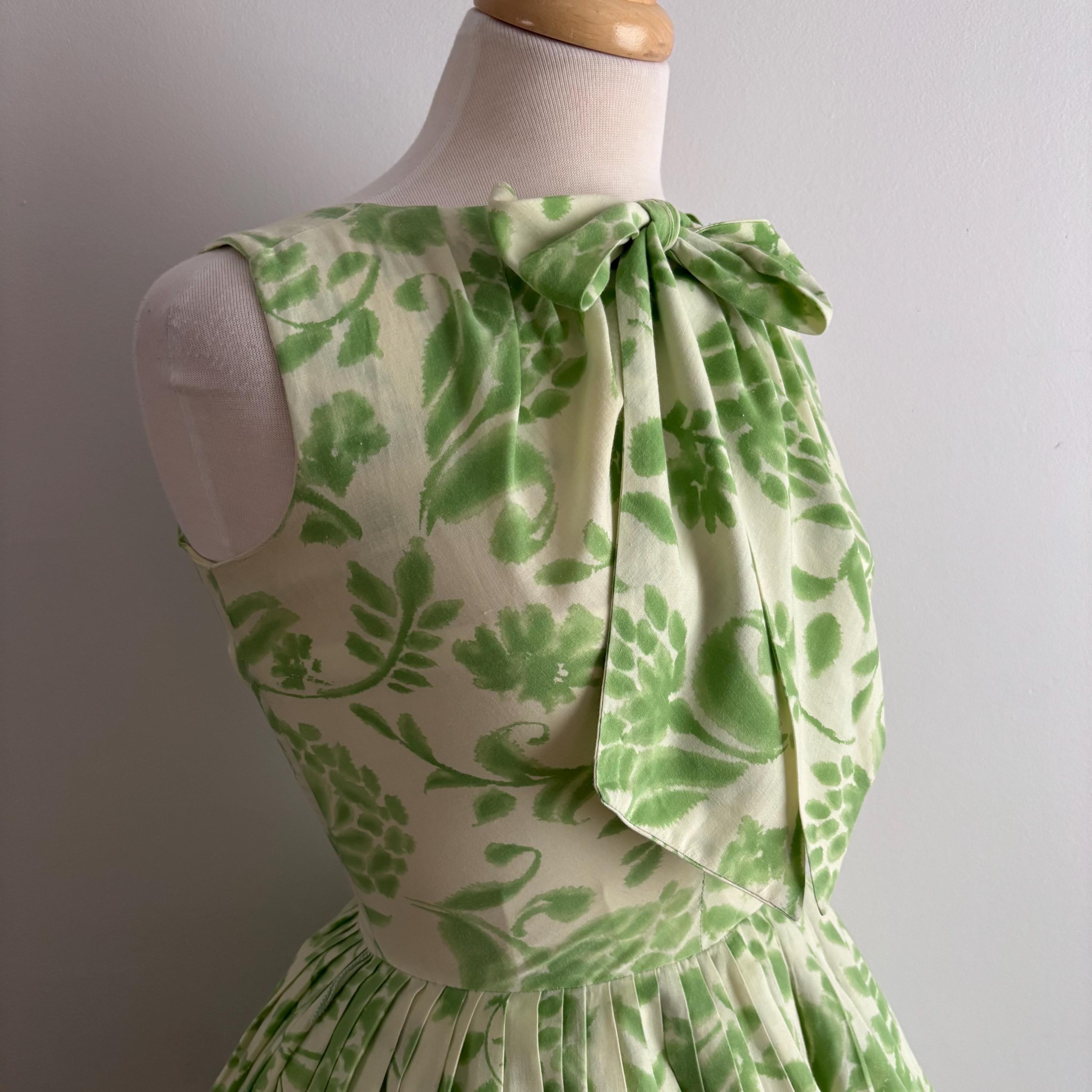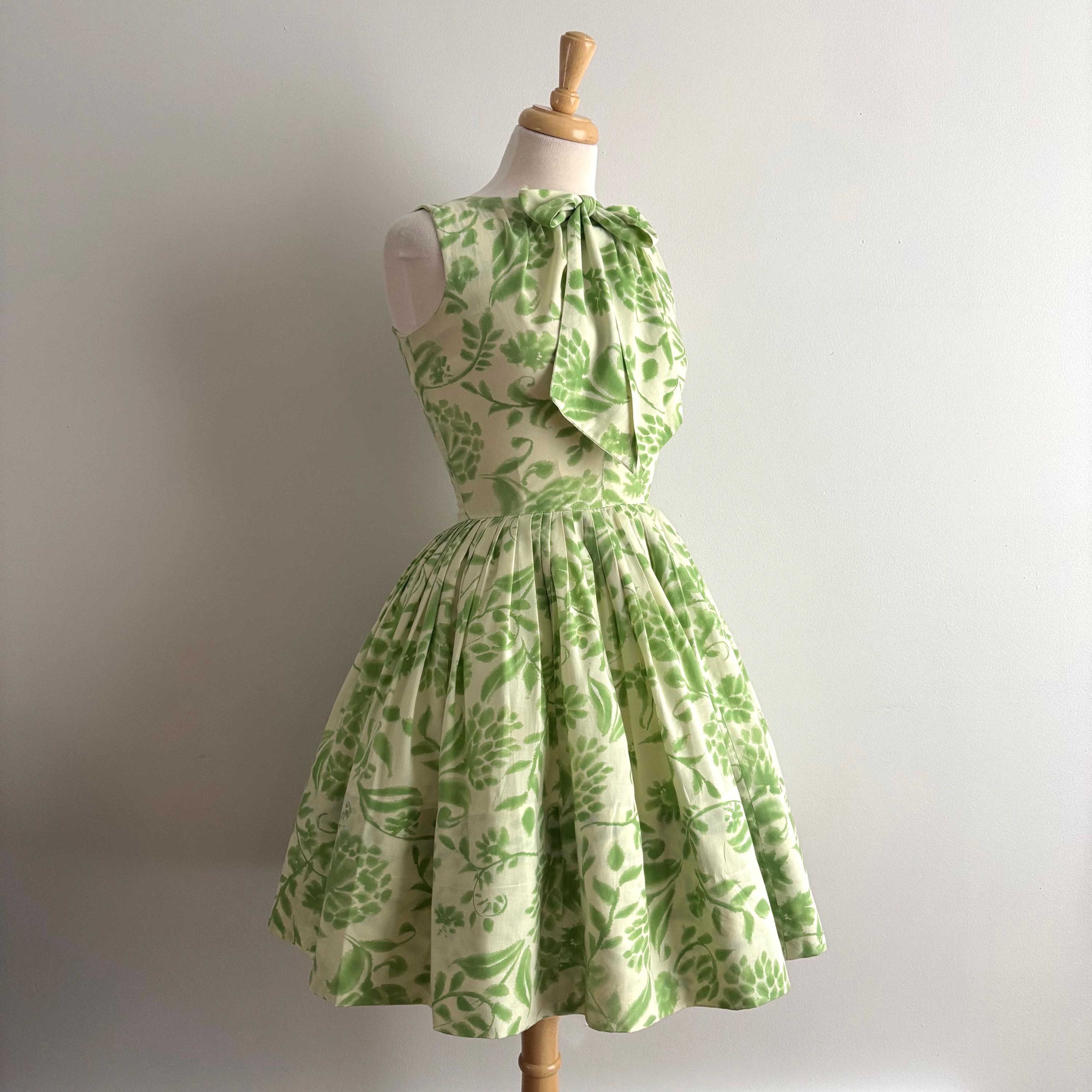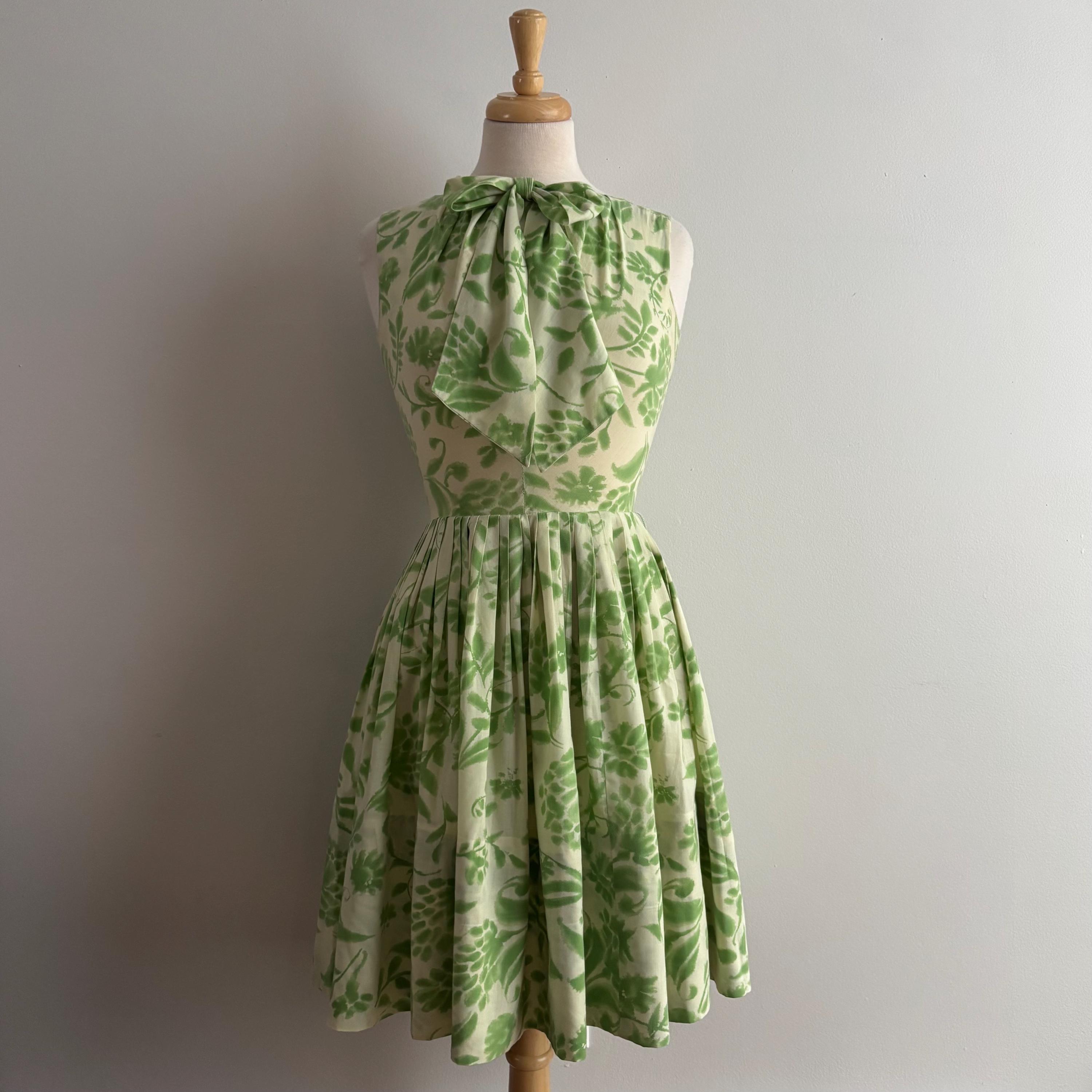 Beautiful vintage 1960s green floral print dress made by Gay Gibson. The dress features a pleated neckline and large bow. The skirt is rather full and is pictured here with and without a crinoline (not included). There is a metal zipper to close at the back. Lightweight cotton-feel fabric. The herbal green shades are really lovely, and the painterly floral print adds to the botanical beauty of this special dress. Please see the measurements for best fit!