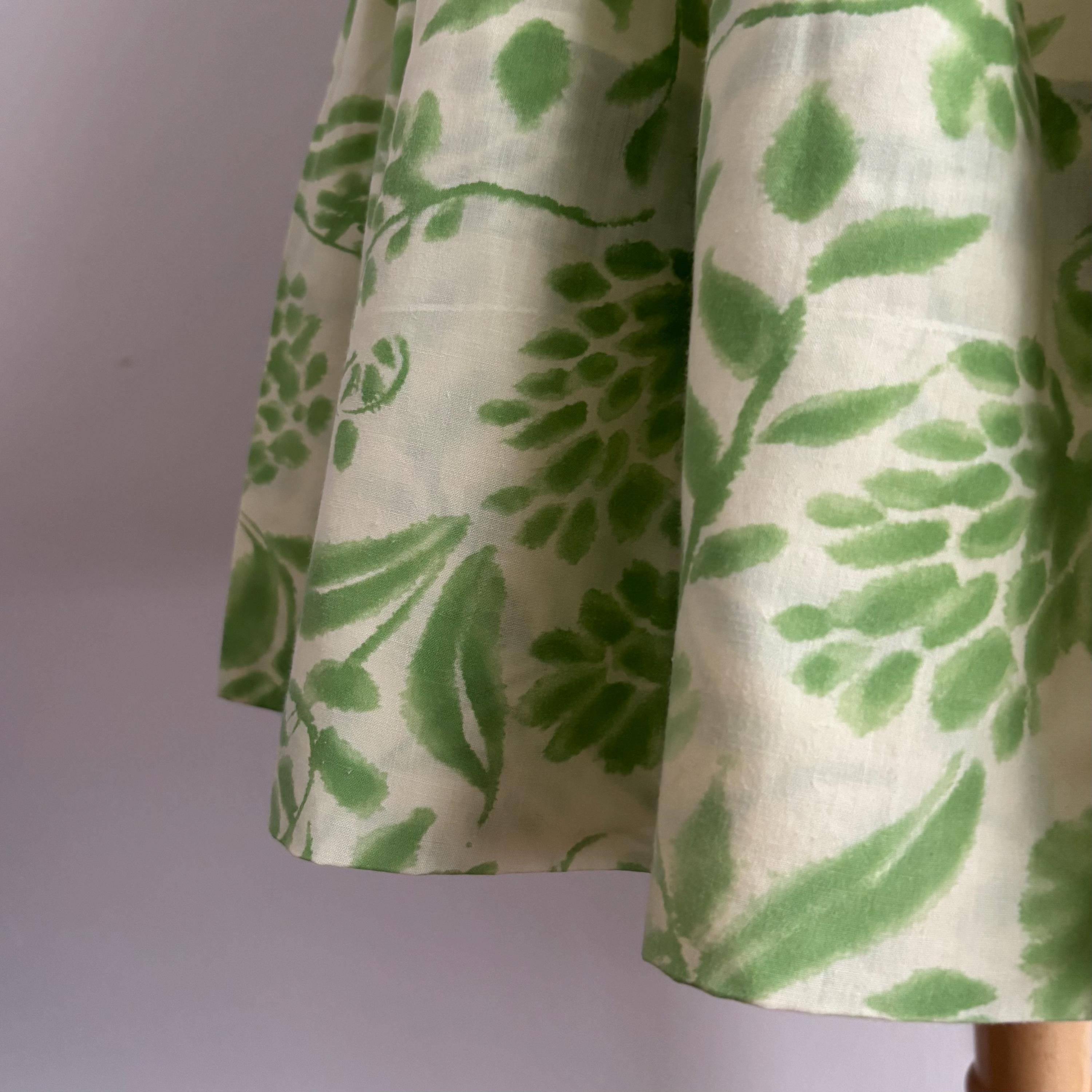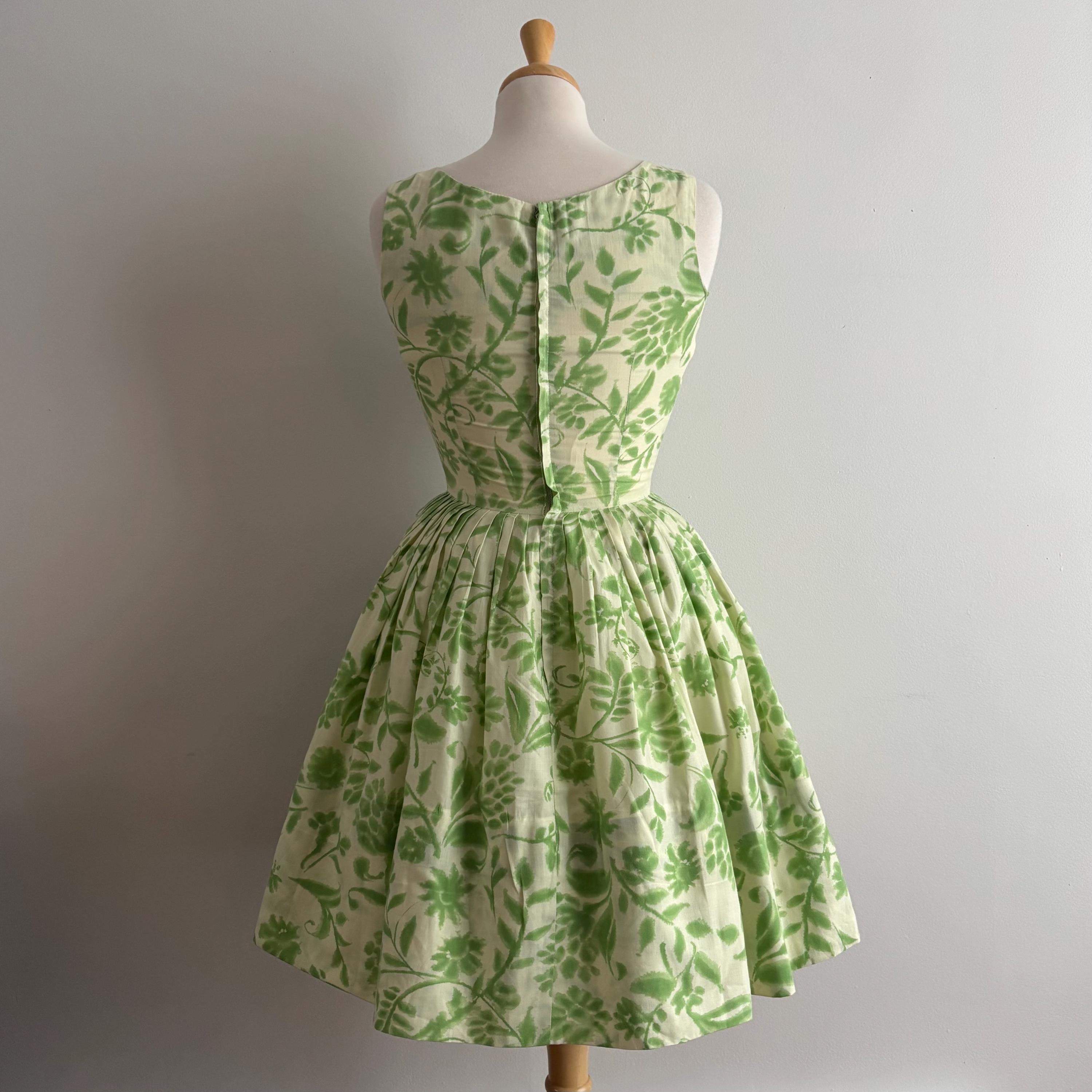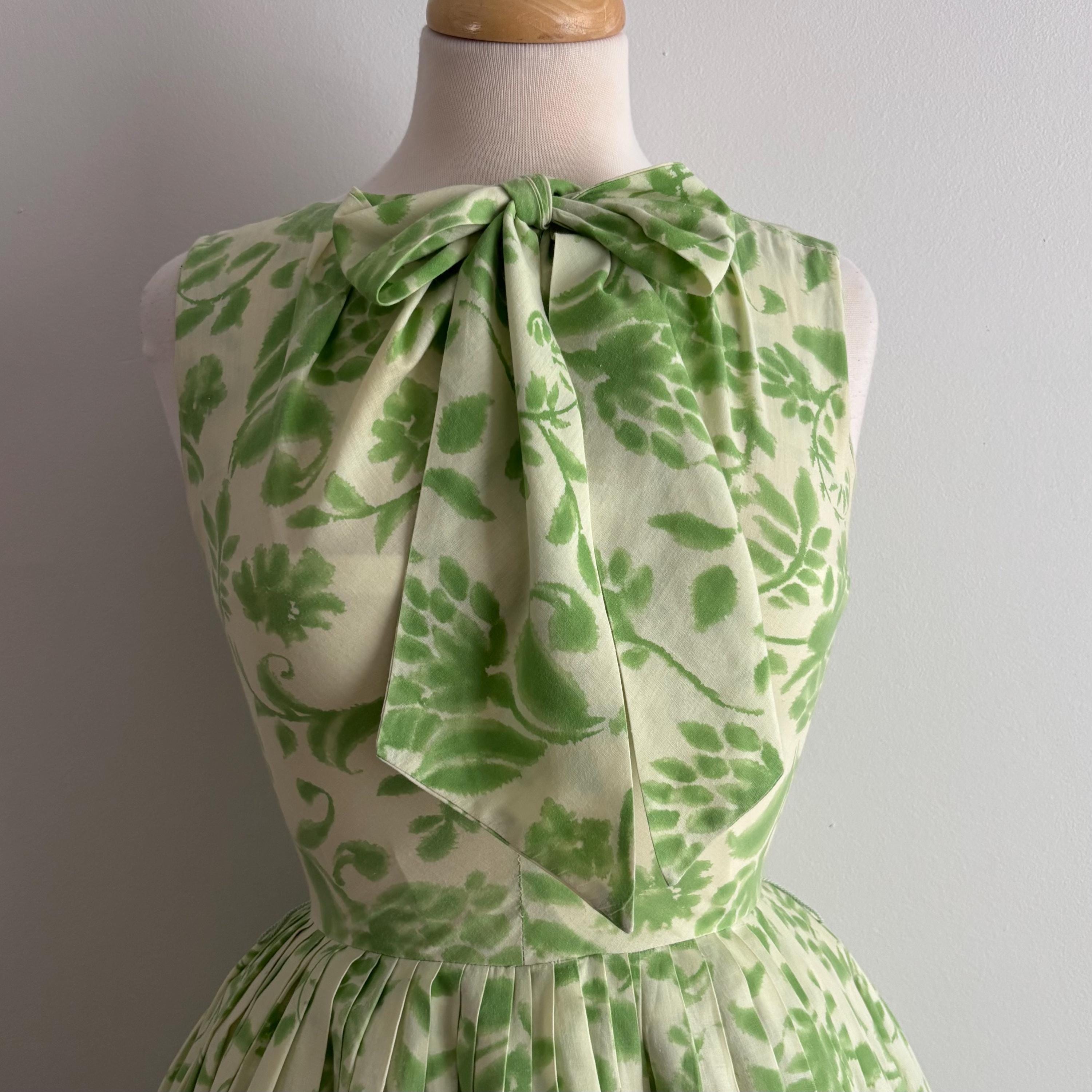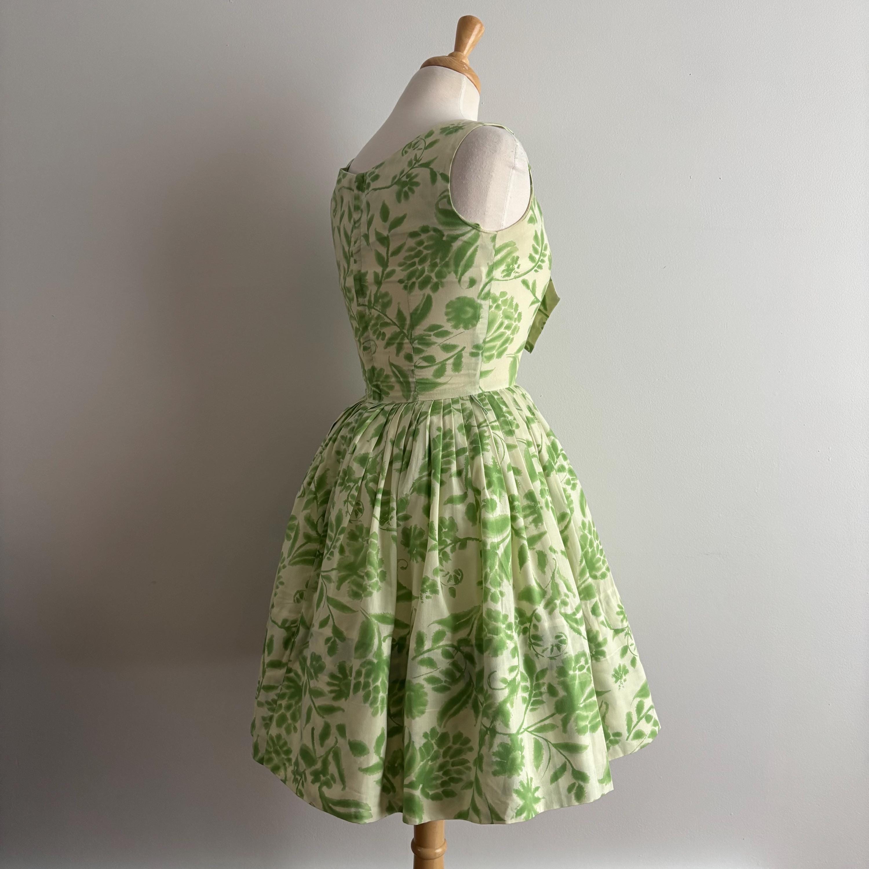 Beautiful vintage 1960s green floral print dress made by Gay Gibson. The dress features a pleated neckline and large bow. The skirt is rather full and is pictured here with and without a crinoline (not included). There is a metal zipper to close at the back. Lightweight cotton-feel fabric. The herbal green shades are really lovely, and the painterly floral print adds to the botanical beauty of this special dress. Please see the measurements for best fit!