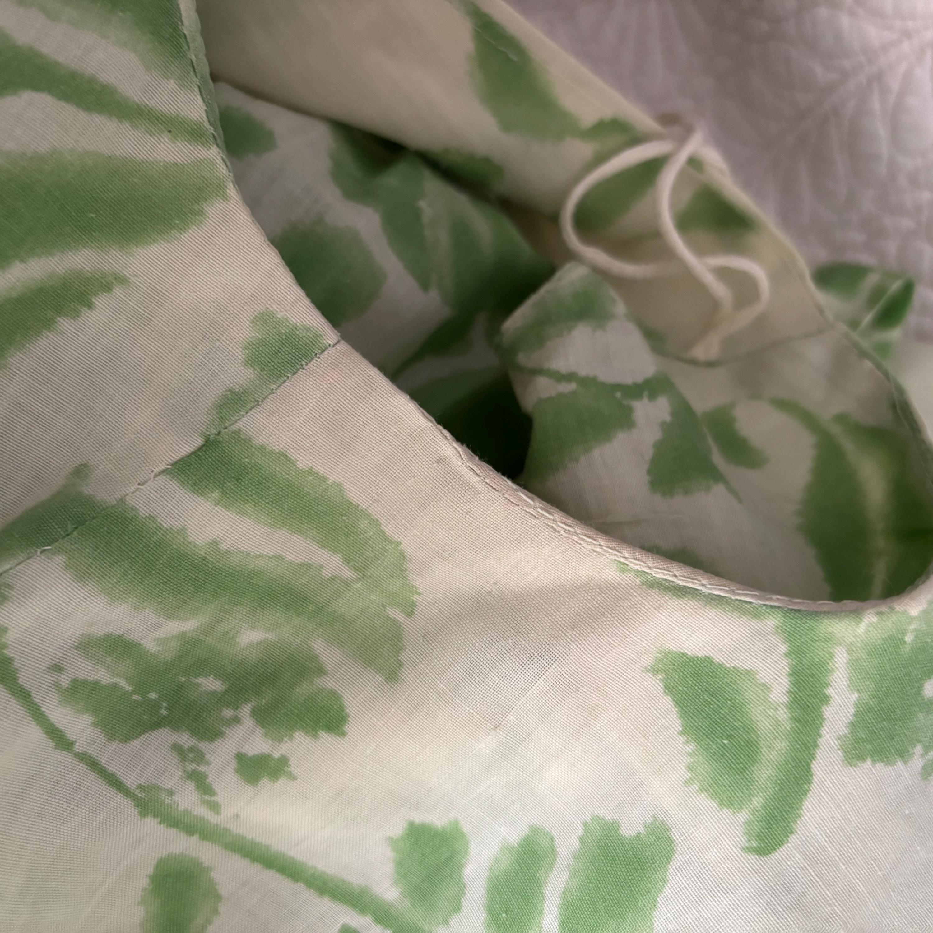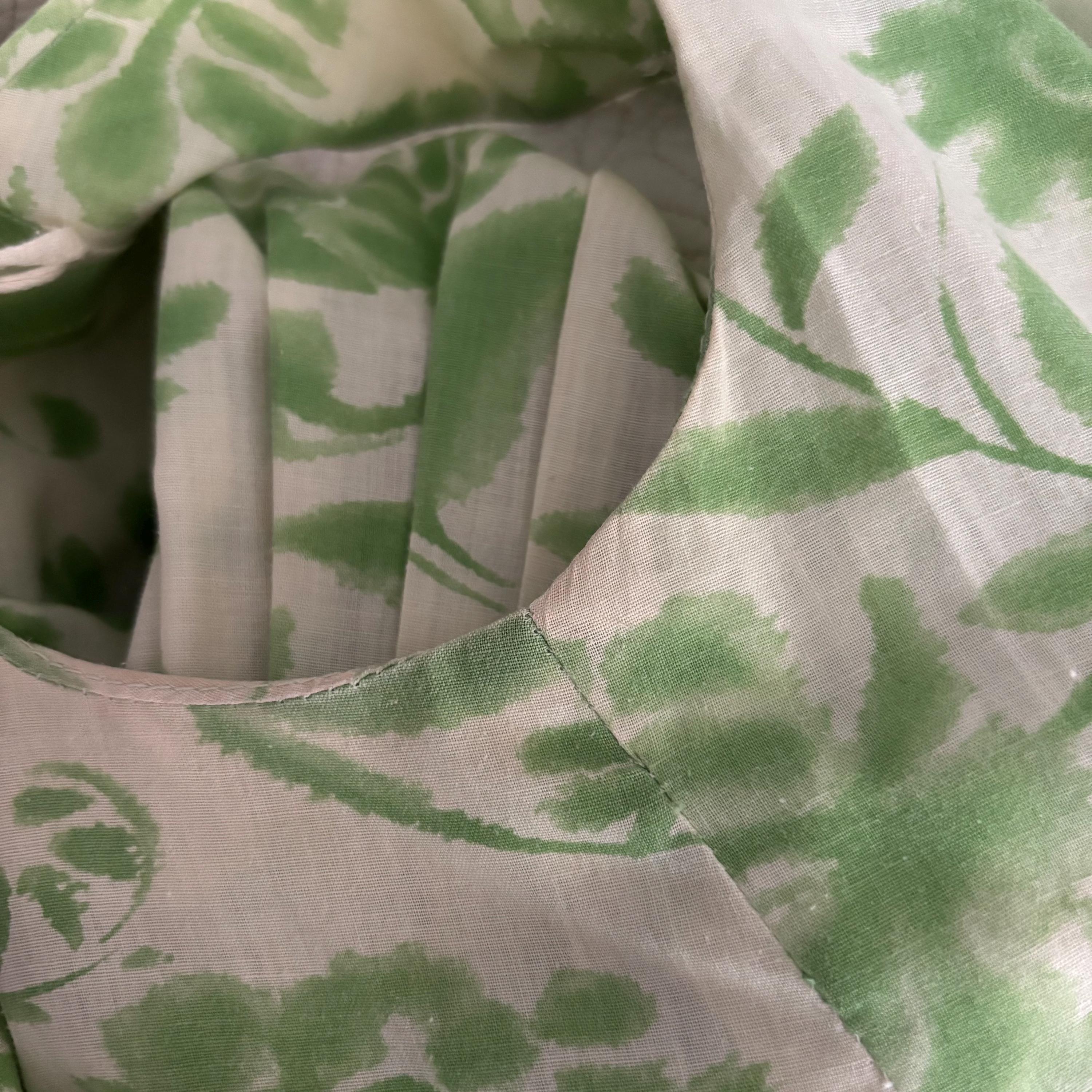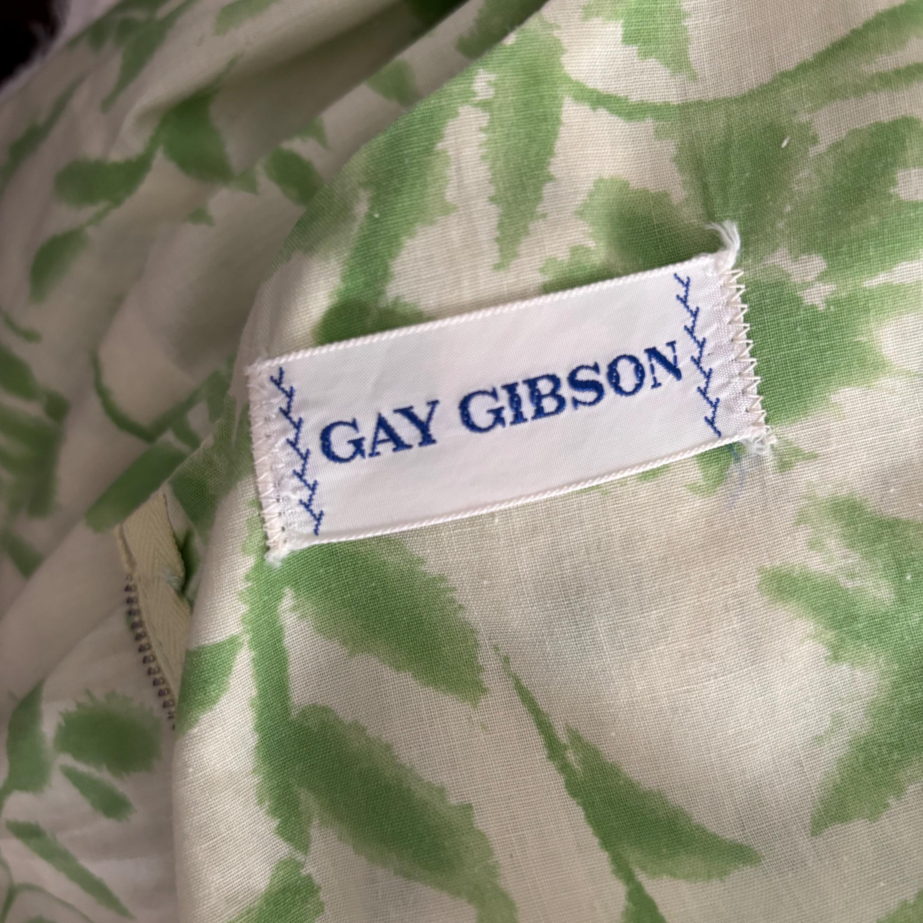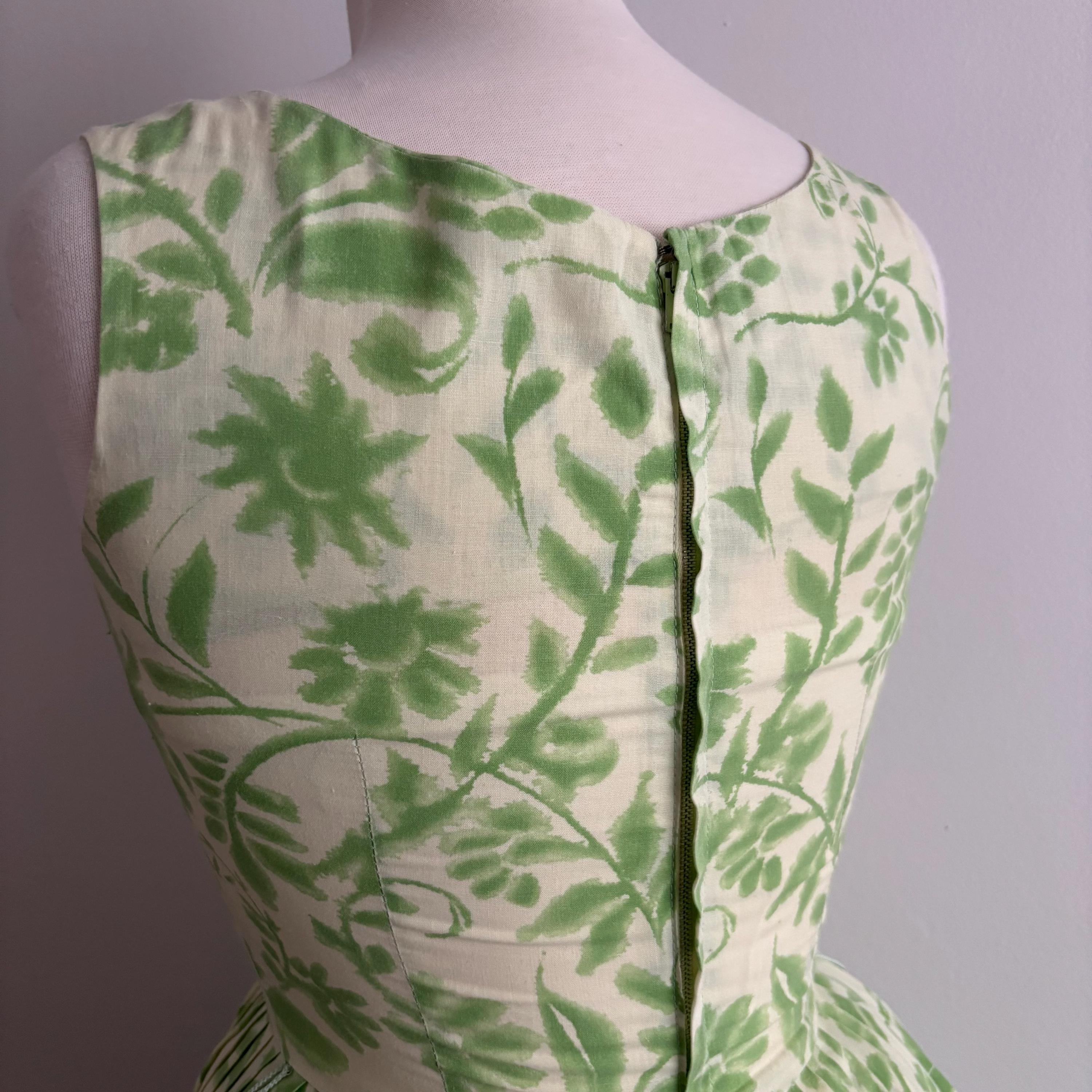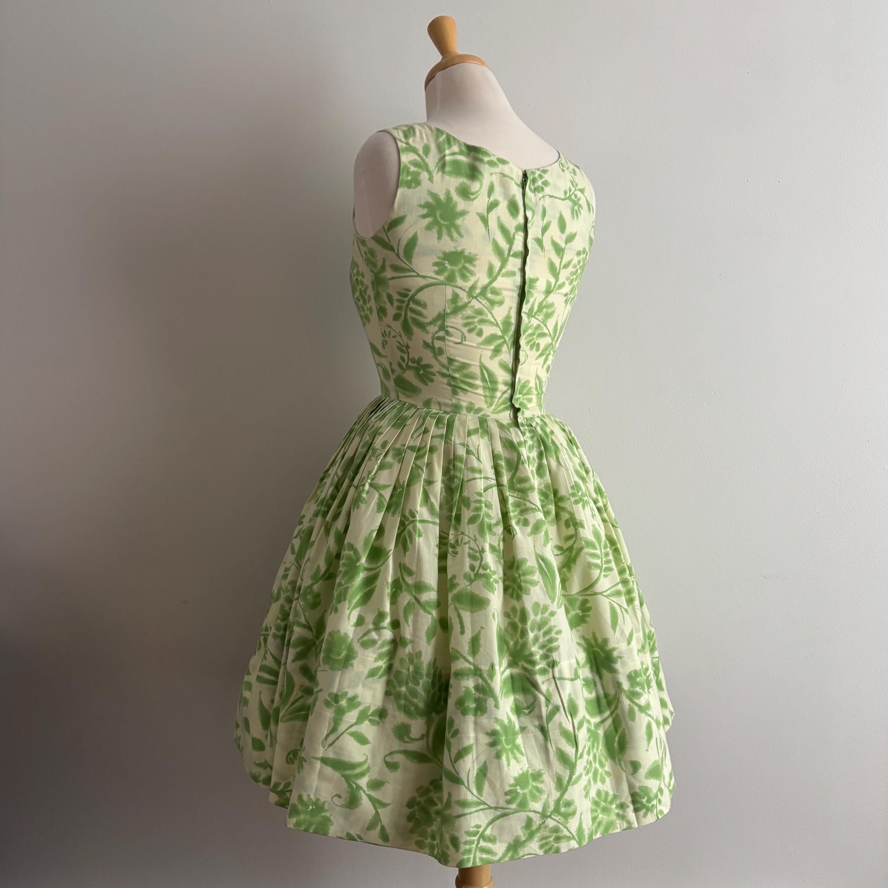 Beautiful vintage 1960s green floral print dress made by Gay Gibson. The dress features a pleated neckline and large bow. The skirt is rather full and is pictured here with and without a crinoline (not included). There is a metal zipper to close at the back. Lightweight cotton-feel fabric. The herbal green shades are really lovely, and the painterly floral print adds to the botanical beauty of this special dress. Please see the measurements for best fit!