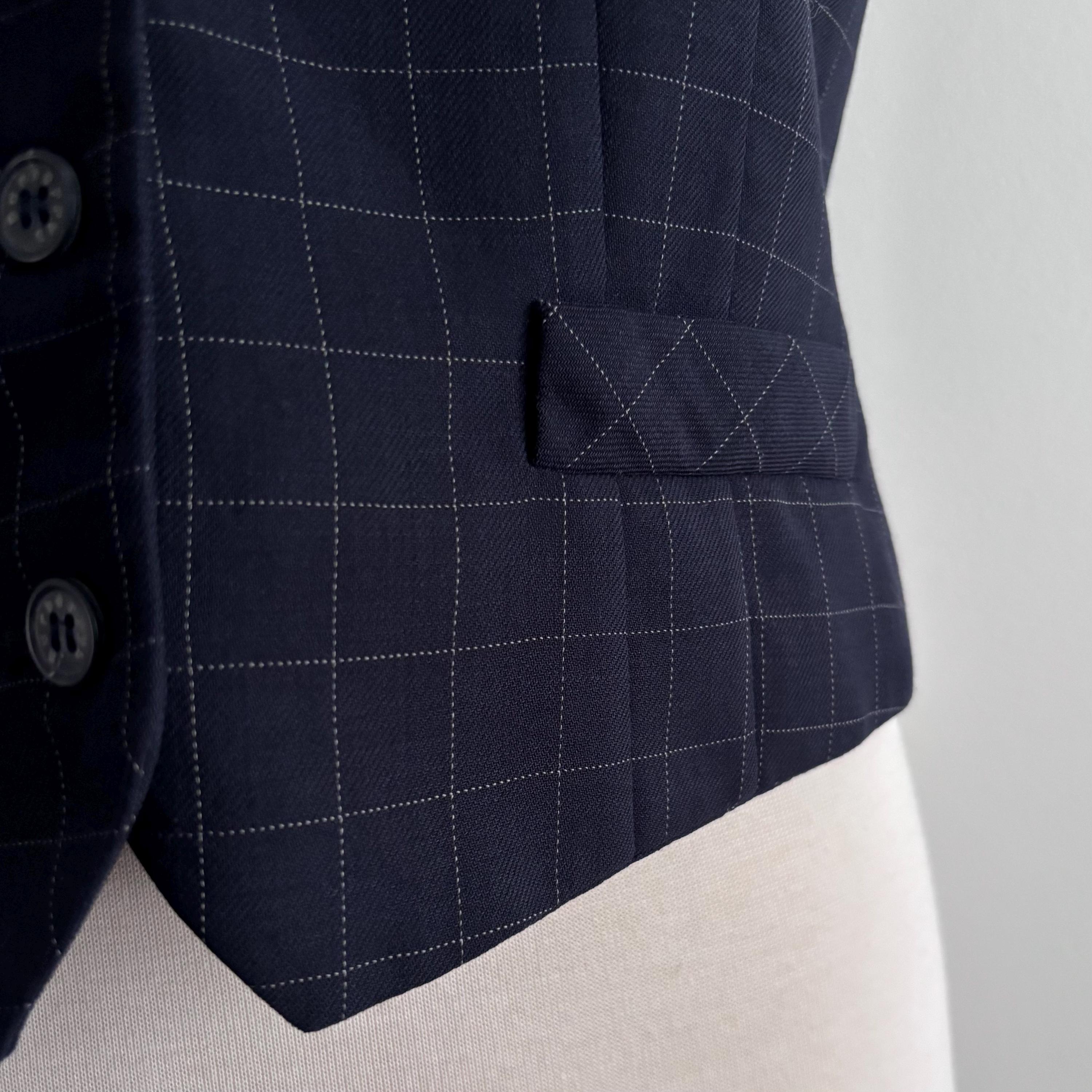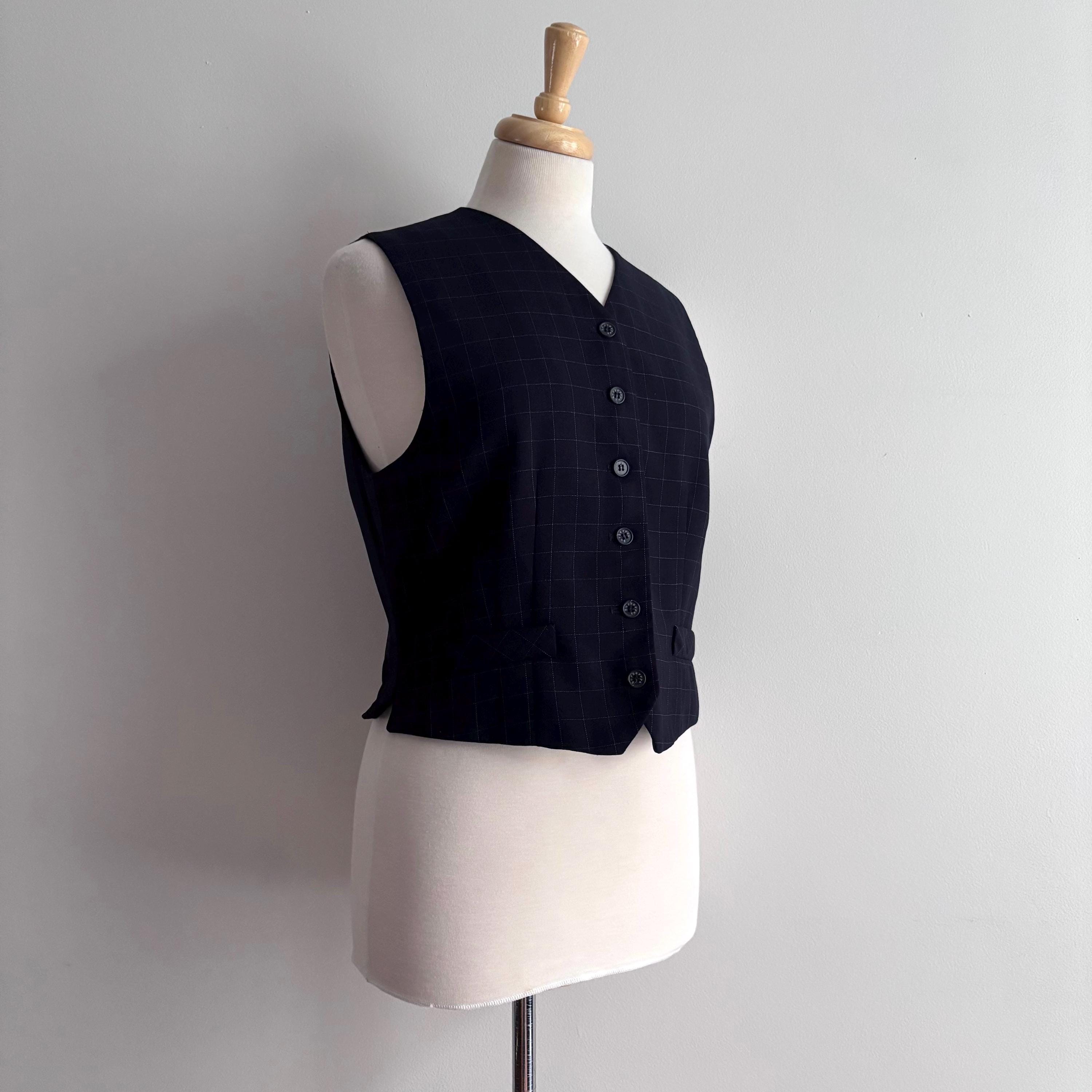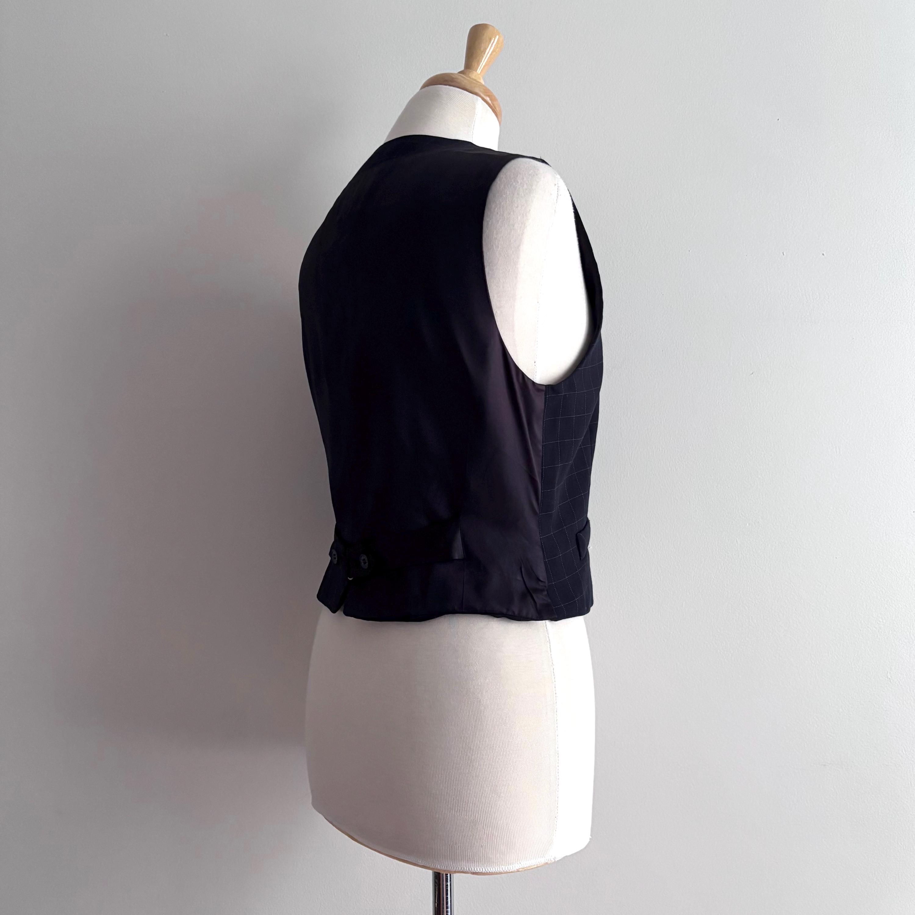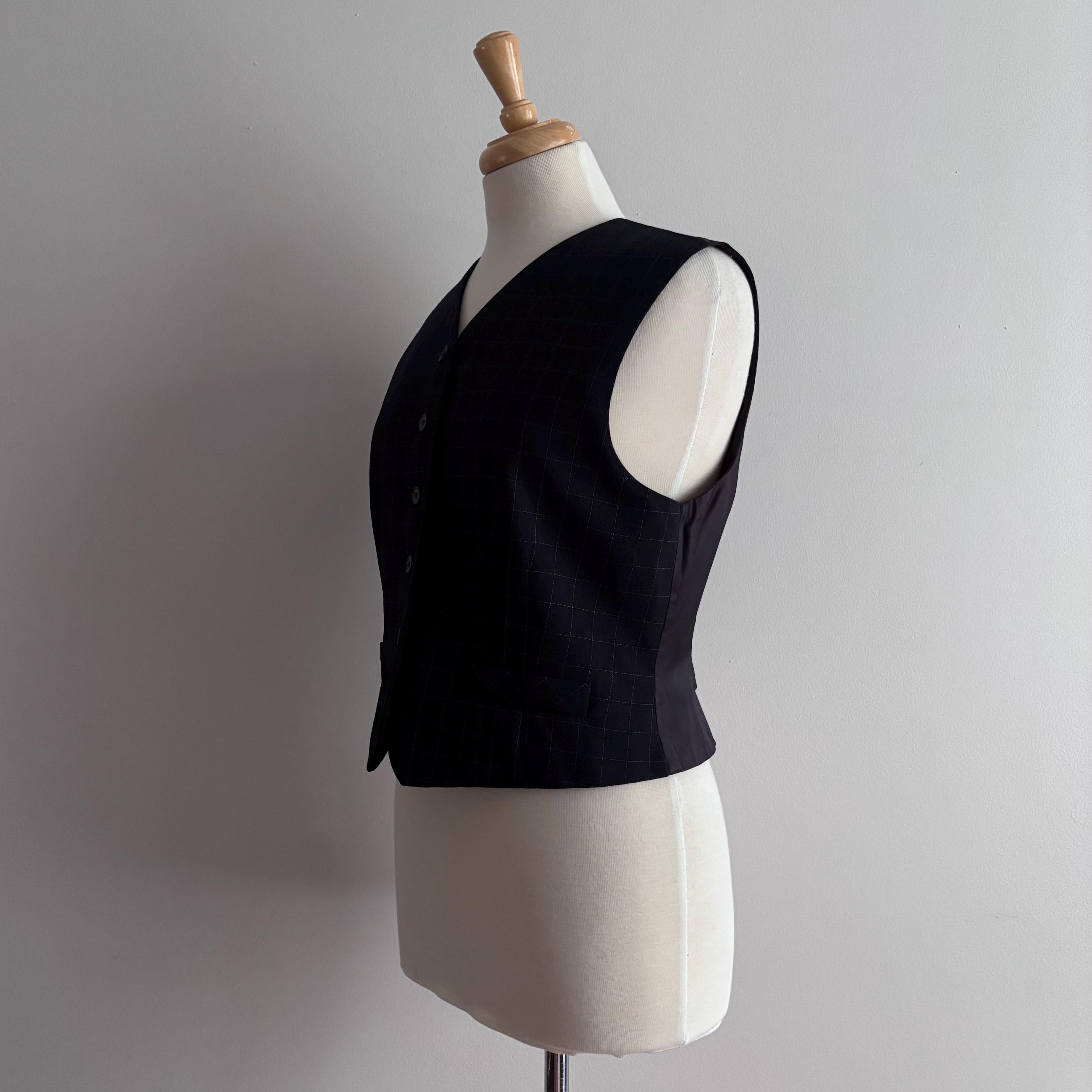 A classic vintage piece! This authentic 90s Burberry vest is made of dark navy wool, with a windowpane check on the front, and a solid fabric at the back. The vest buttons down the front with branded buttons. The waist can be adjust with the buckle at the back. Fully lined. Made in the USA of 100% wool. Size 10, but fits small by modern standards, please see the measurements for best fit.