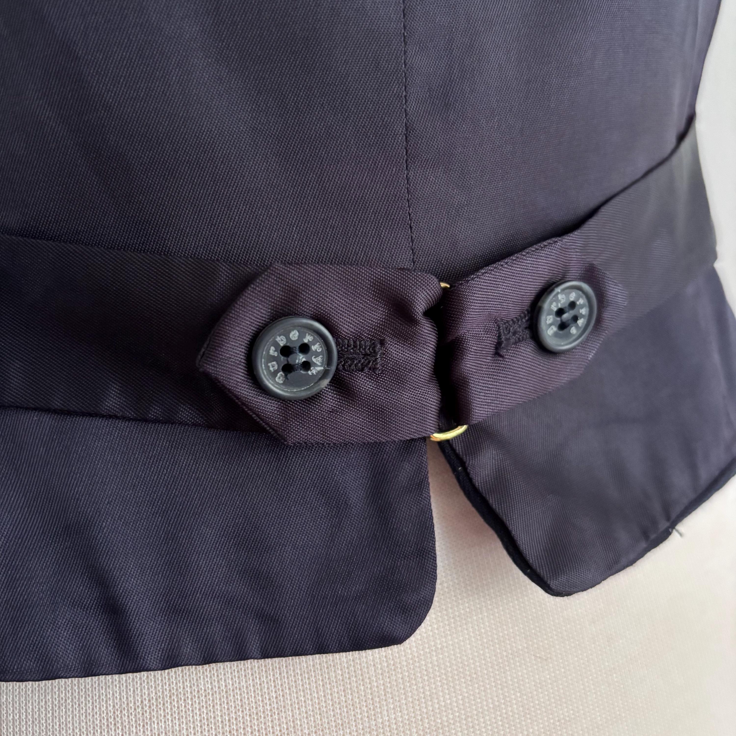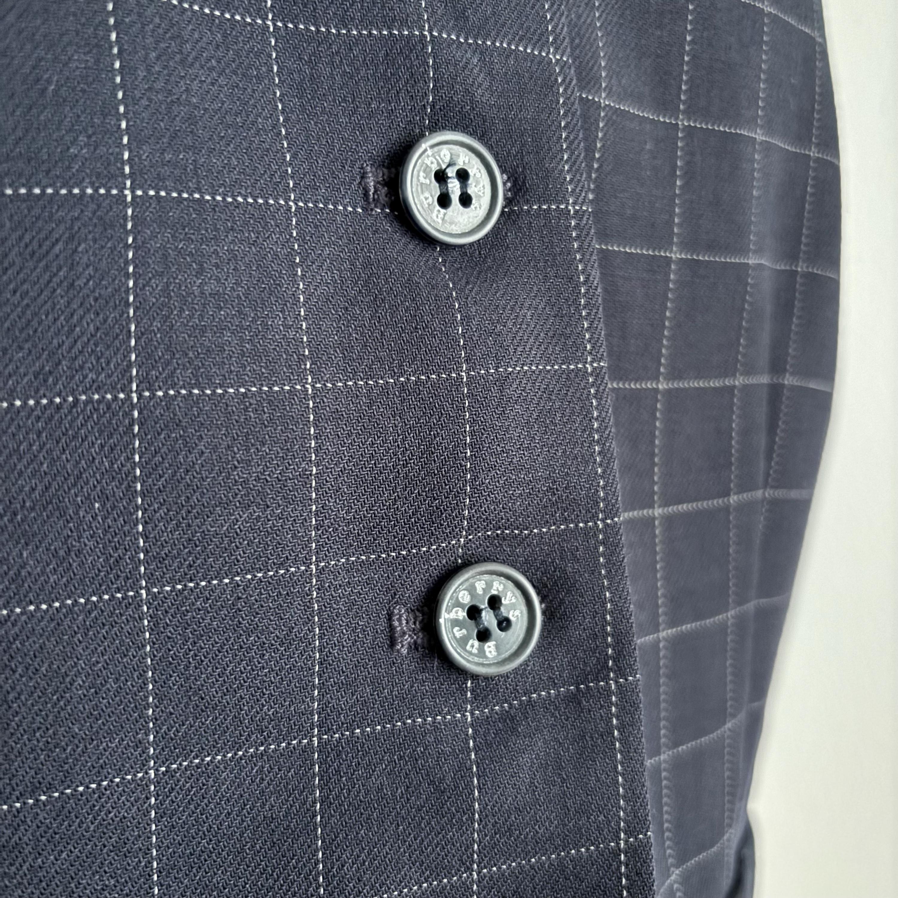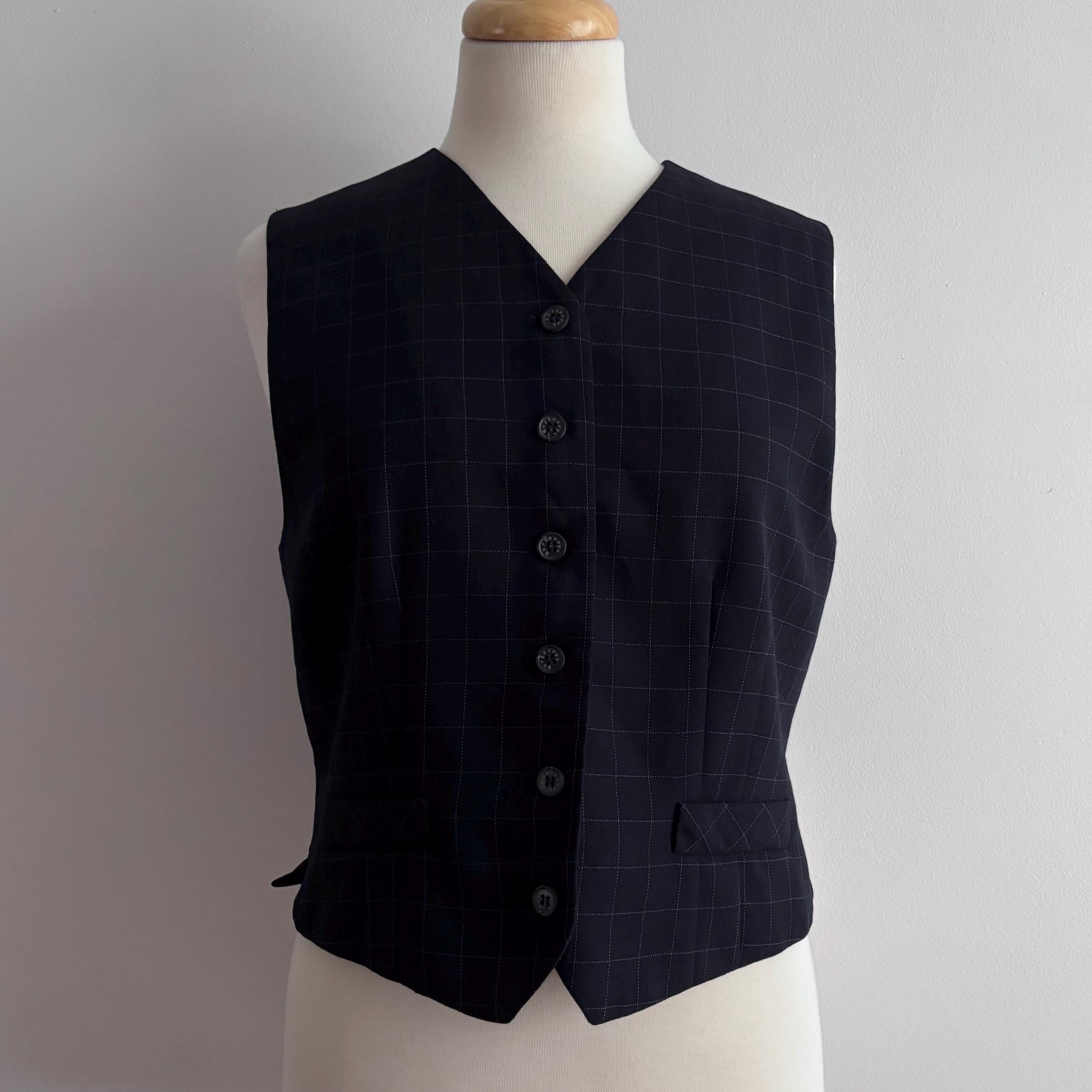 A classic vintage piece! This authentic 90s Burberry vest is made of dark navy wool, with a windowpane check on the front, and a solid fabric at the back. The vest buttons down the front with branded buttons. The waist can be adjust with the buckle at the back. Fully lined. Made in the USA of 100% wool. Size 10, but fits small by modern standards, please see the measurements for best fit.
