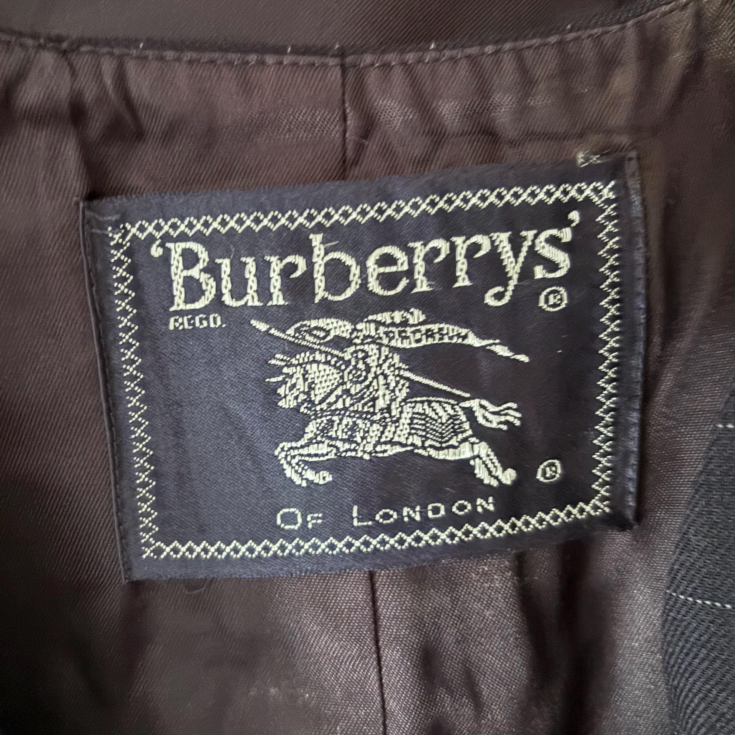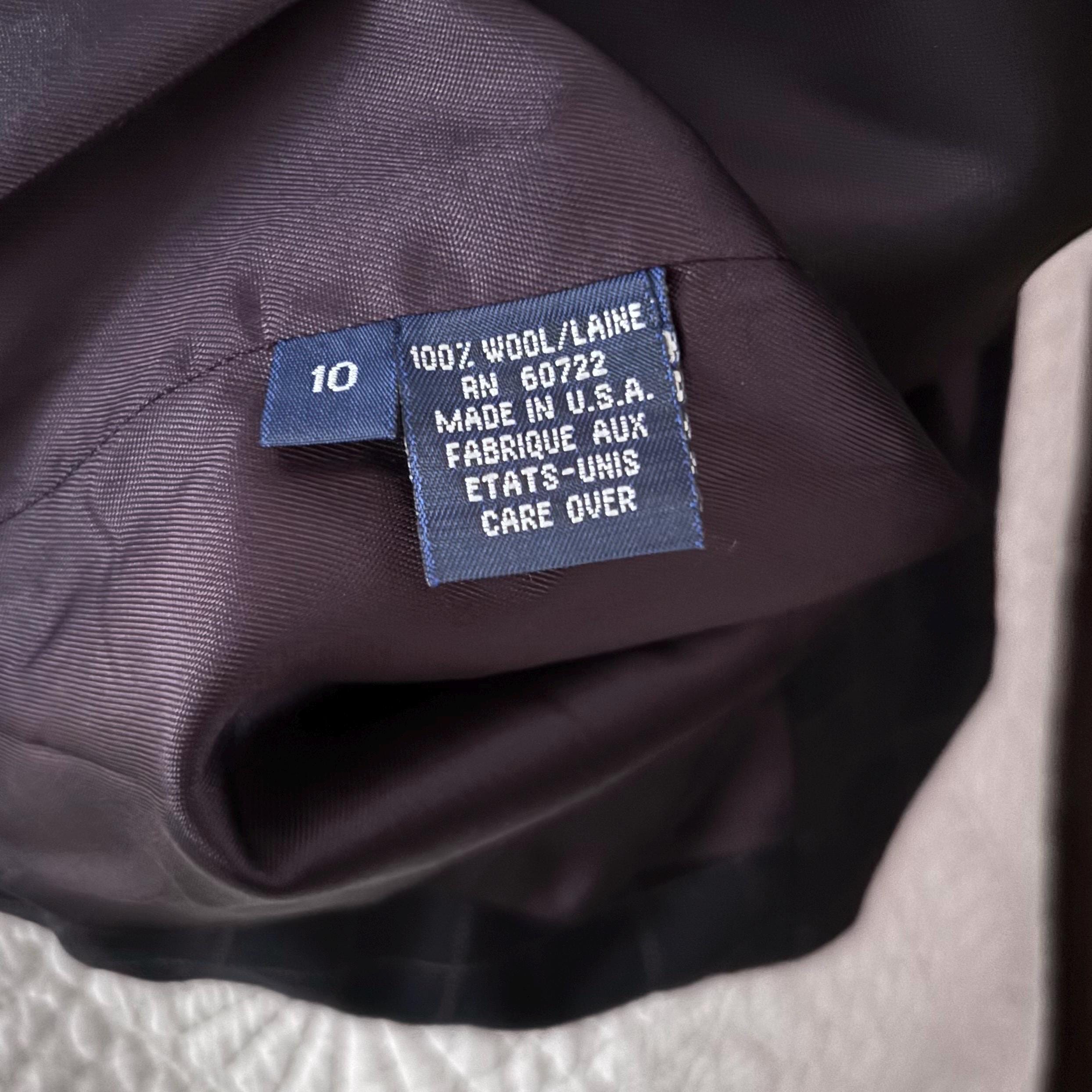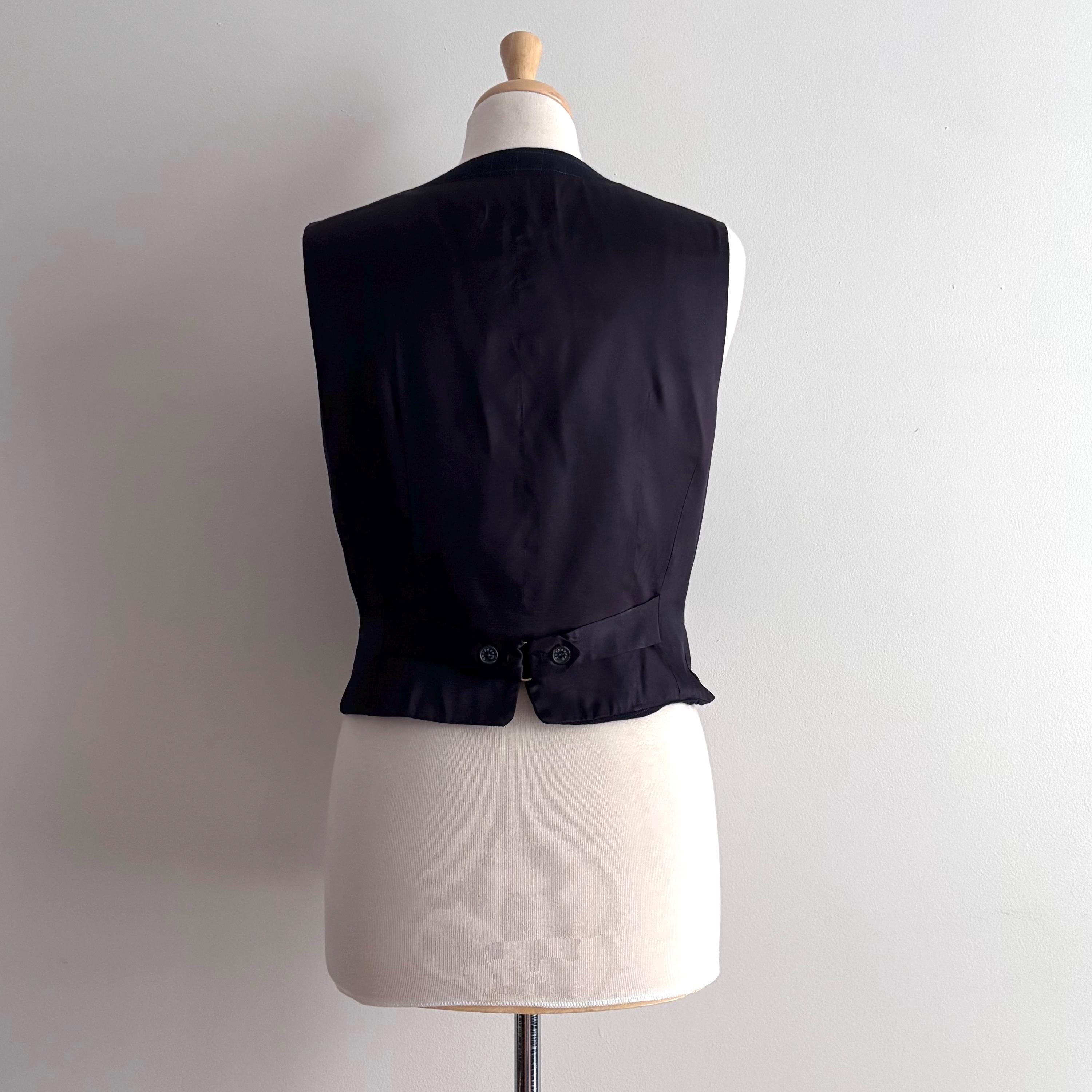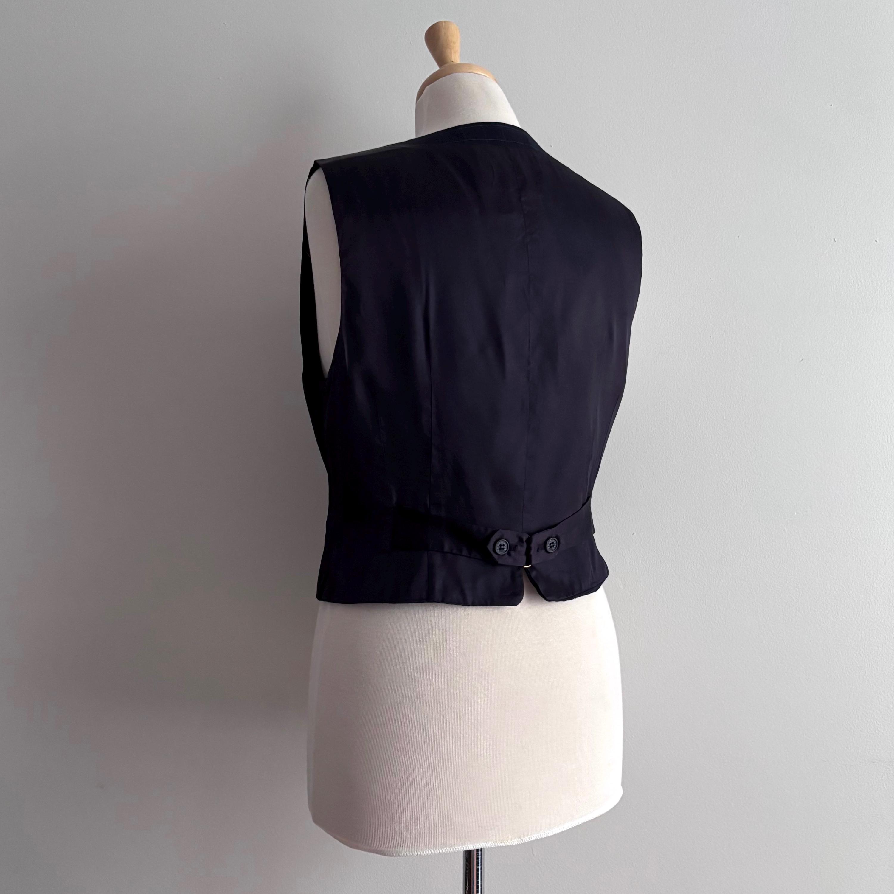 A classic vintage piece! This authentic 90s Burberry vest is made of dark navy wool, with a windowpane check on the front, and a solid fabric at the back. The vest buttons down the front with branded buttons. The waist can be adjust with the buckle at the back. Fully lined. Made in the USA of 100% wool. Size 10, but fits small by modern standards, please see the measurements for best fit.