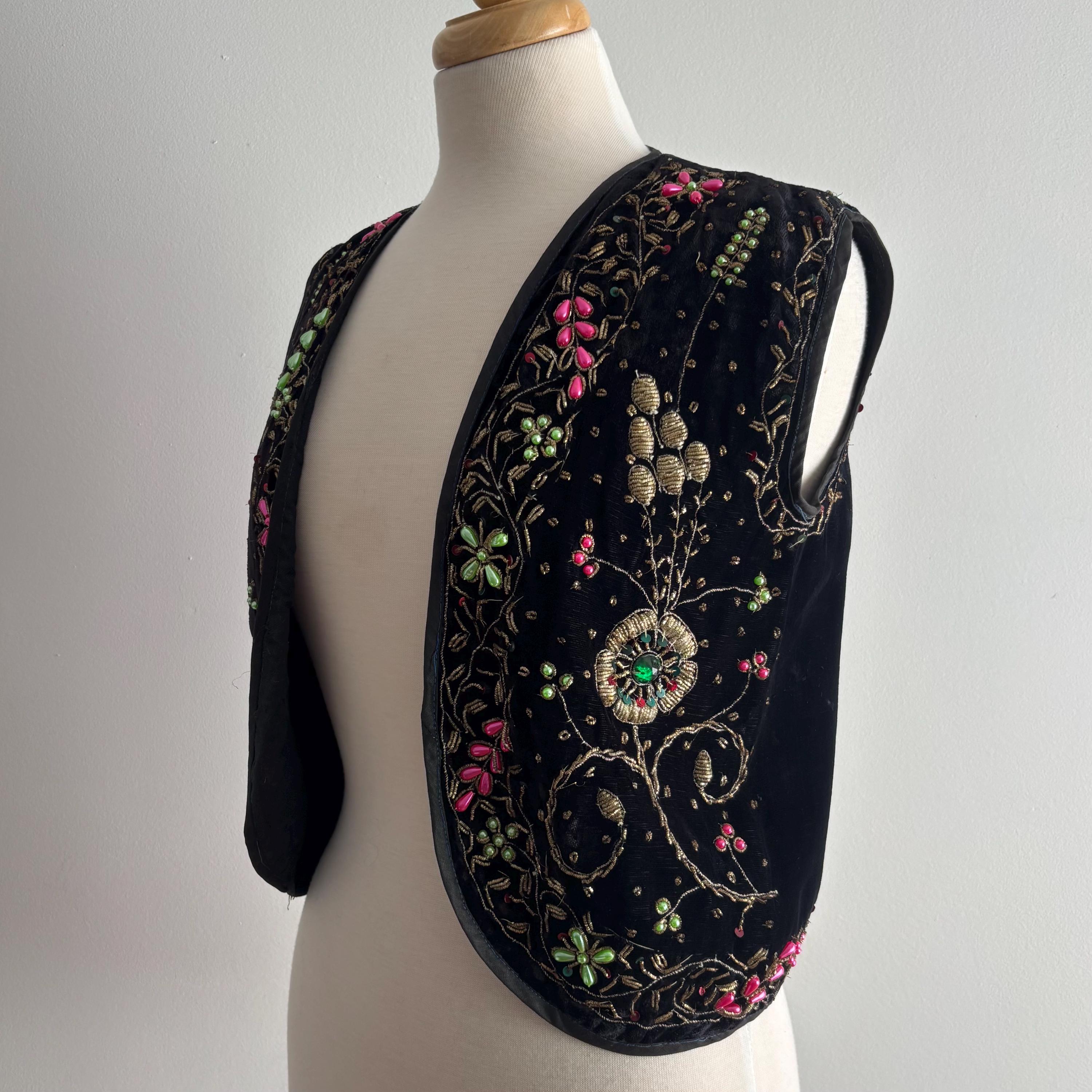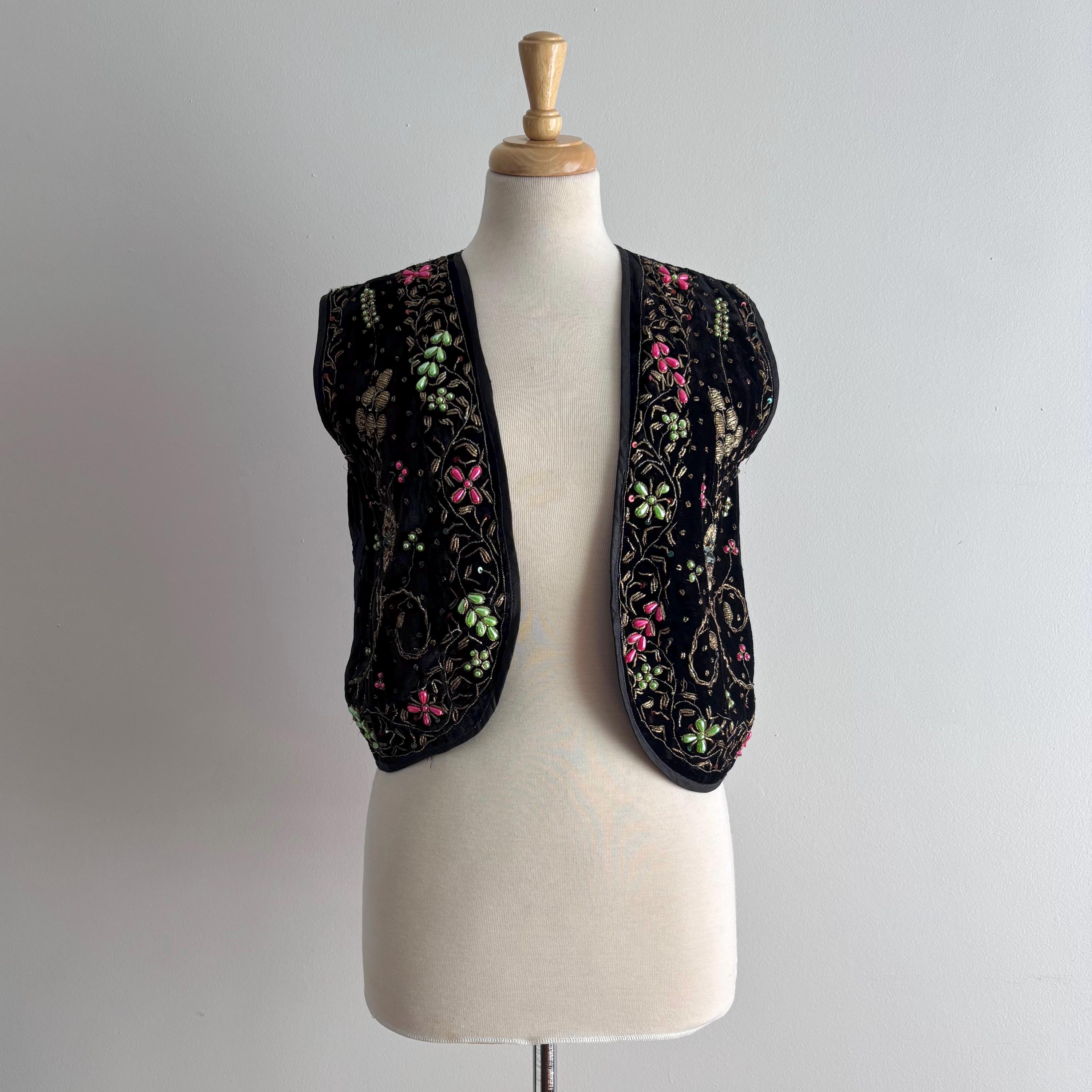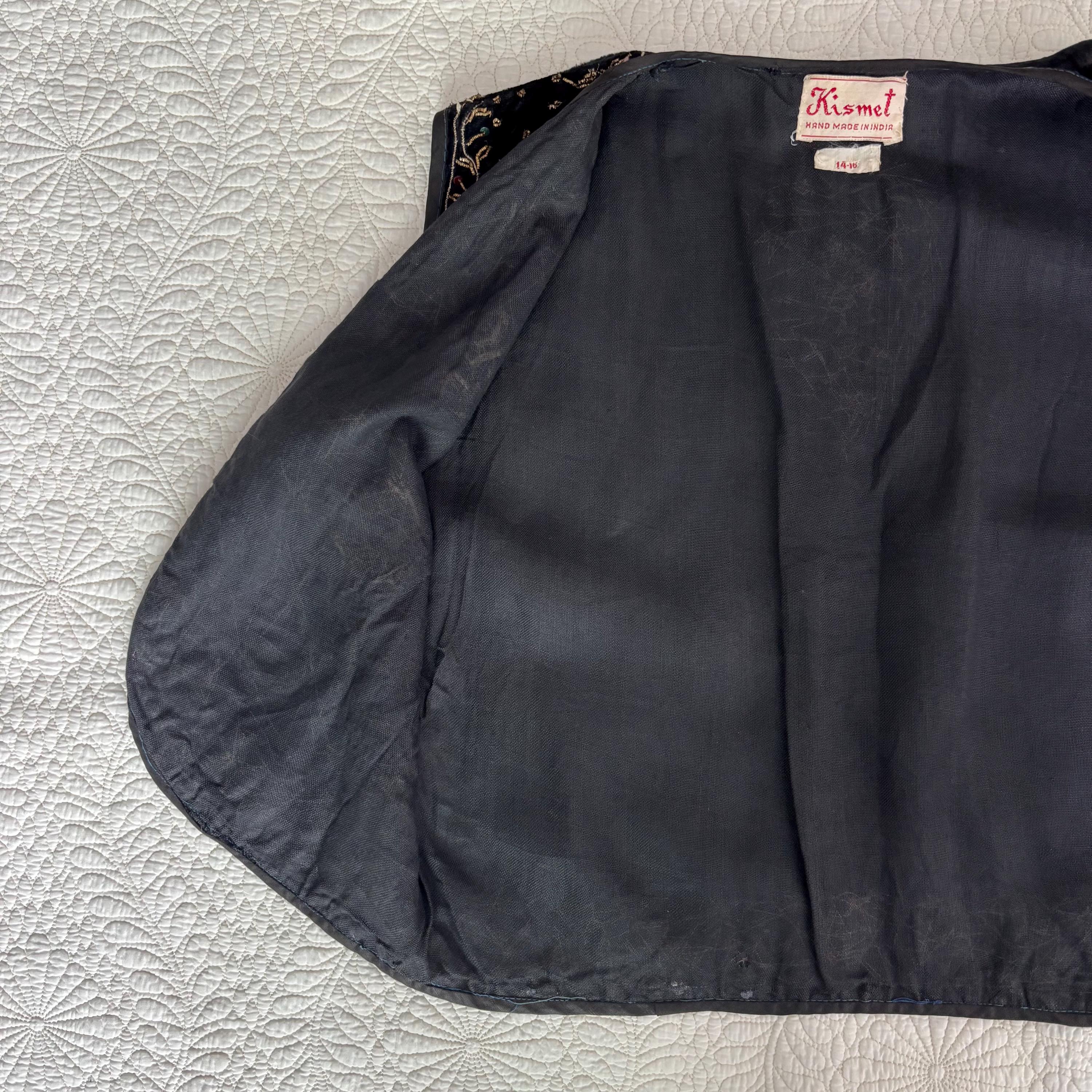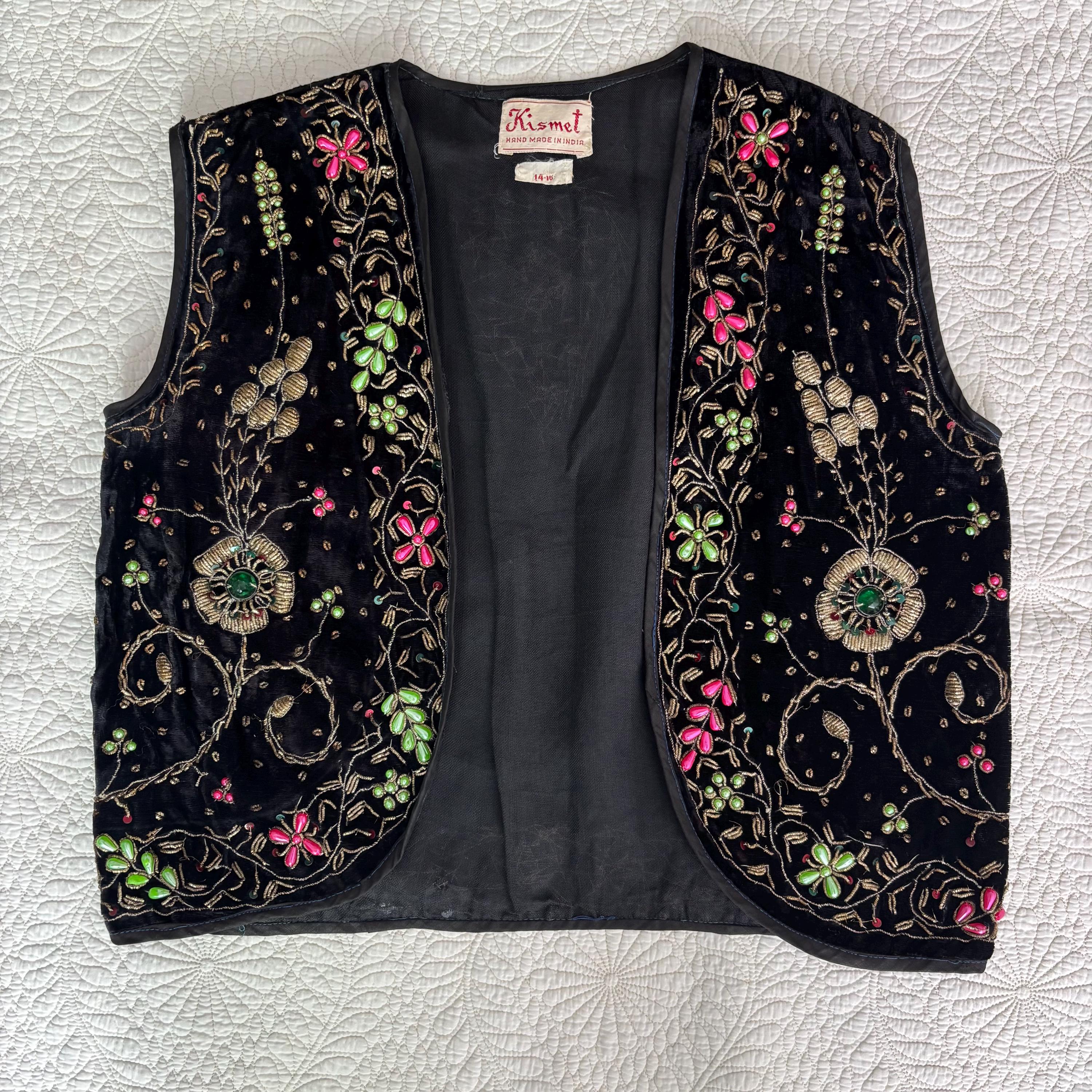 A really beautiful velvet vest, richly decorated with golden embroidery, pearlescent pink and green beads, sequins and faceted jewel-like beads. The vest is lined in a very lightweight black fabric, almost like a muslin. Absolutely stunning! The vest came to me with several other pieces that originated in the early mid-century era, but I cannot pinpoint the age of this one. Kismet, made in India. Please see the measurements for best fit.